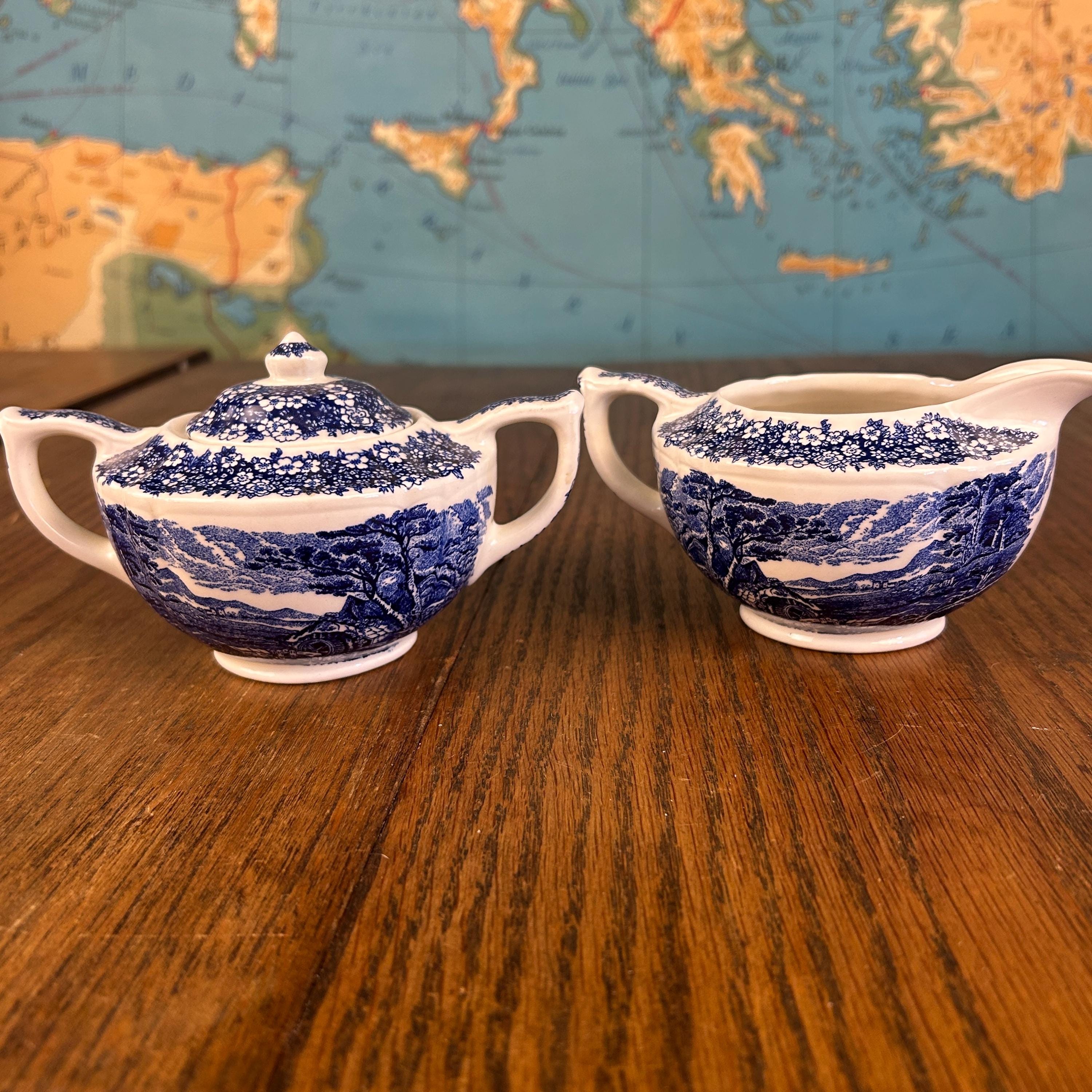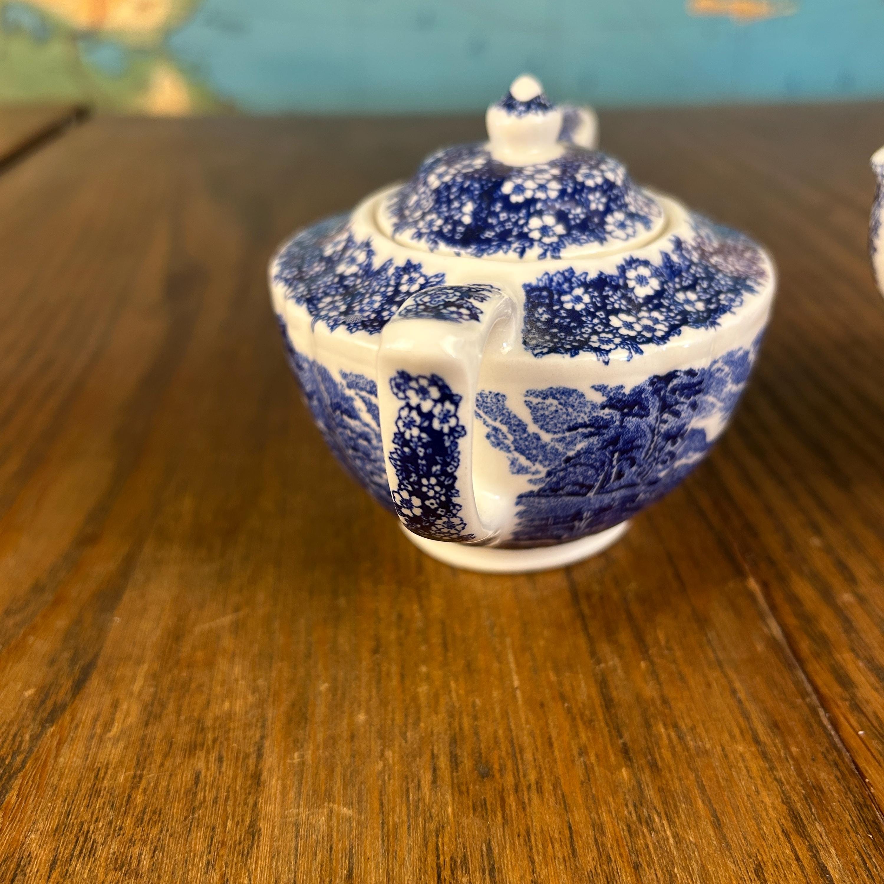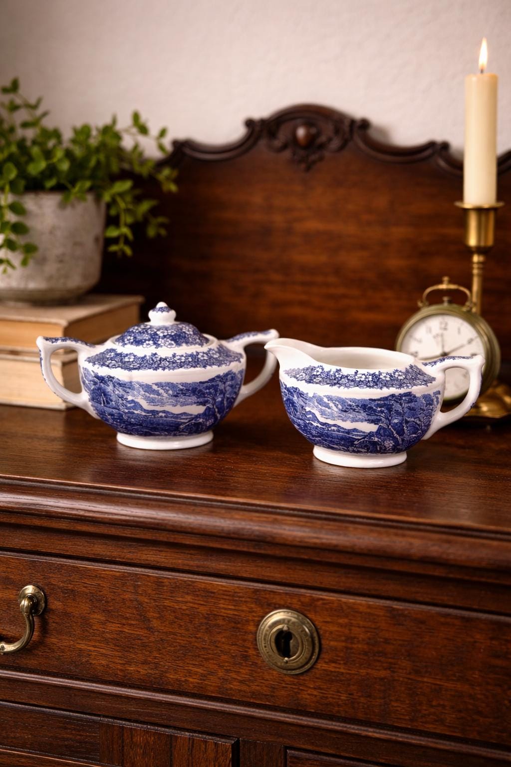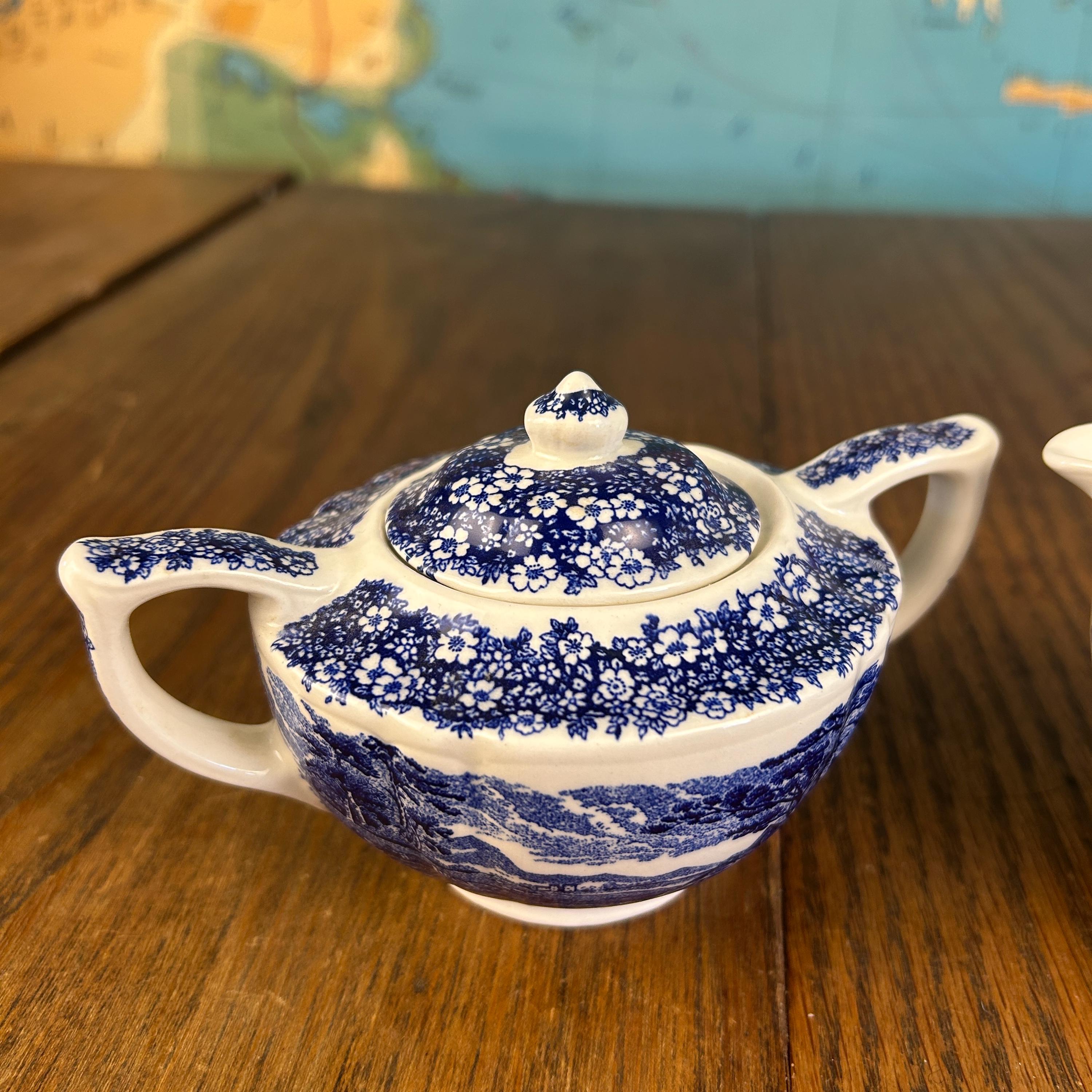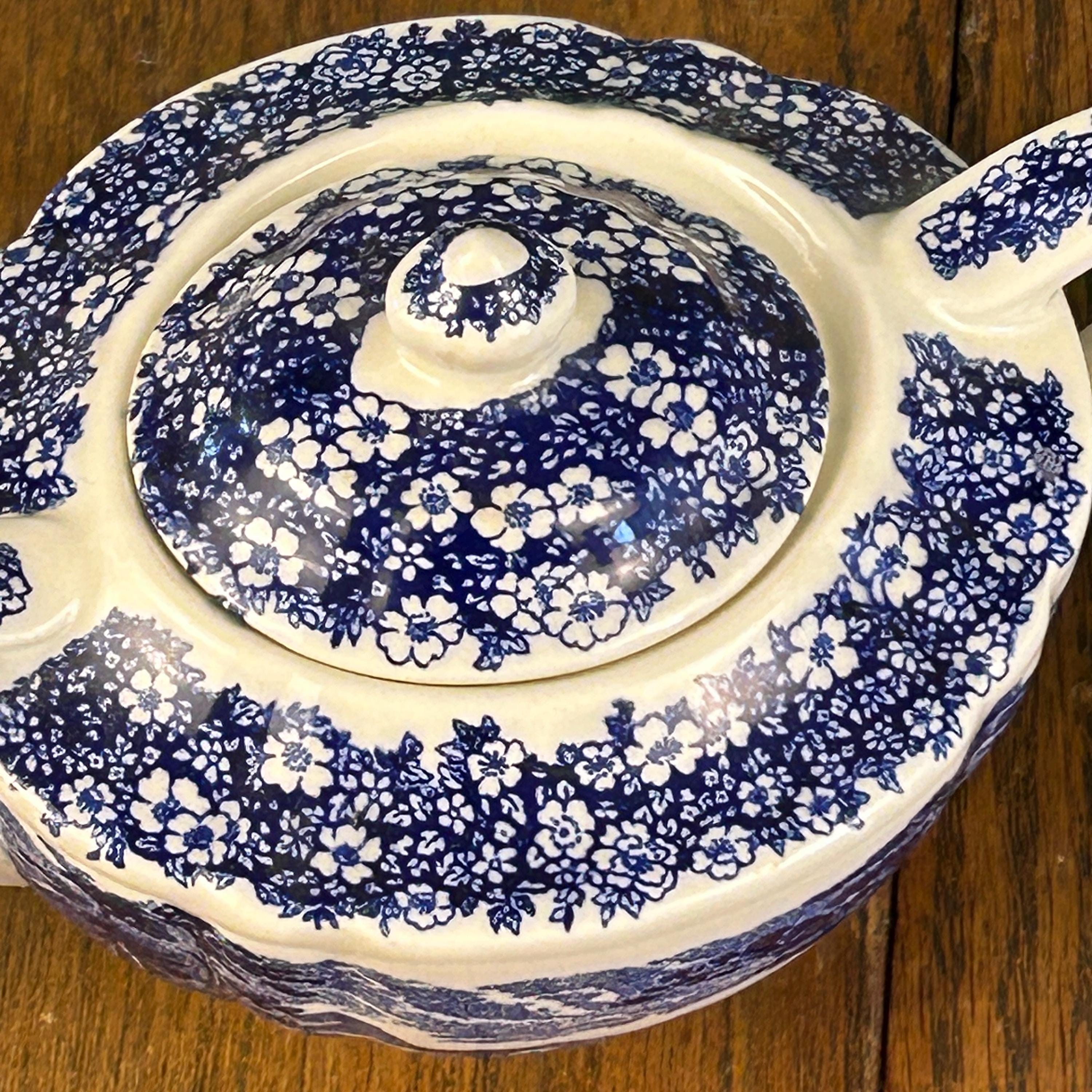 Crafted in England, this elegant set features a classic blue and white transferware design with detailed landscapes and delicate floral accents. The traditional pattern and refined shape make it a perfect addition to any tea lover’s collection or a lovely accent for cottagecore and vintage-inspired kitchens.