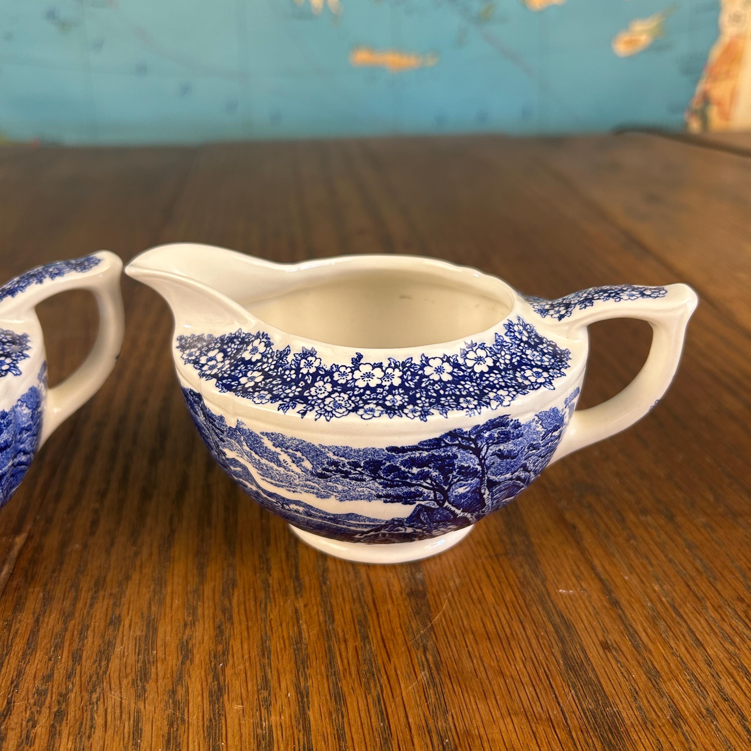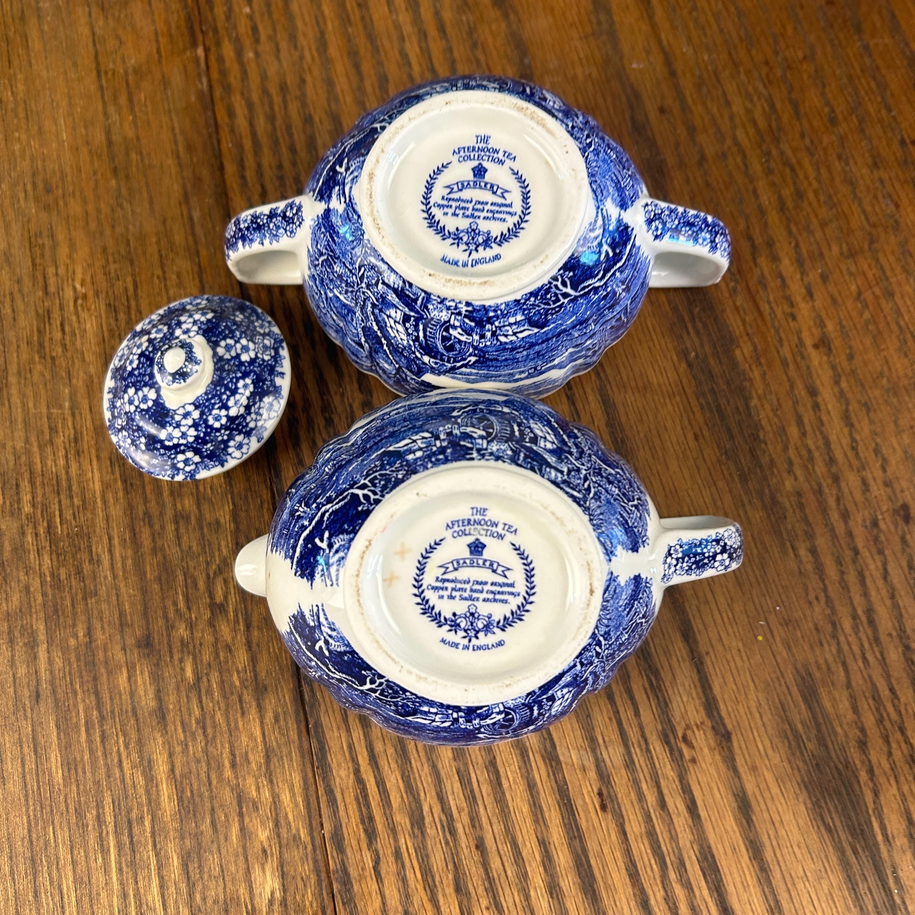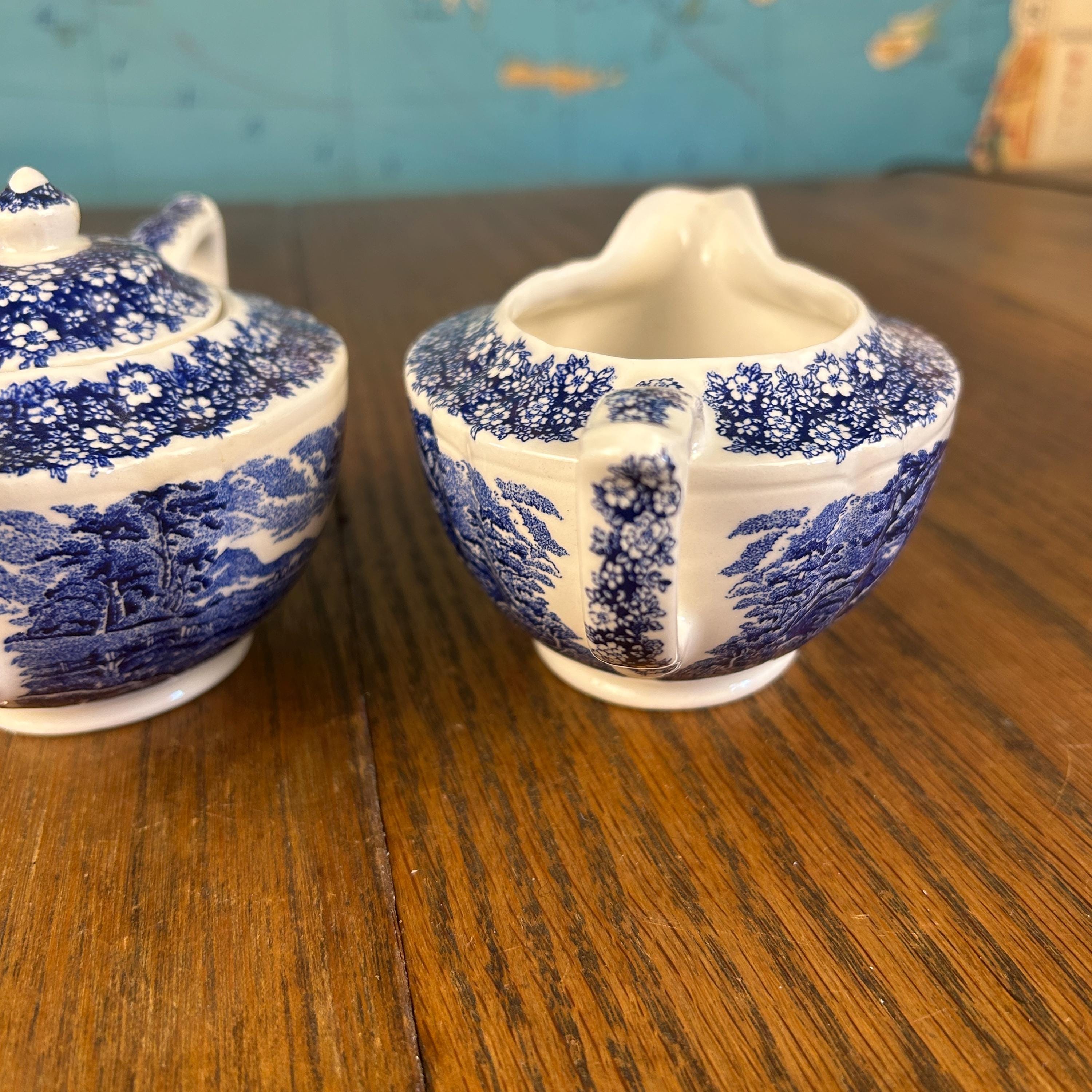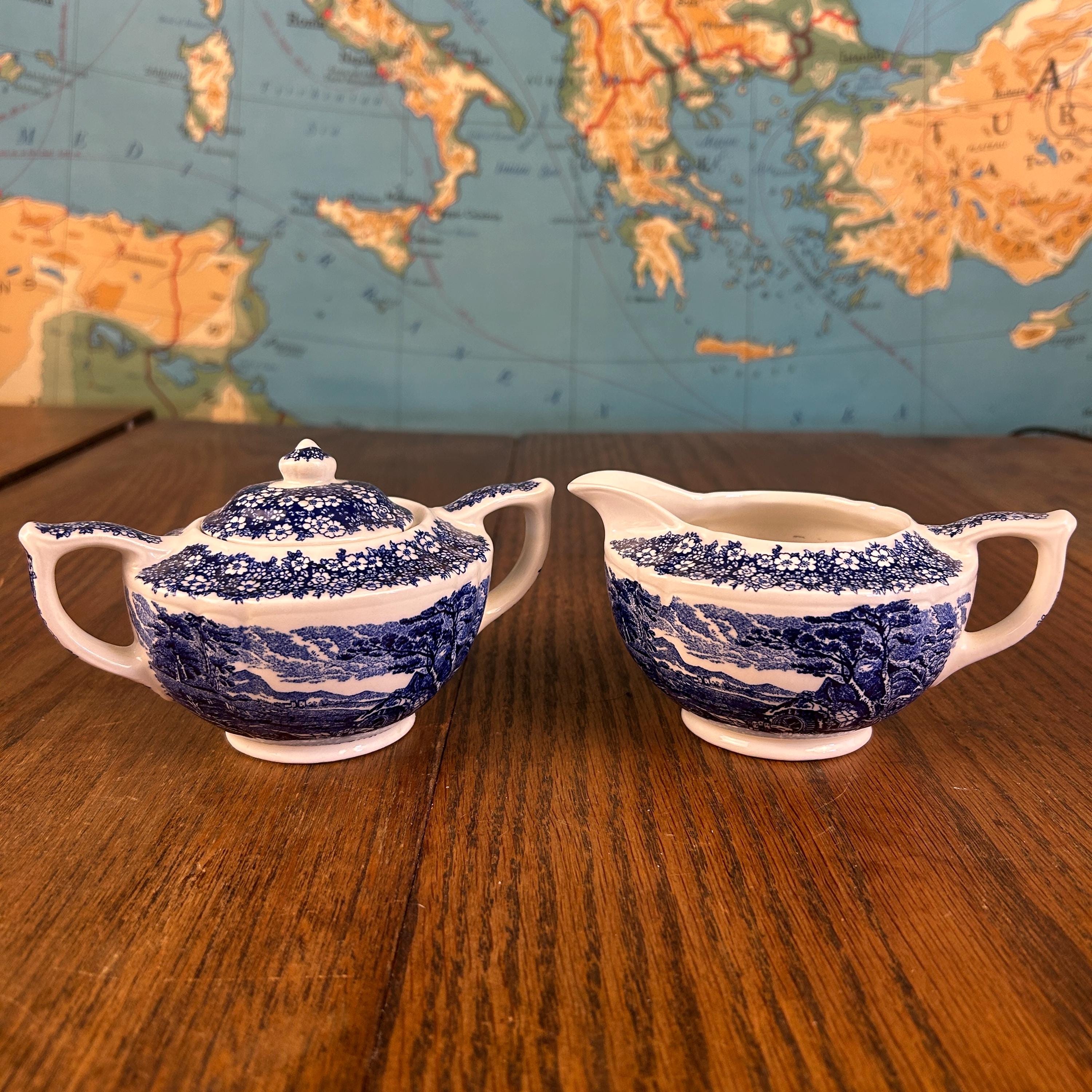 Crafted in England, this elegant set features a classic blue and white transferware design with detailed landscapes and delicate floral accents. The traditional pattern and refined shape make it a perfect addition to any tea lover’s collection or a lovely accent for cottagecore and vintage-inspired kitchens.