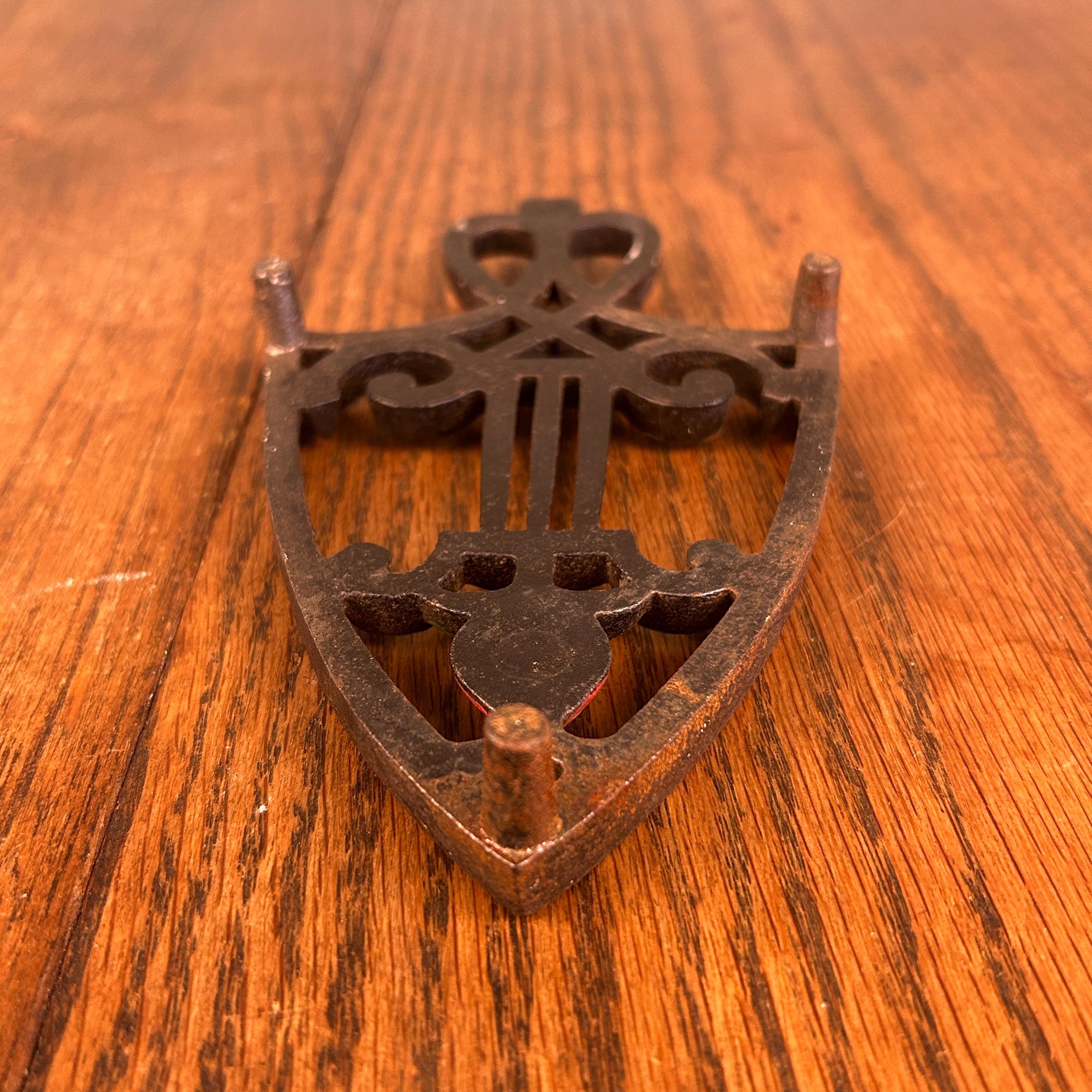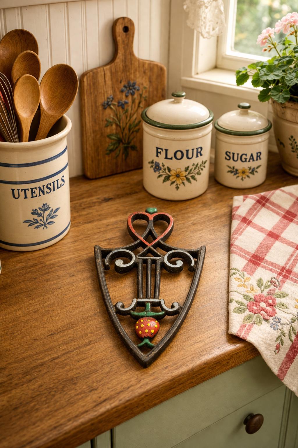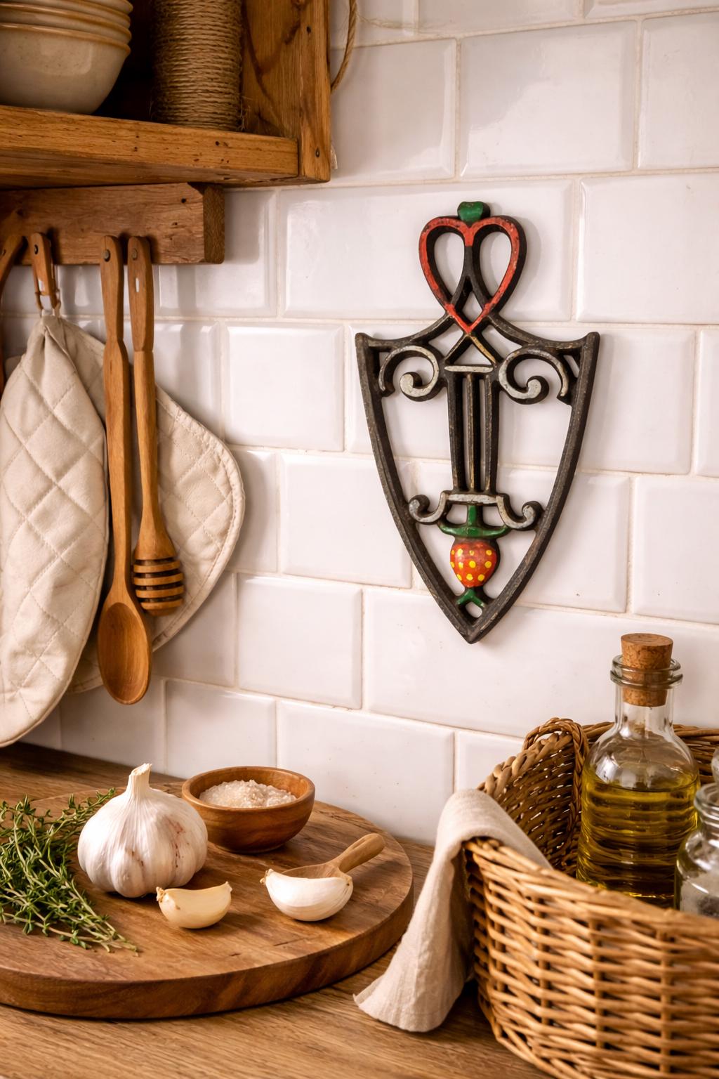 Use as a functional trivet, wall hanging, or decorative accent in a farmhouse or cottage-style kitchen. Also a great addition to a vintage cast iron or folk art collection.