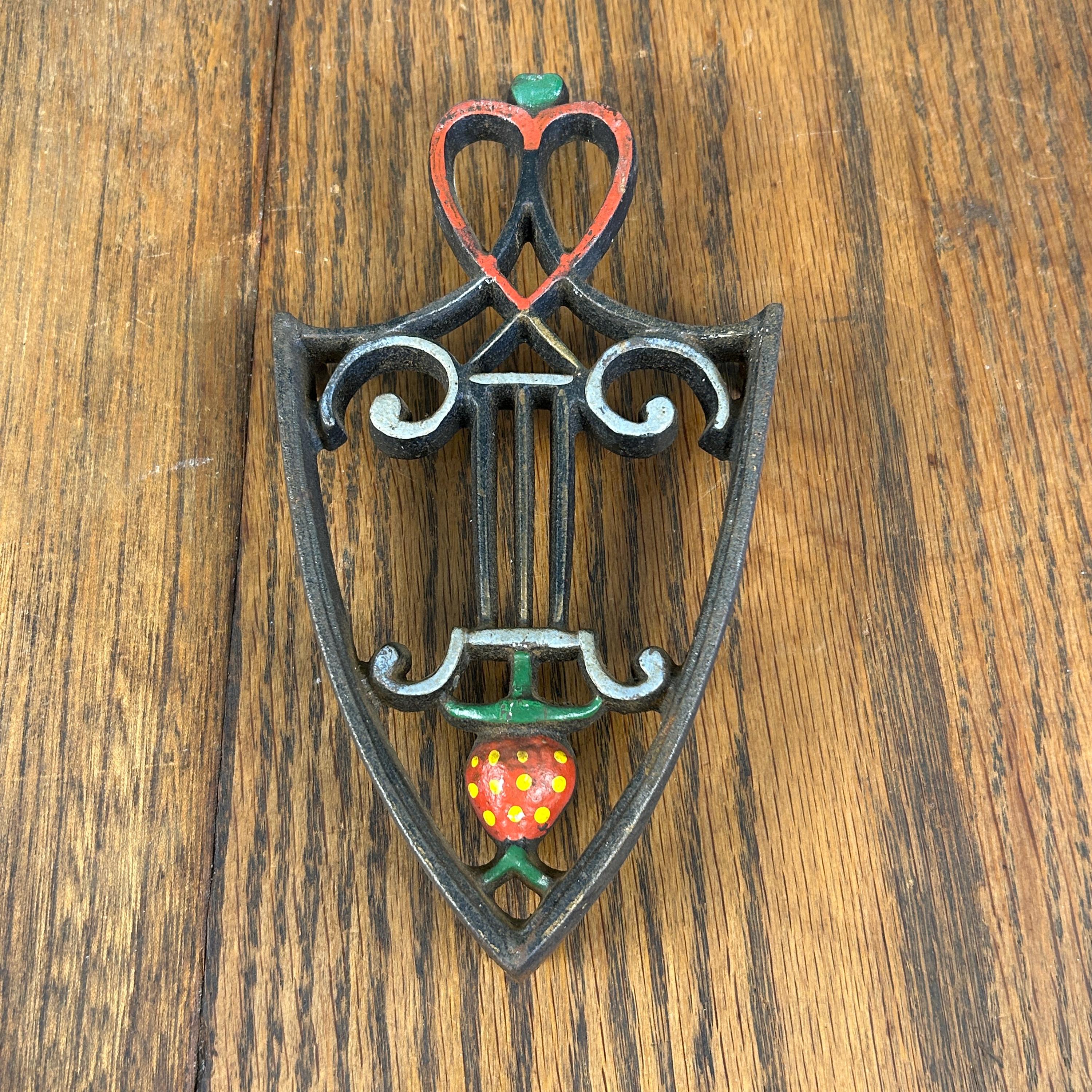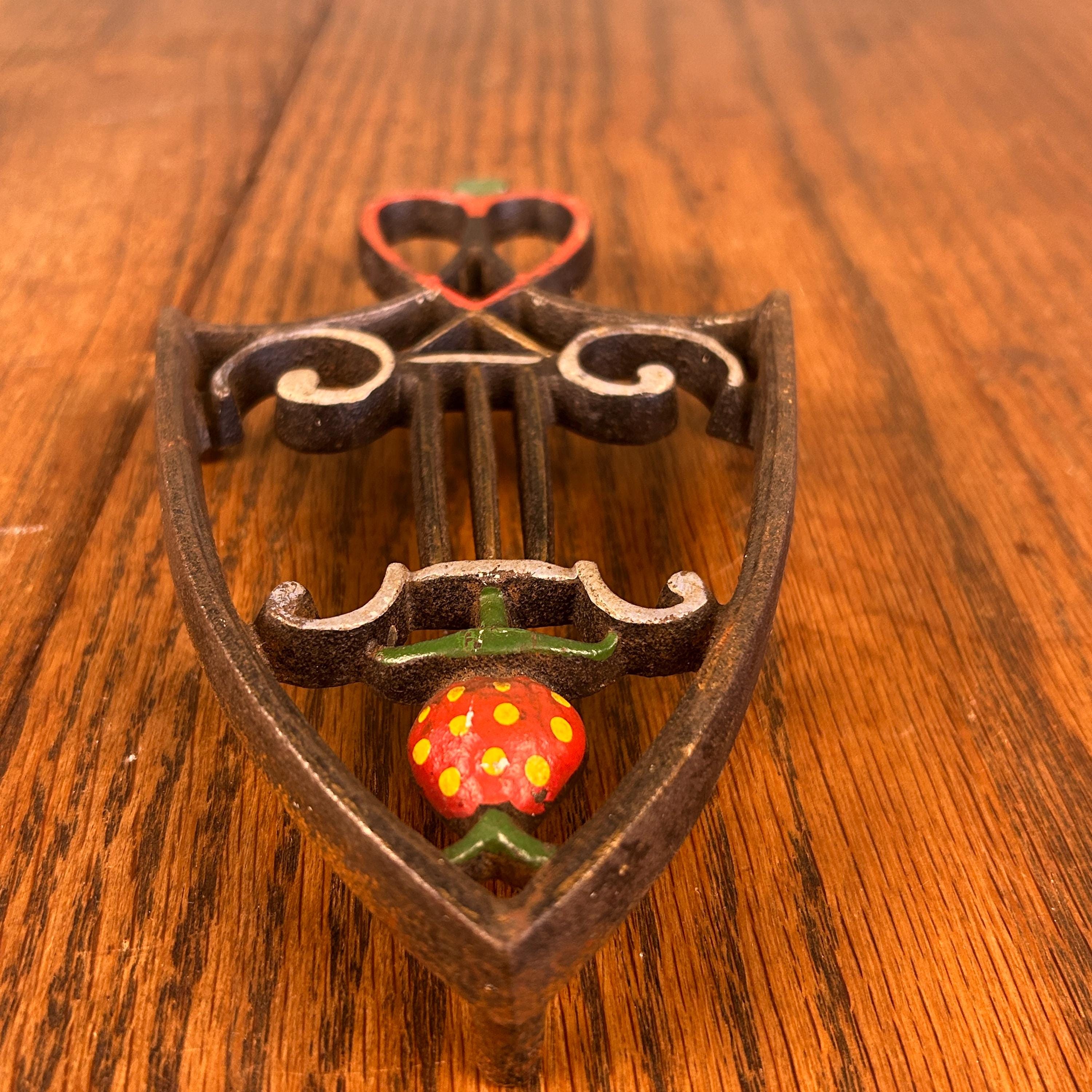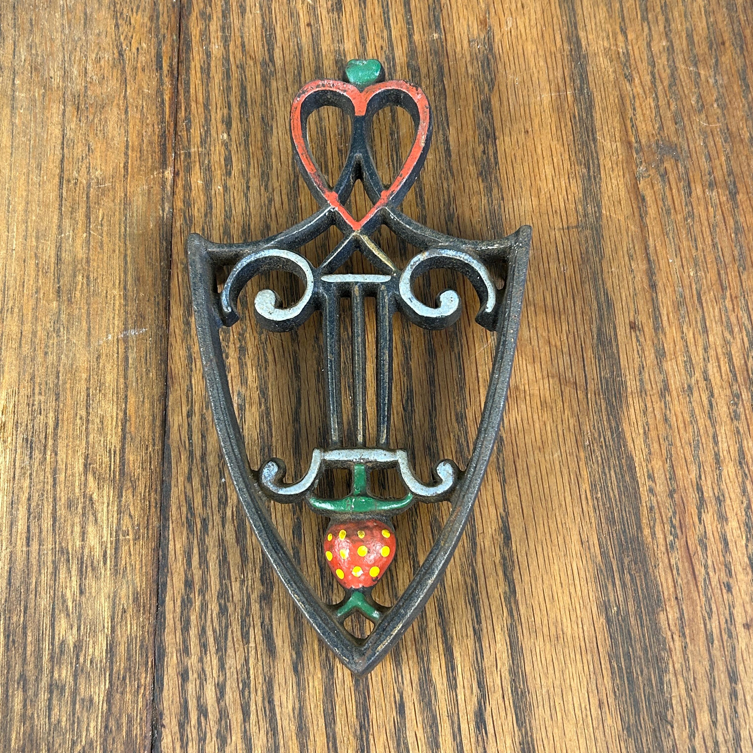 Featuring a unique spade-shaped shield design, this piece is decorated with a heart and strawberry motif in classic red, yellow, and green enamel. Wilton is well known for its collectible cast iron trivets, and this piece is a wonderful example of their decorative craftsmanship.