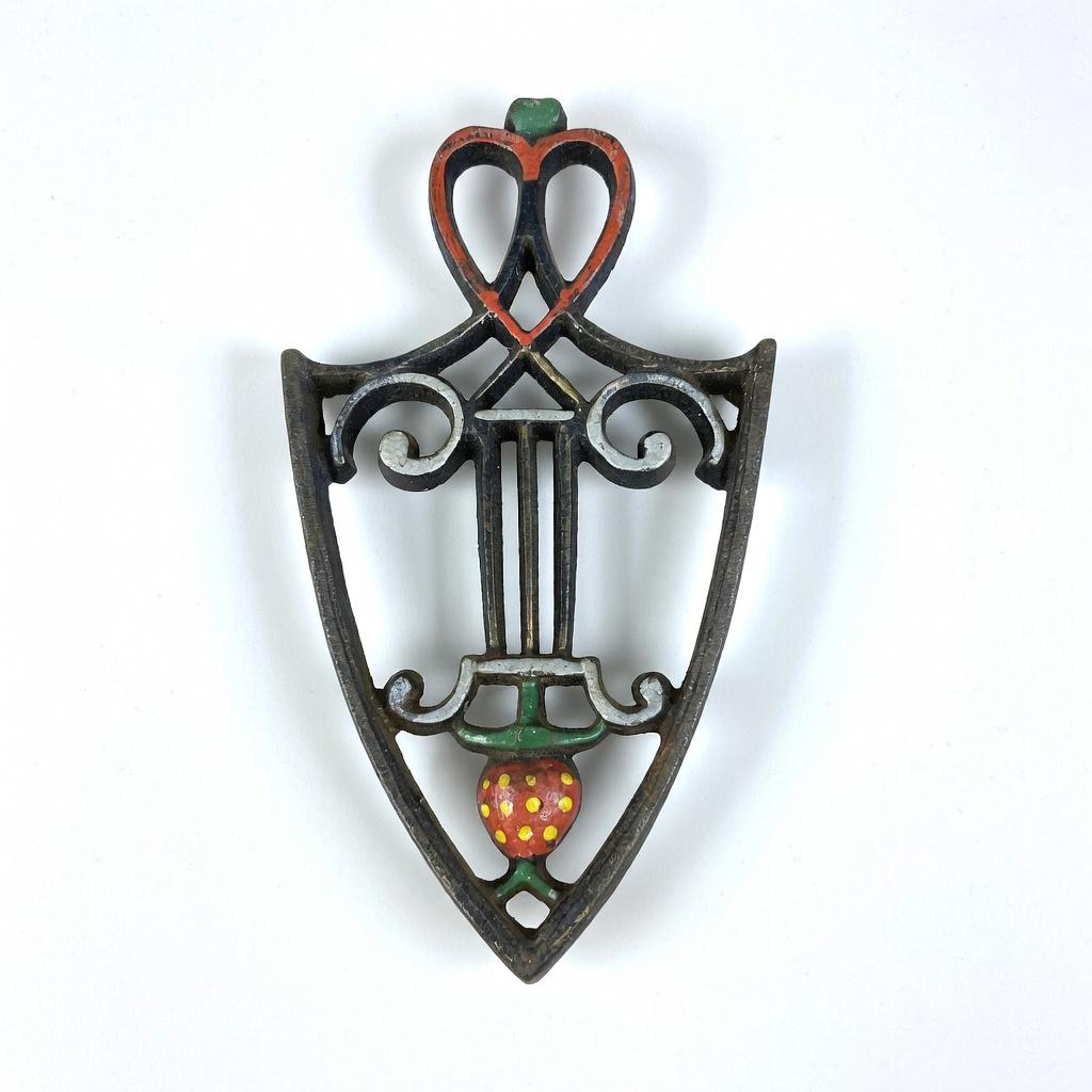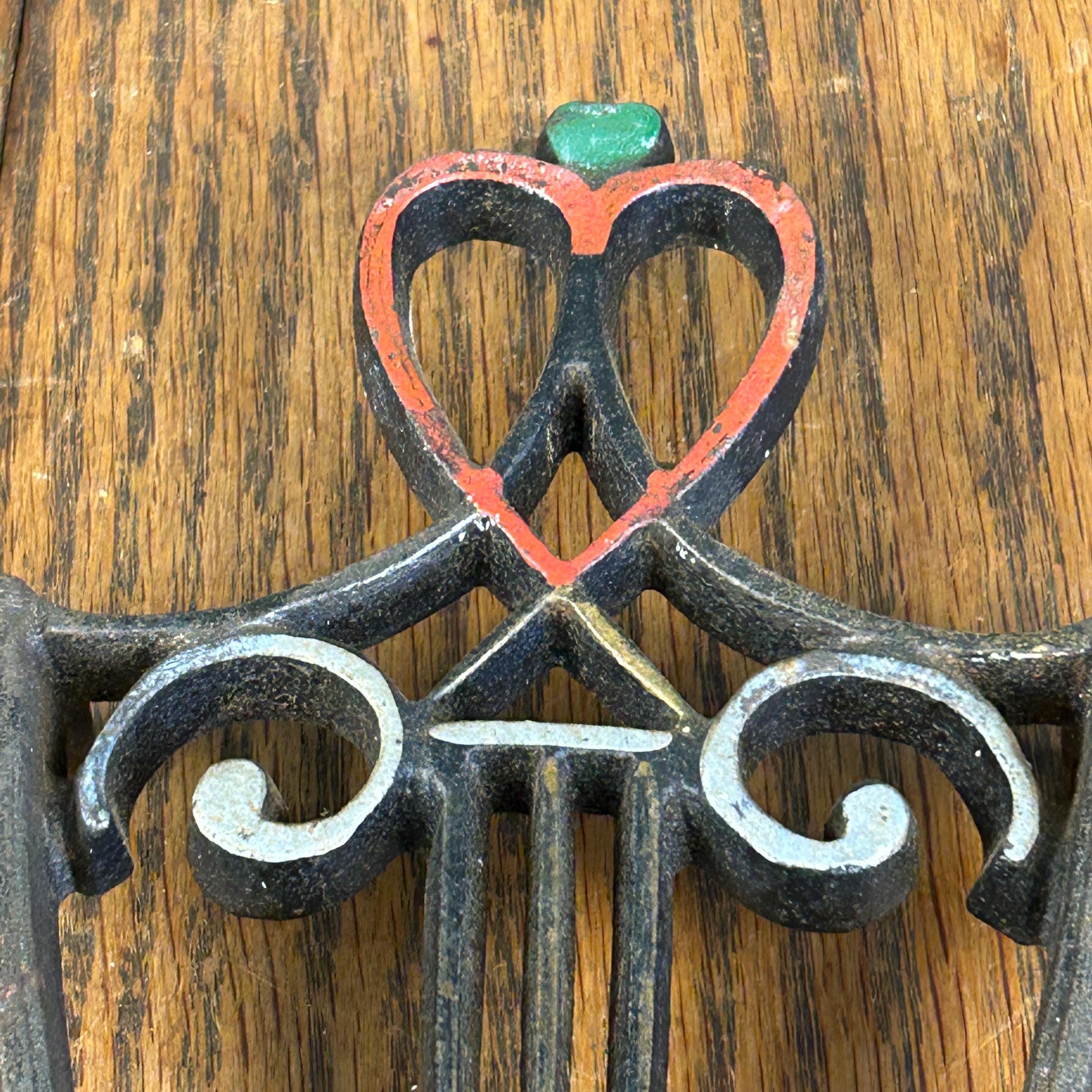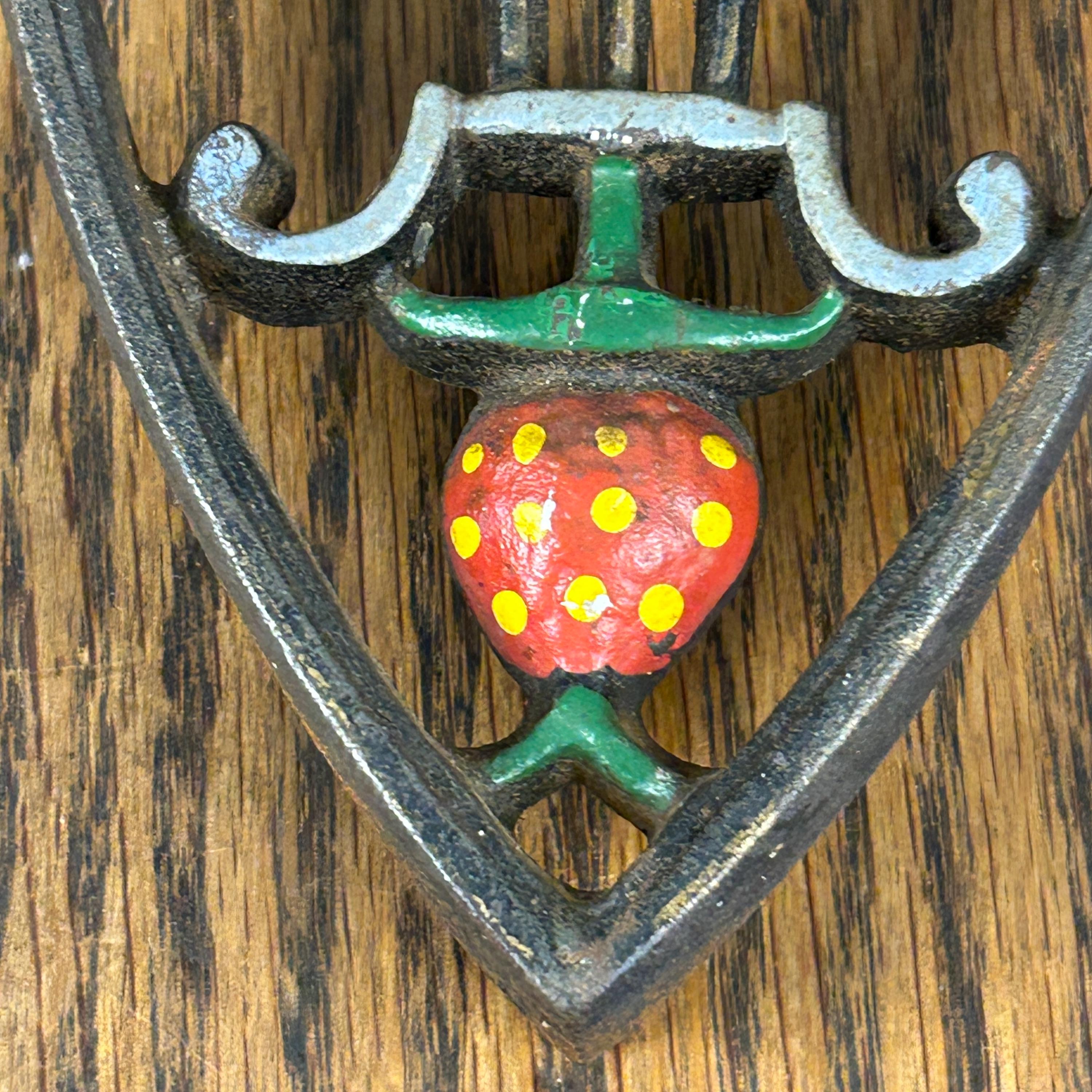Featuring a unique spade-shaped shield design, this piece is decorated with a heart and strawberry motif in classic red, yellow, and green enamel. Wilton is well known for its collectible cast iron trivets, and this piece is a wonderful example of their decorative craftsmanship.