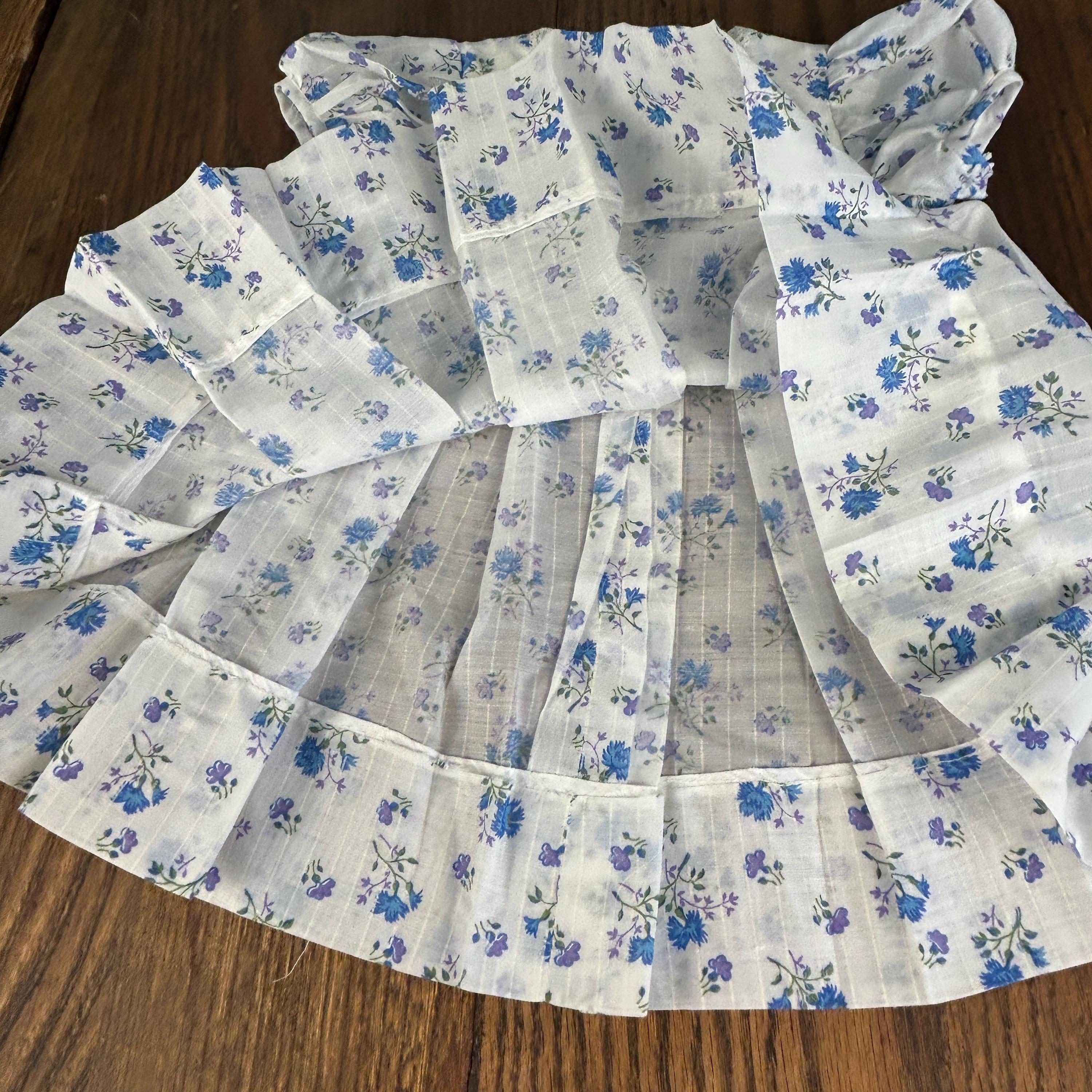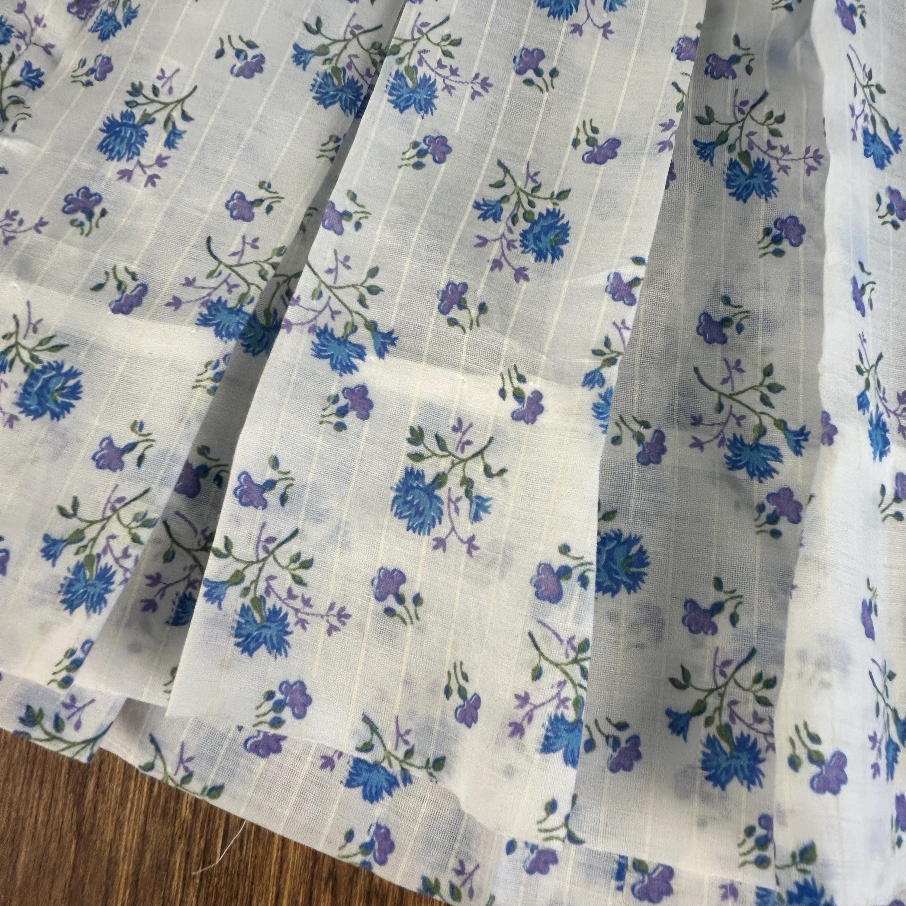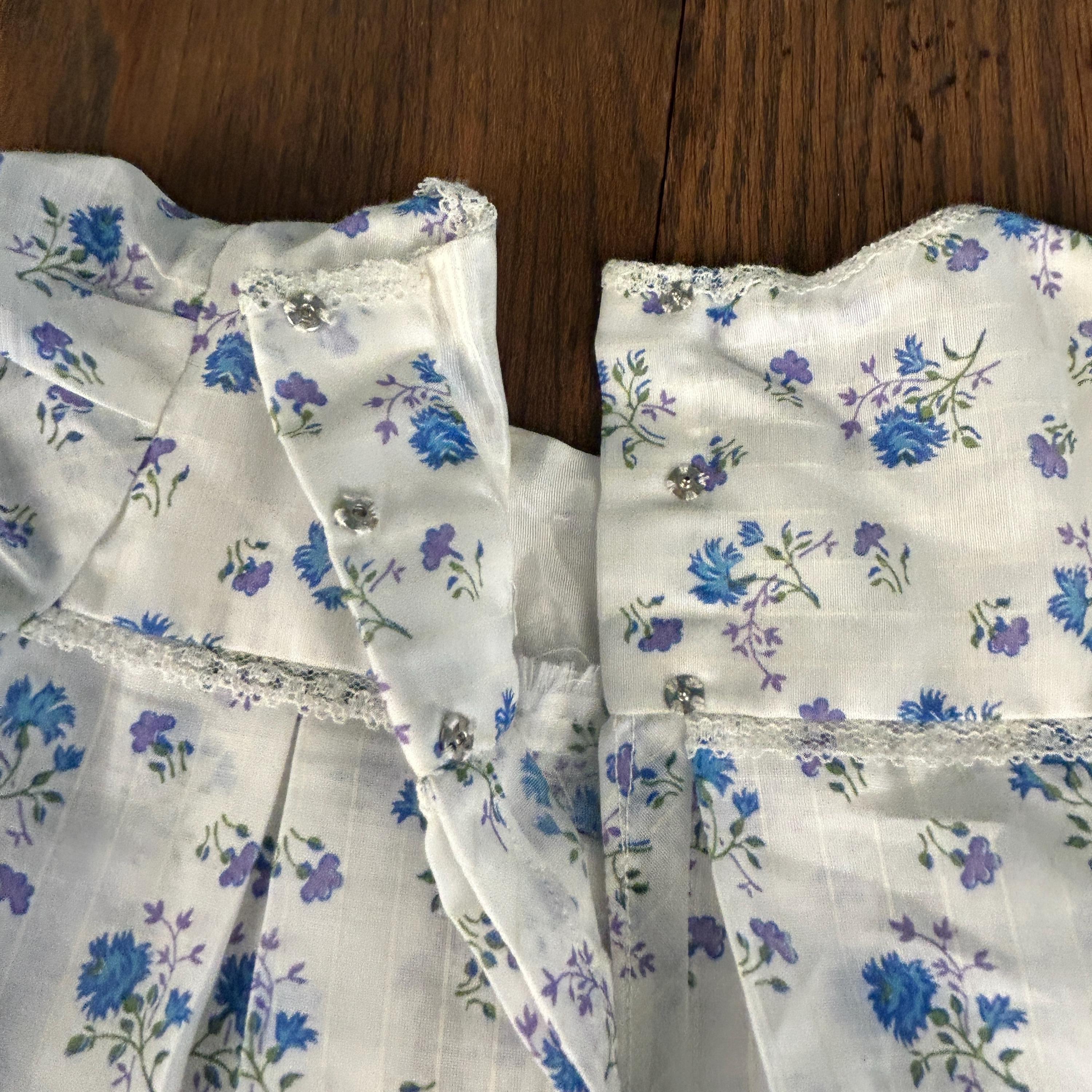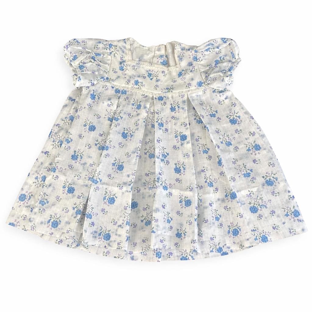 The fabric showcases a beautiful blue and lavender floral pattern, perfectly complementing the soft, feminine silhouette. The pleated skirt adds gentle structure and movement, while the snap closure at the back makes dressing easy and practical.