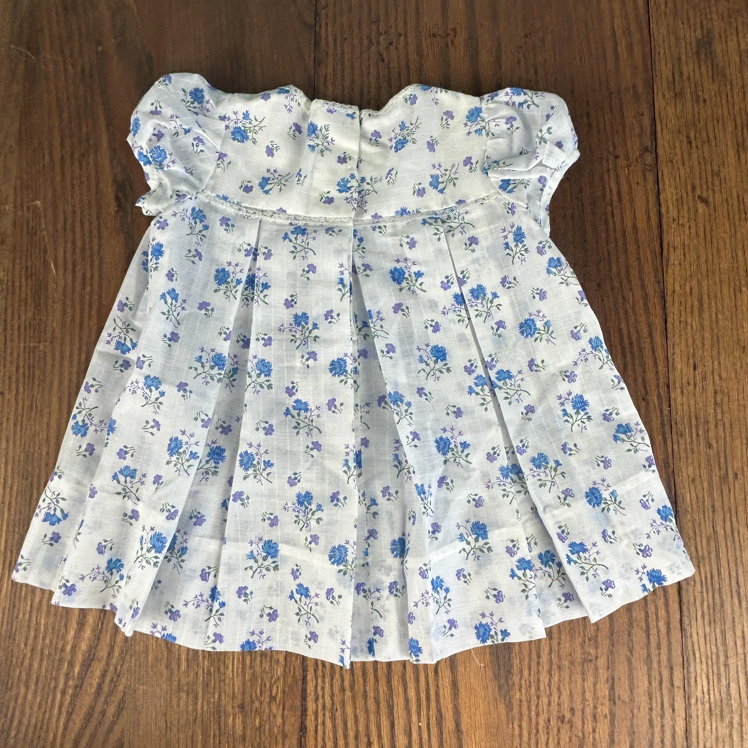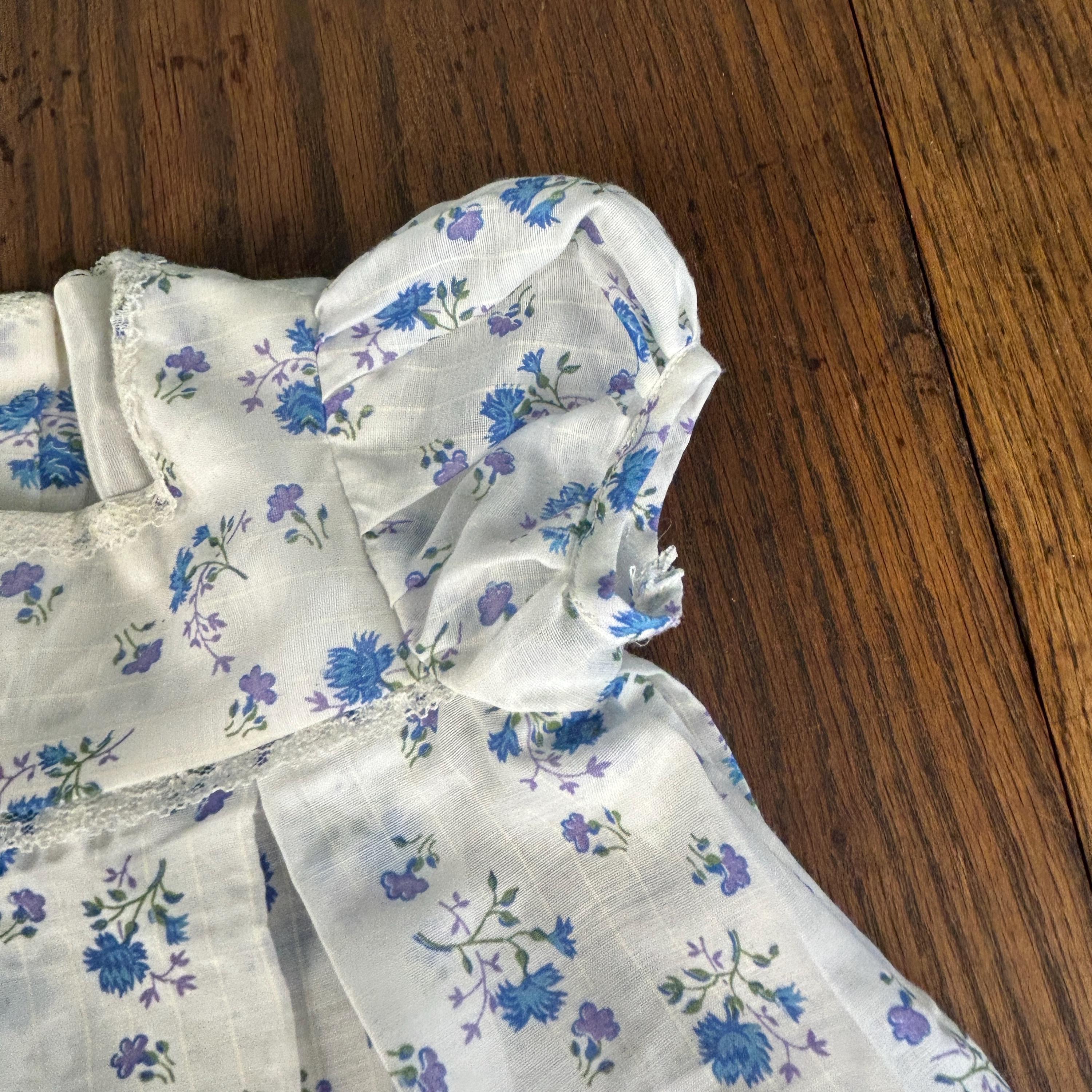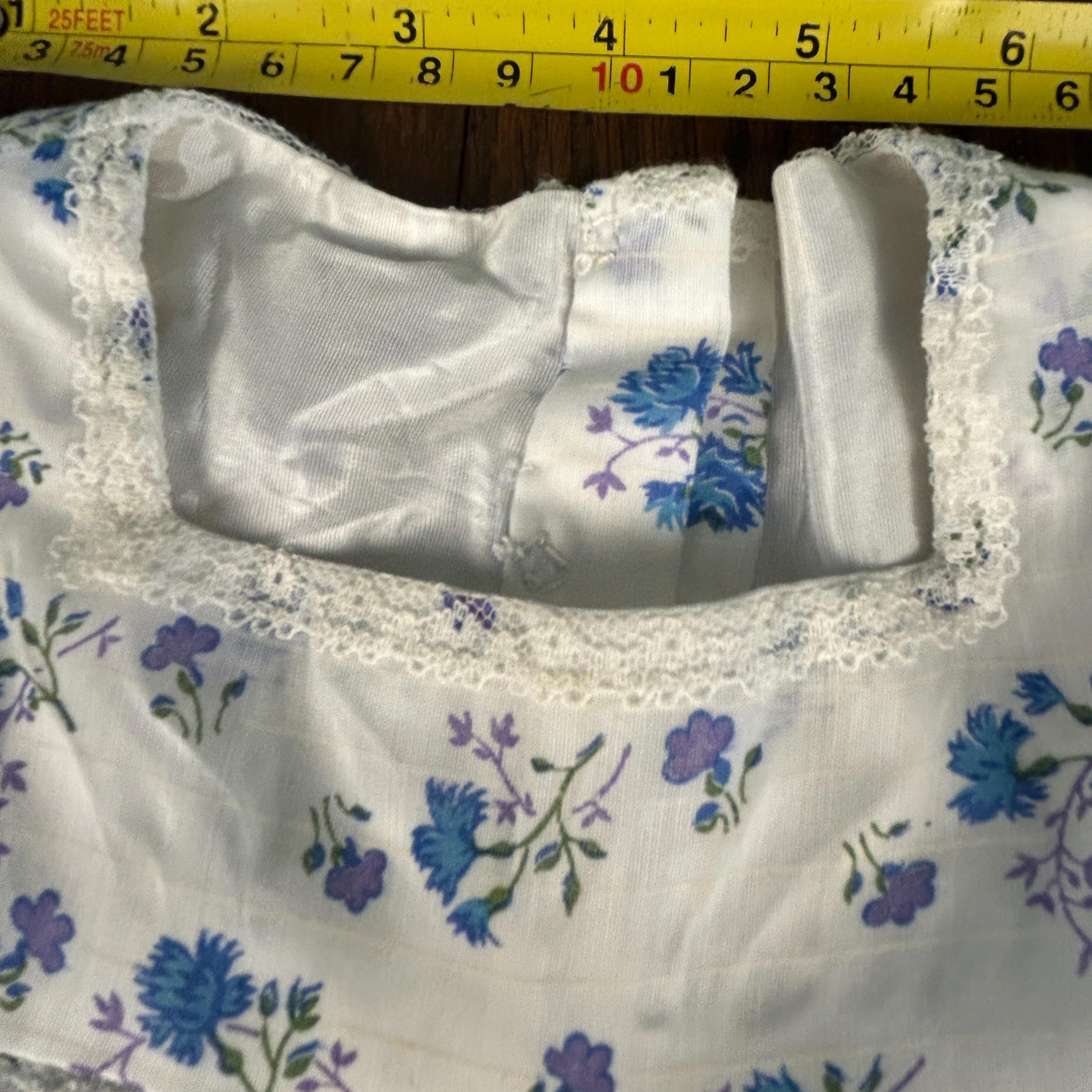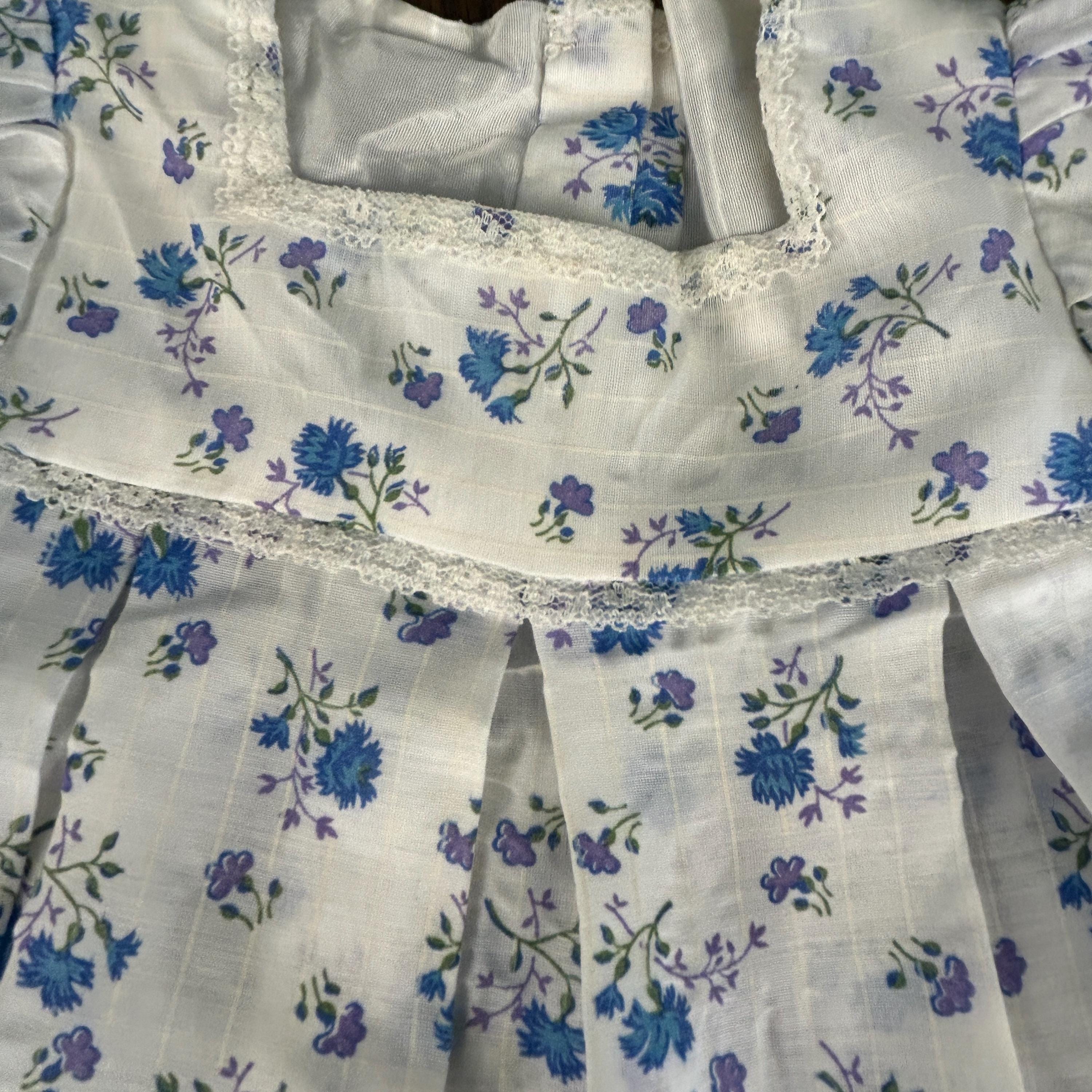 The fabric showcases a beautiful blue and lavender floral pattern, perfectly complementing the soft, feminine silhouette. The pleated skirt adds gentle structure and movement, while the snap closure at the back makes dressing easy and practical.