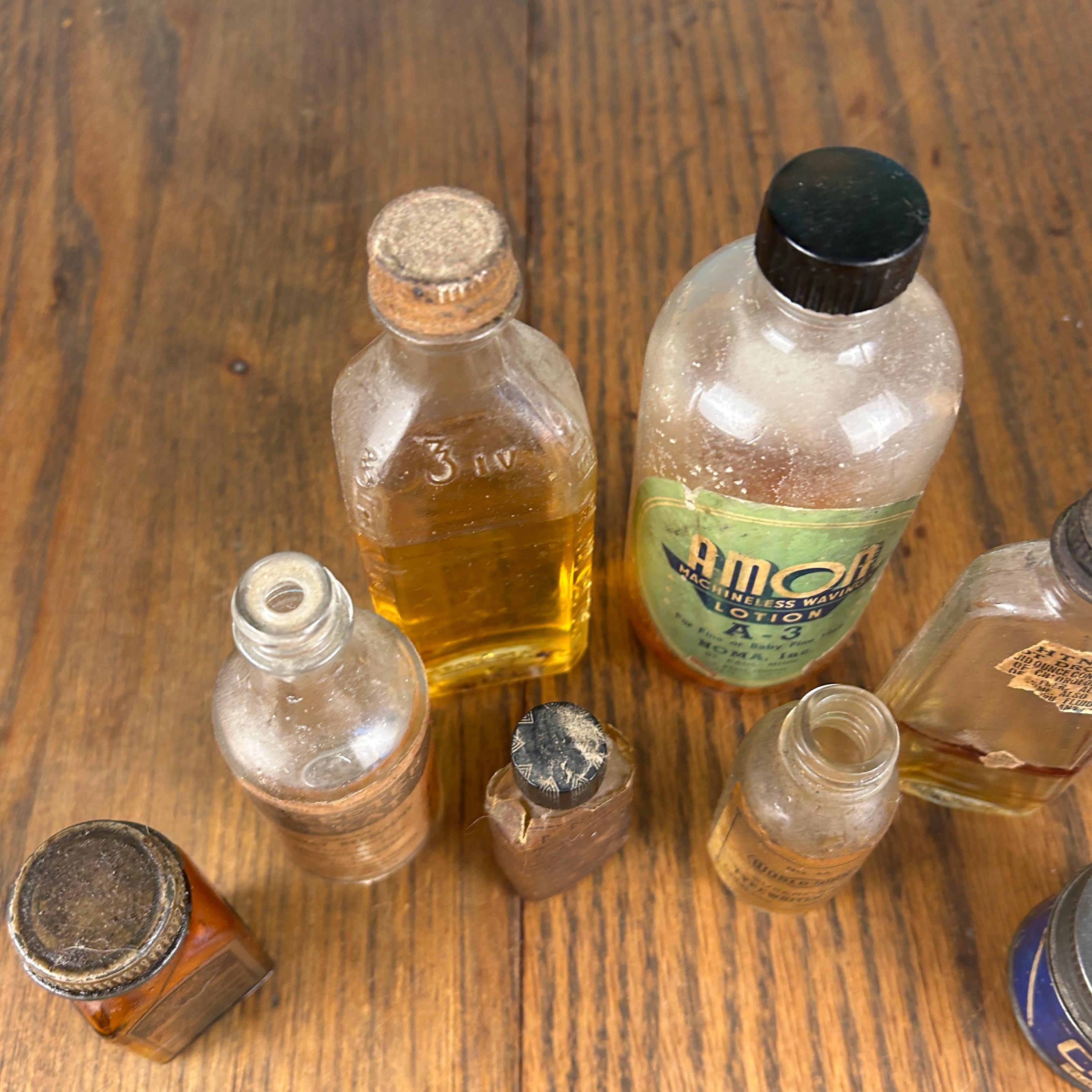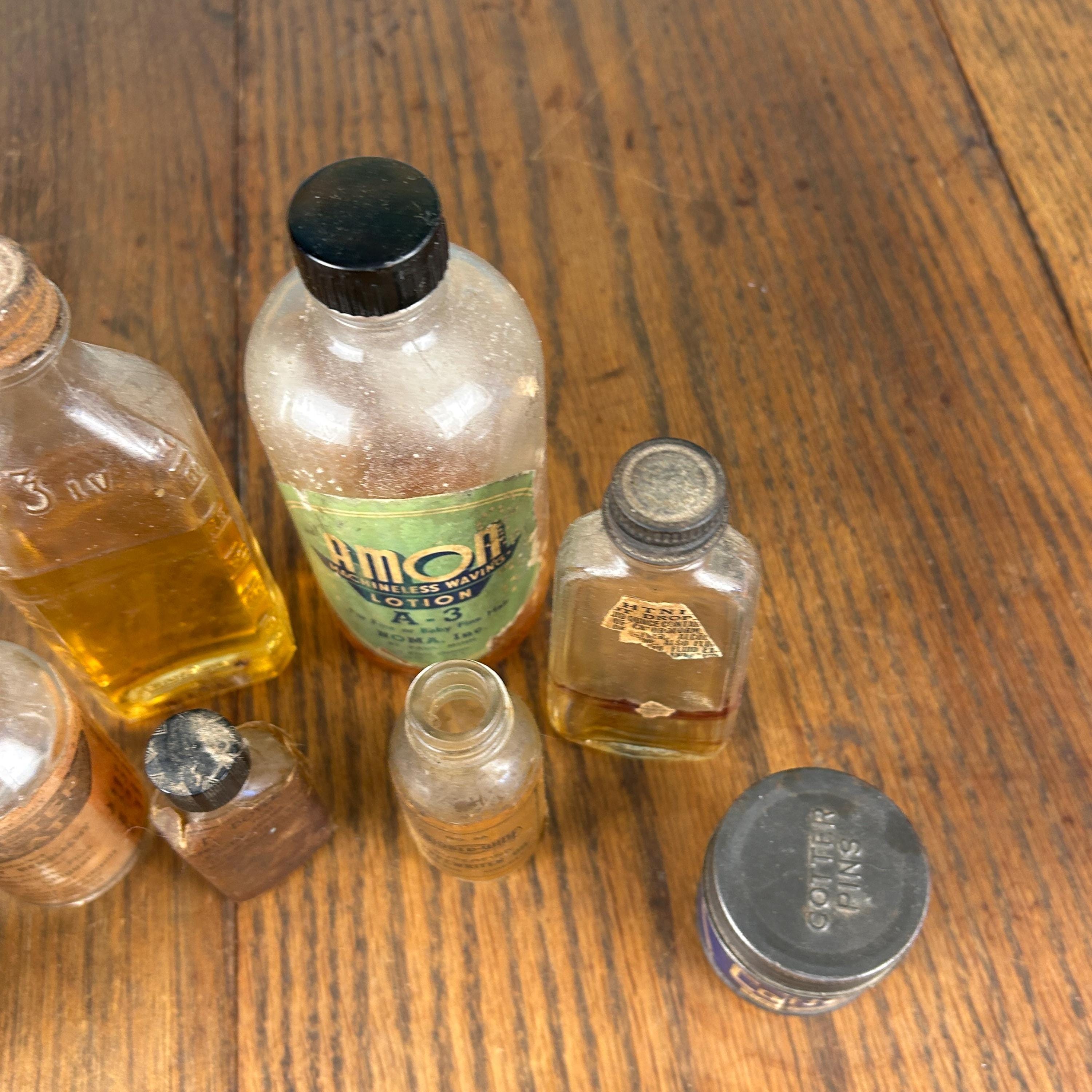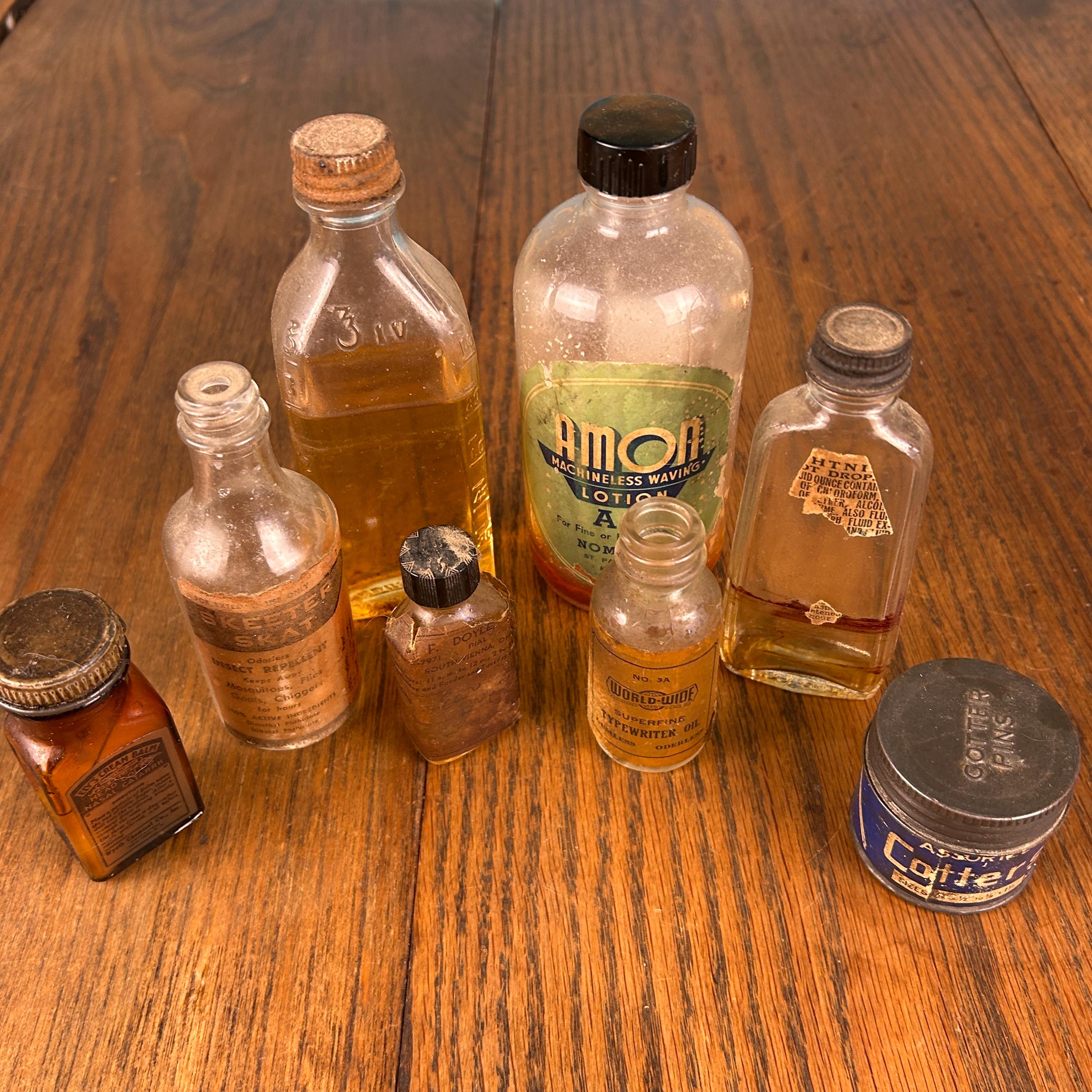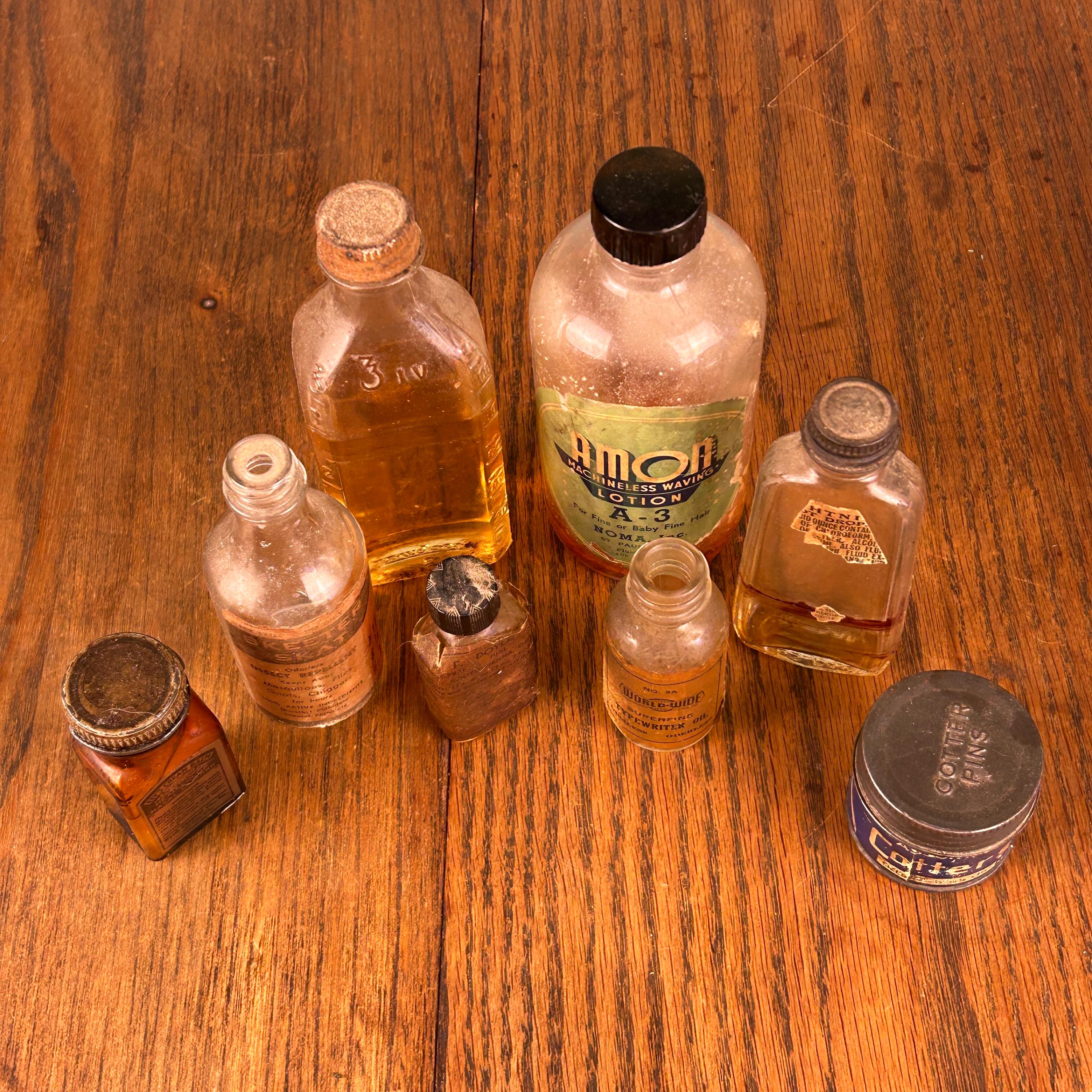 The lot includes a variety of interesting pieces such as Cotter’s, Amoa Machineless Waving Lotion, Skeeter Skat, and additional apothecary-style bottles. Each piece showcases its own history through aged glass, original labels, and subtle wear that only time can create.