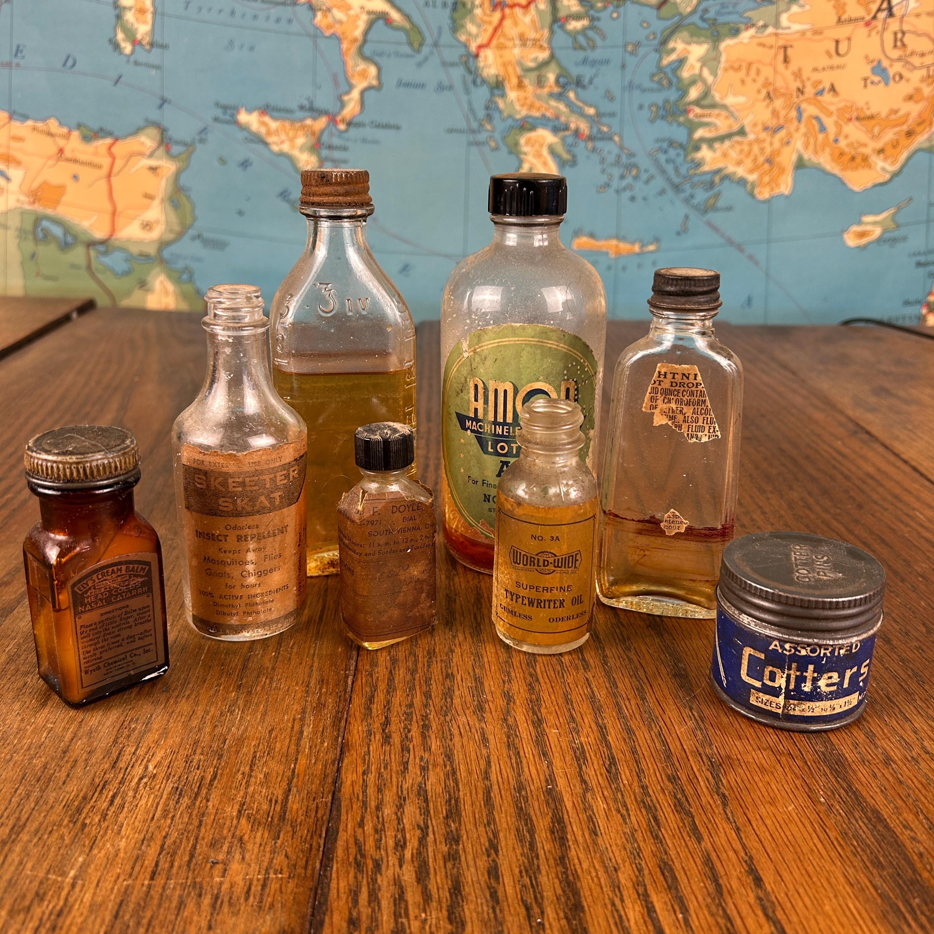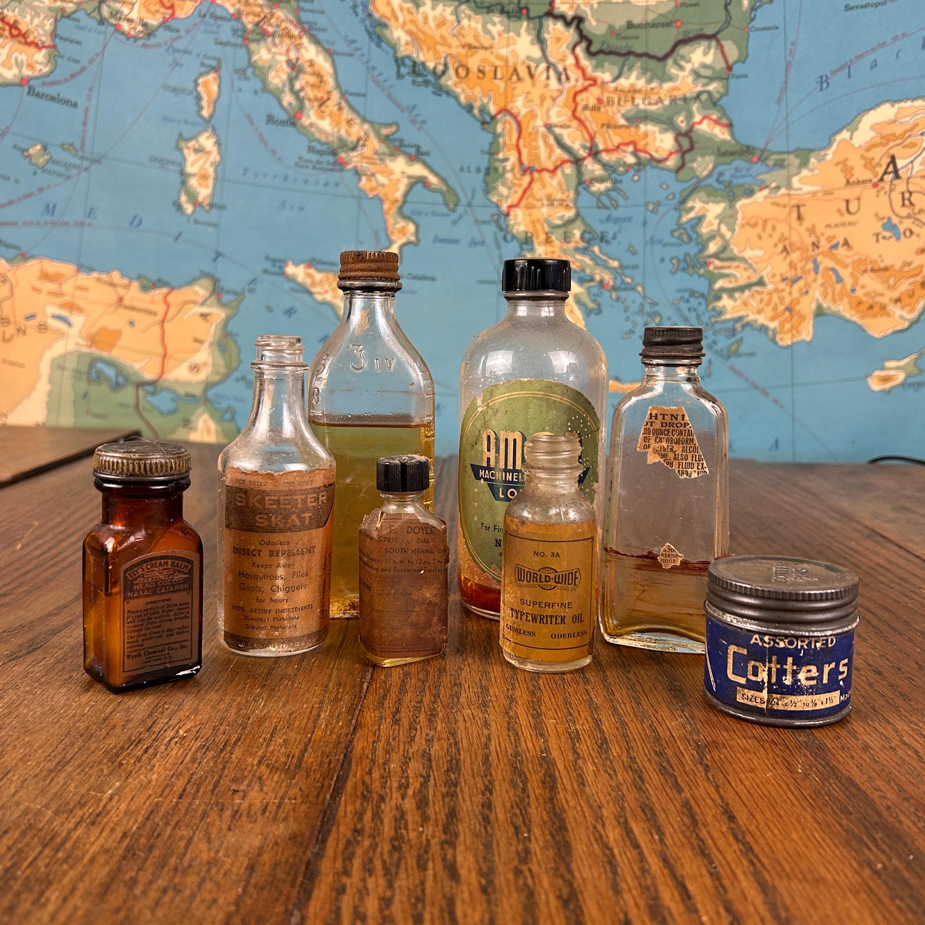 This unique collection of eight (8) vintage and antique bottles and jars is full of character and nostalgic charm. A wonderful assortment for collectors, decorators, or anyone who loves the look of old apothecary and medicine bottles.