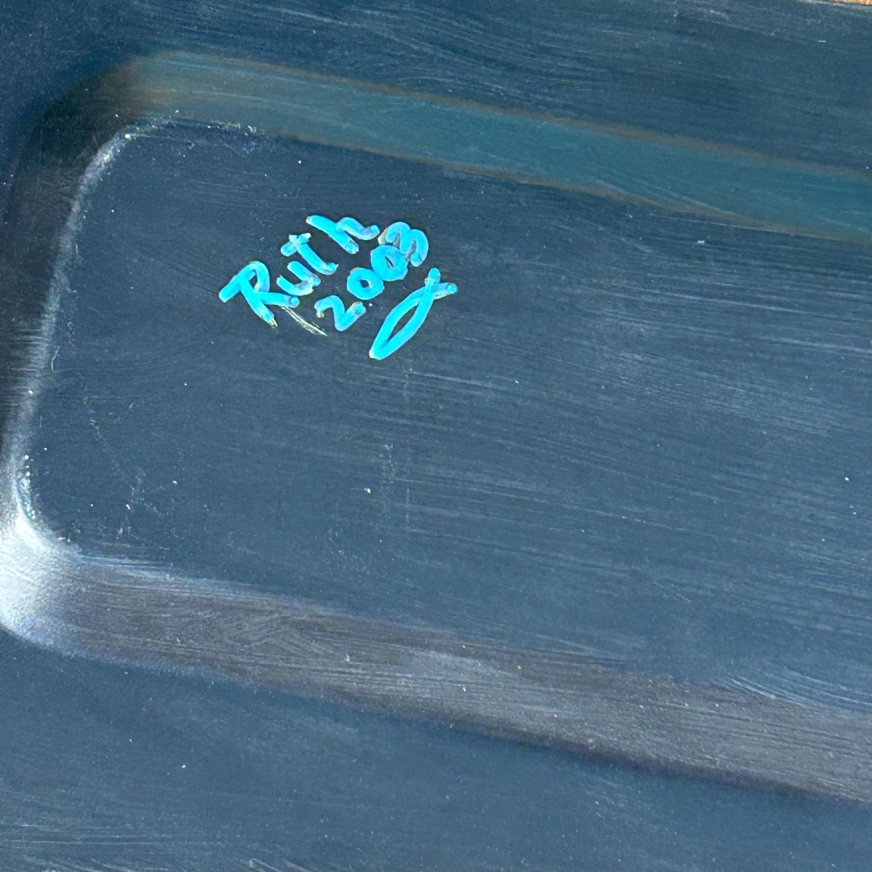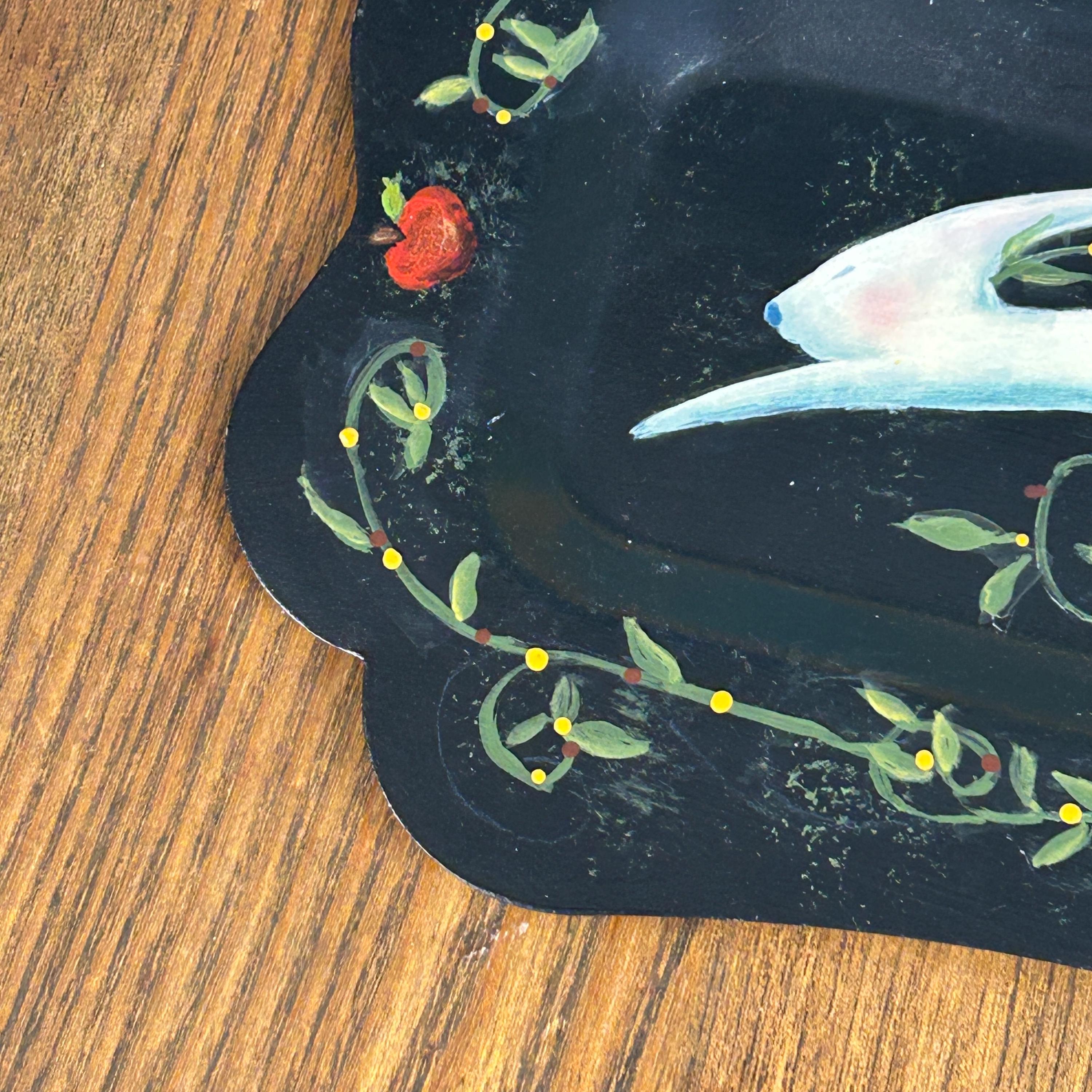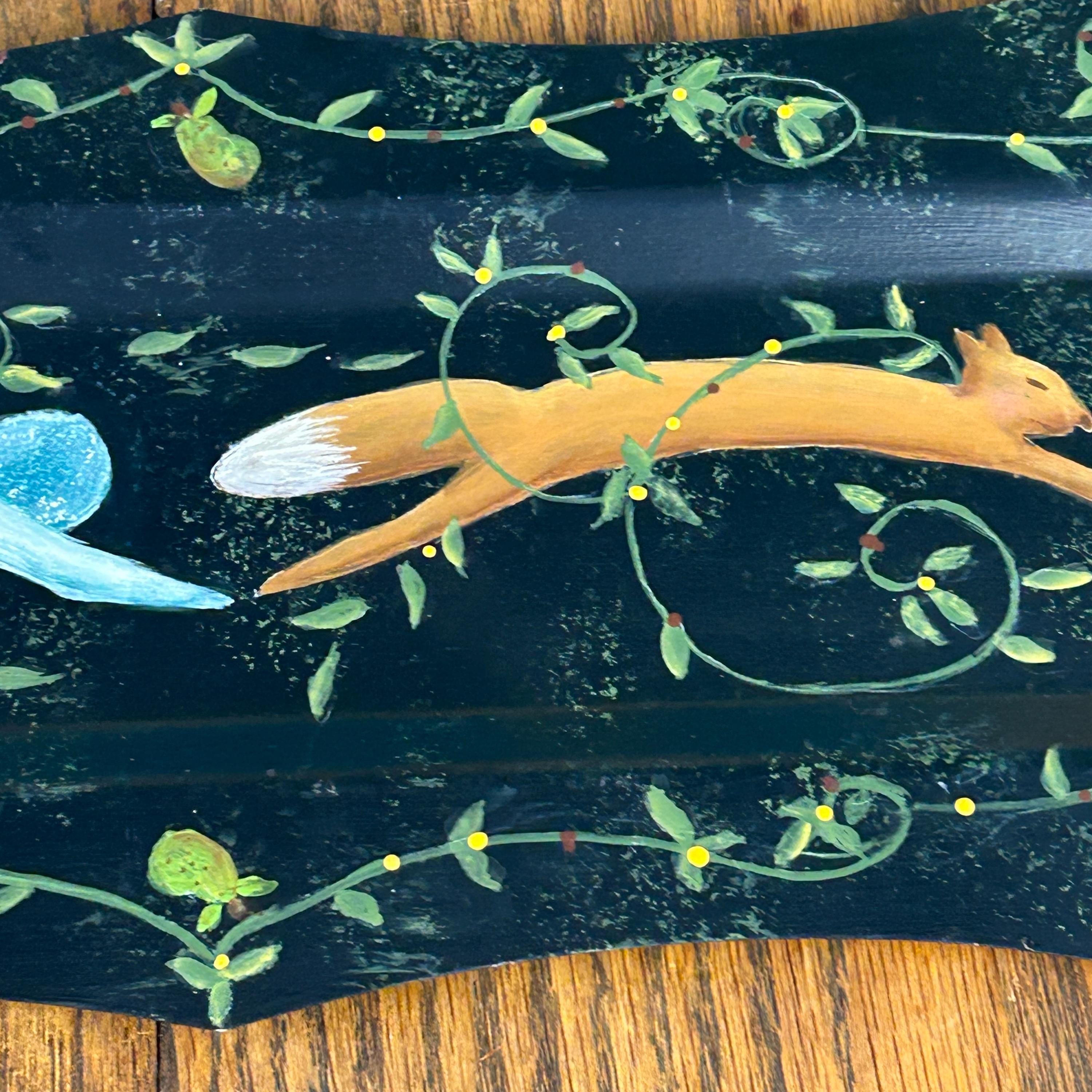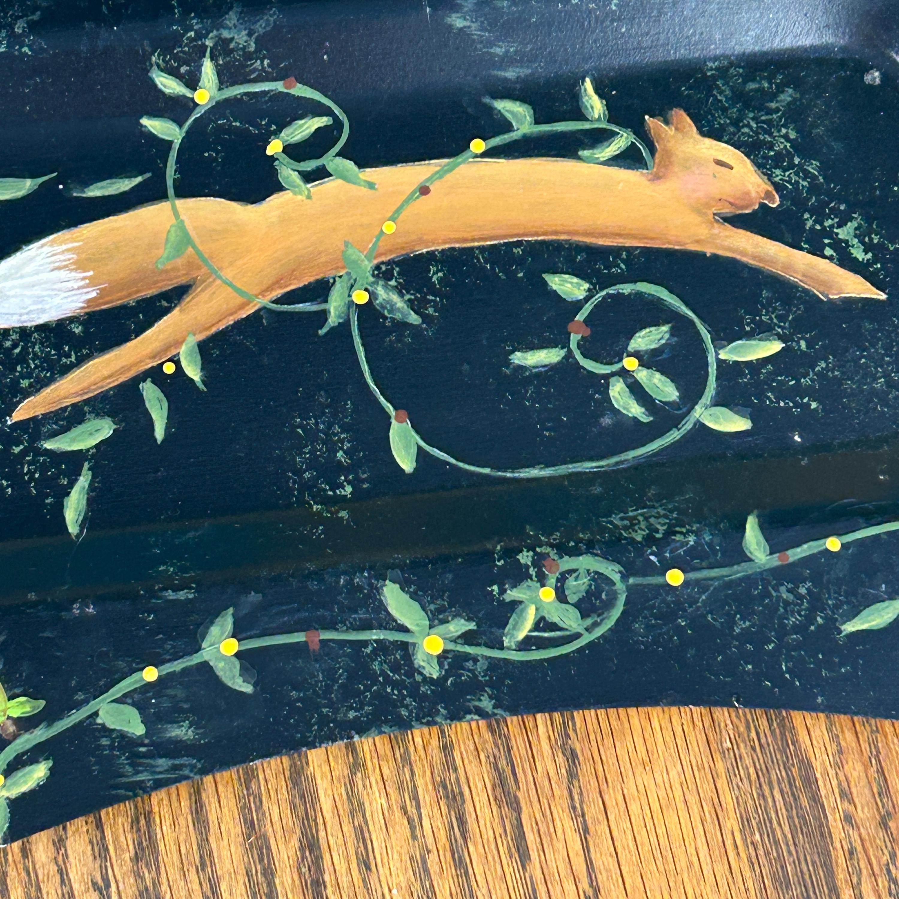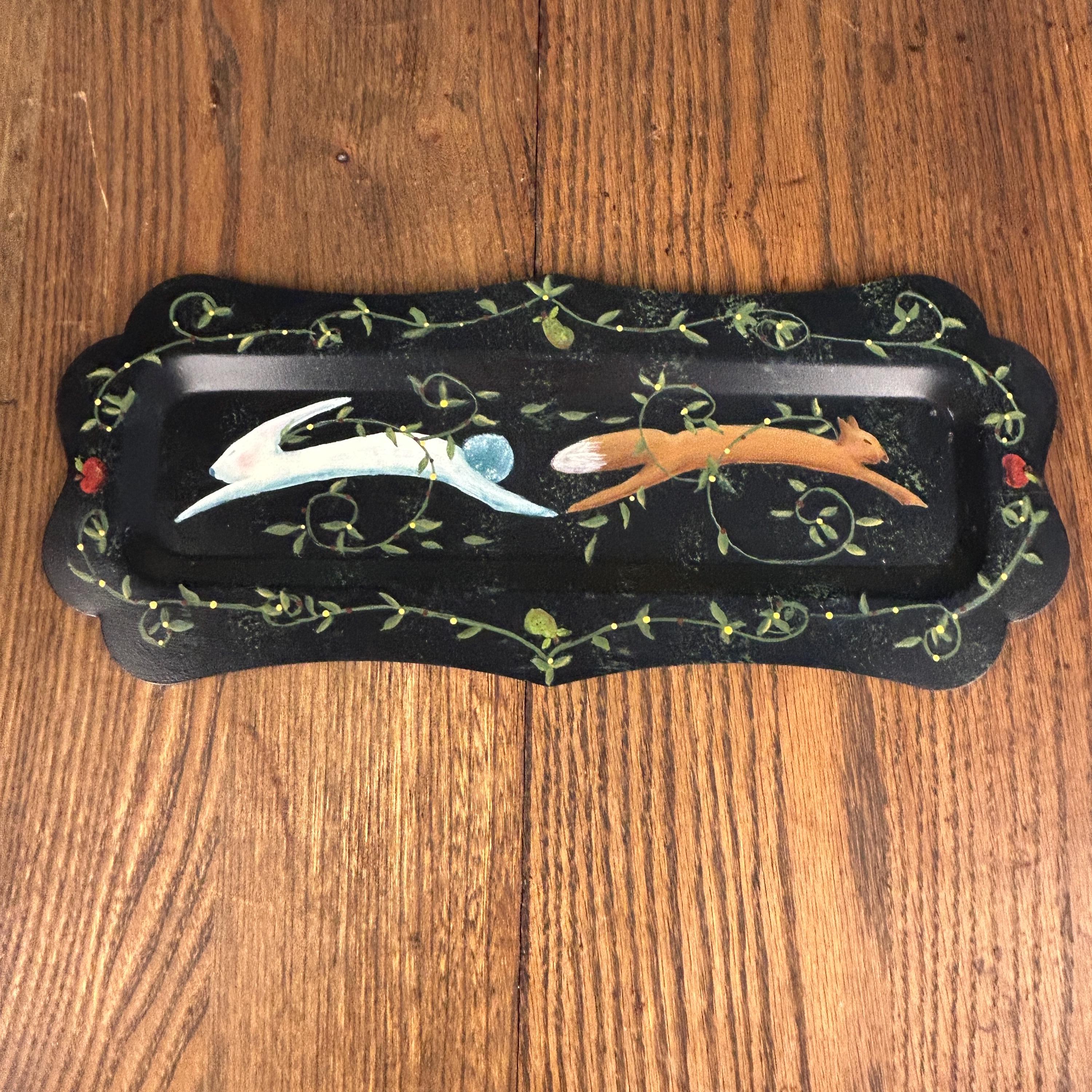 This beautiful vintage hand-painted metal tray is a true cottagecore gem. Signed by the artist “Ruth 2003,” it features a charming woodland scene with a rabbit and fox nestled among soft trailing foliage.