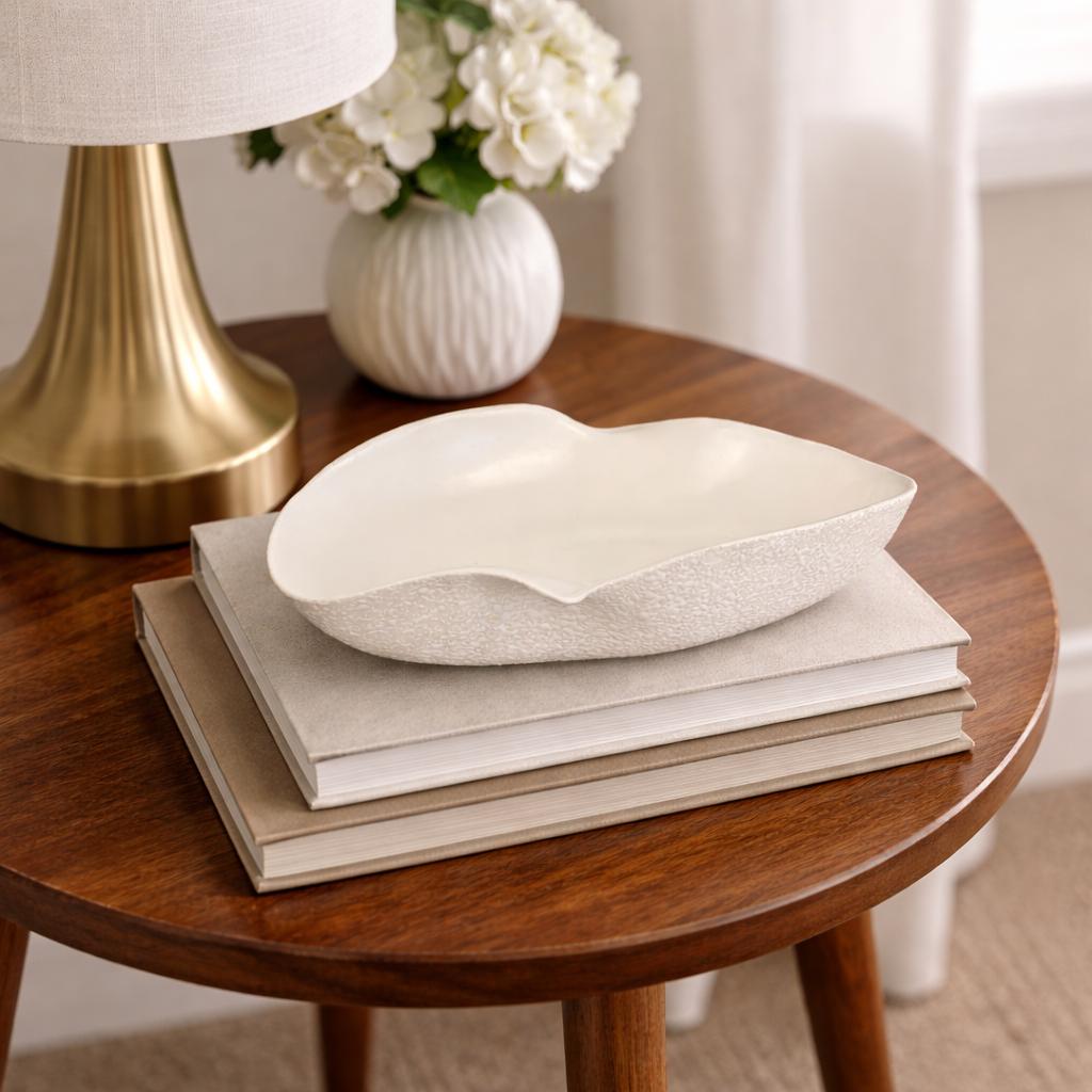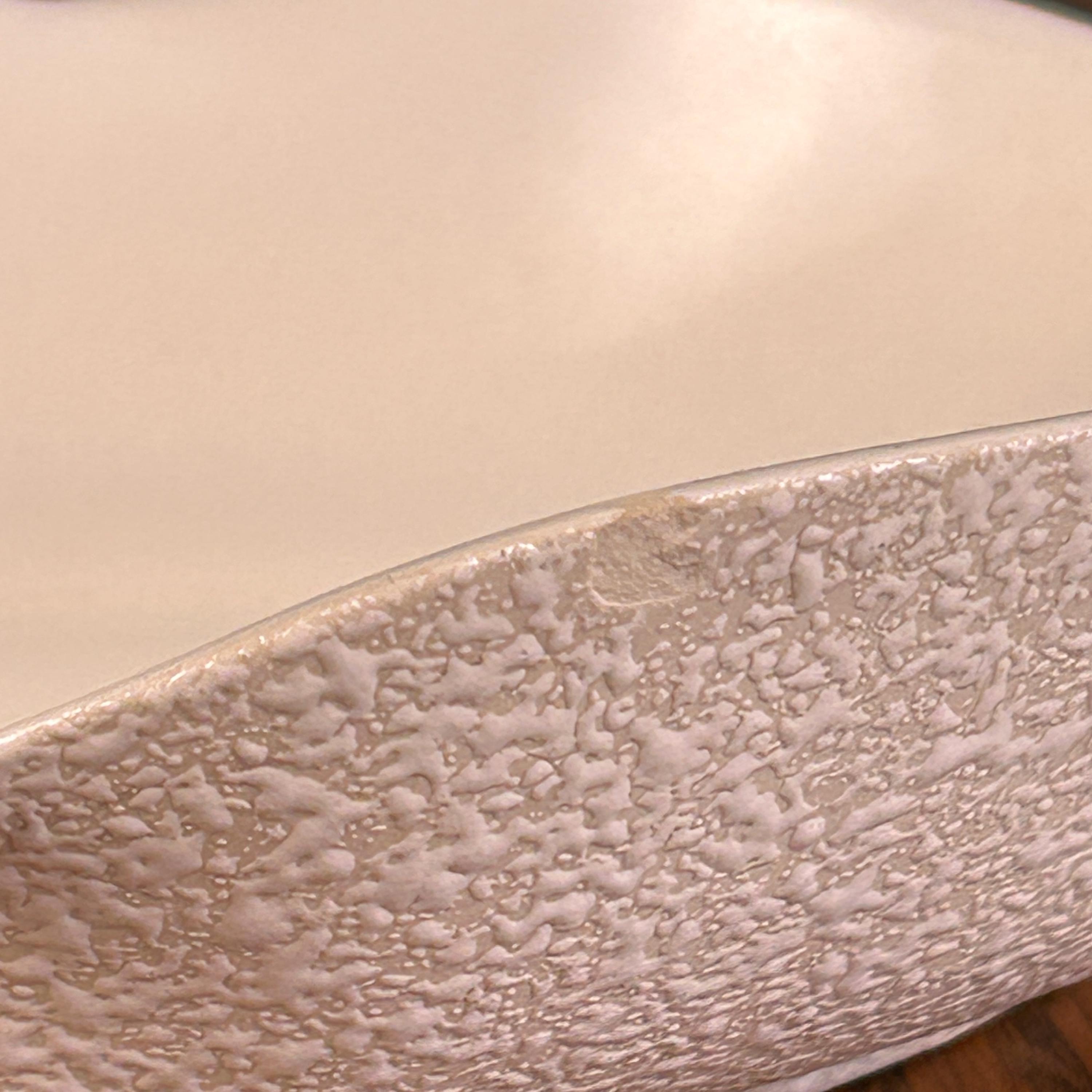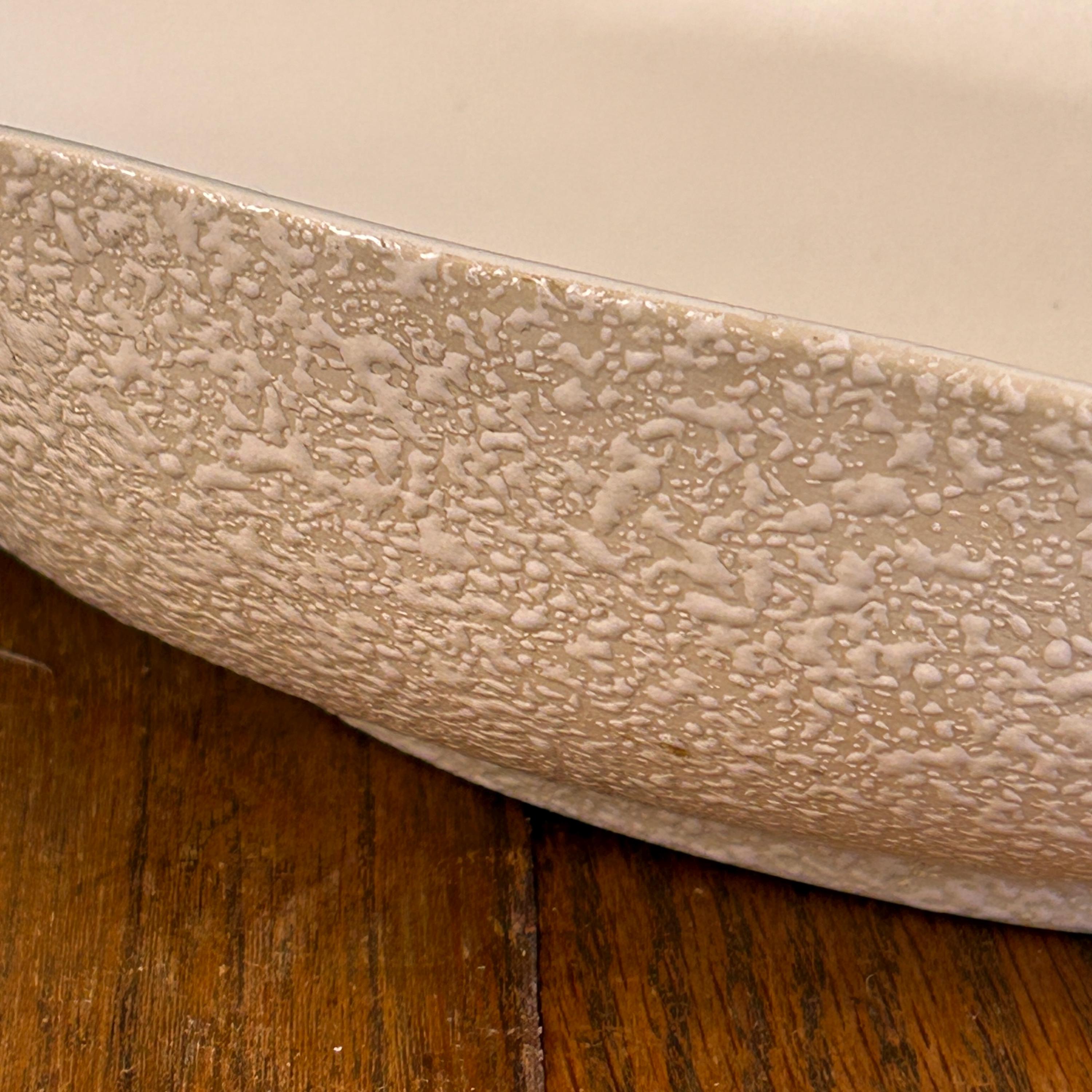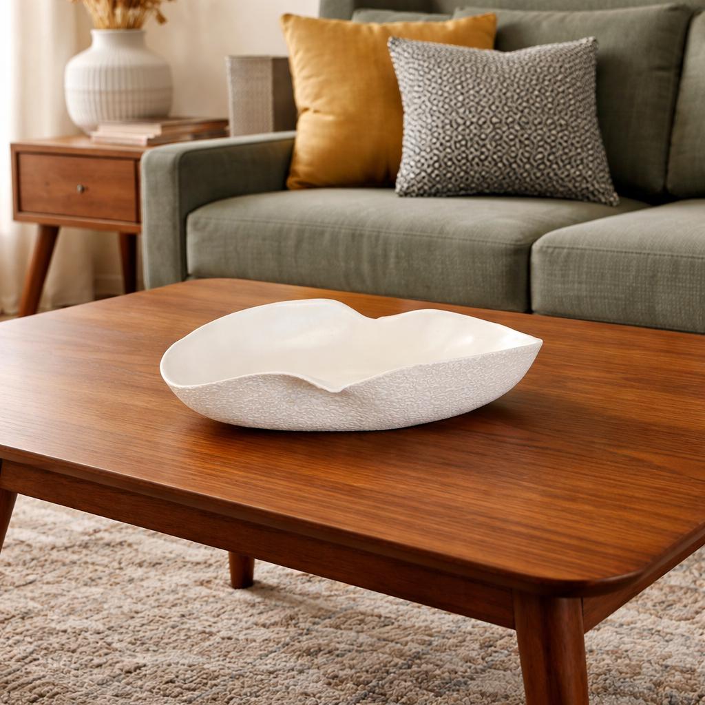 The white ceramic body is accented with a subtle speckled/spatter finish, adding texture and visual interest while maintaining a clean, minimalist look. Perfect as a centerpiece, catchall, or decorative accent, this bowl blends seamlessly into both modern and vintage-inspired spaces.