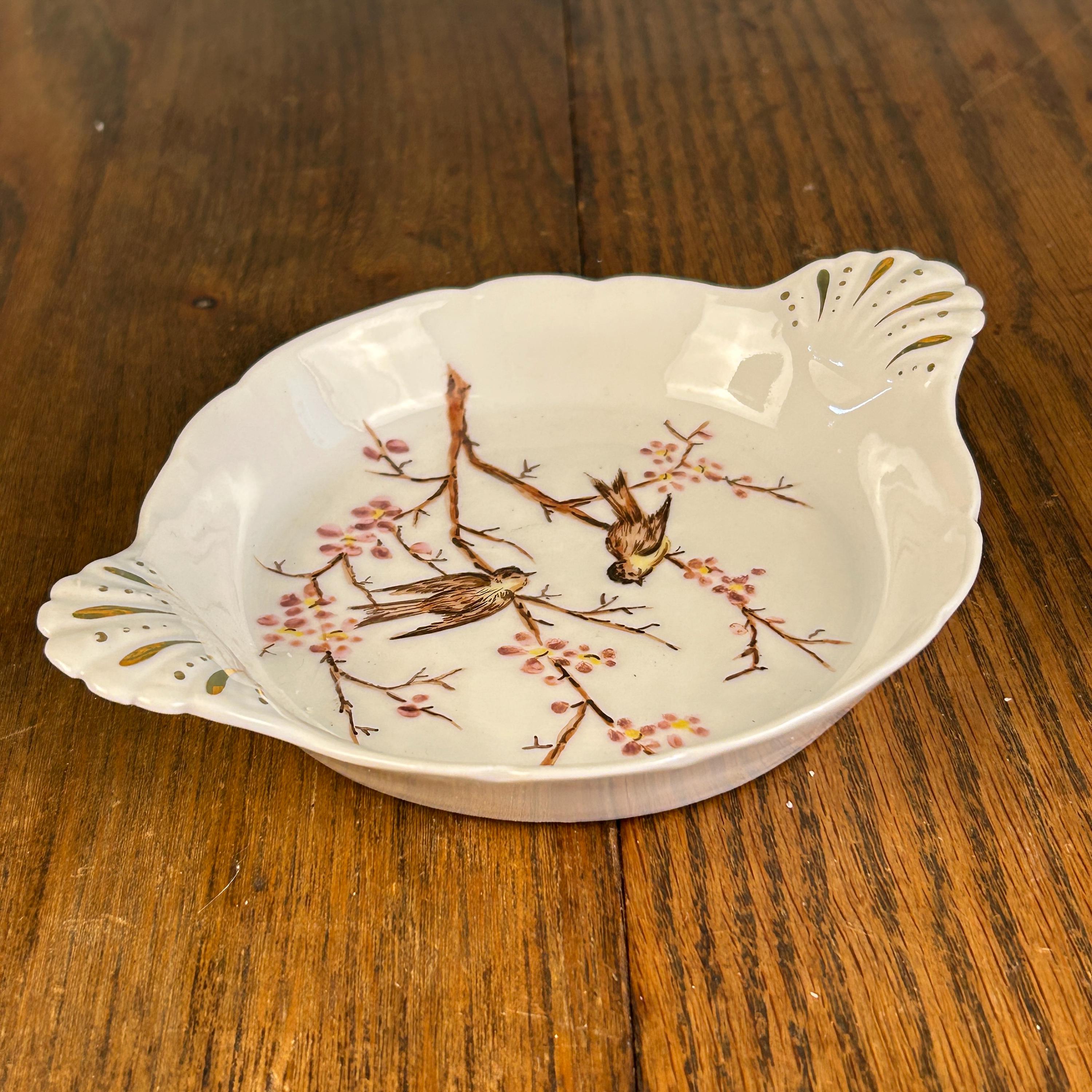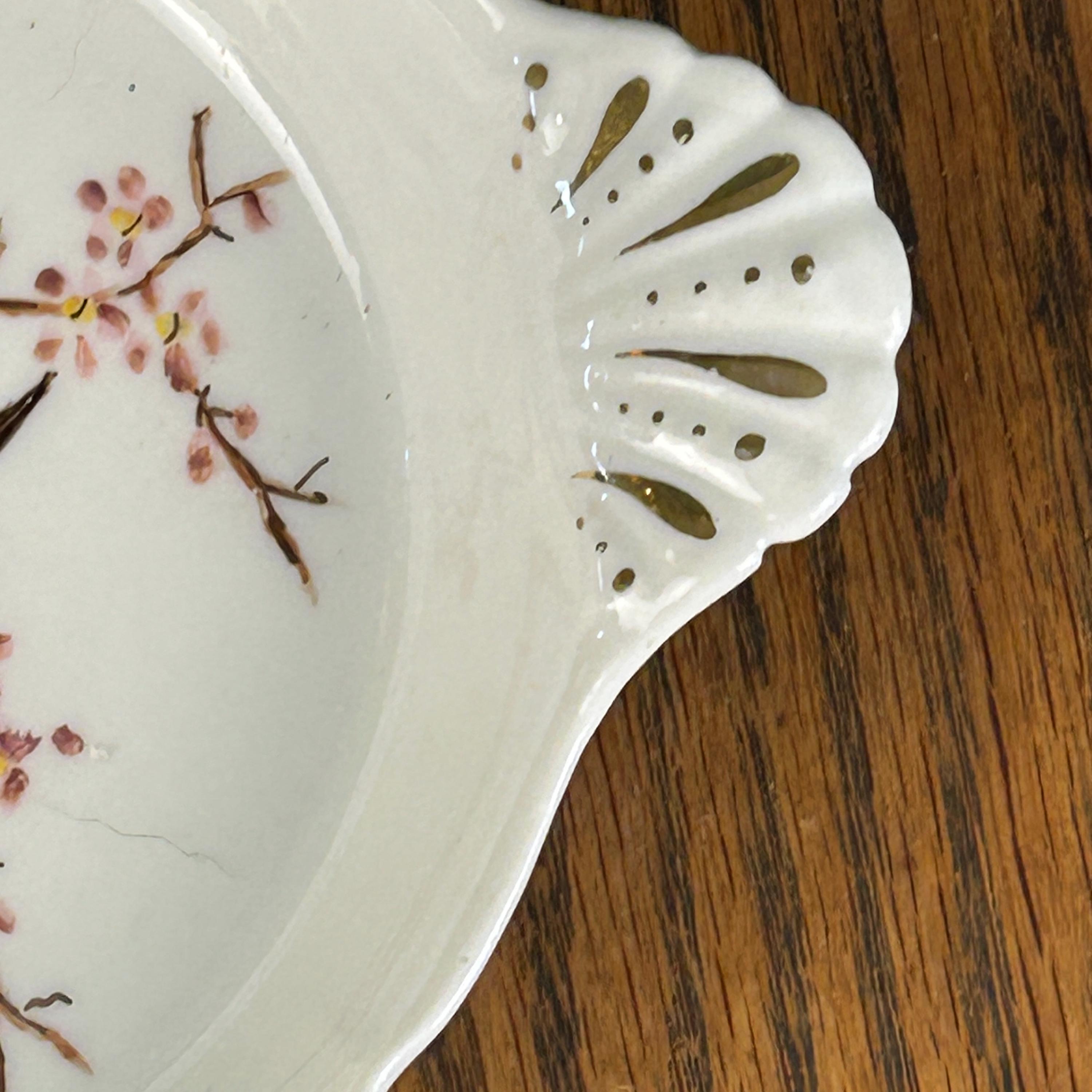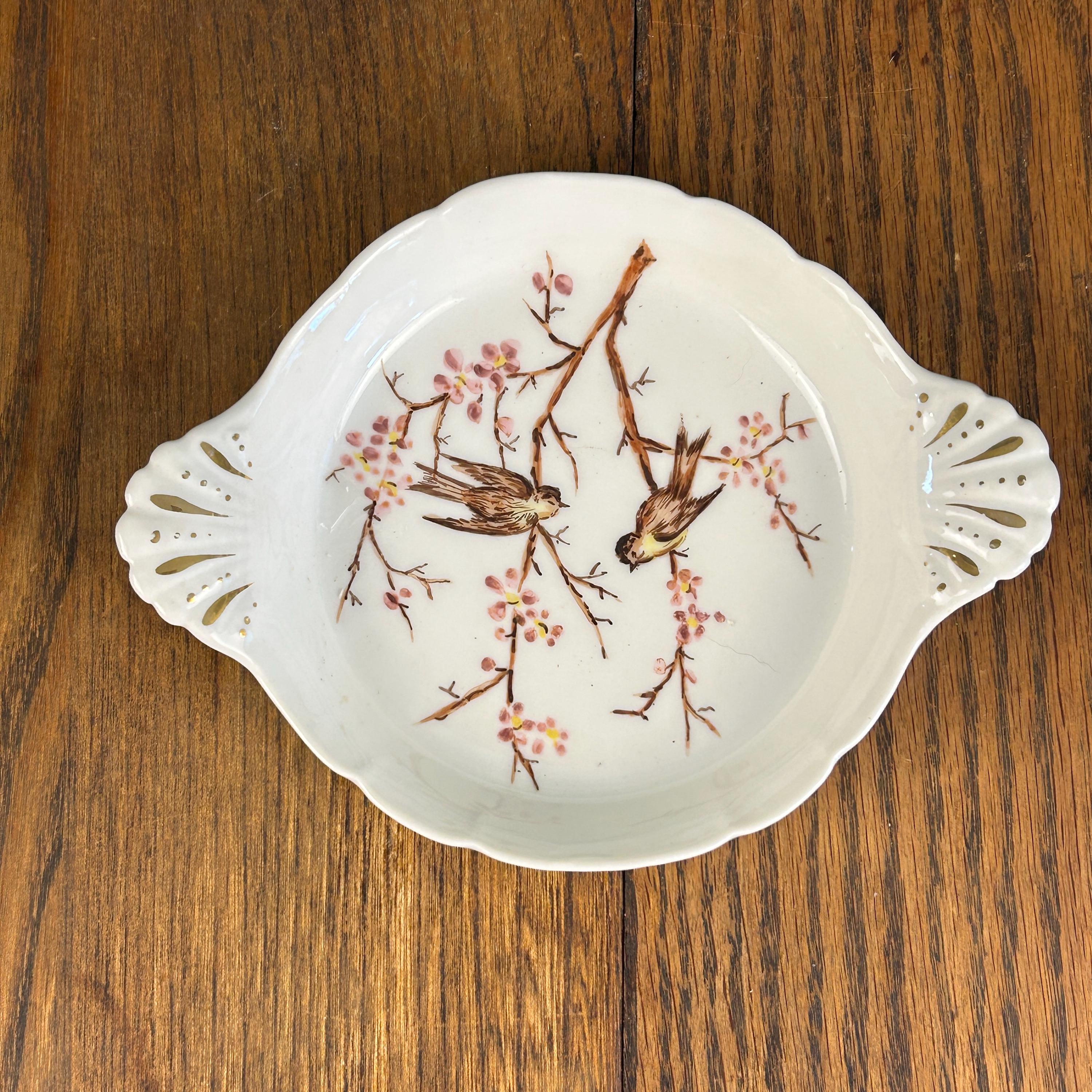 This beautiful vintage hand-painted porcelain dish features a delicate and serene scene of two birds perched among blooming cherry blossom branches. The soft, intricate artwork is complemented by elegant gold gilt accents on the pierced, scalloped handles, giving this piece a refined and timeless look.
