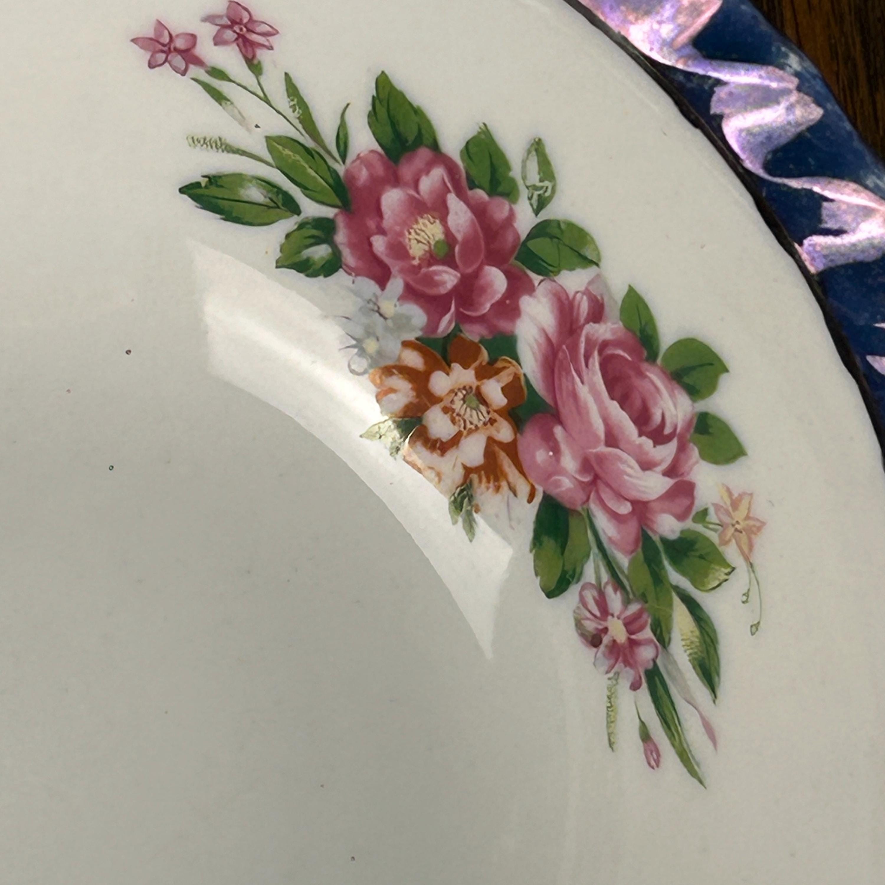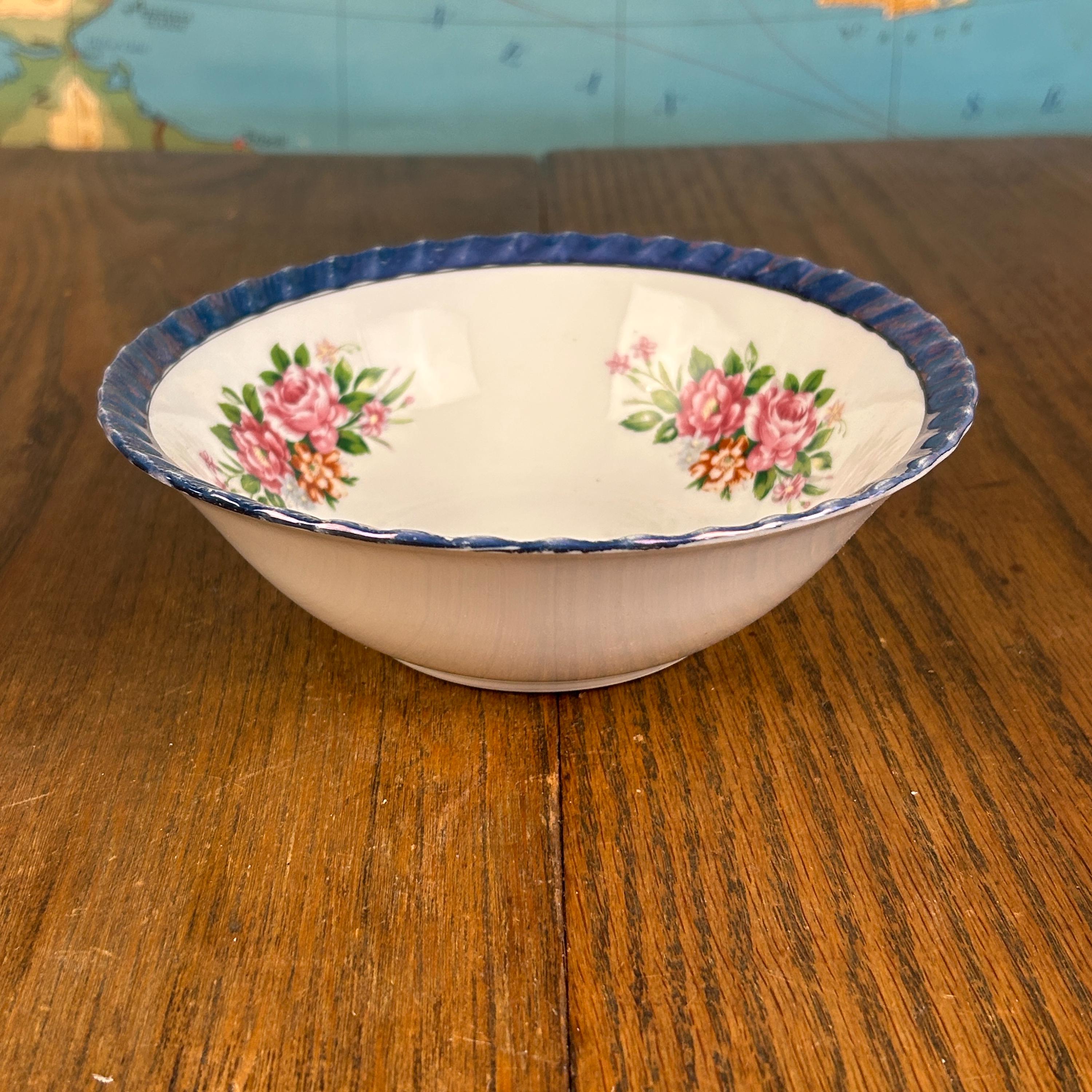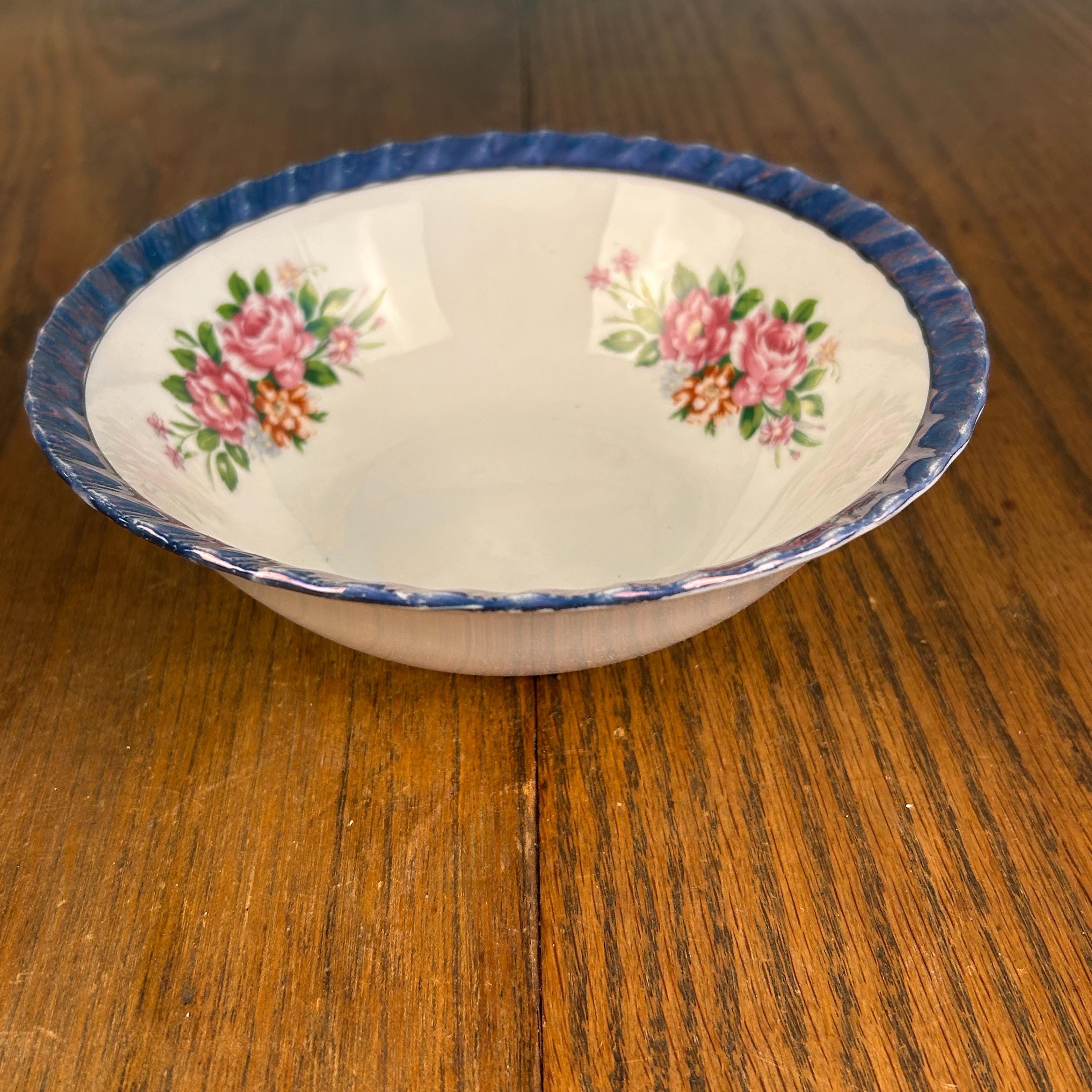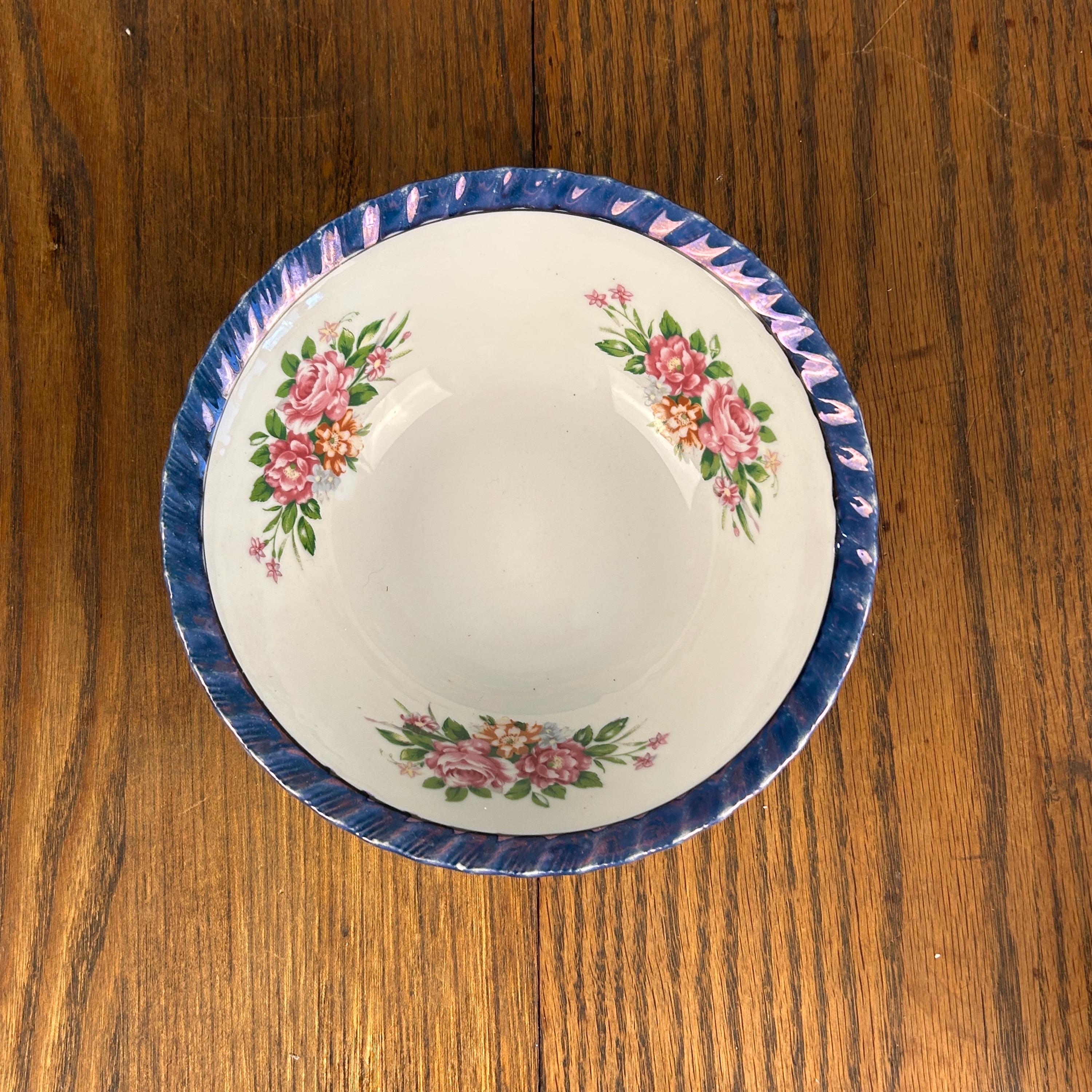 This beautiful vintage Yamatsu Japan porcelain bowl features a delicate and timeless design, highlighted by a shimmering blue lusterware scalloped rim and soft pink rose floral sprays.