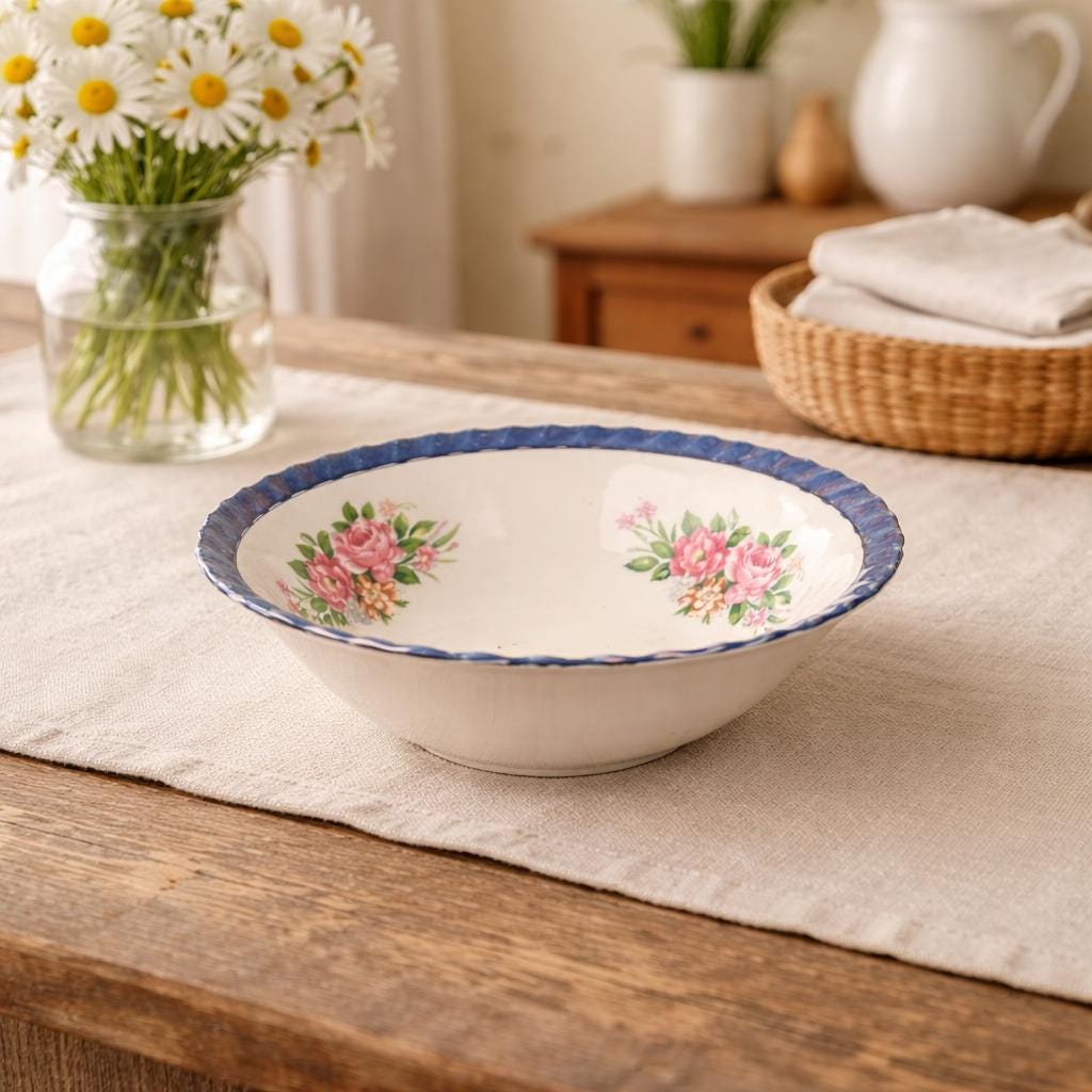 The iridescent blue edge adds a subtle glow, perfectly complementing the romantic floral pattern on the white porcelain body. Both functional and decorative, this bowl is ideal for serving soups, cereal, rice, or simply displaying as part of a charming cottage-inspired collection.