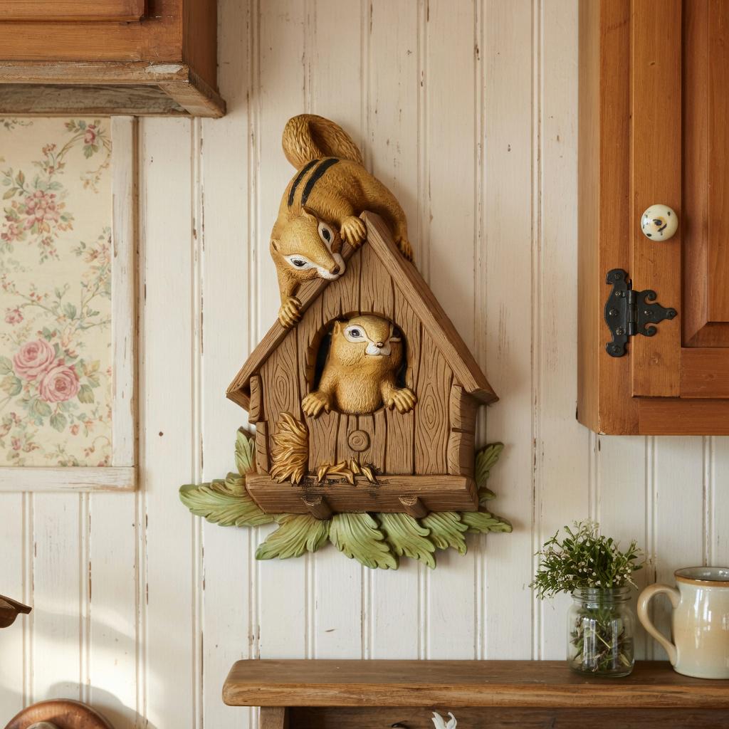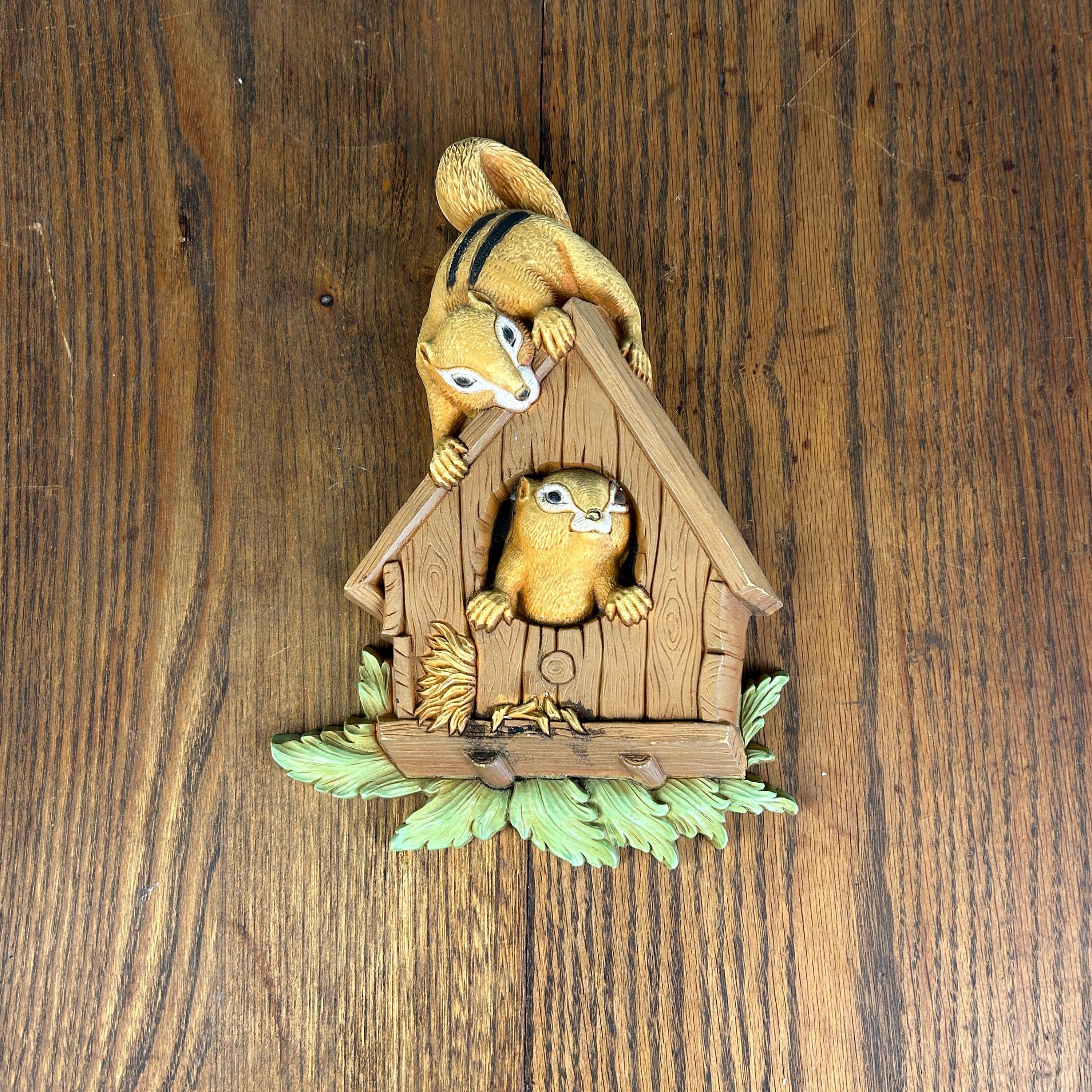 This charming vintage 1977 Seroco wall plaque features an adorable woodland scene with chipmunks gathered around a birdhouse in a raised 3D design. Full of nostalgic detail, this piece captures the playful, nature-inspired style that made Seroco wall décor so popular.