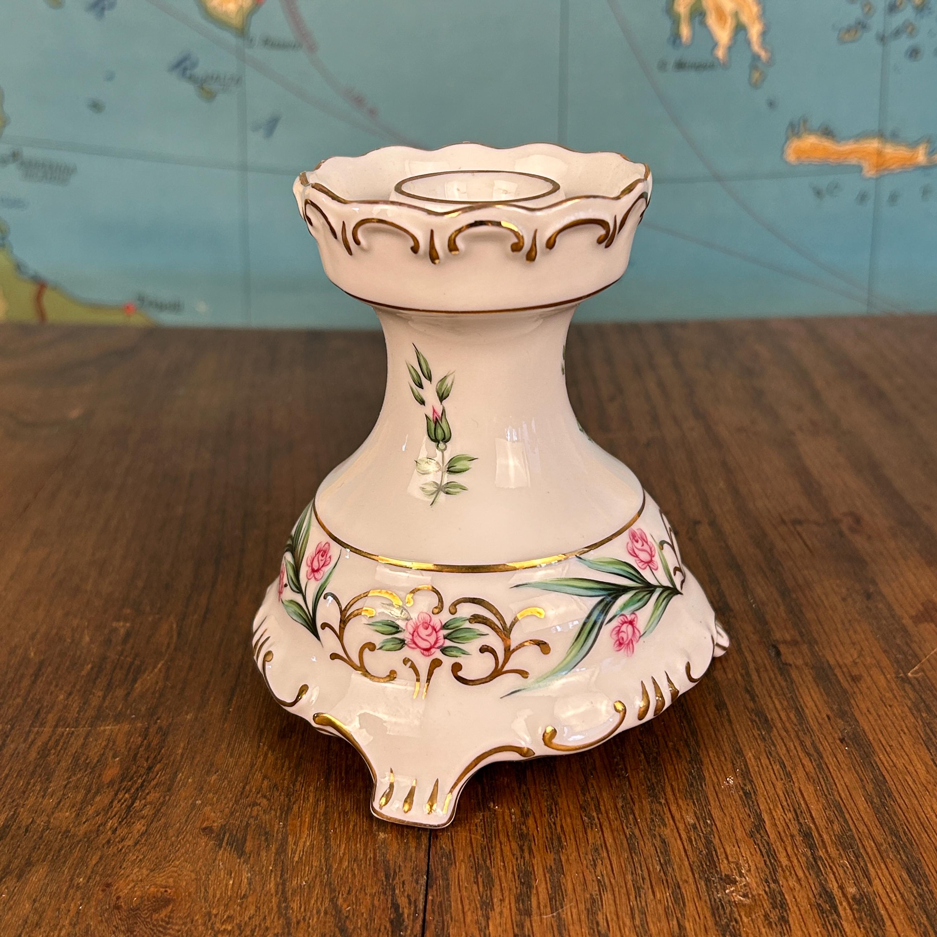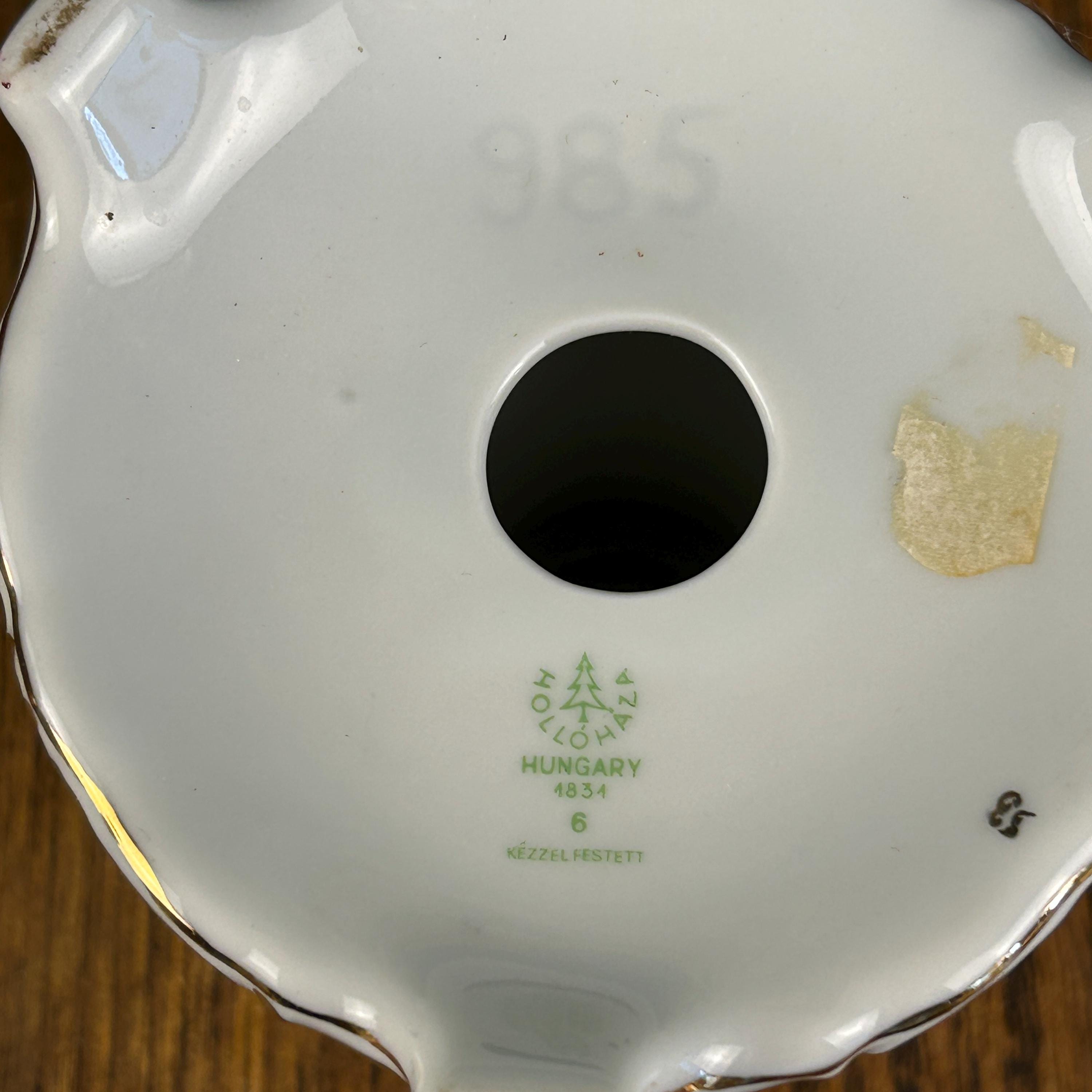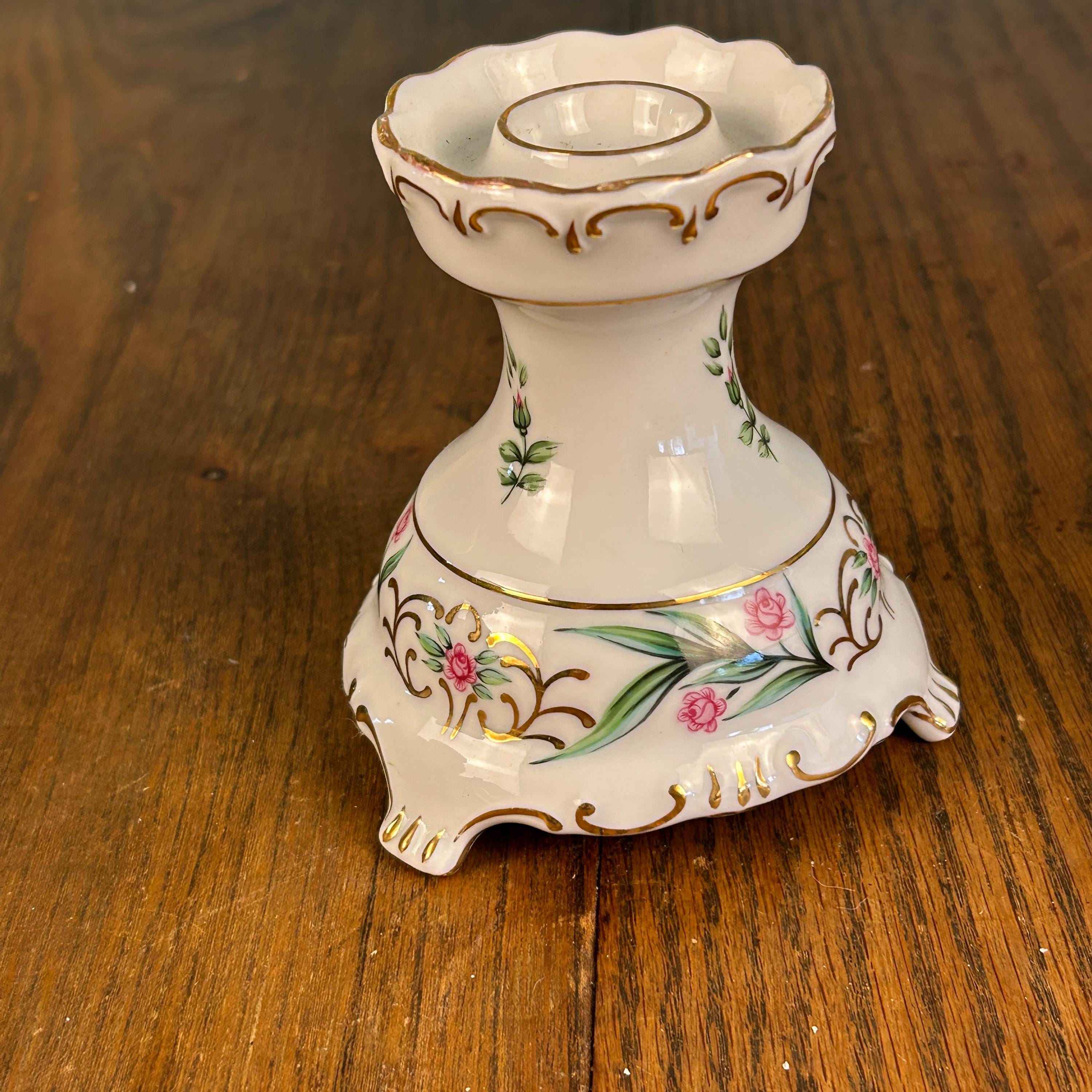This elegant vintage Hollóháza Hungary porcelain candlestick is a beautiful example of fine European craftsmanship. Hand-painted with delicate pink roses and soft green foliage, it is finished with gleaming gold gilt accents that highlight its graceful form.
