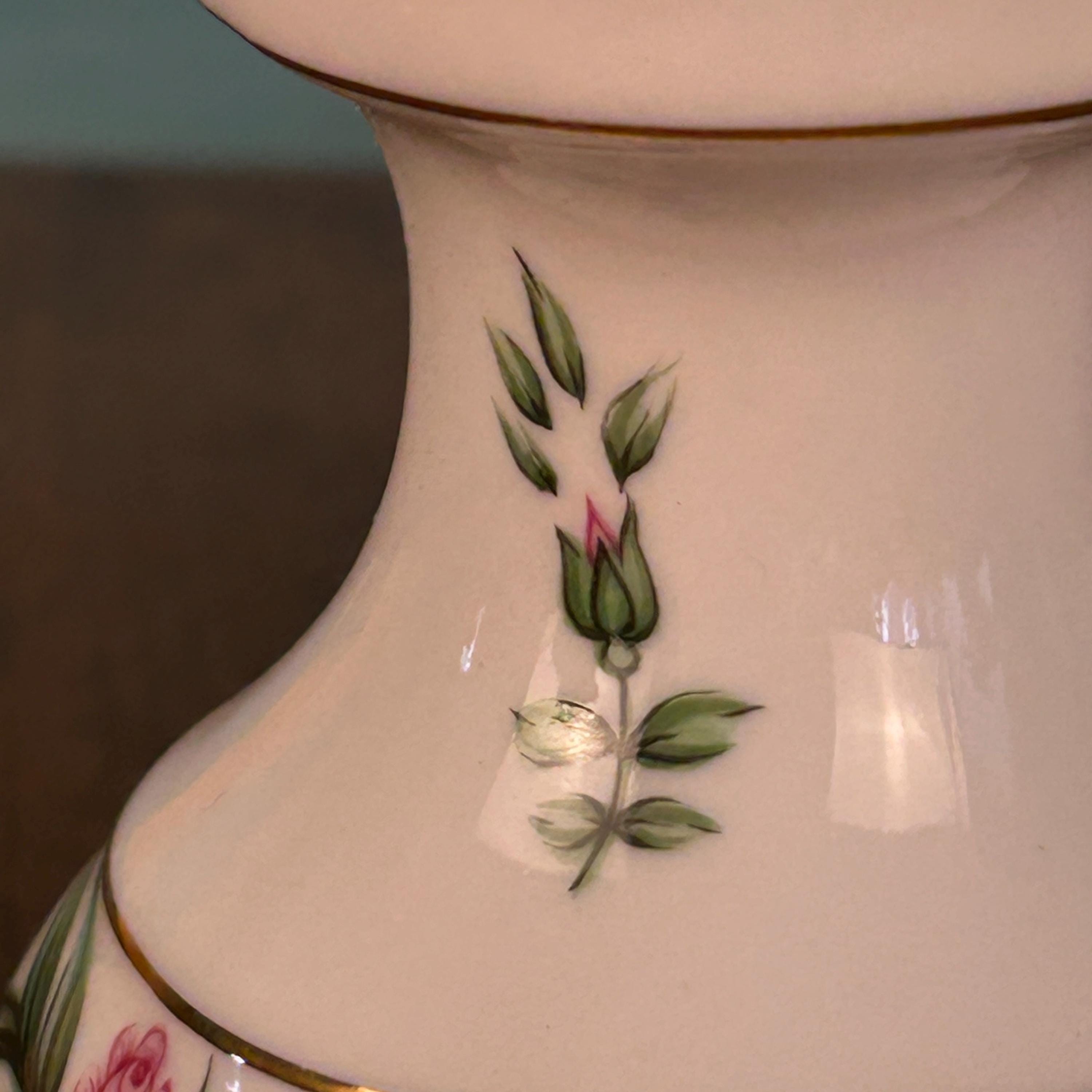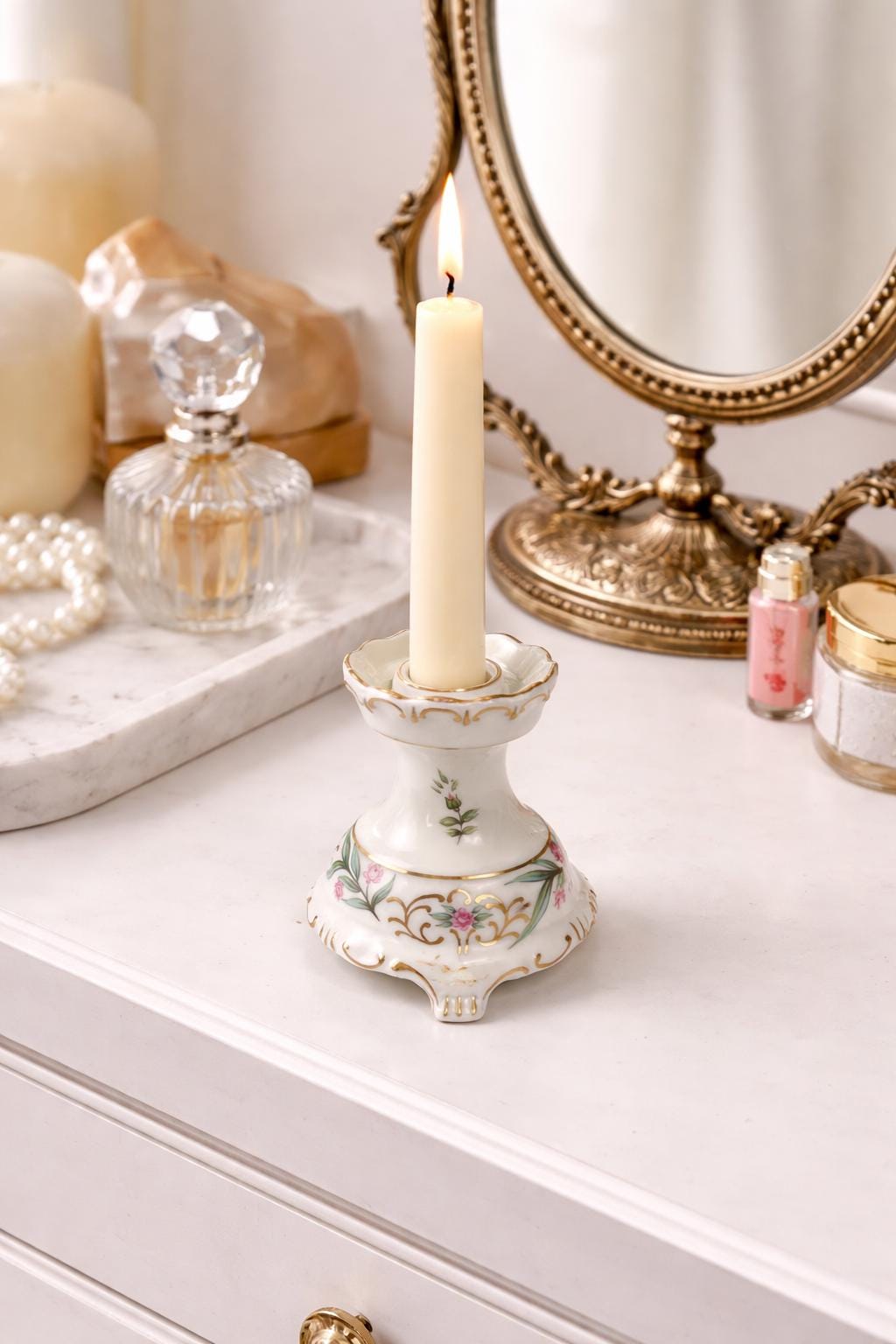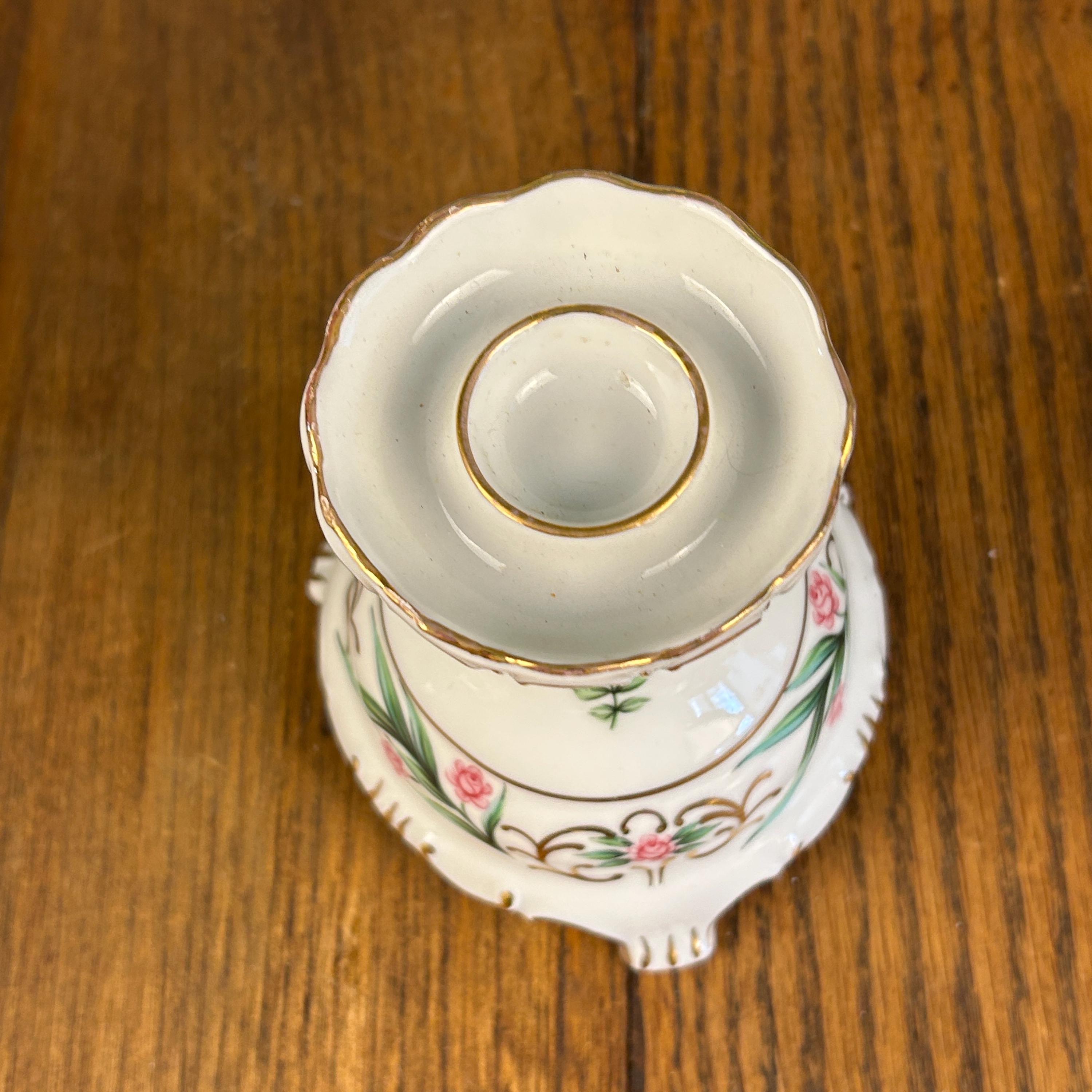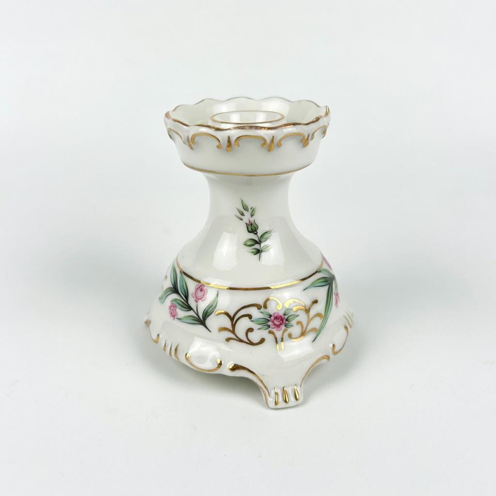 This elegant vintage Hollóháza Hungary porcelain candlestick is a beautiful example of fine European craftsmanship. Hand-painted with delicate pink roses and soft green foliage, it is finished with gleaming gold gilt accents that highlight its graceful form.