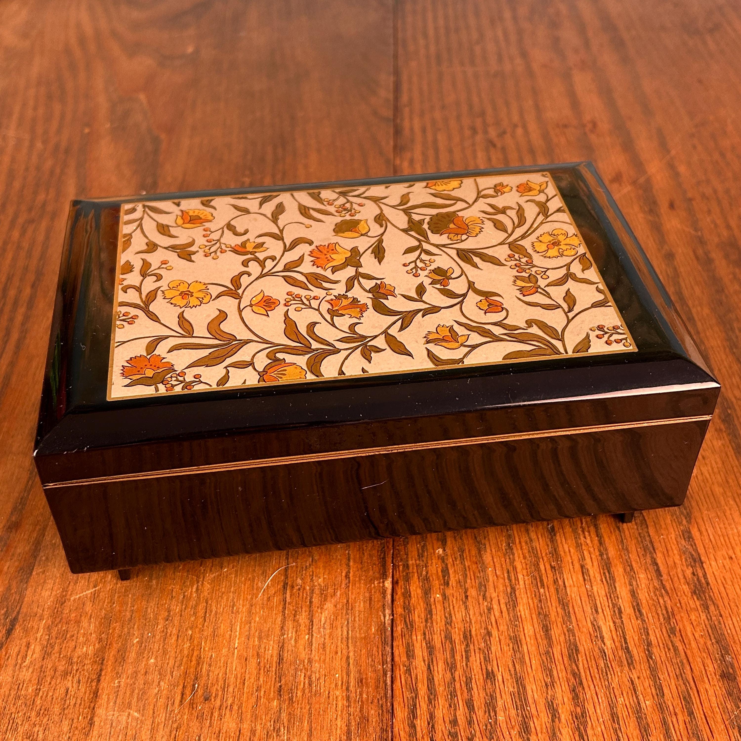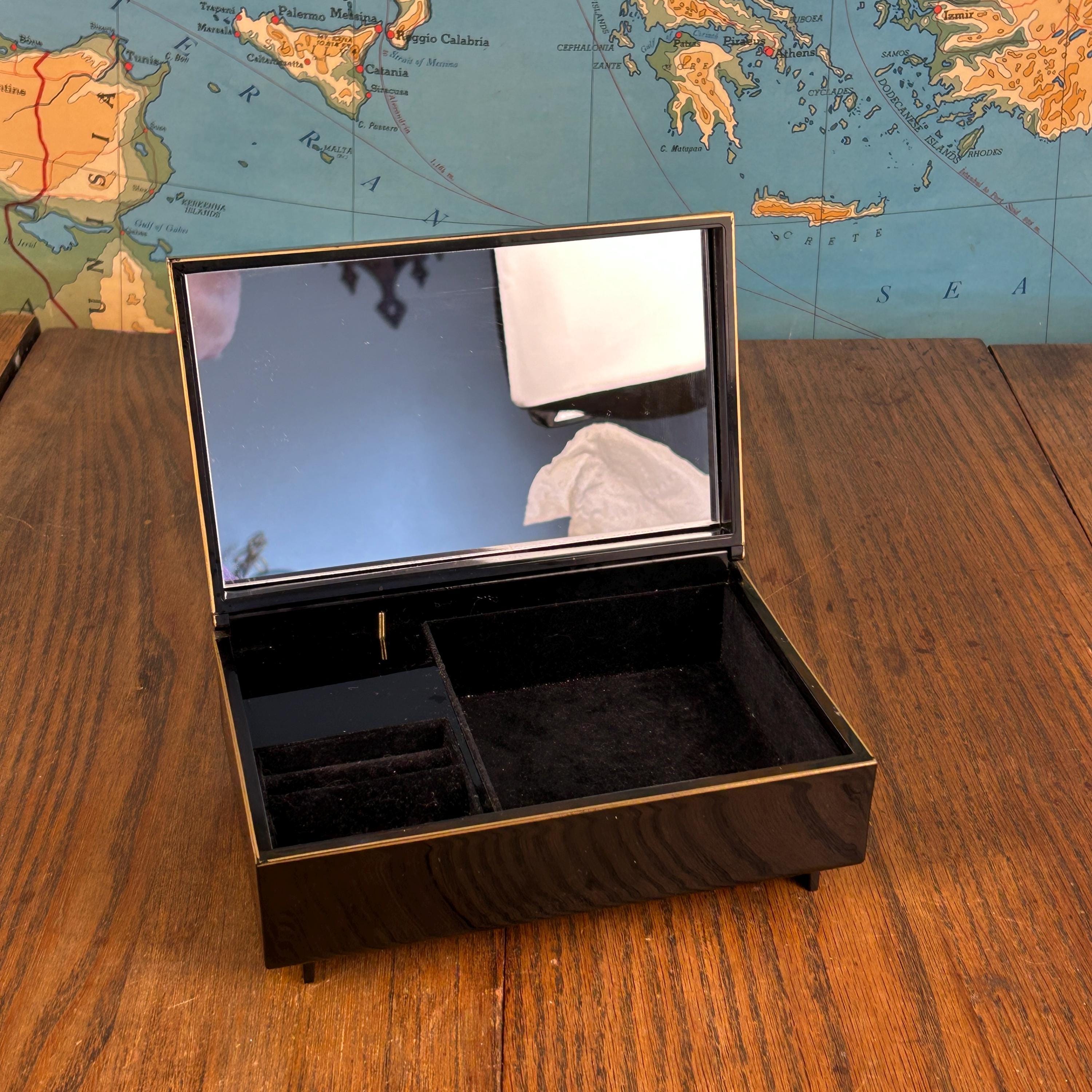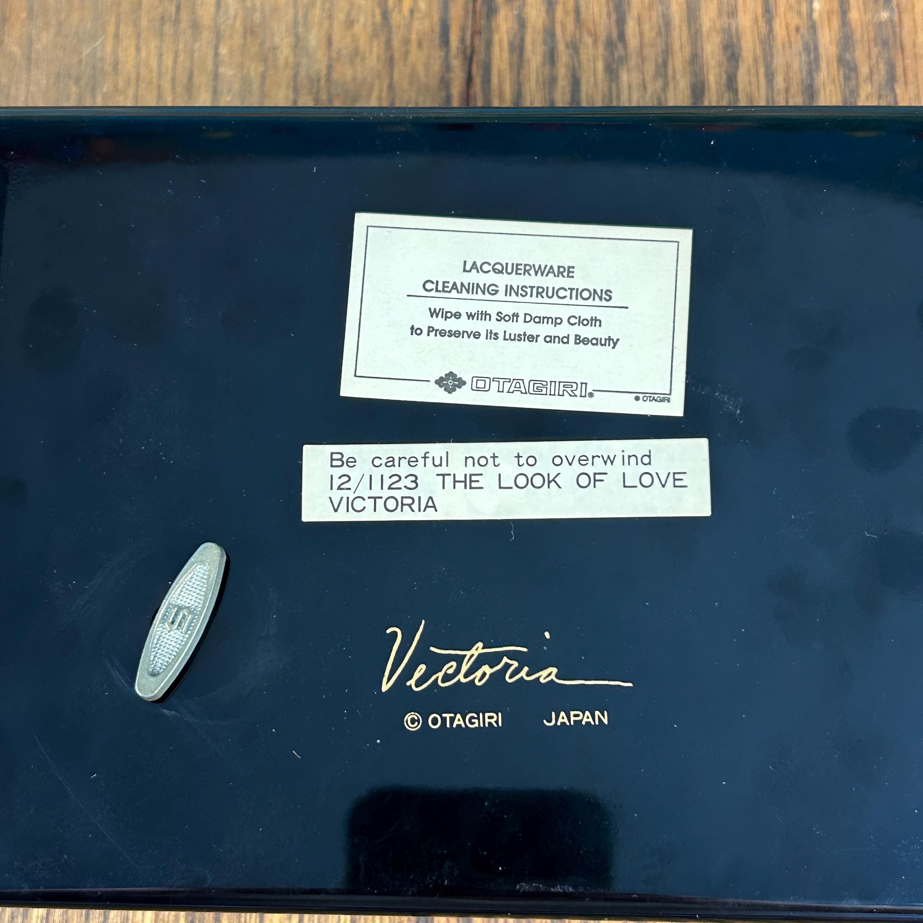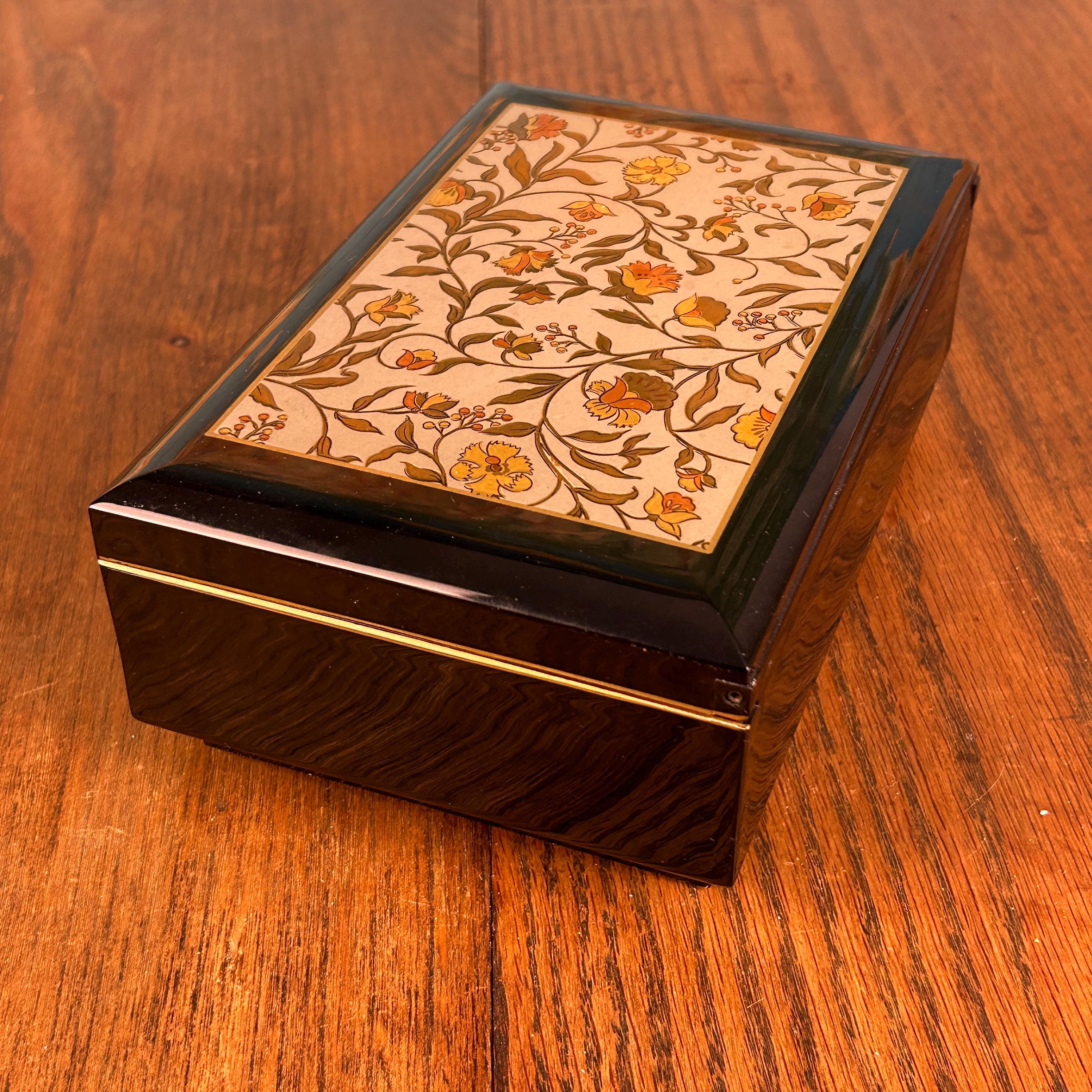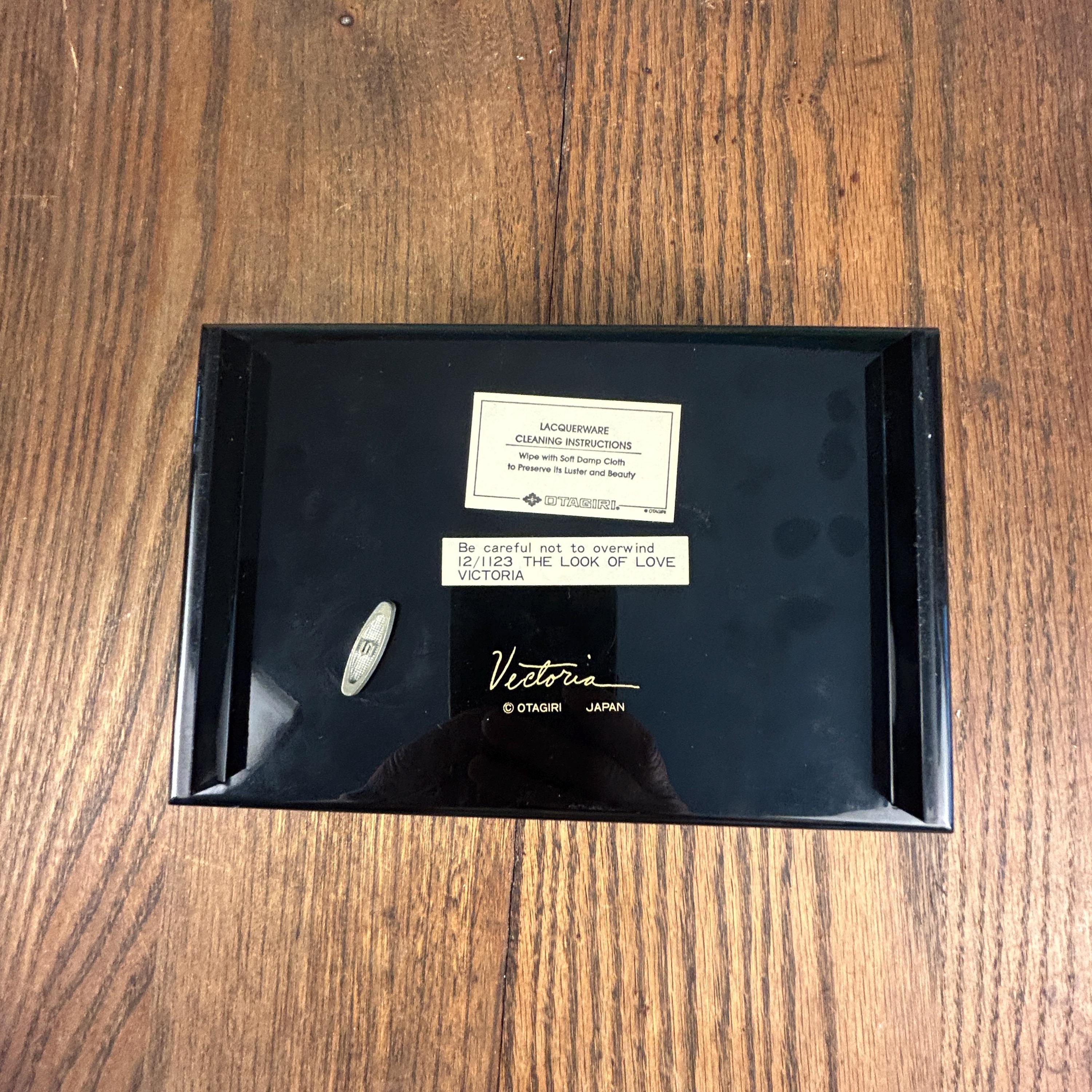 This beautiful vintage Otagiri Japan lacquerware music jewelry box is a timeless piece of vanity decor from the 1970s–early 1980s. Featuring a sleek black lacquered finish with elegant gold trim, the lid is adorned with a delicate floral inlay that adds a refined, feminine touch.