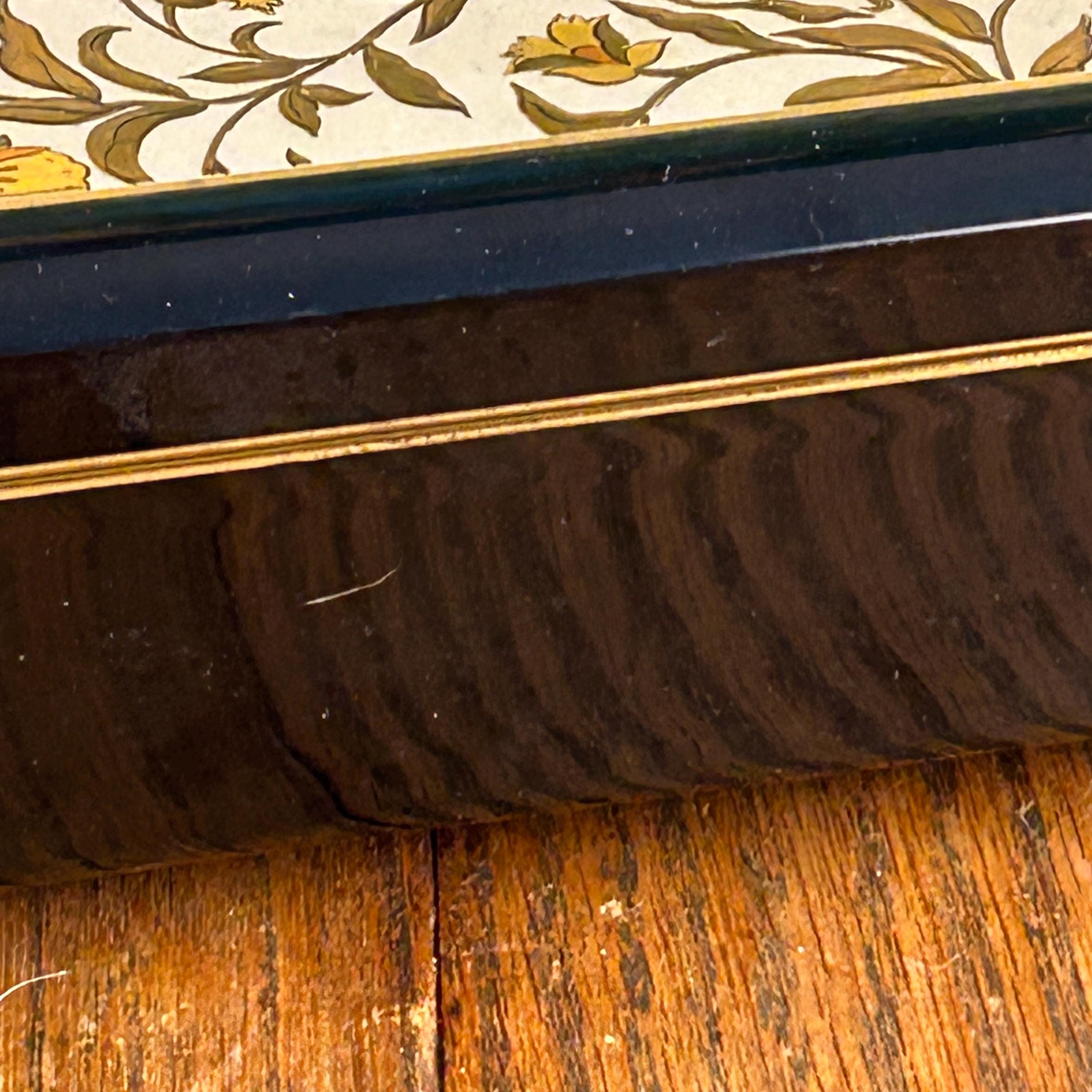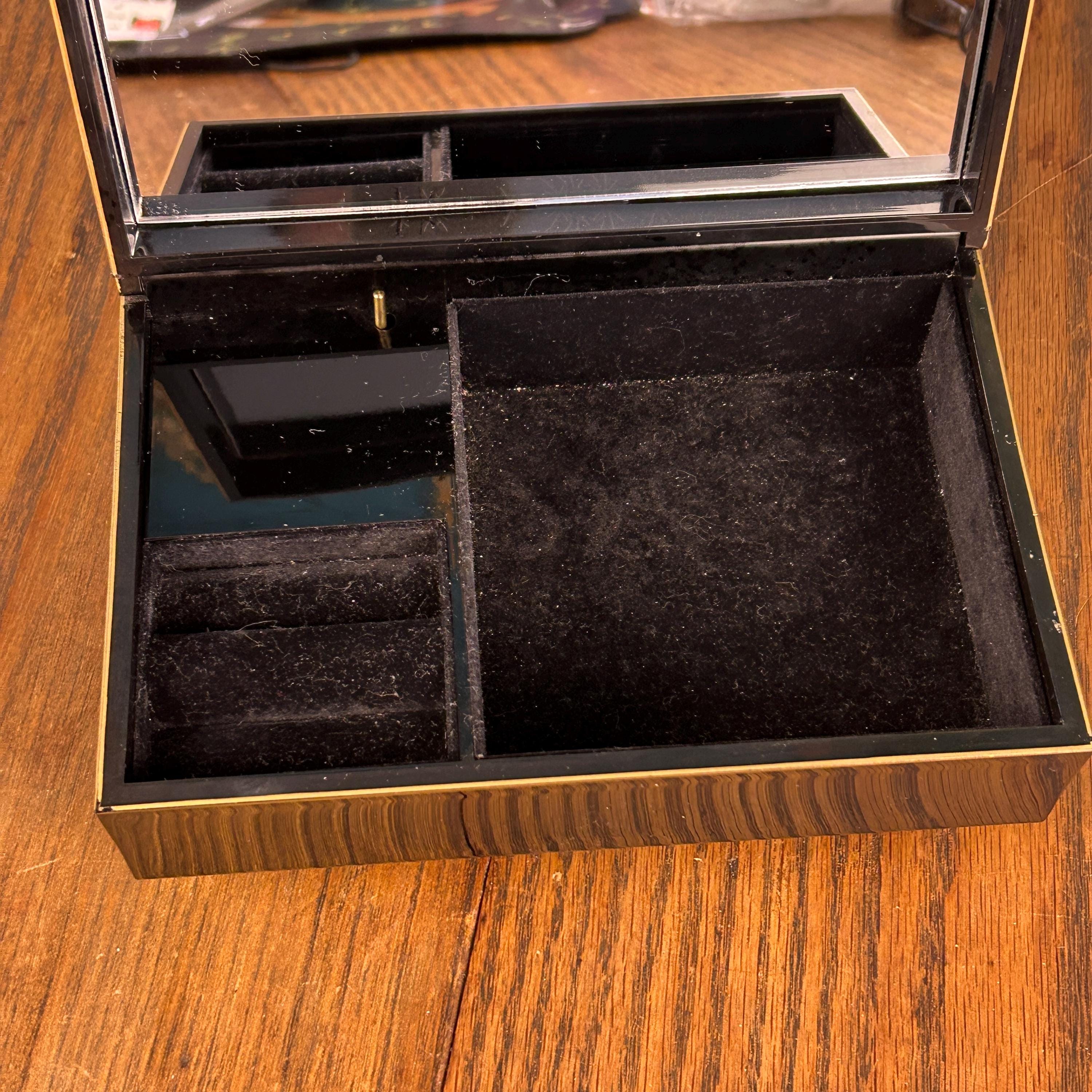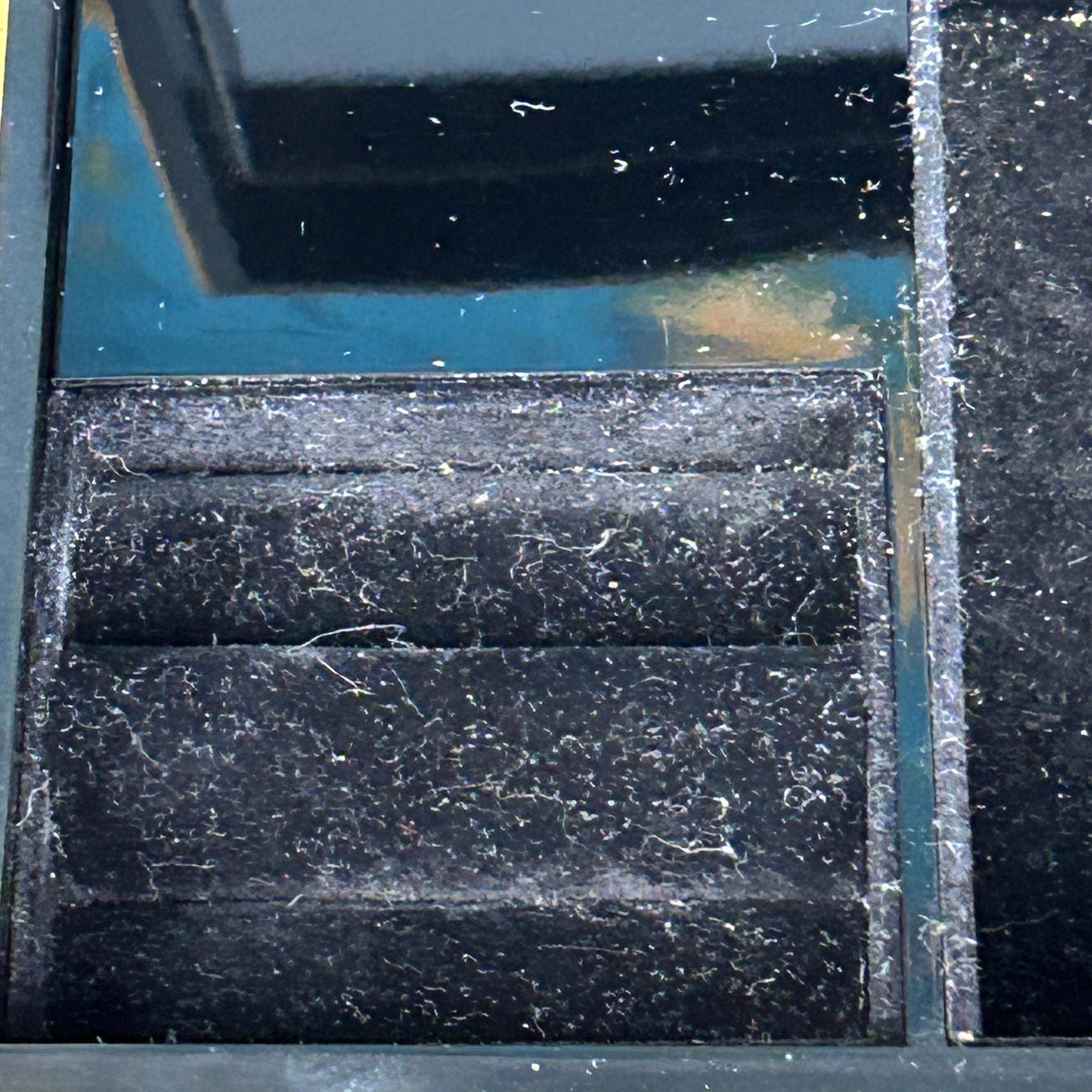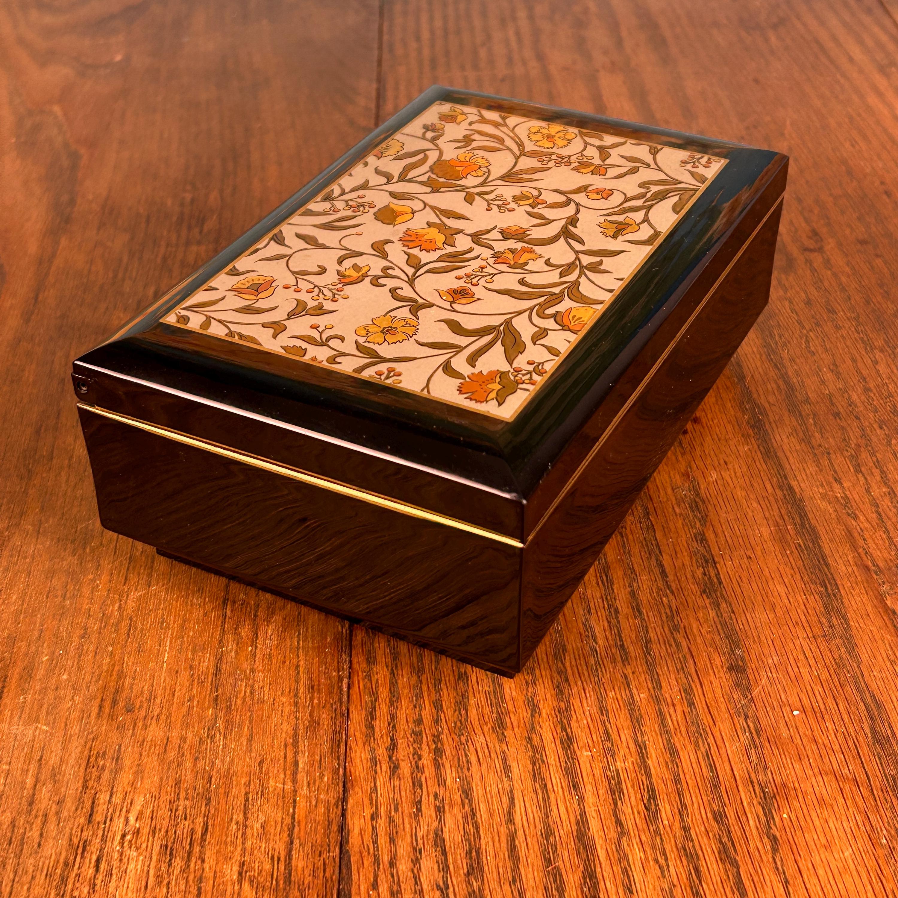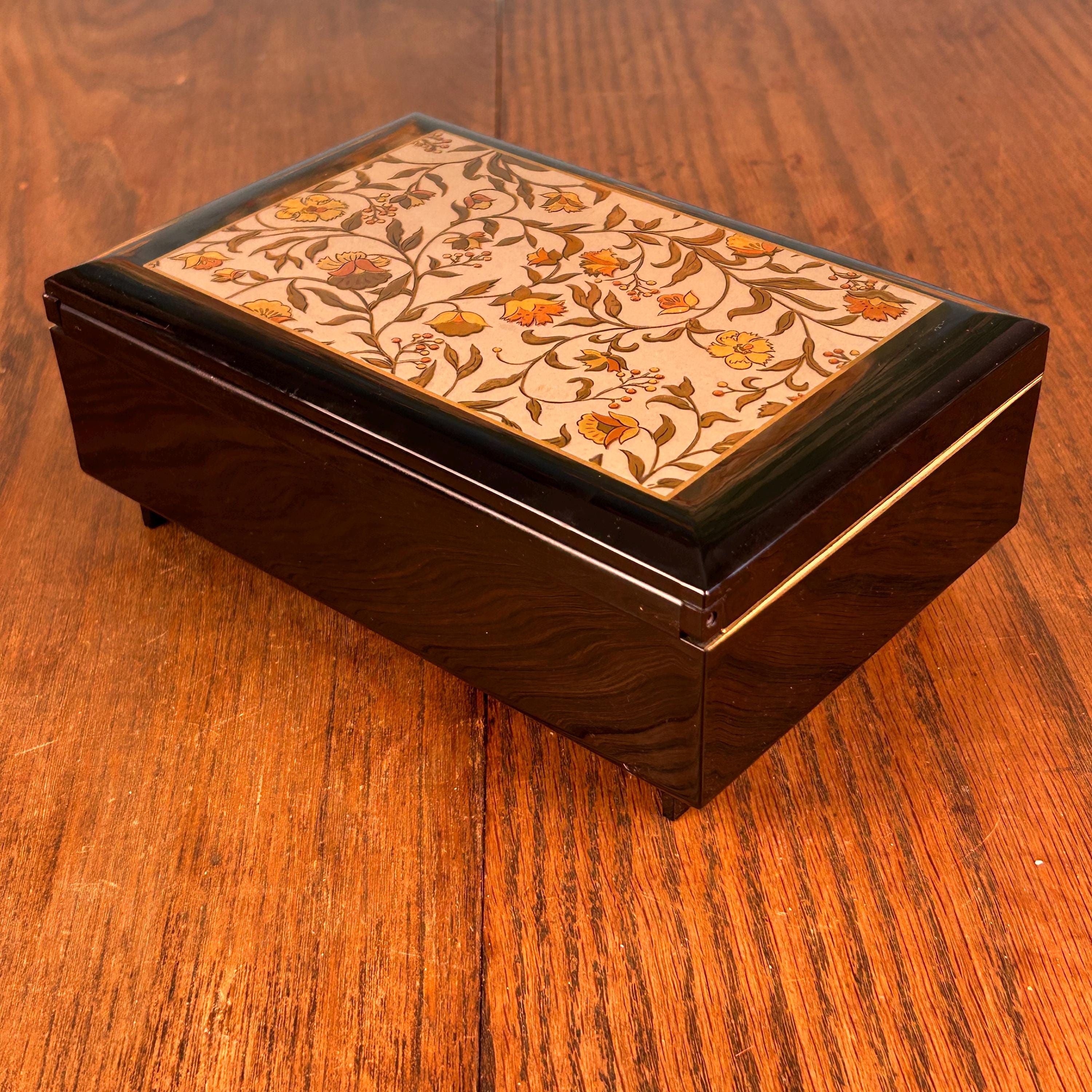 This beautiful vintage Otagiri Japan lacquerware music jewelry box is a timeless piece of vanity decor from the 1970s–early 1980s. Featuring a sleek black lacquered finish with elegant gold trim, the lid is adorned with a delicate floral inlay that adds a refined, feminine touch.
