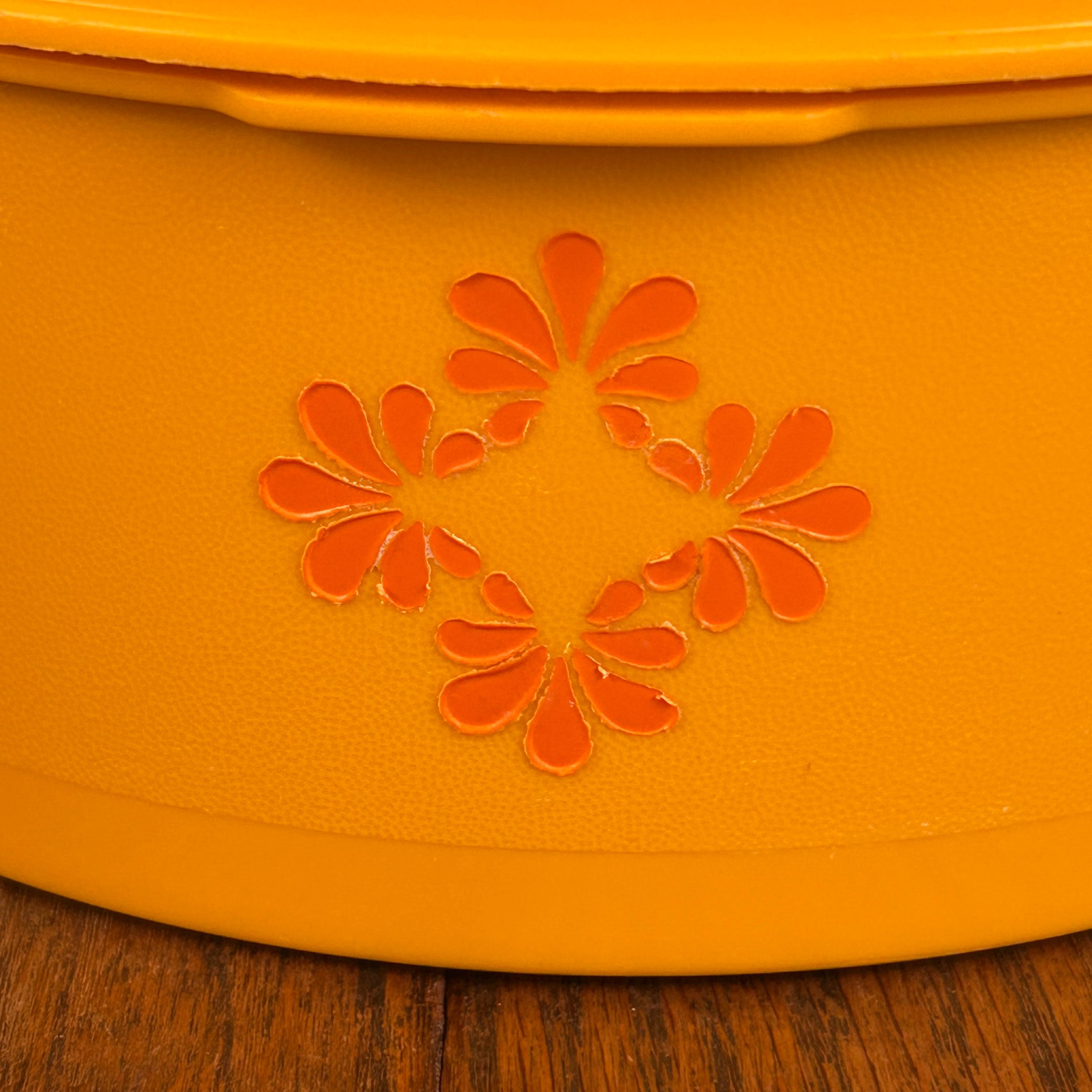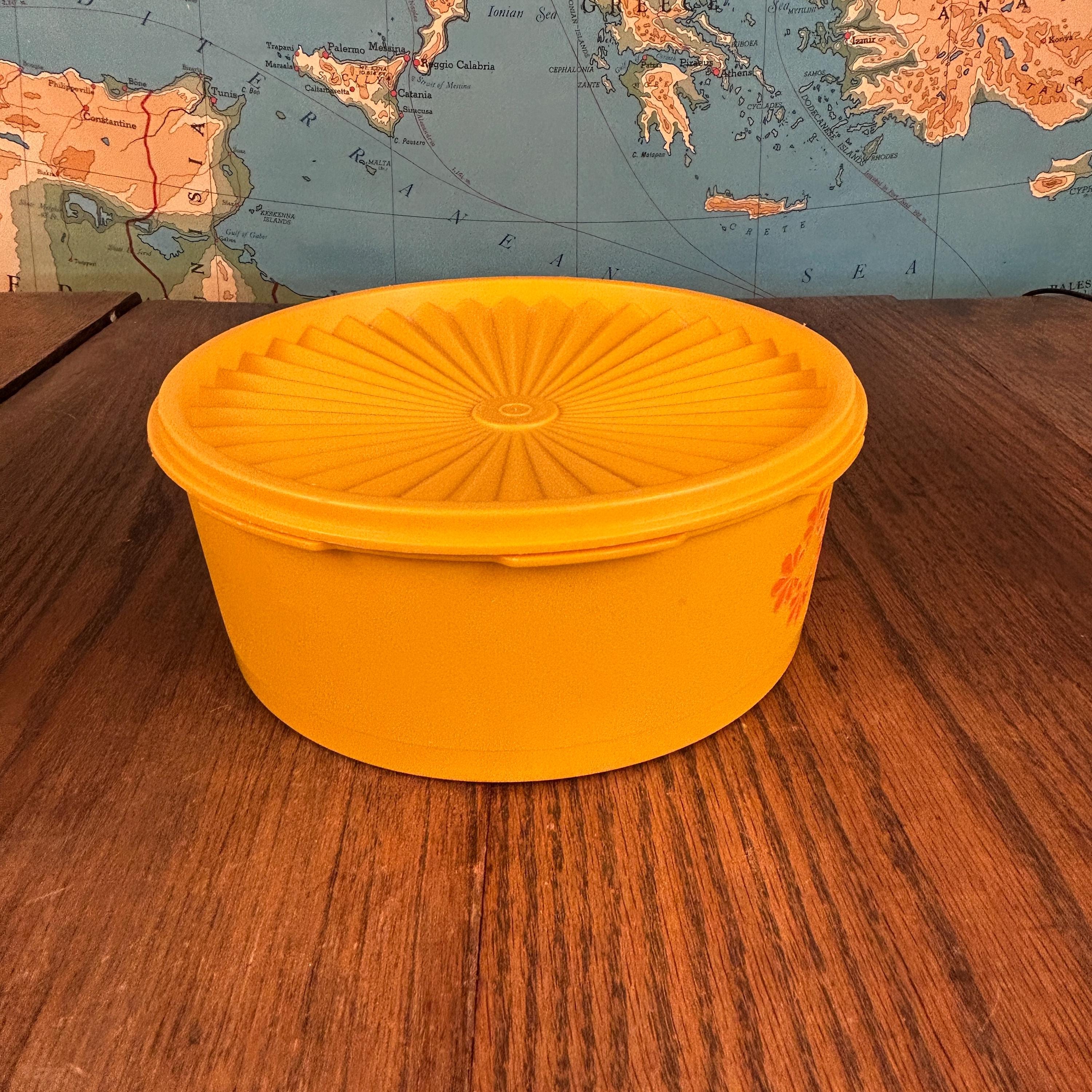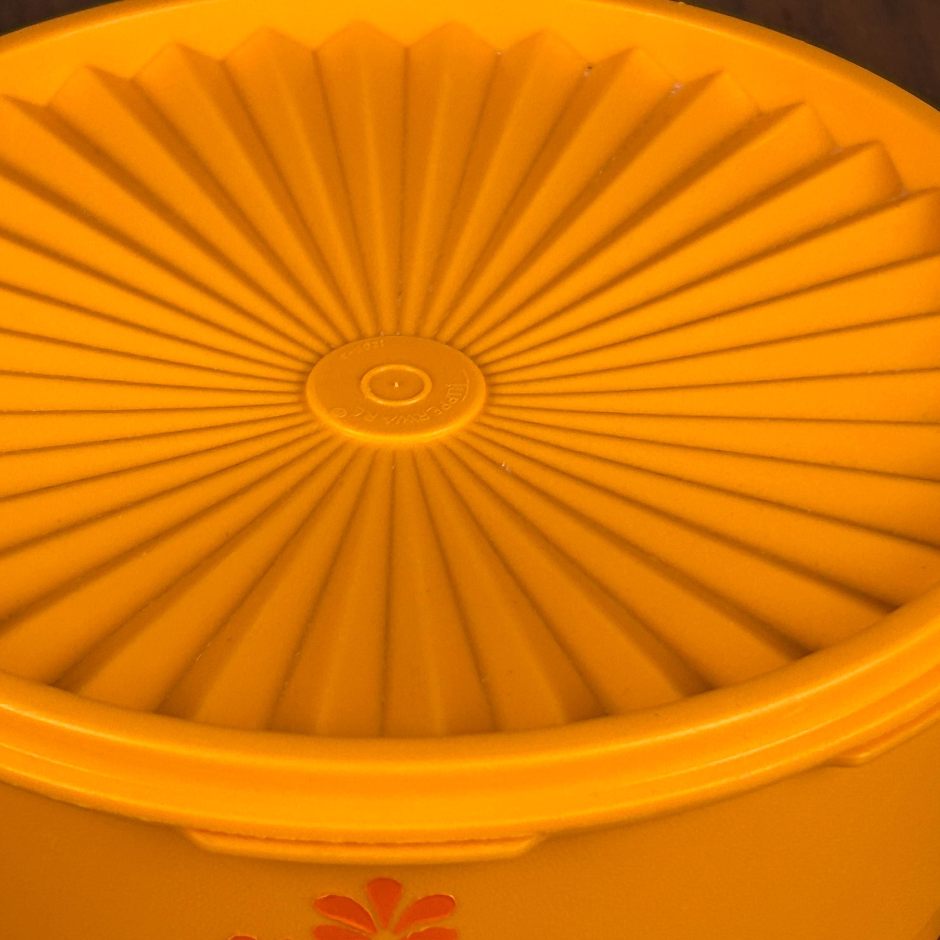 Dating to the 1960s–1970s, this collectible container showcases Tupperware’s timeless design with its vibrant orange color, embossed floral motif, and distinctive sunburst-style lid with a center button closure for a secure, airtight fit.