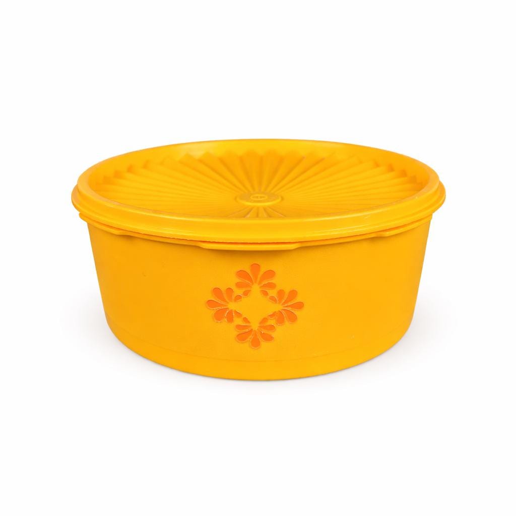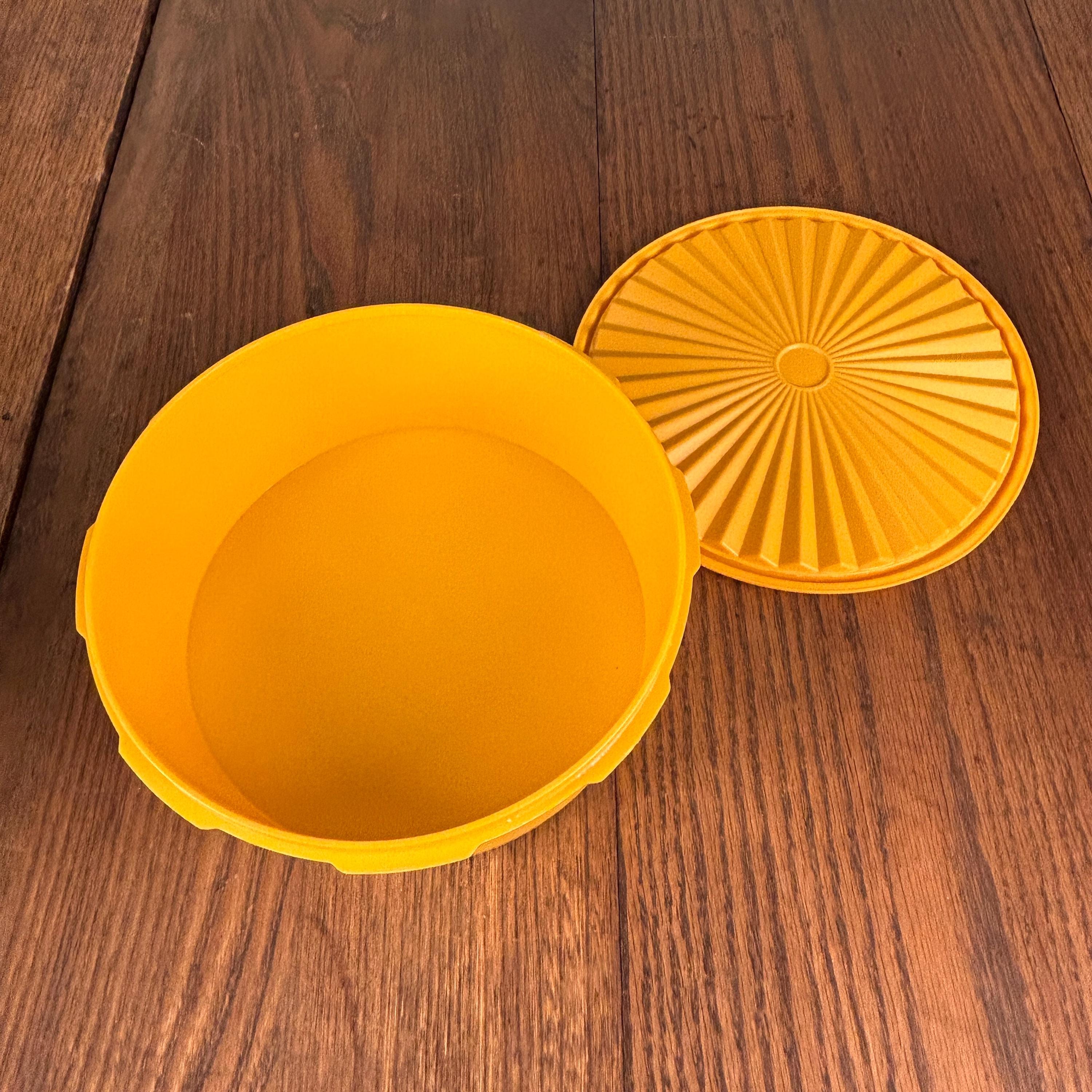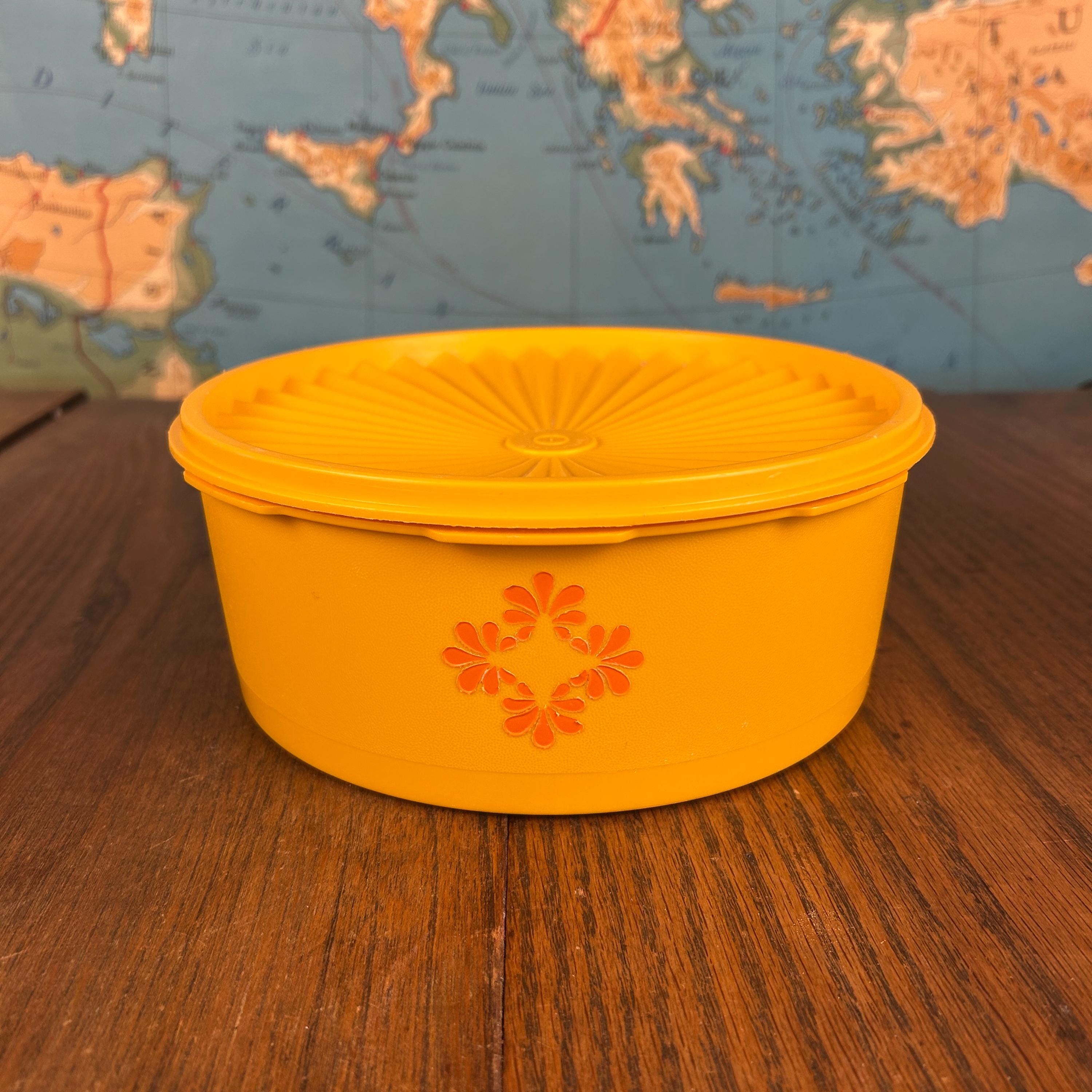 Dating to the 1960s–1970s, this collectible container showcases Tupperware’s timeless design with its vibrant orange color, embossed floral motif, and distinctive sunburst-style lid with a center button closure for a secure, airtight fit.