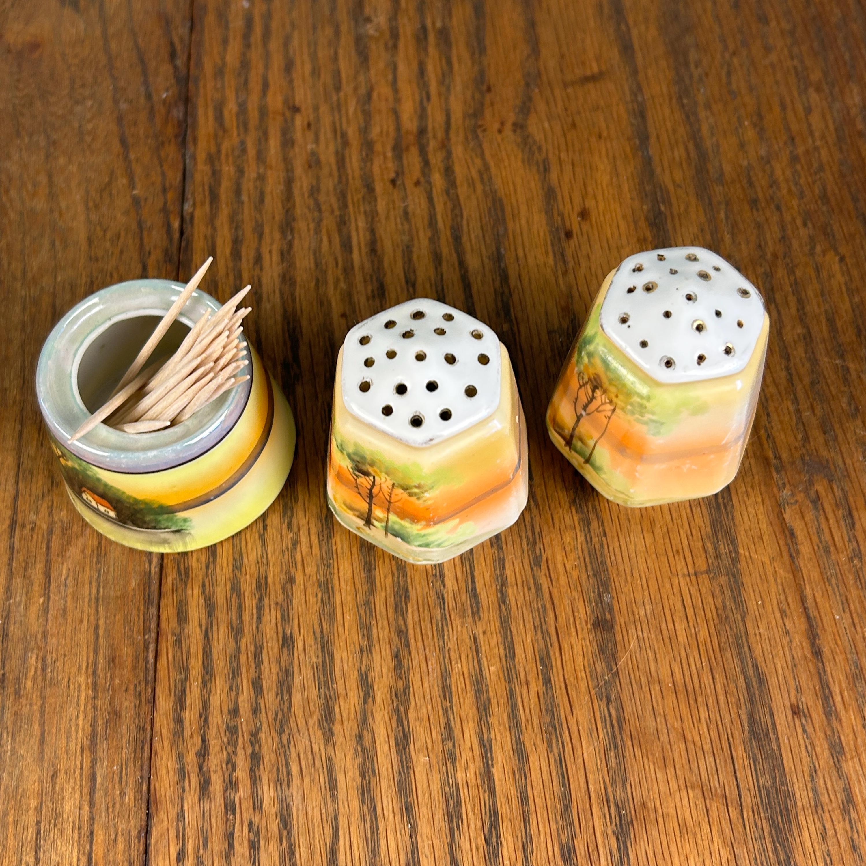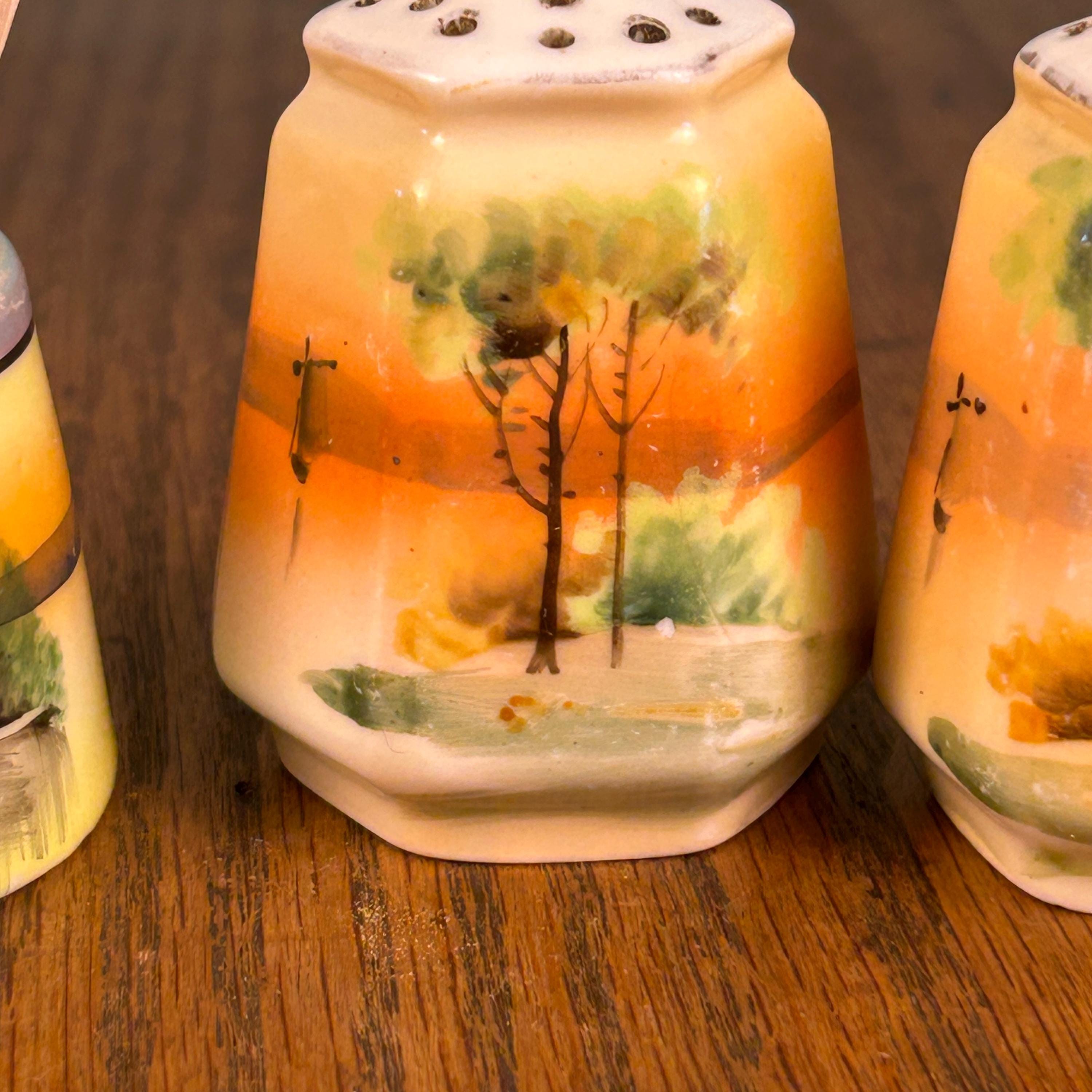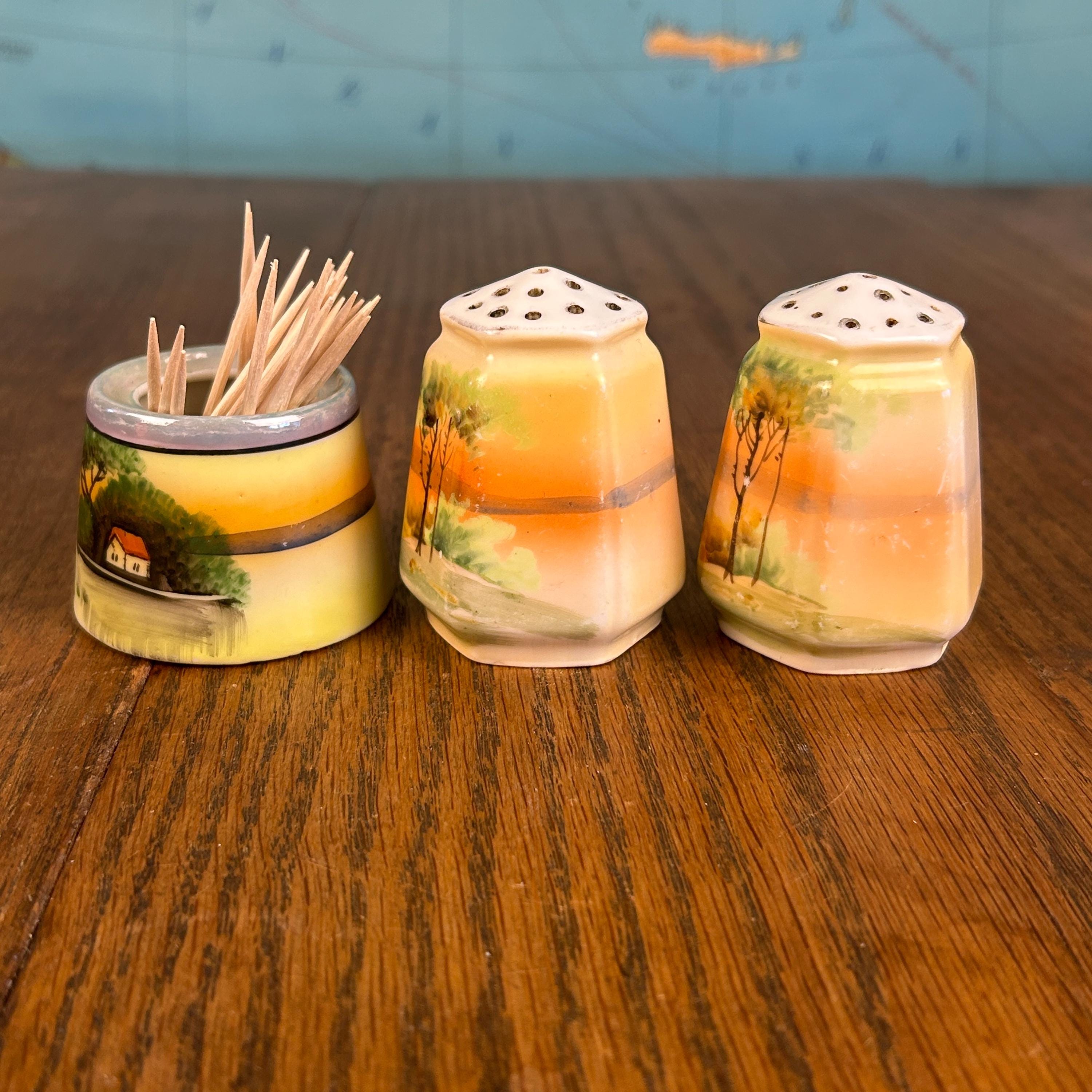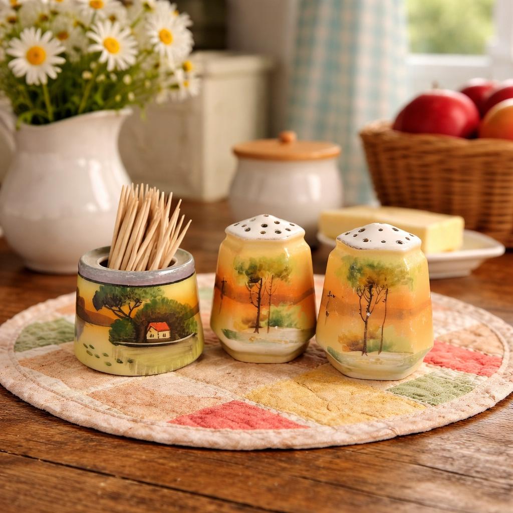 This beautiful vintage ceramic dining set includes a matching salt and pepper shaker pair along with an open toothpick holder, all featuring a charming hand-painted landscape scene.