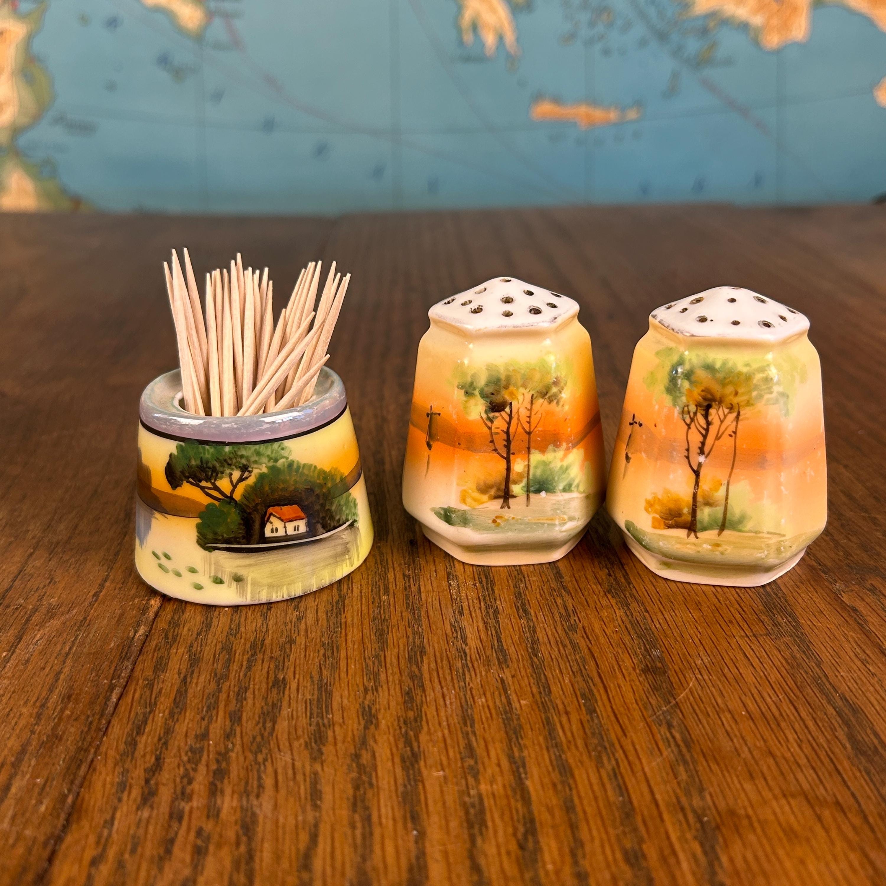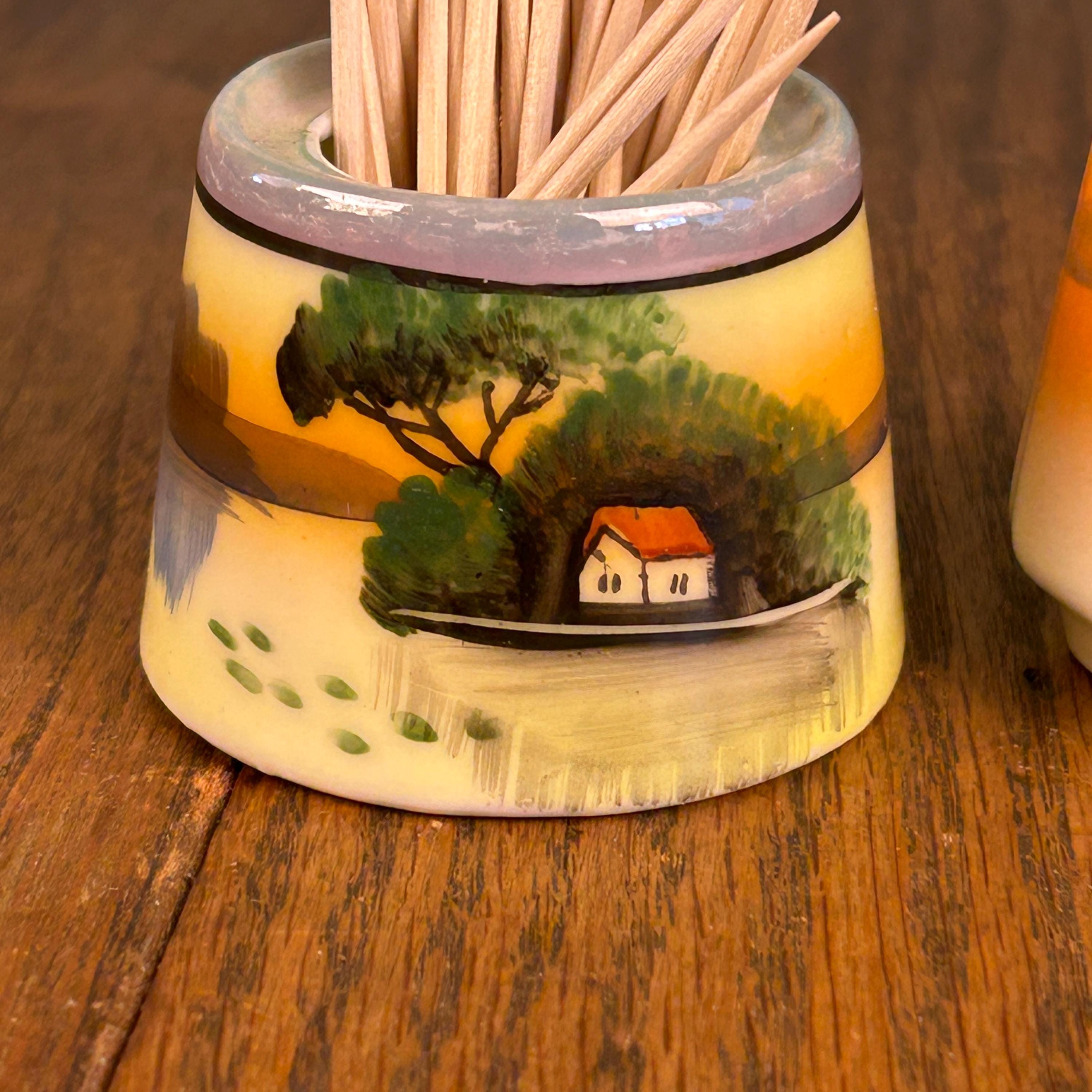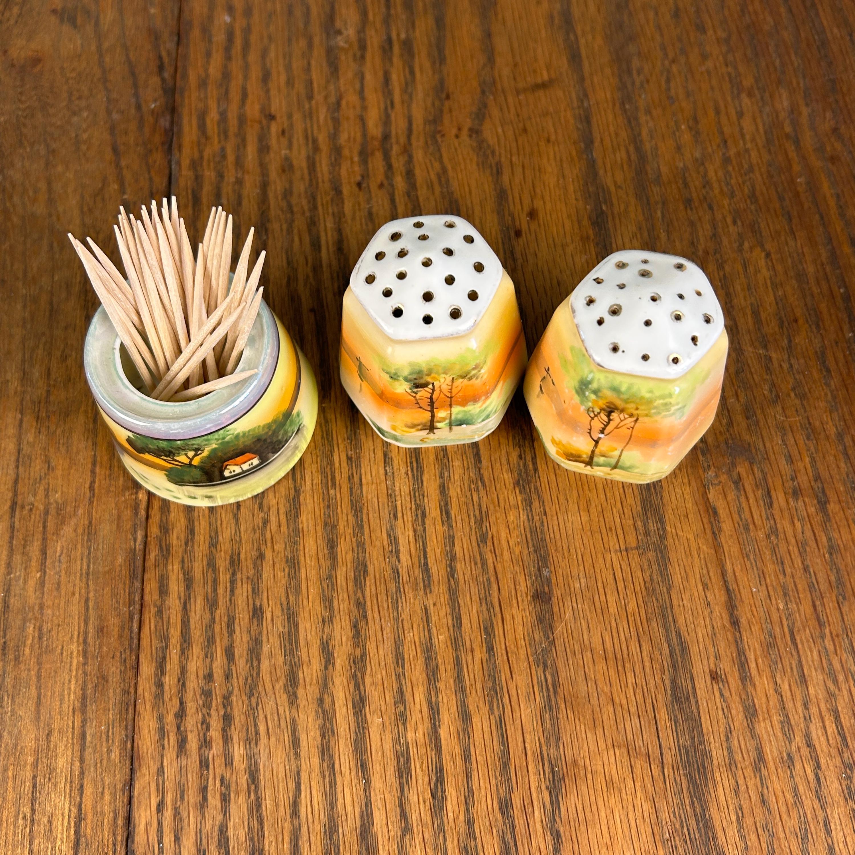 This beautiful vintage ceramic dining set includes a matching salt and pepper shaker pair along with an open toothpick holder, all featuring a charming hand-painted landscape scene.
