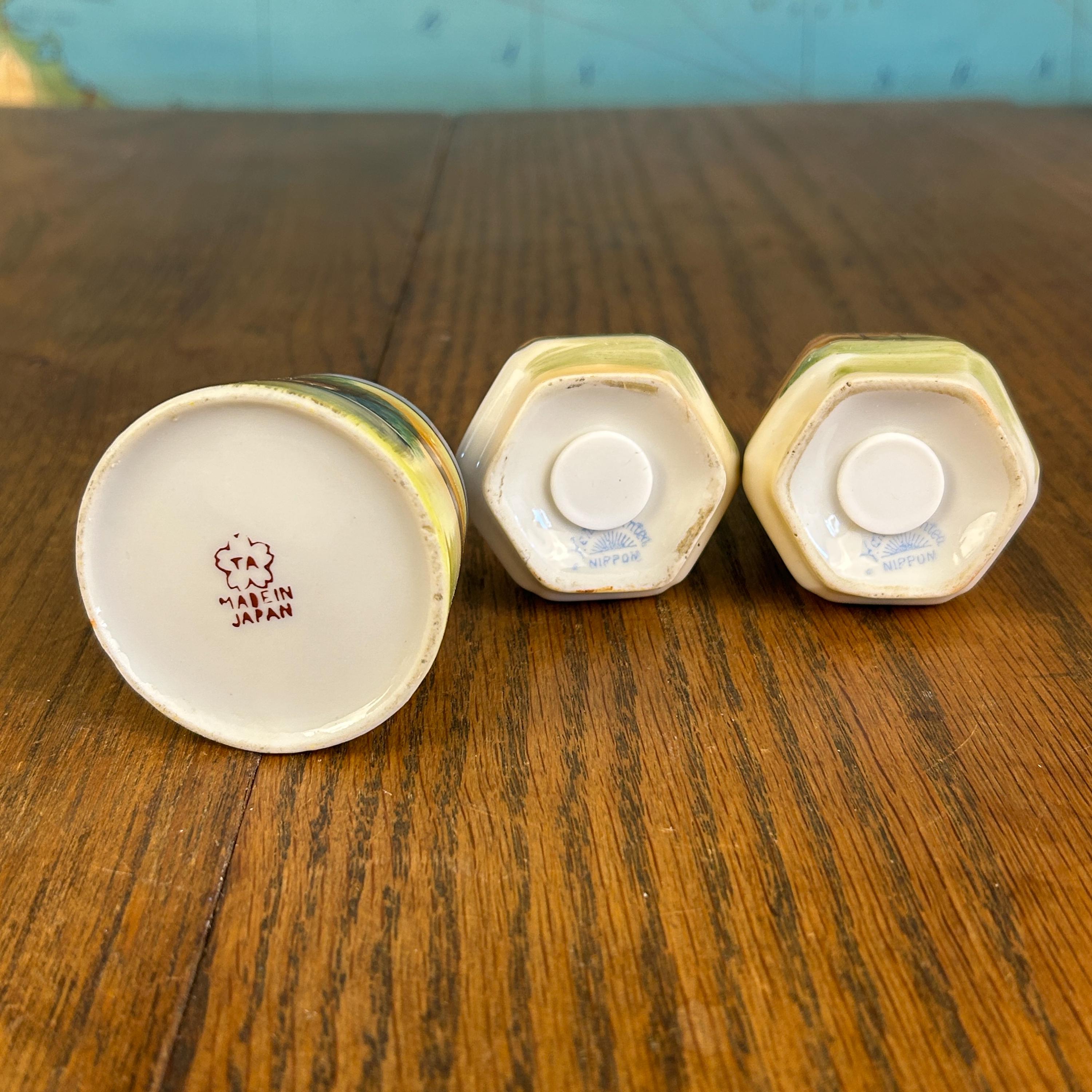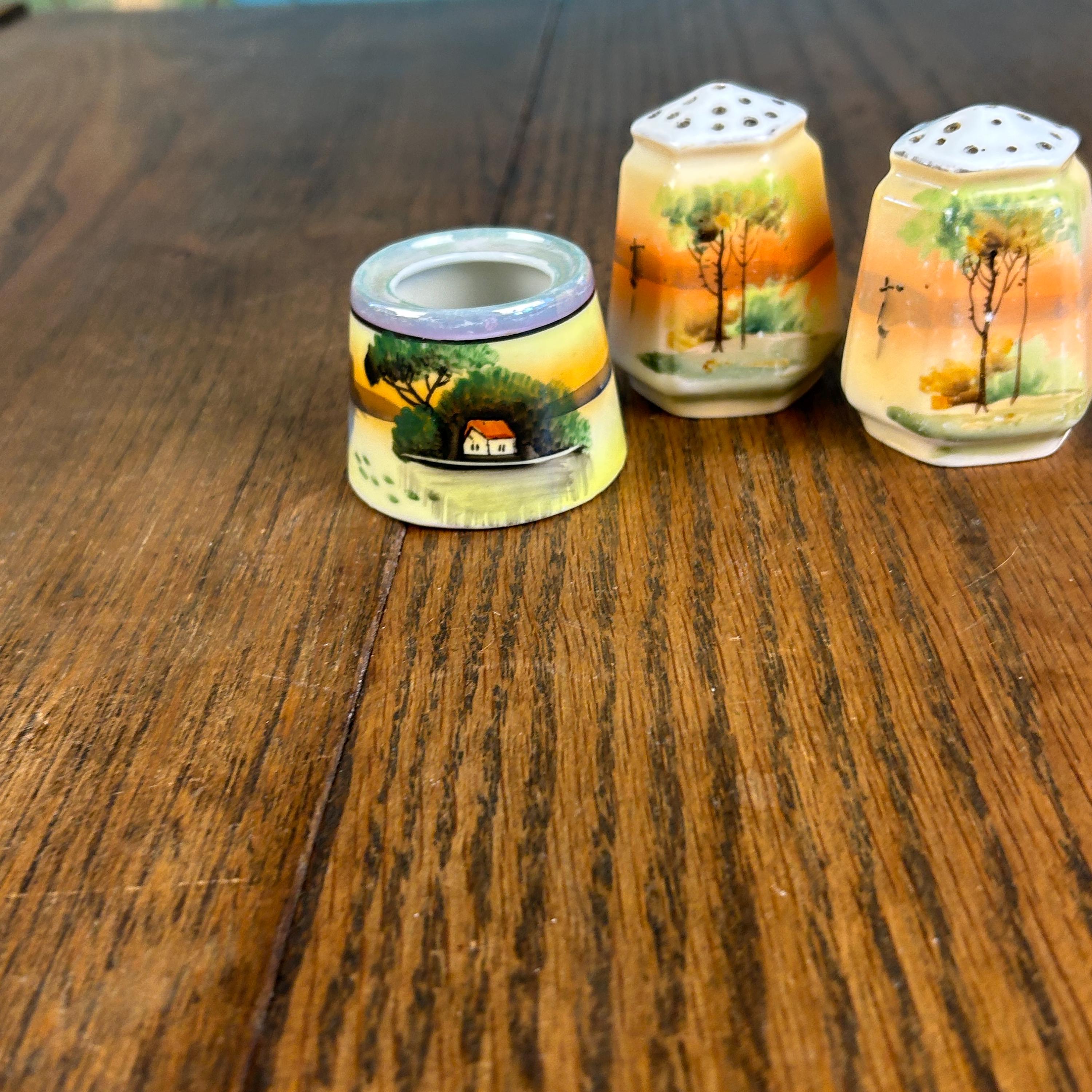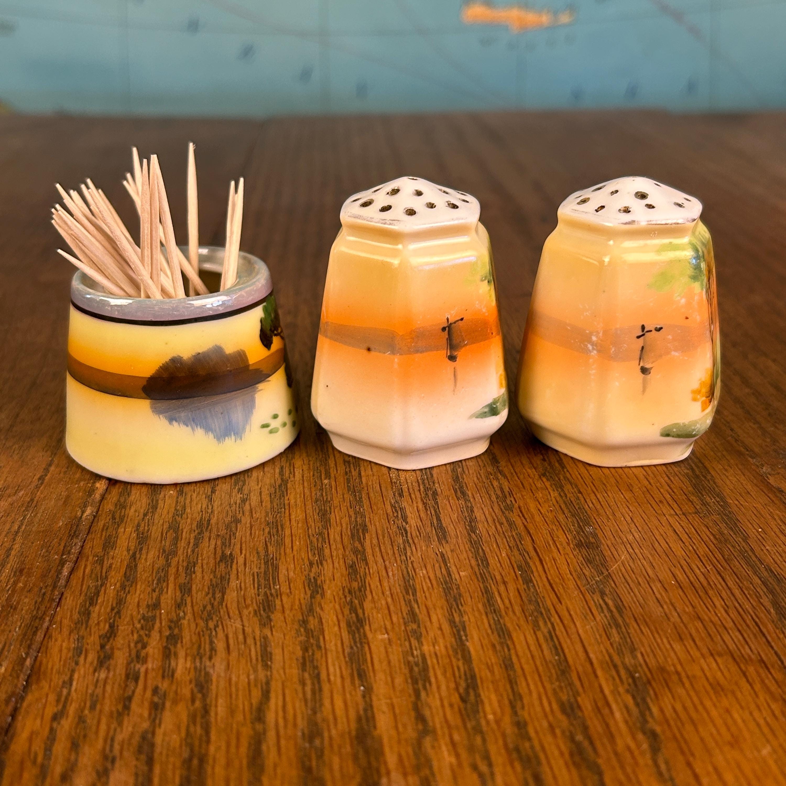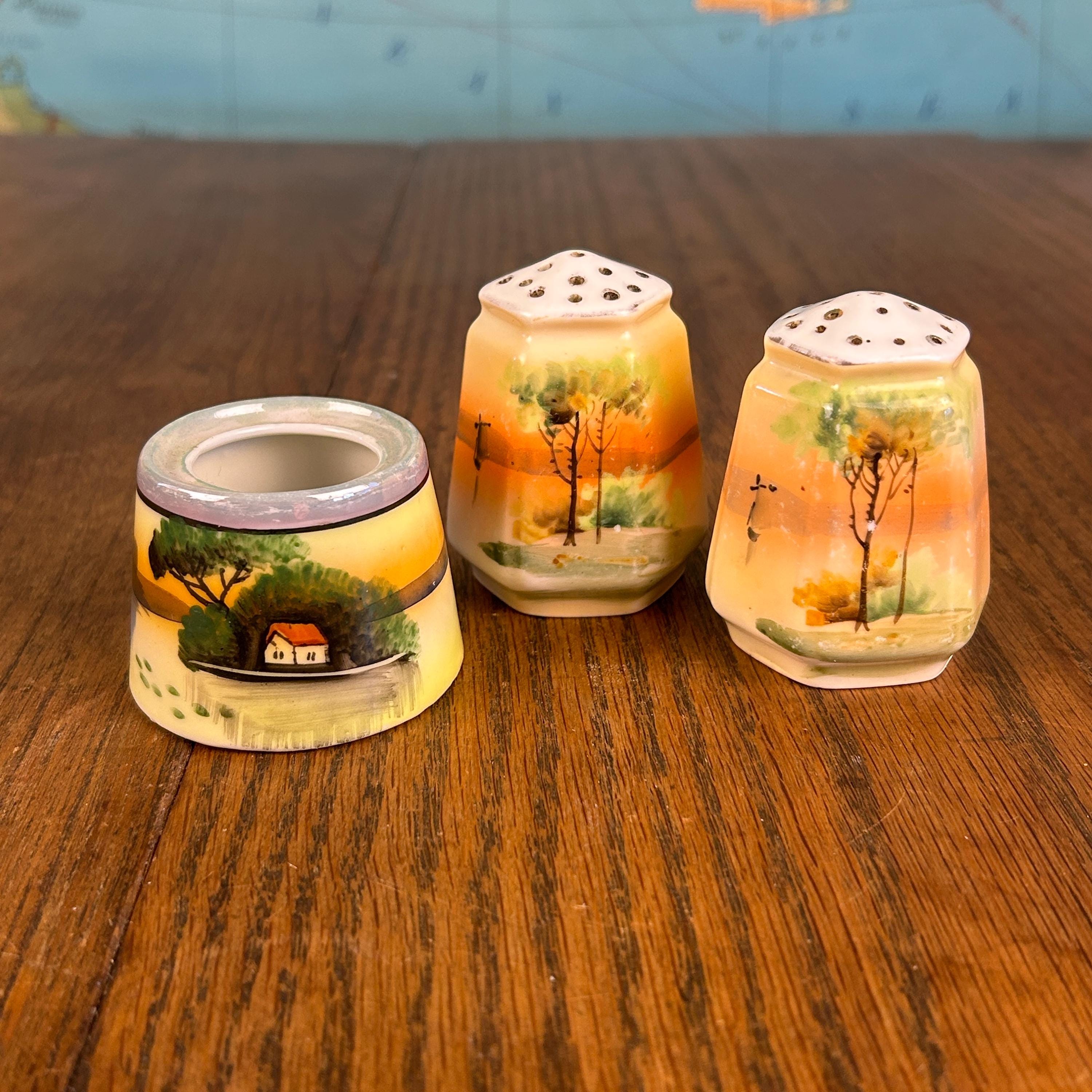 This beautiful vintage ceramic dining set includes a matching salt and pepper shaker pair along with an open toothpick holder, all featuring a charming hand-painted landscape scene.