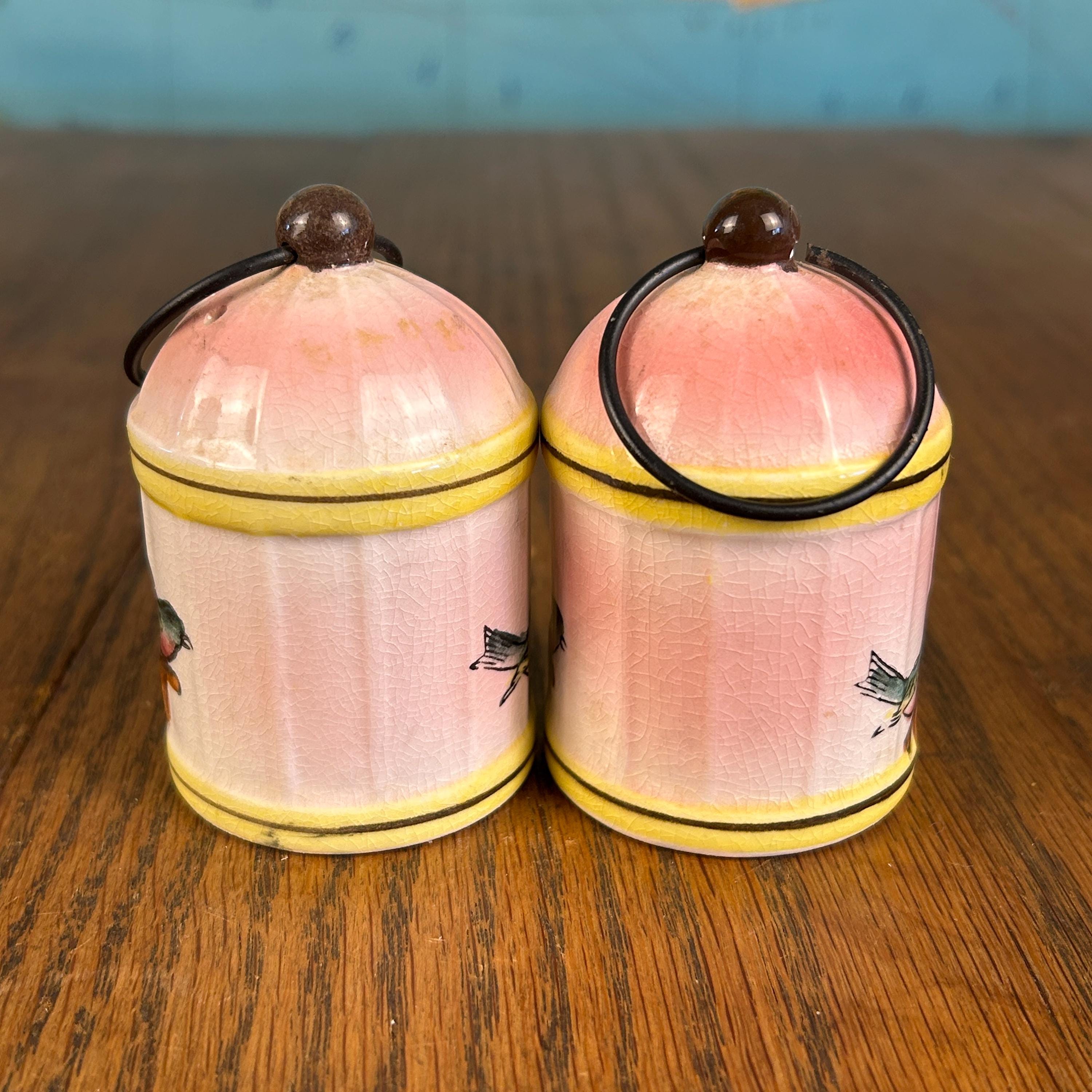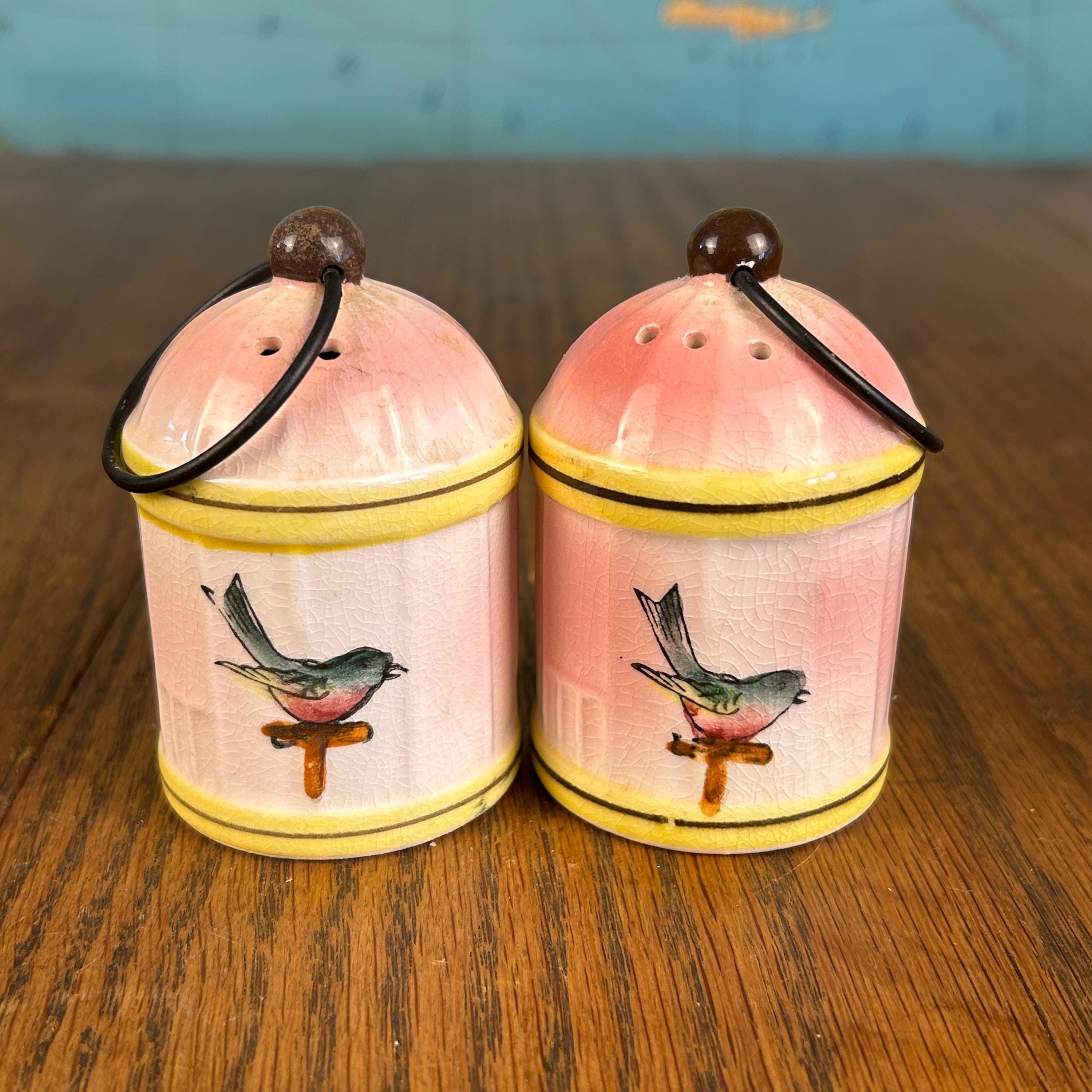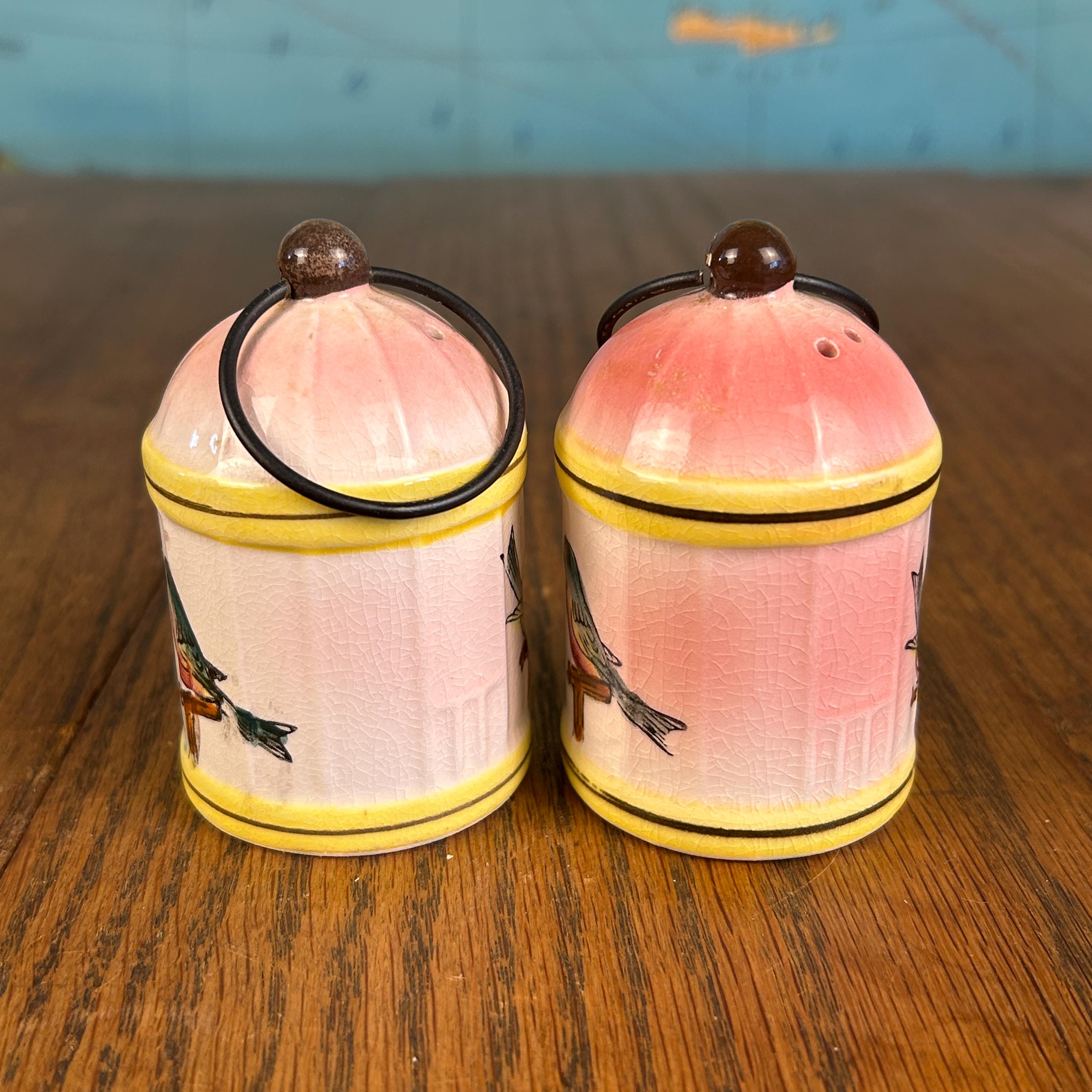 This adorable vintage Napco Giftcraft salt and pepper shaker set features a whimsical birdcage design with soft pink and yellow tones and charming painted birds perched on delicate branches.