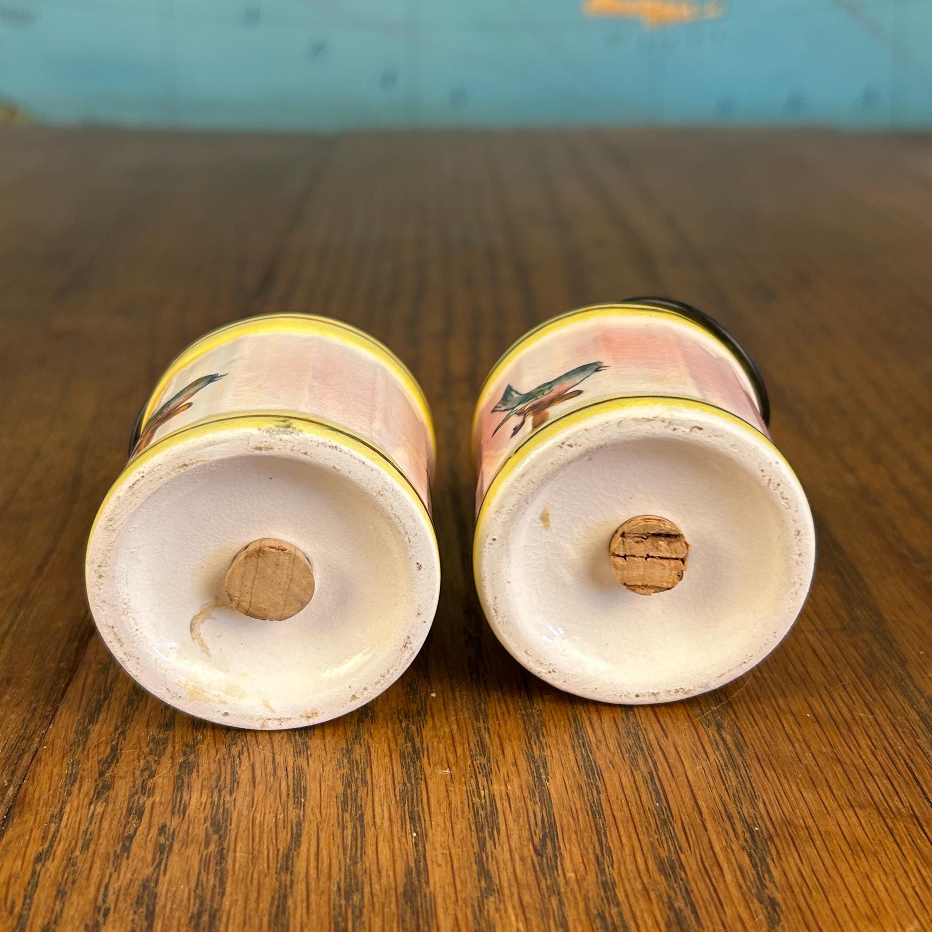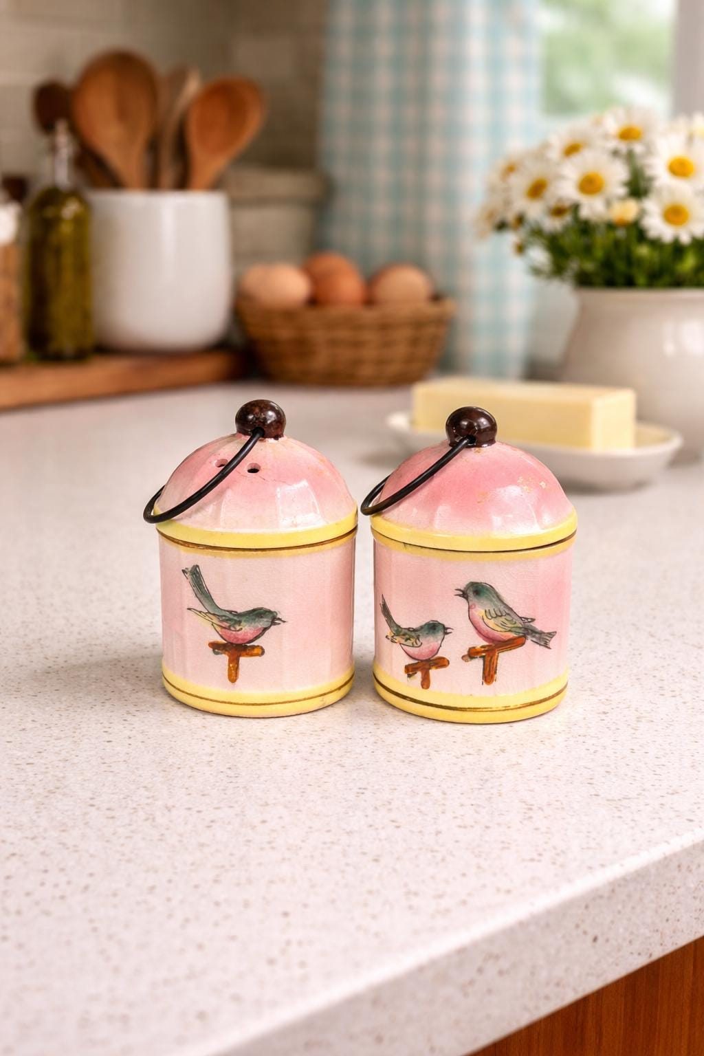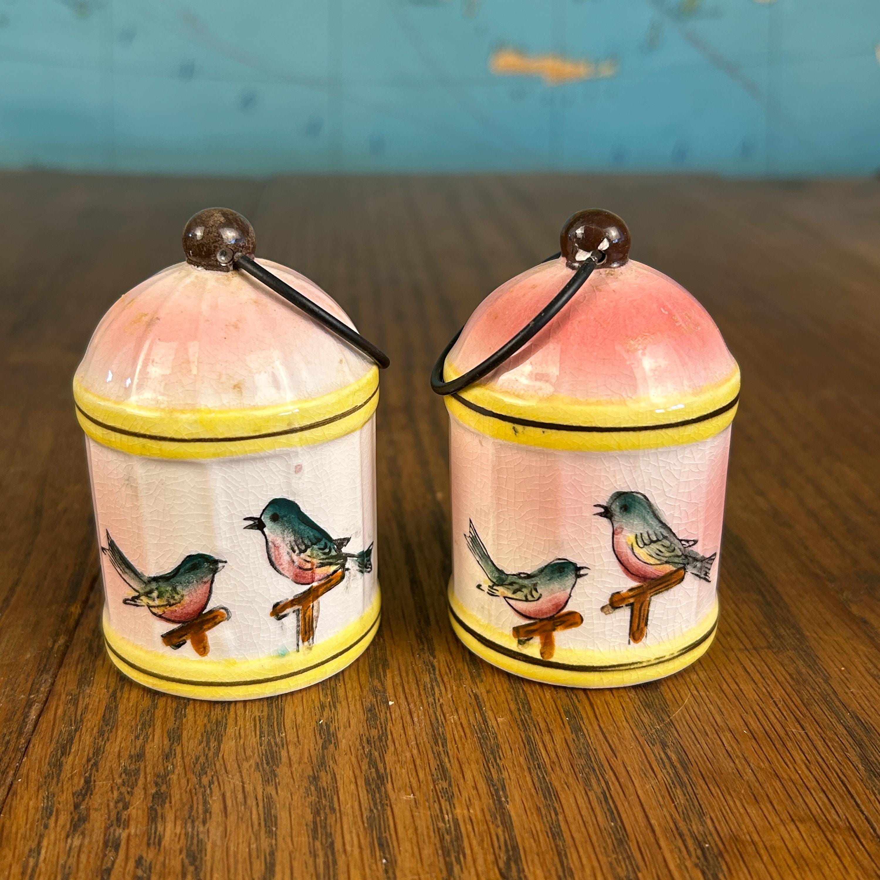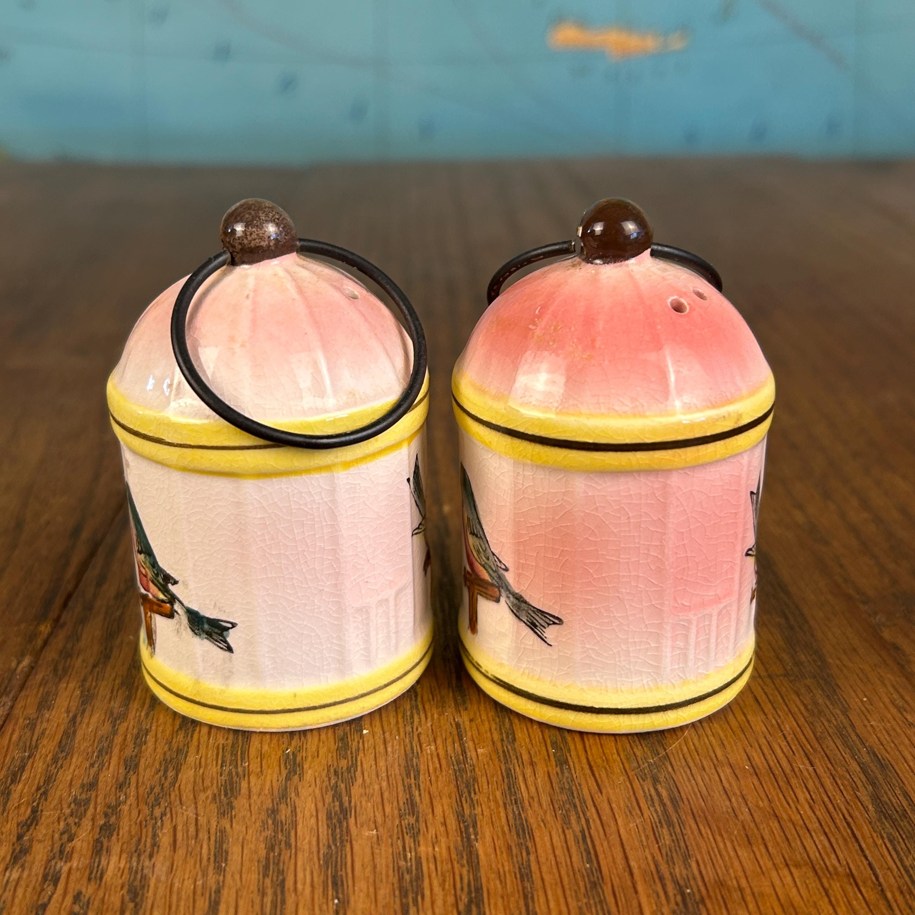 This adorable vintage Napco Giftcraft salt and pepper shaker set features a whimsical birdcage design with soft pink and yellow tones and charming painted birds perched on delicate branches.