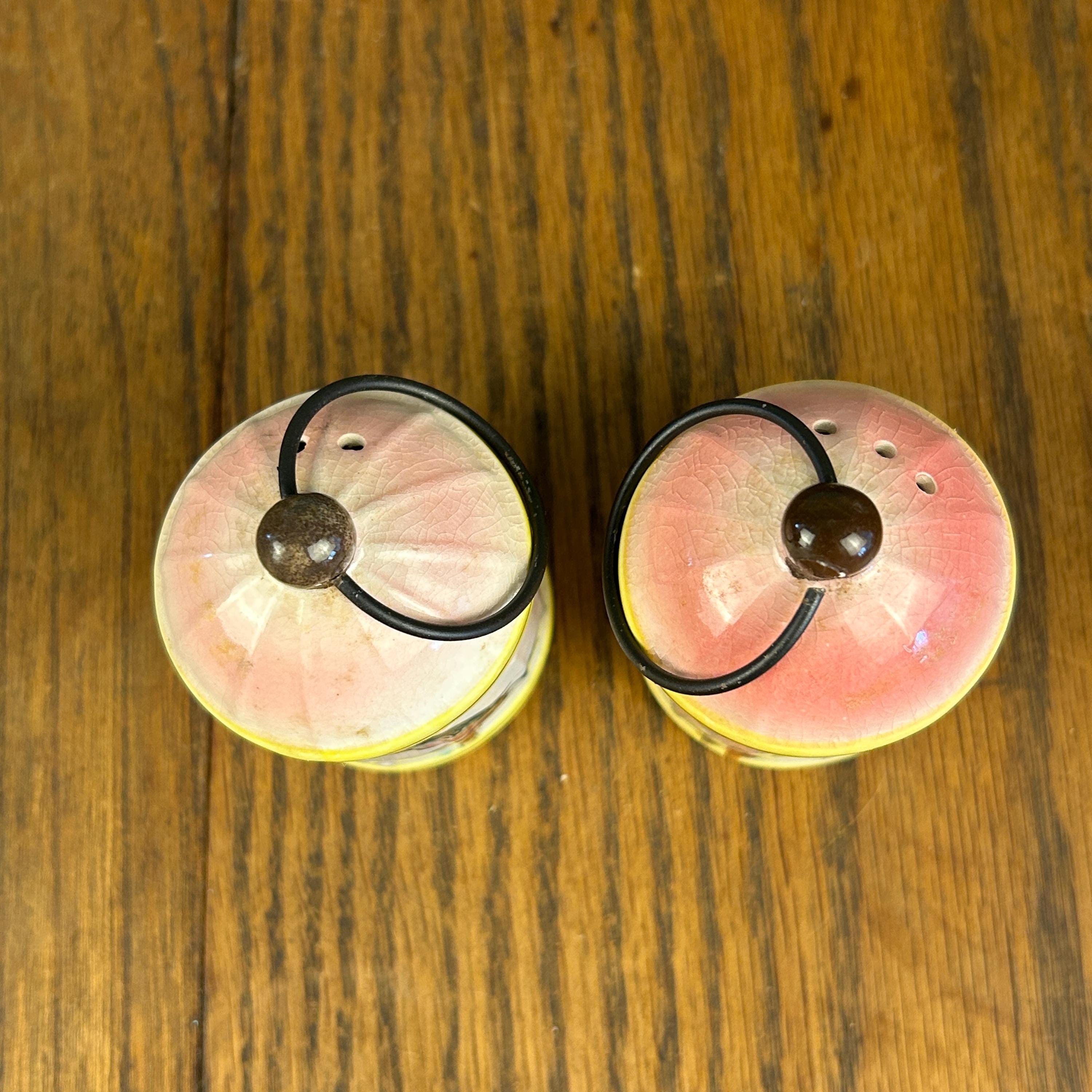 Made in Japan by Napco (National Potteries Company) during the 1950s–1960s, this set captures the playful, kitschy style that made mid-century kitchen decor so collectible. The unique hanging handle design adds both charm and functionality, making it a standout display piece.