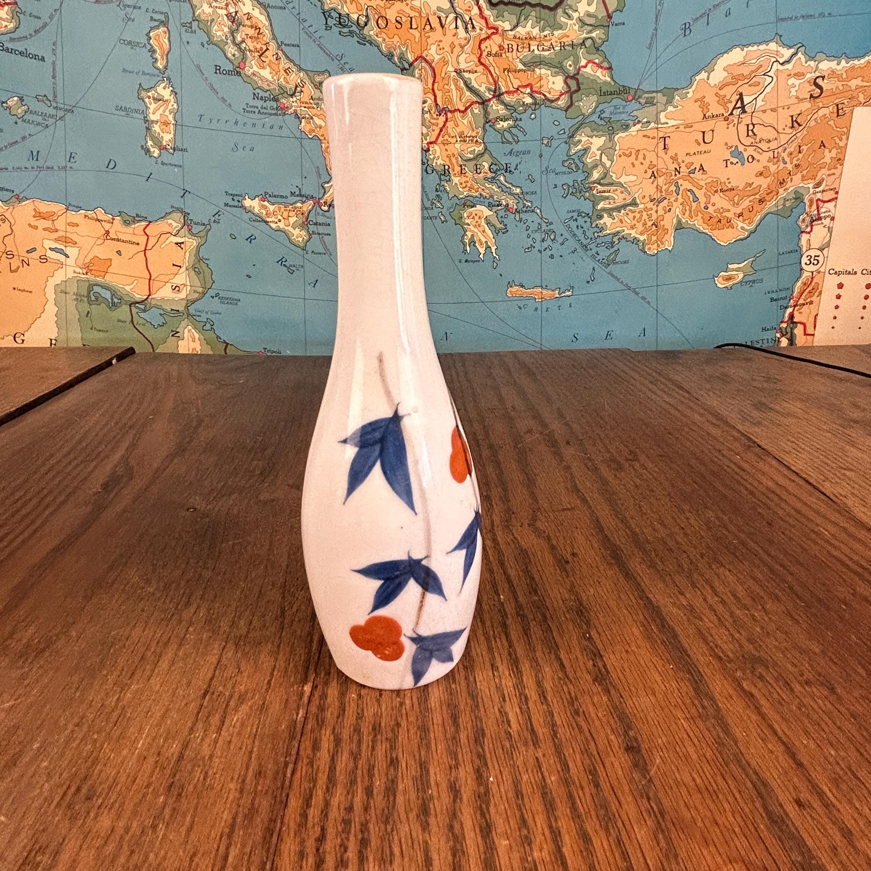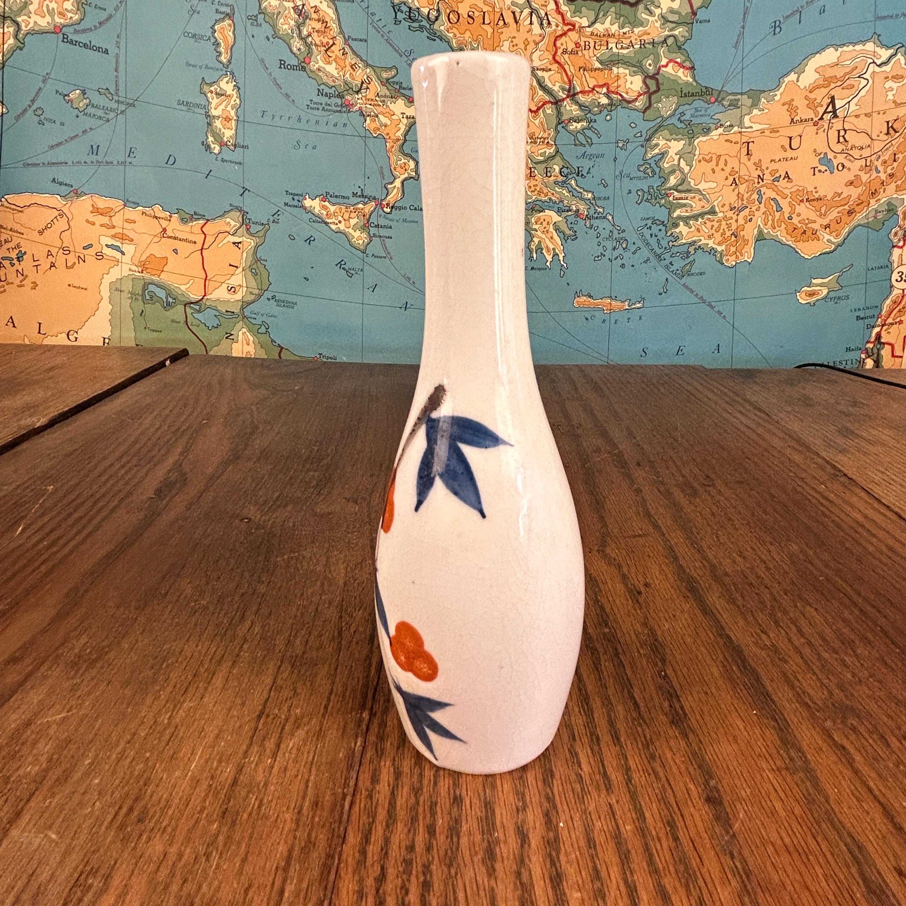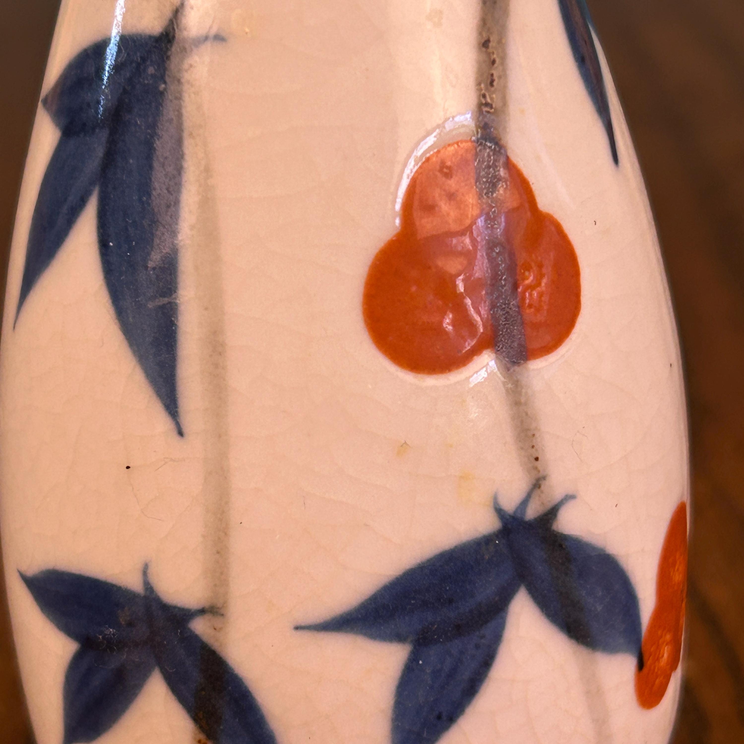 This elegant vintage Japanese porcelain vase showcases the timeless beauty of Arita ware in the Kakiemon style, known for its refined blue and white palette accented with soft orange floral details.