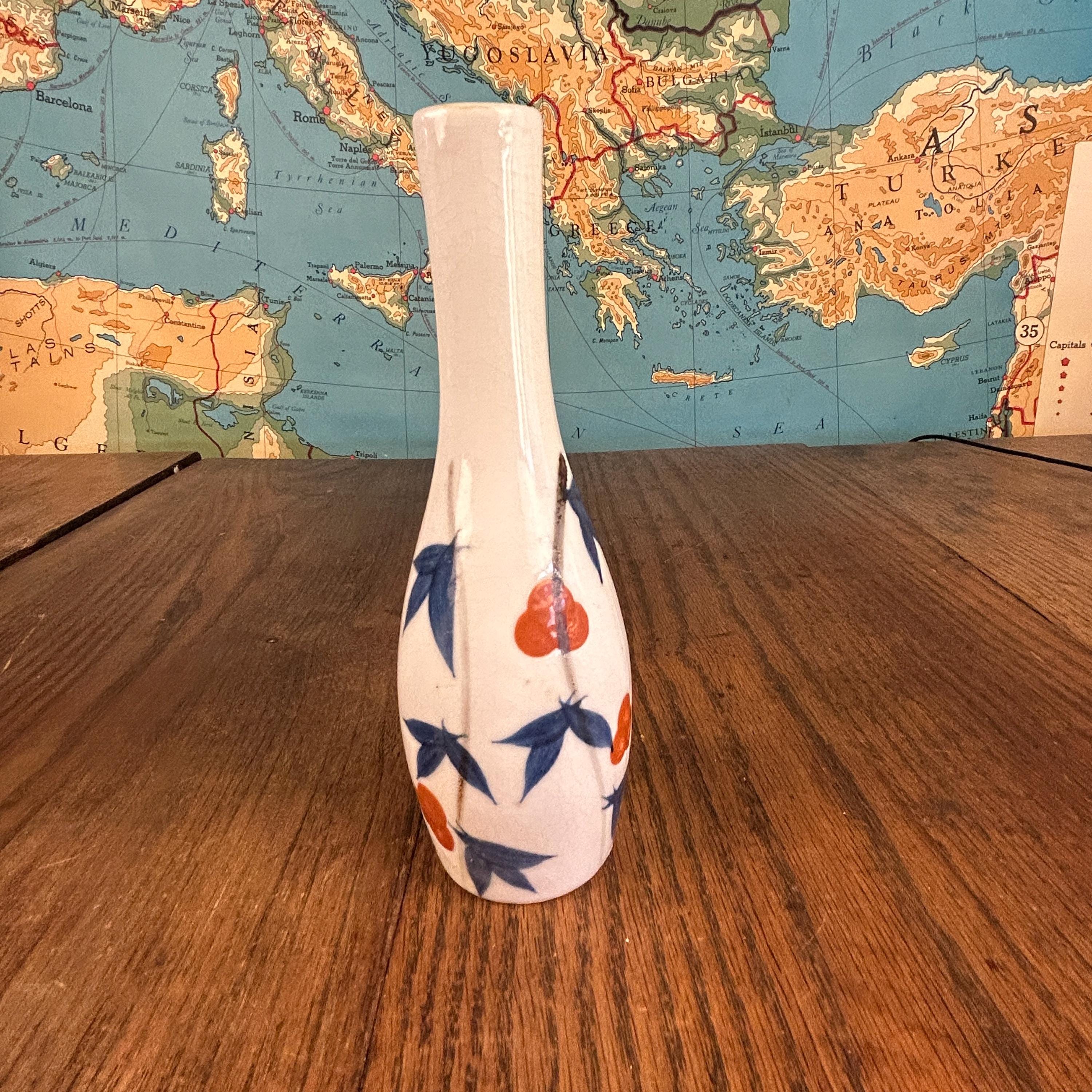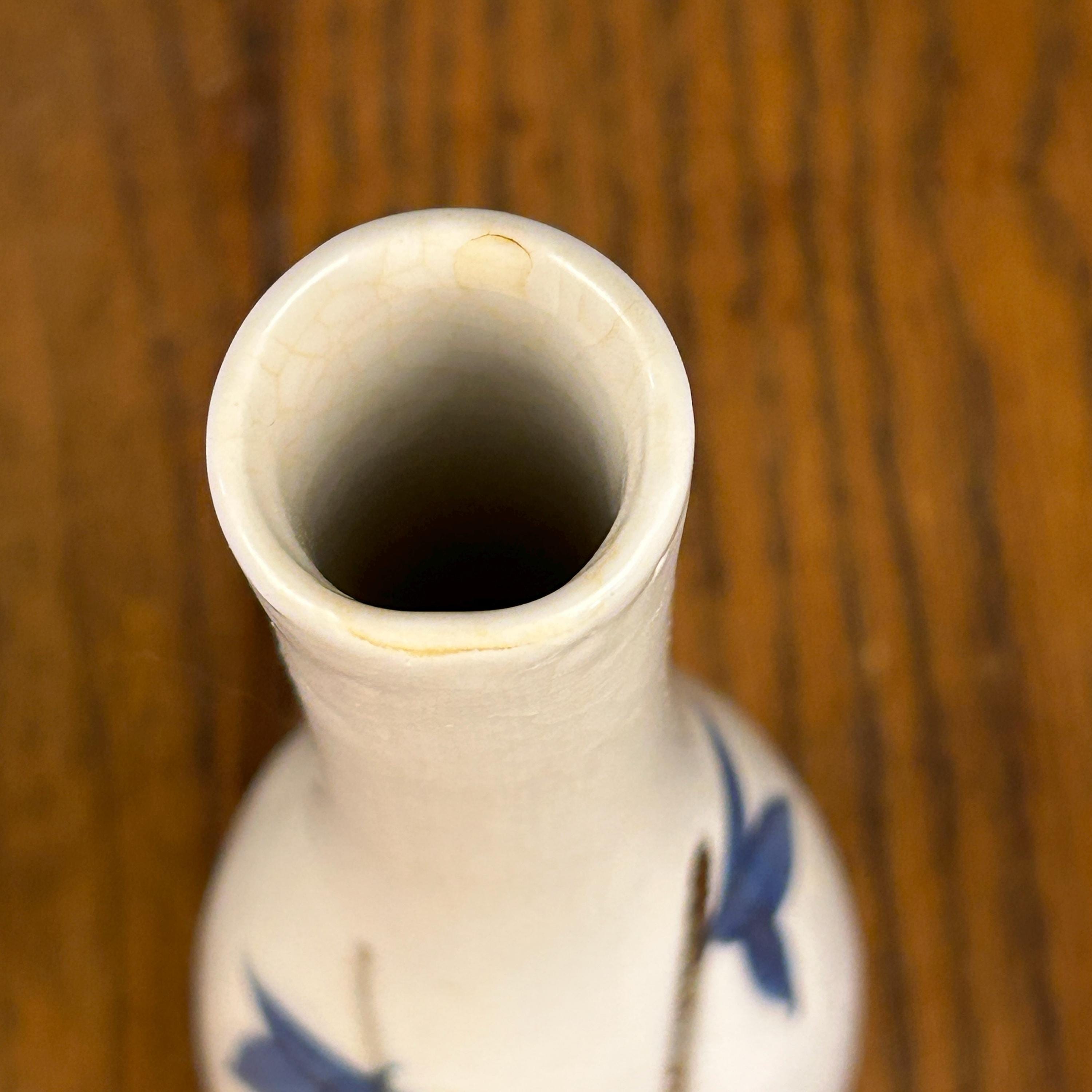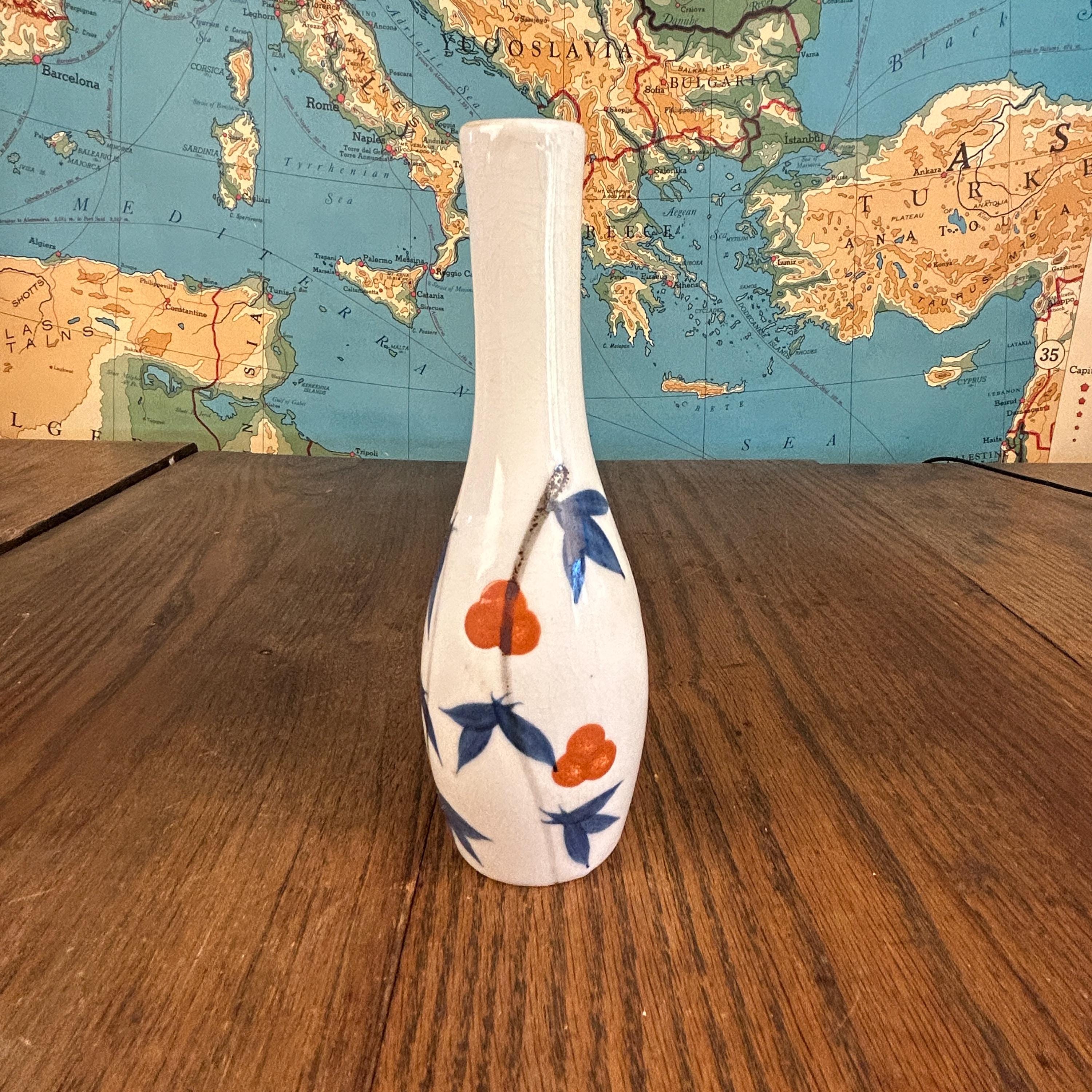 This elegant vintage Japanese porcelain vase showcases the timeless beauty of Arita ware in the Kakiemon style, known for its refined blue and white palette accented with soft orange floral details.