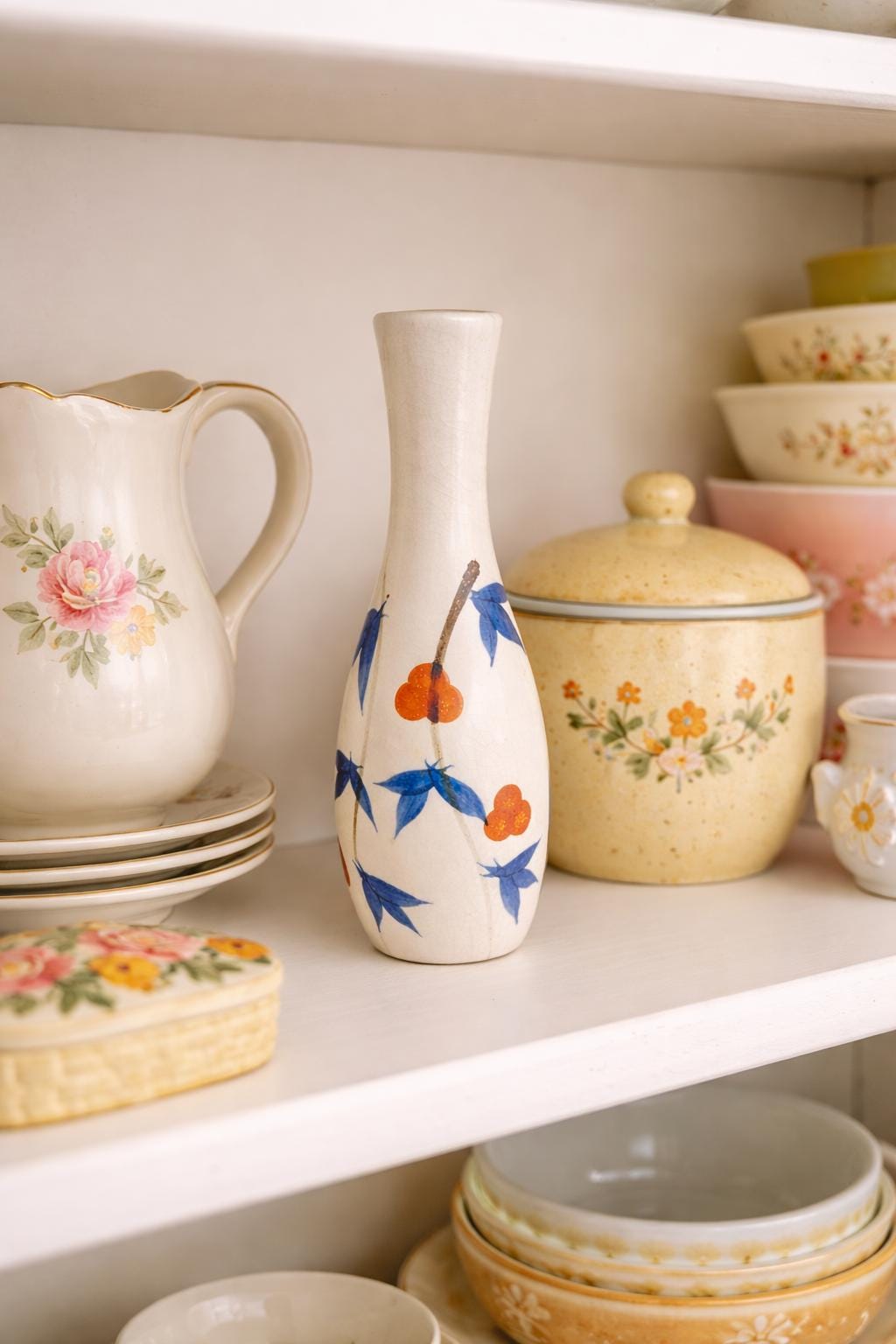 The hand-painted design features delicate blossoms and foliage arranged with balance and simplicity, creating a piece that feels both classic and serene. Its graceful form and traditional craftsmanship make it a perfect addition to any vintage, traditional, or minimalist decor setting.