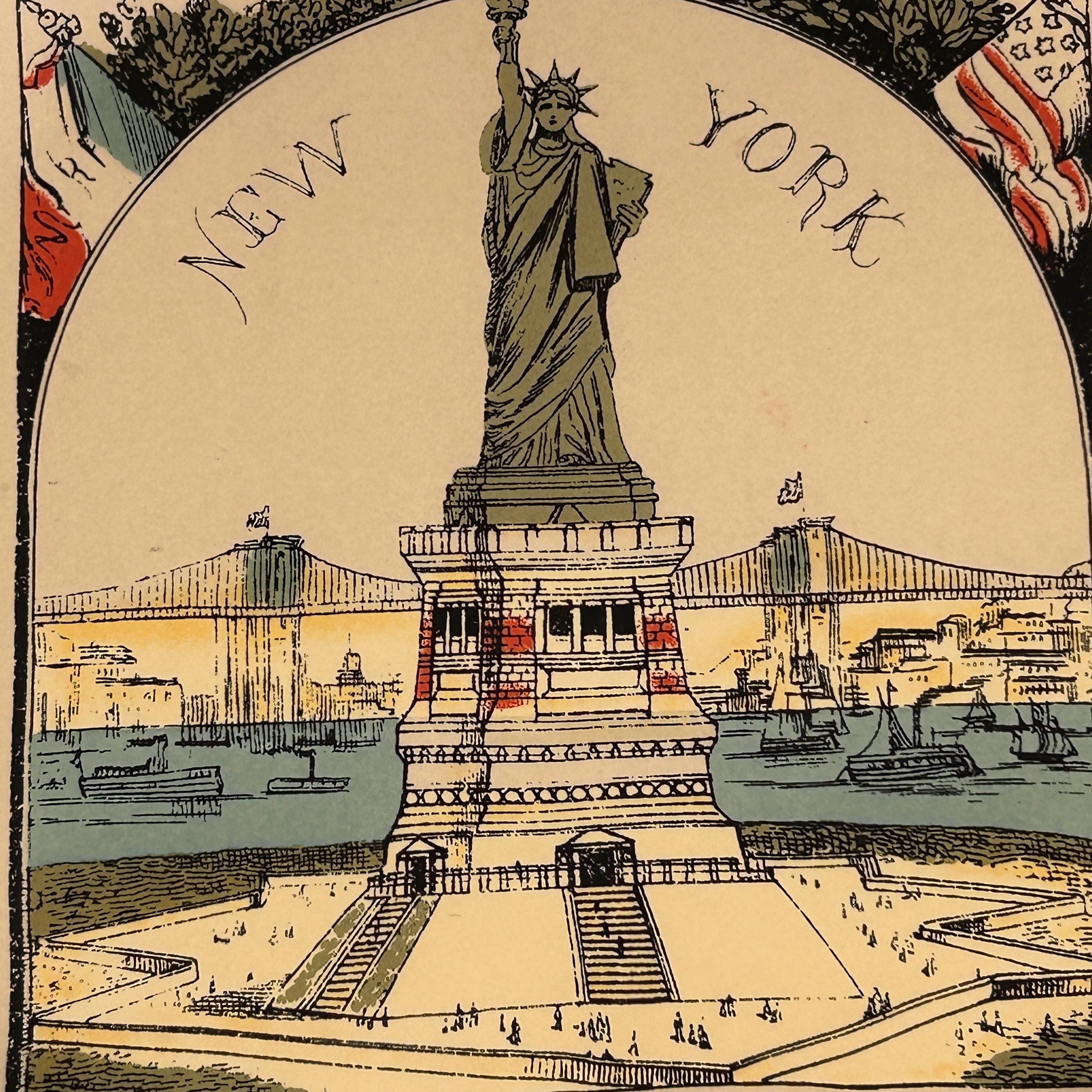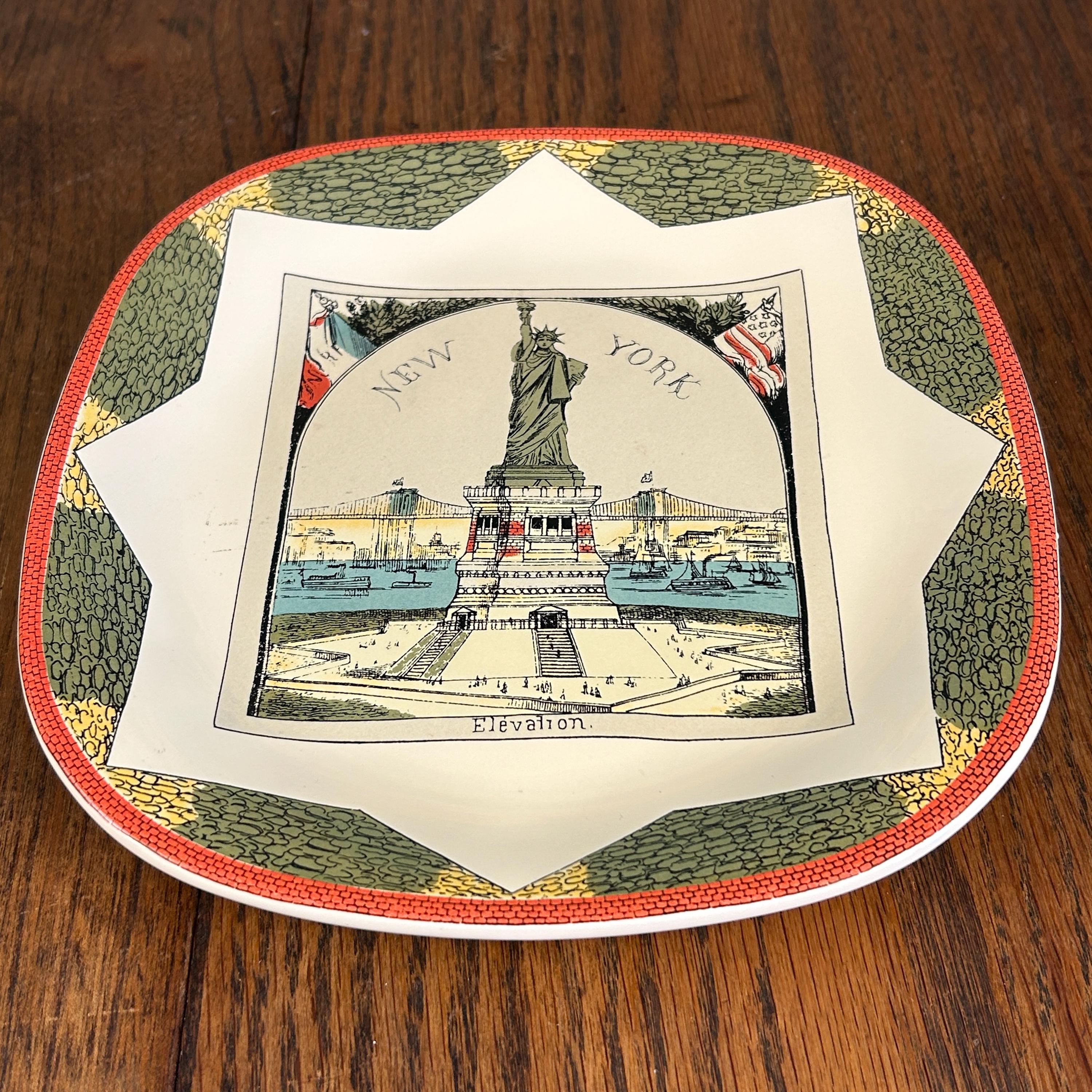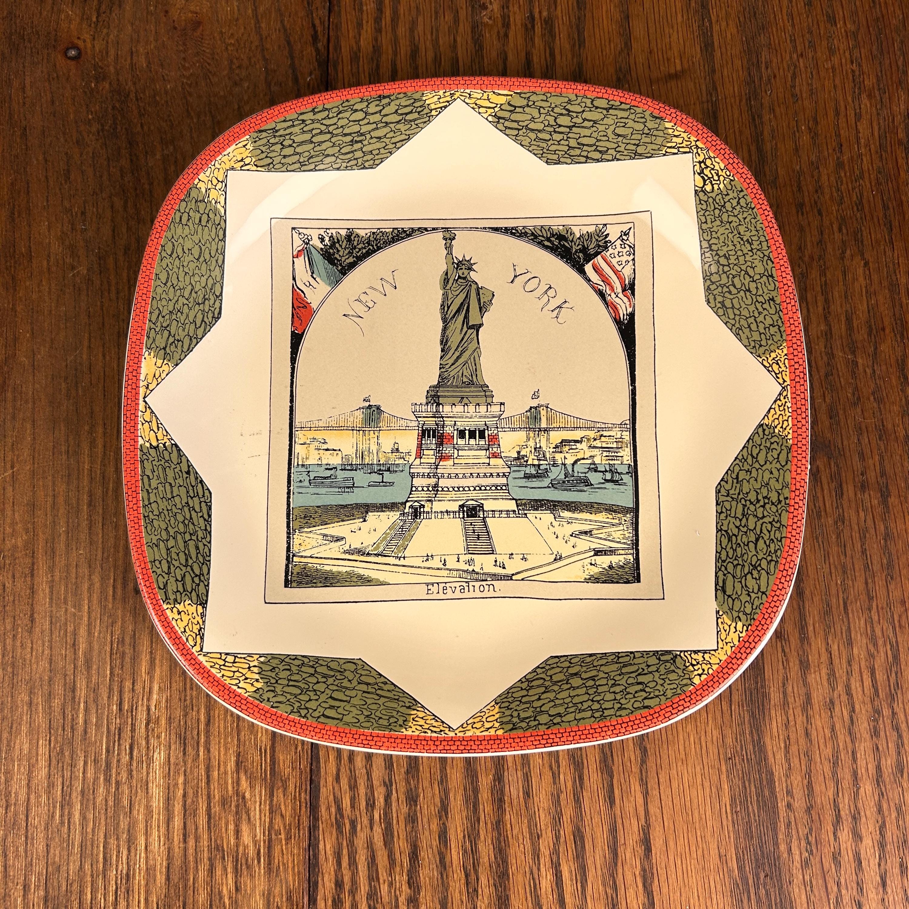 This vintage Metropolitan Museum of Art (MMA) collector’s plate features a striking illustration of the Statue of Liberty standing proudly in New York Harbor.