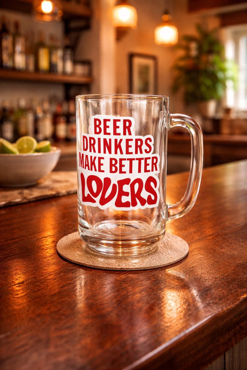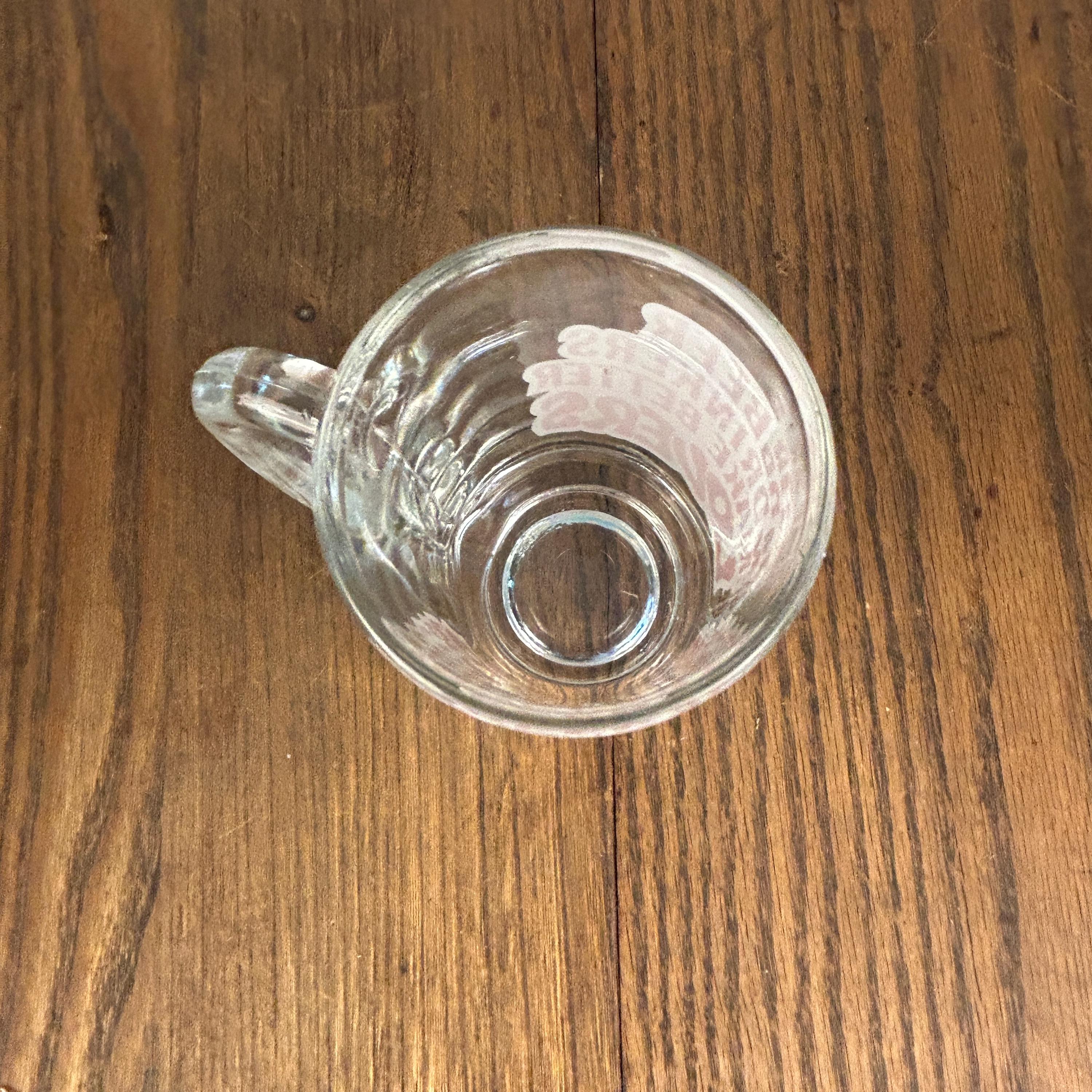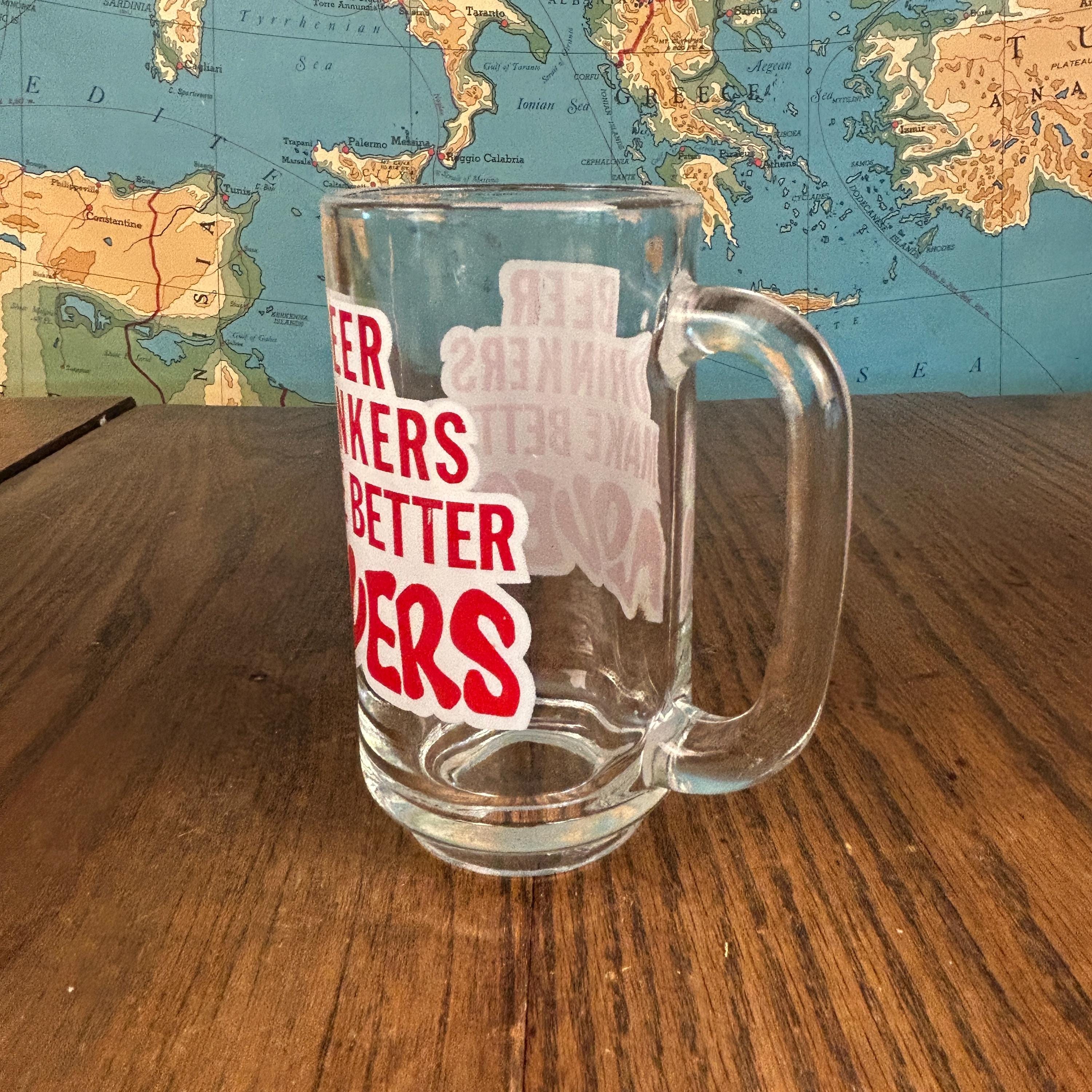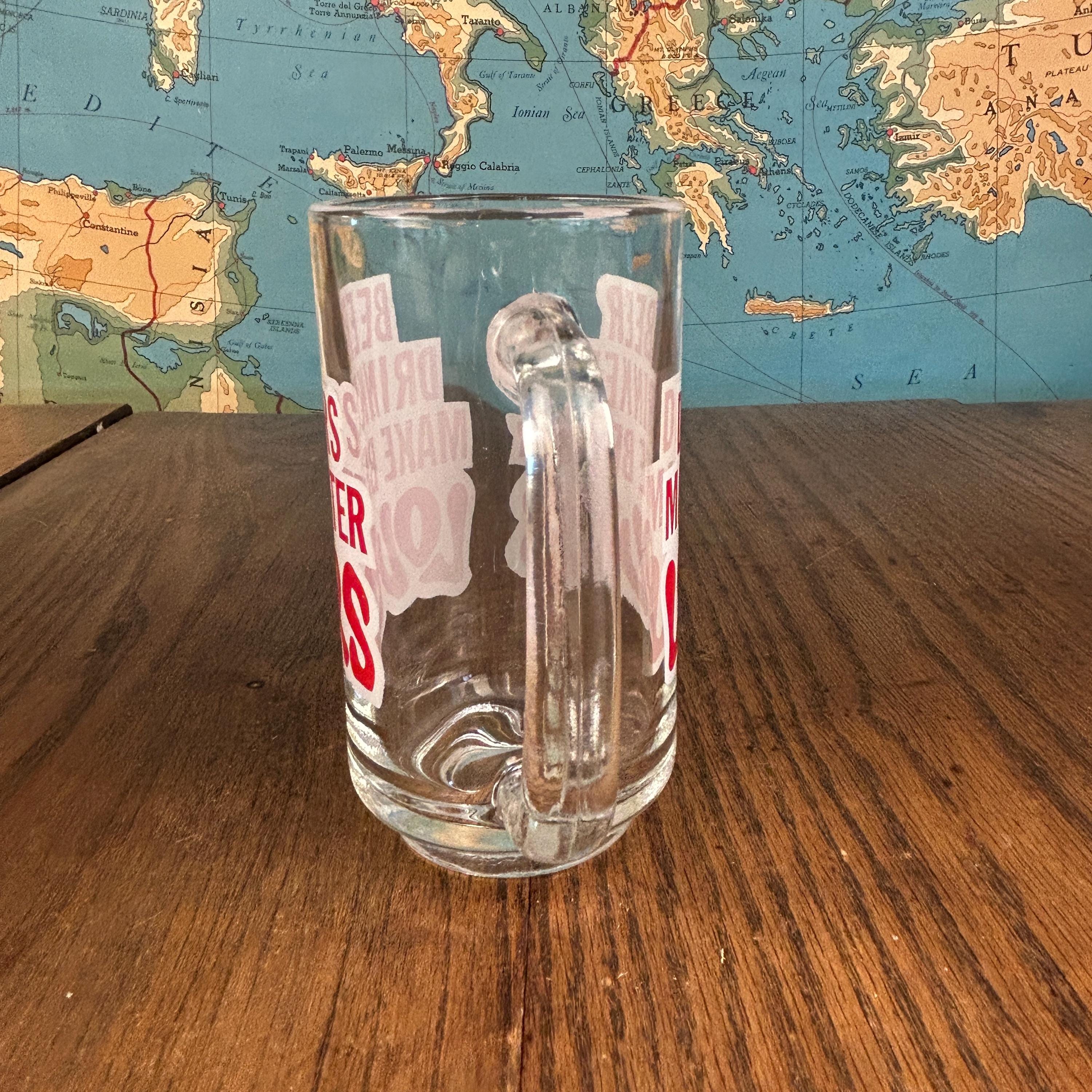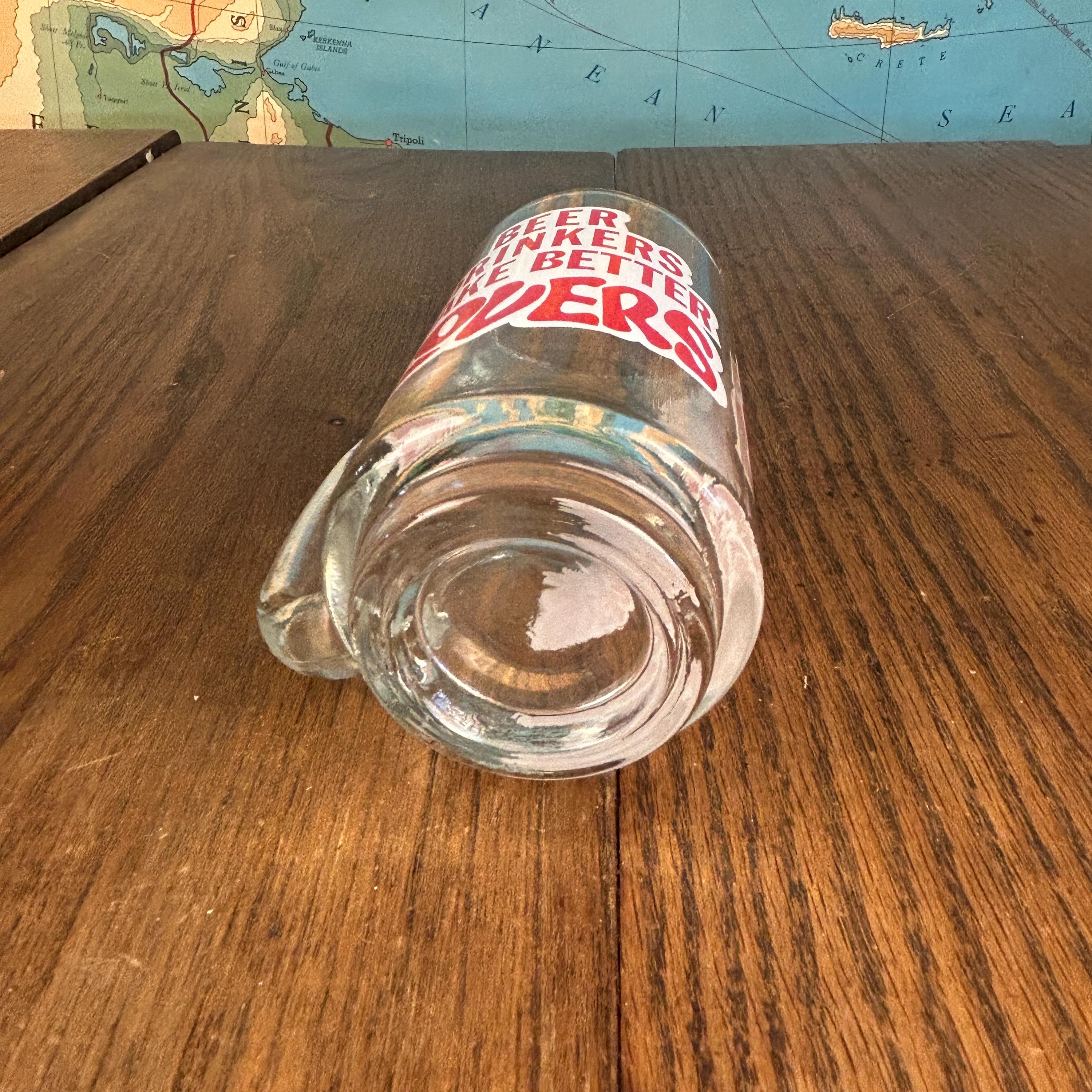 Crafted from thick, durable clear glass, this classic handled beer stein has a satisfying weight and timeless silhouette. The bold red lettering gives it that unmistakable vintage novelty vibe, making it a standout piece for entertaining or display.