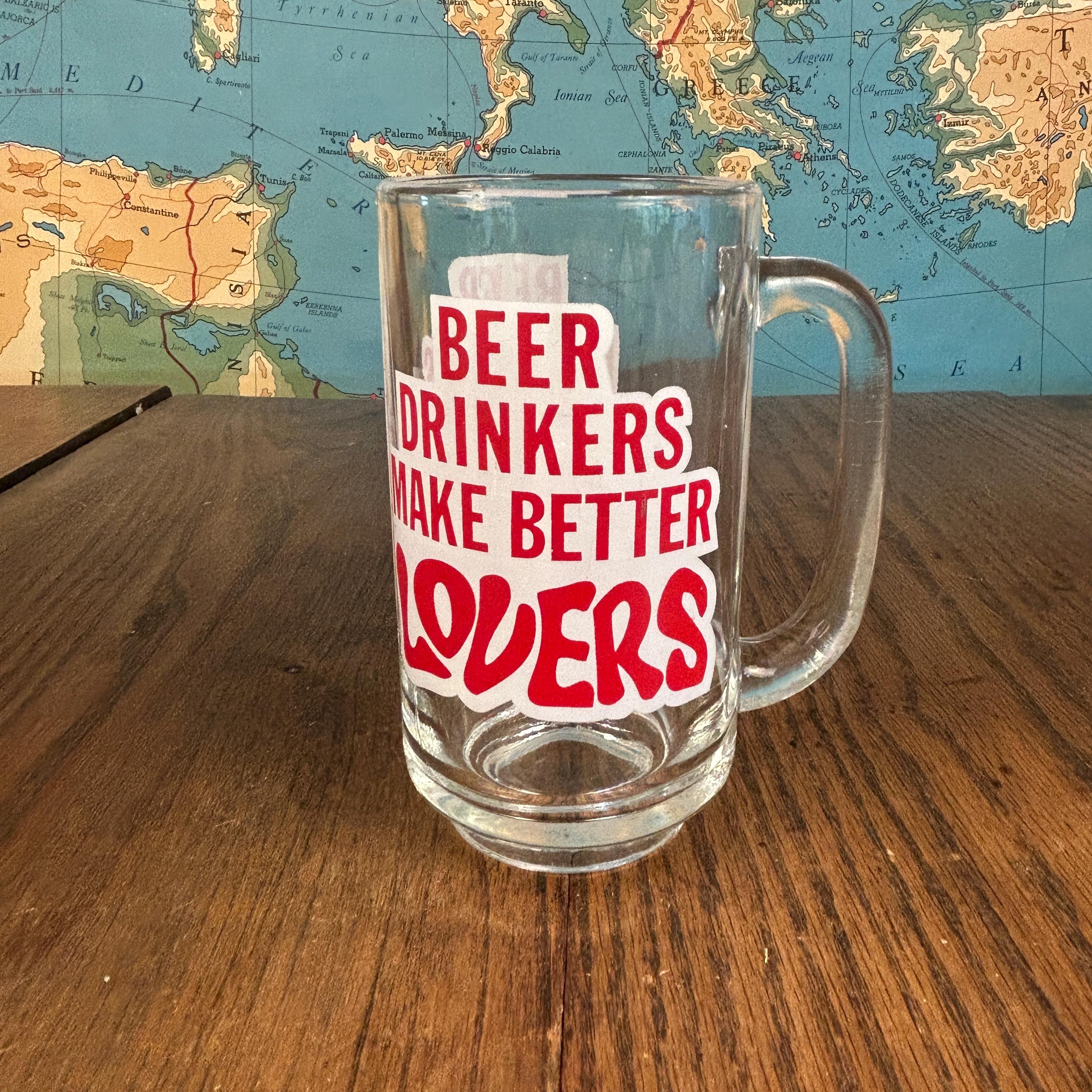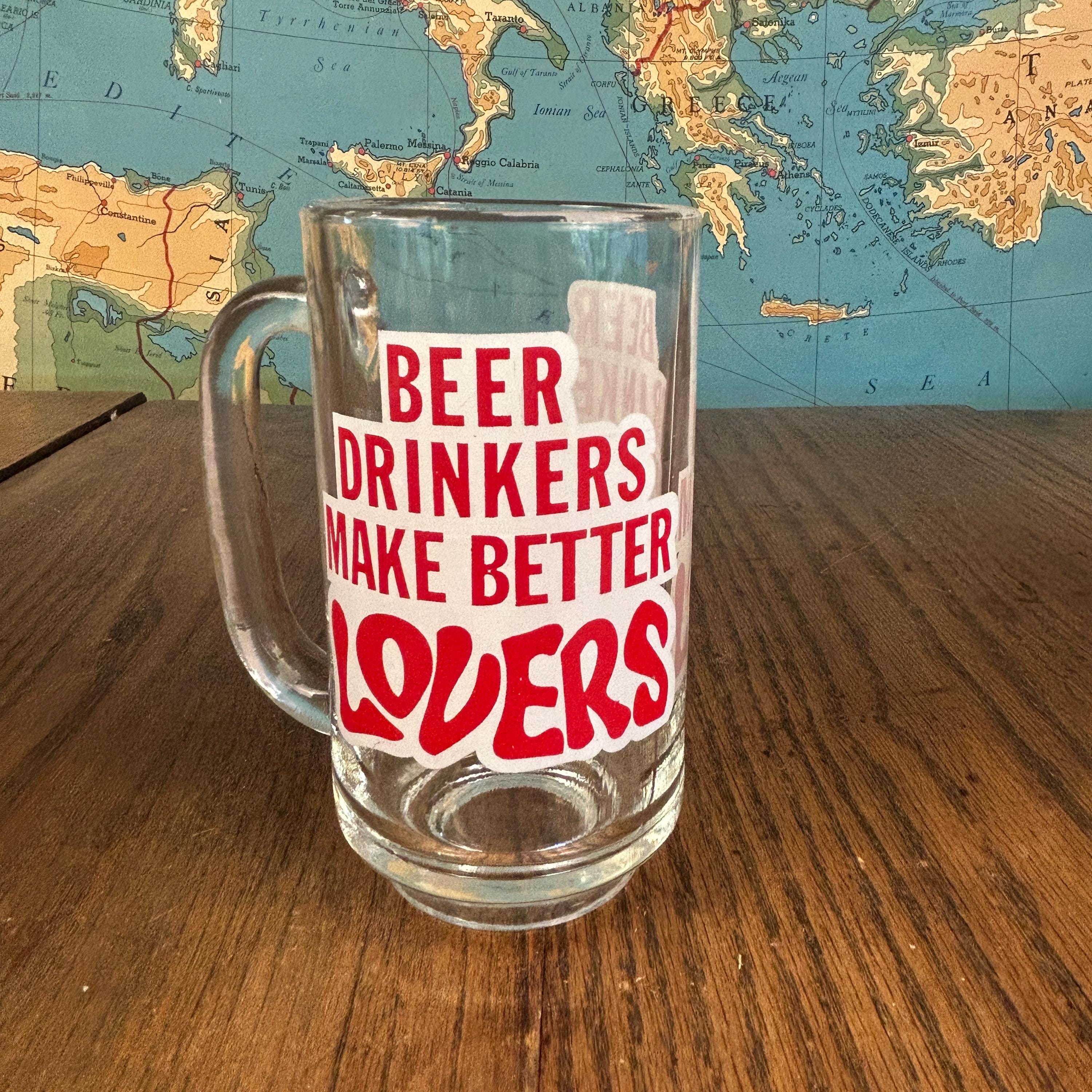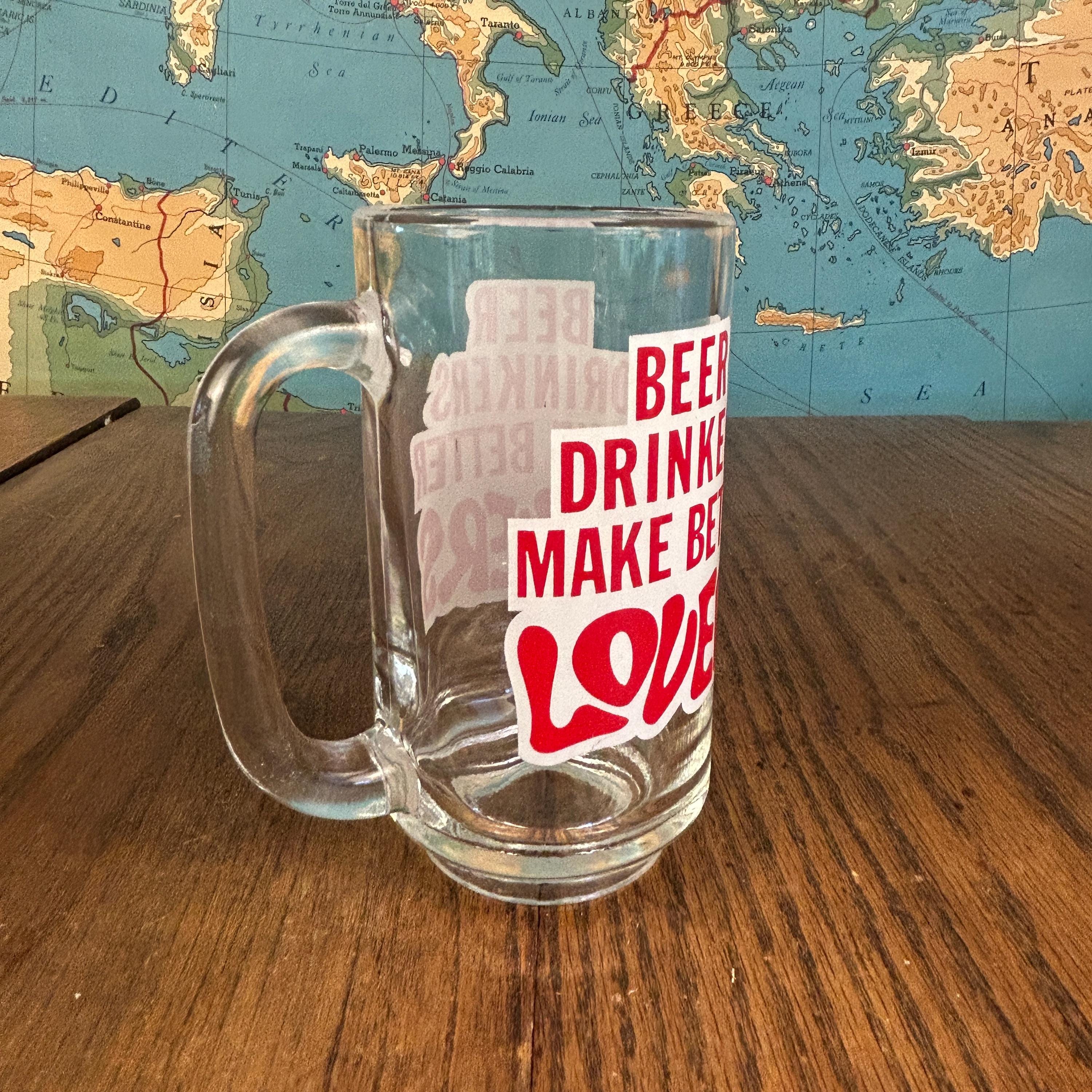 Add a fun dose of retro charm to your barware collection with this vintage Libbey beer mug from the 1970s, featuring the cheeky slogan “Beer Drinkers Make Better Lovers.”