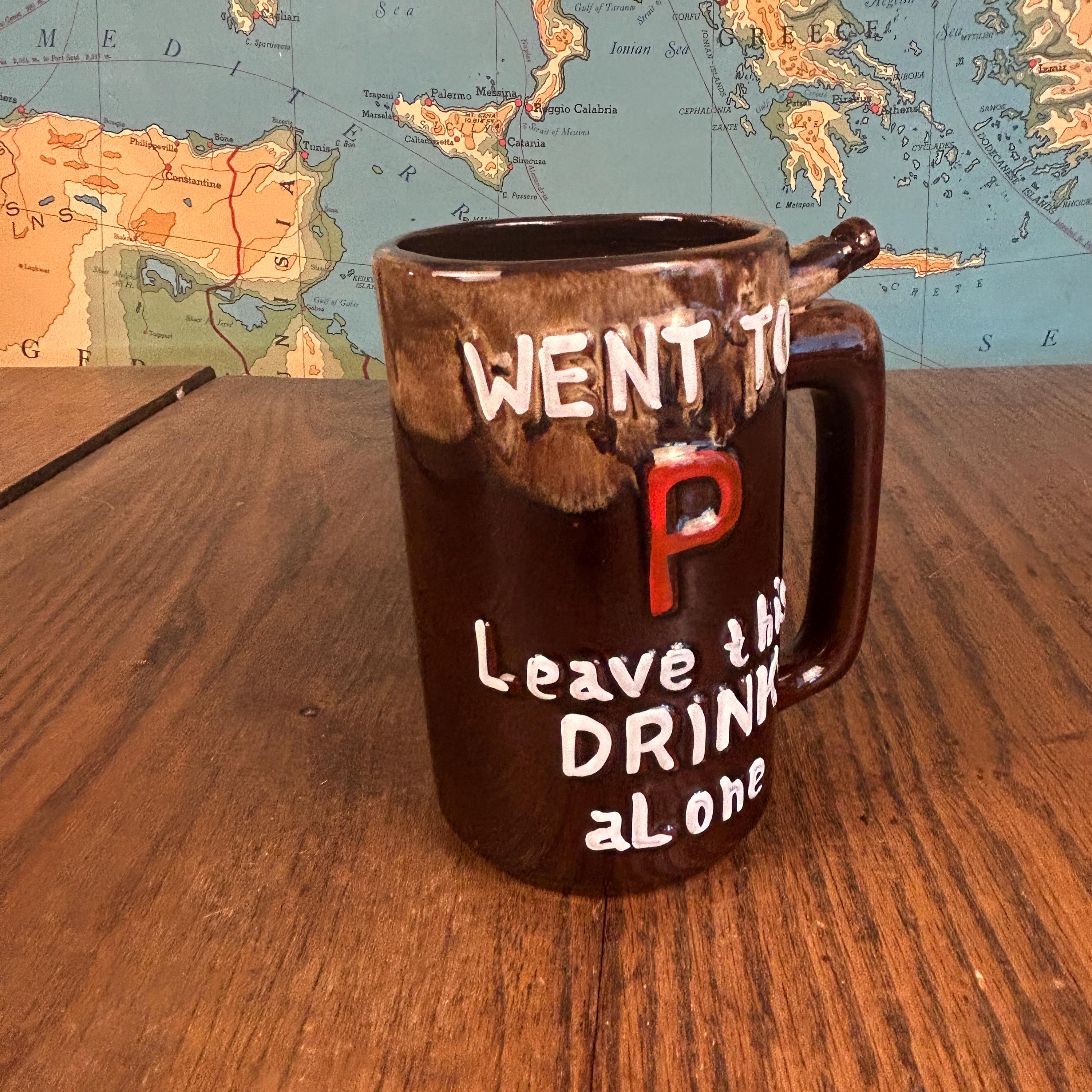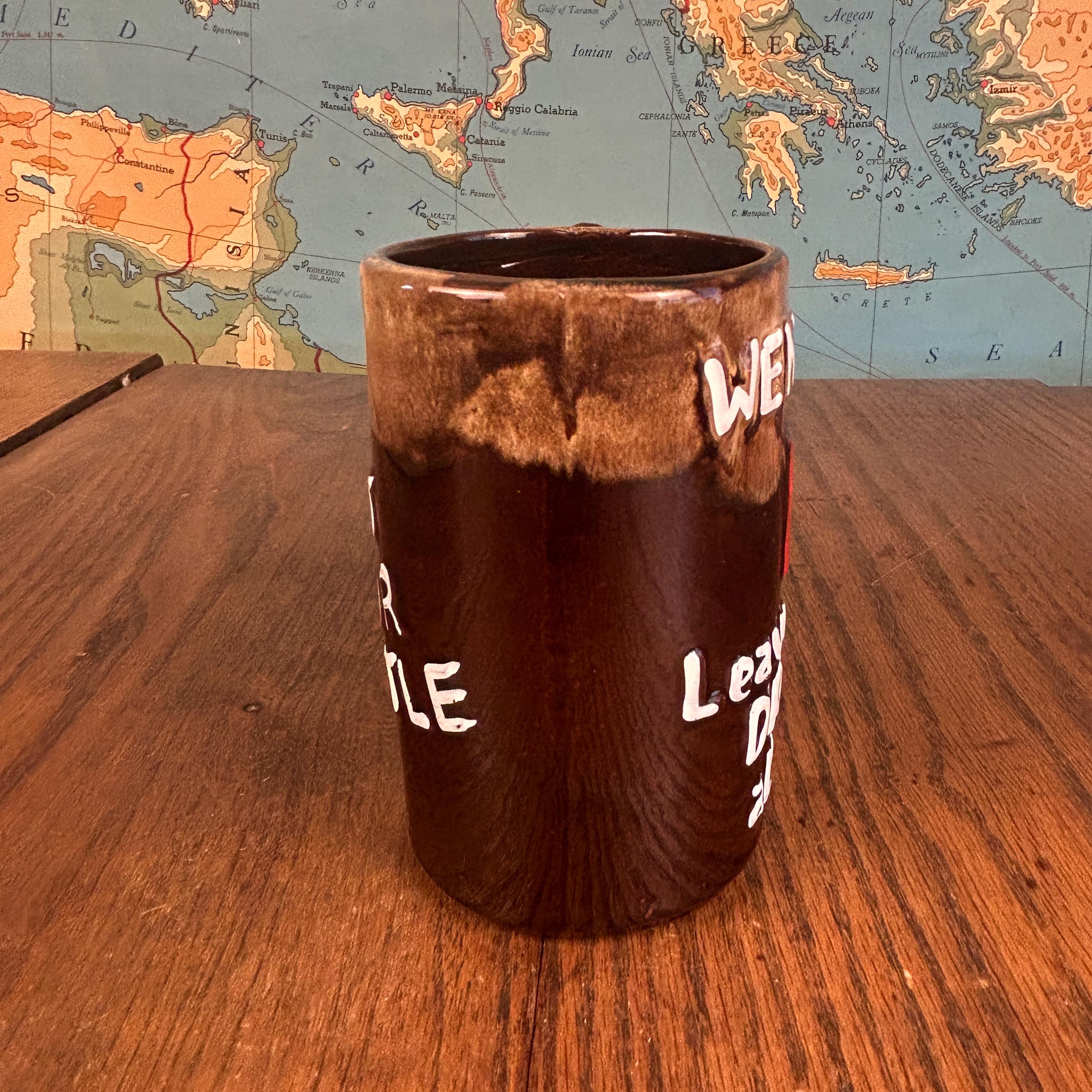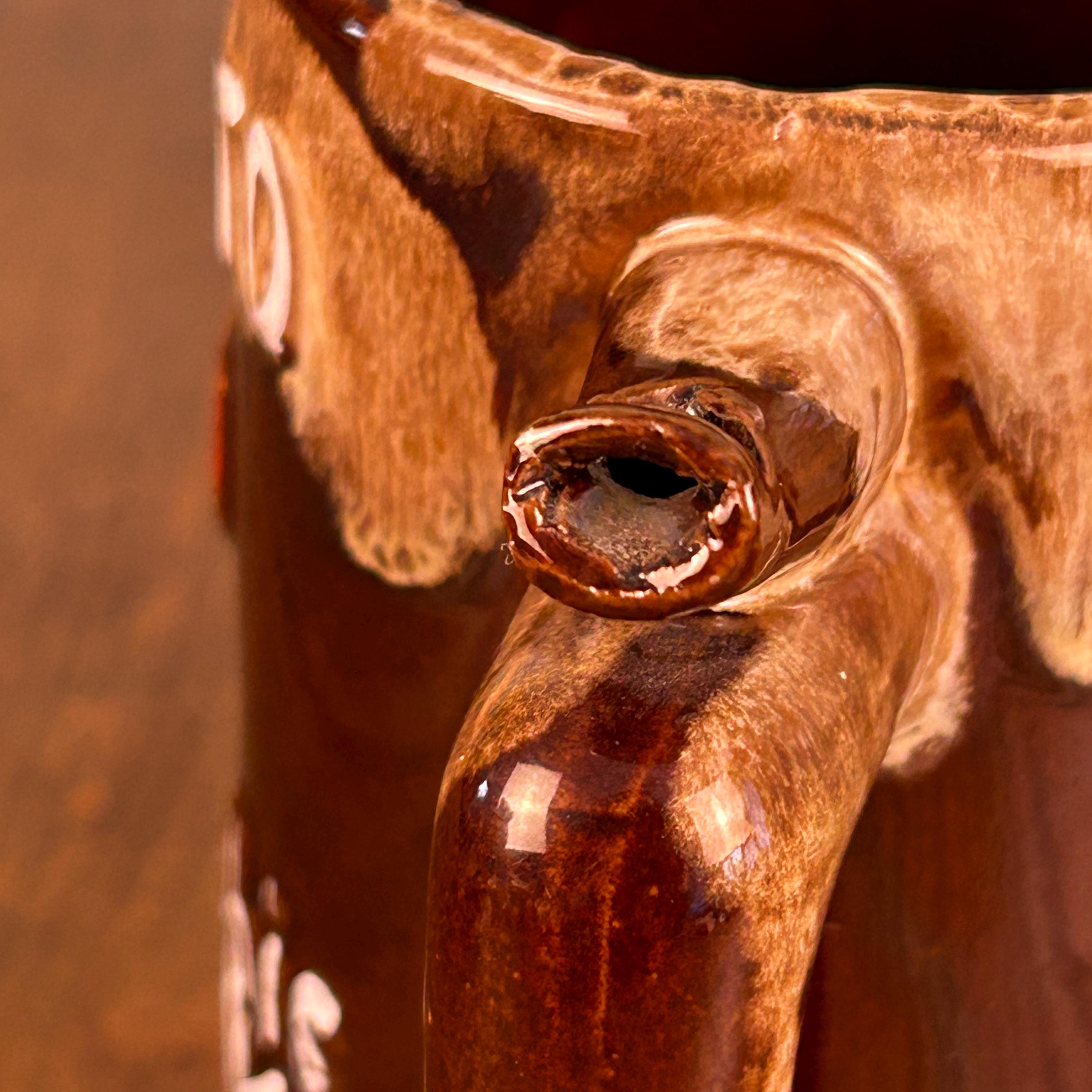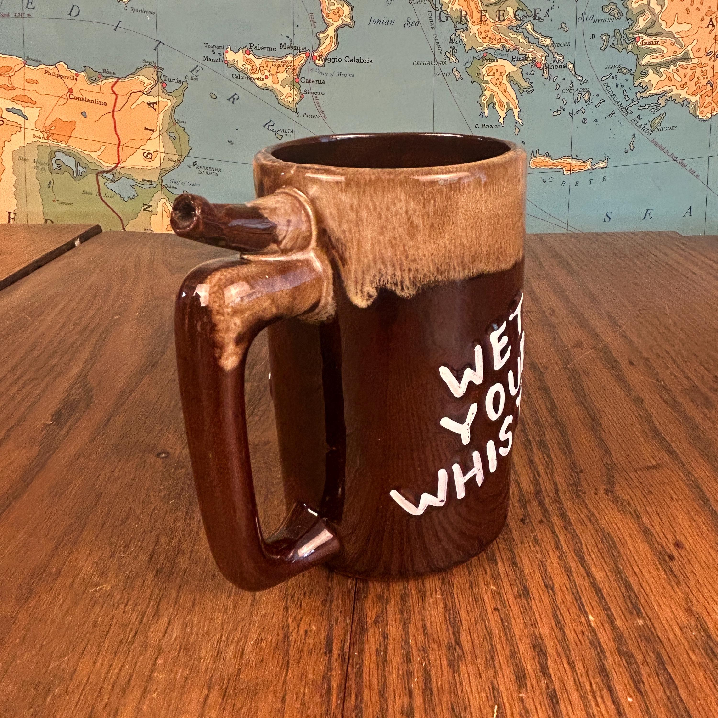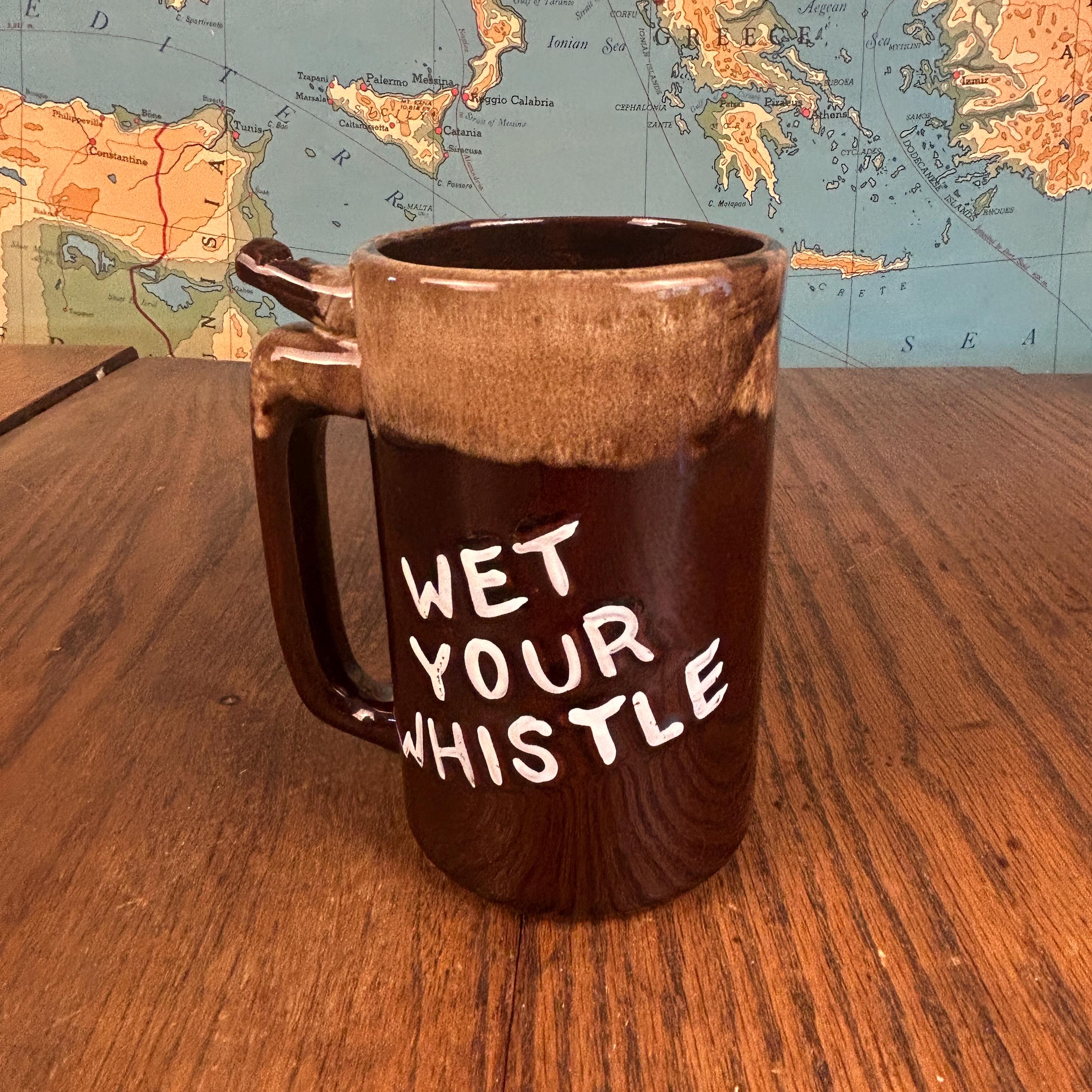 Add a playful touch to your barware collection with this vintage “Wet Your Whistle” ceramic beer mug, a classic mid-century novelty piece made in Japan.