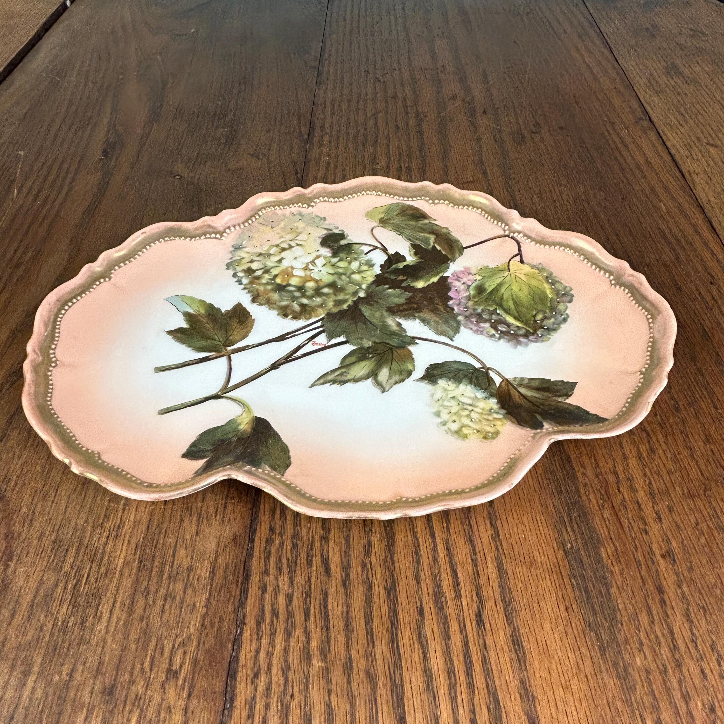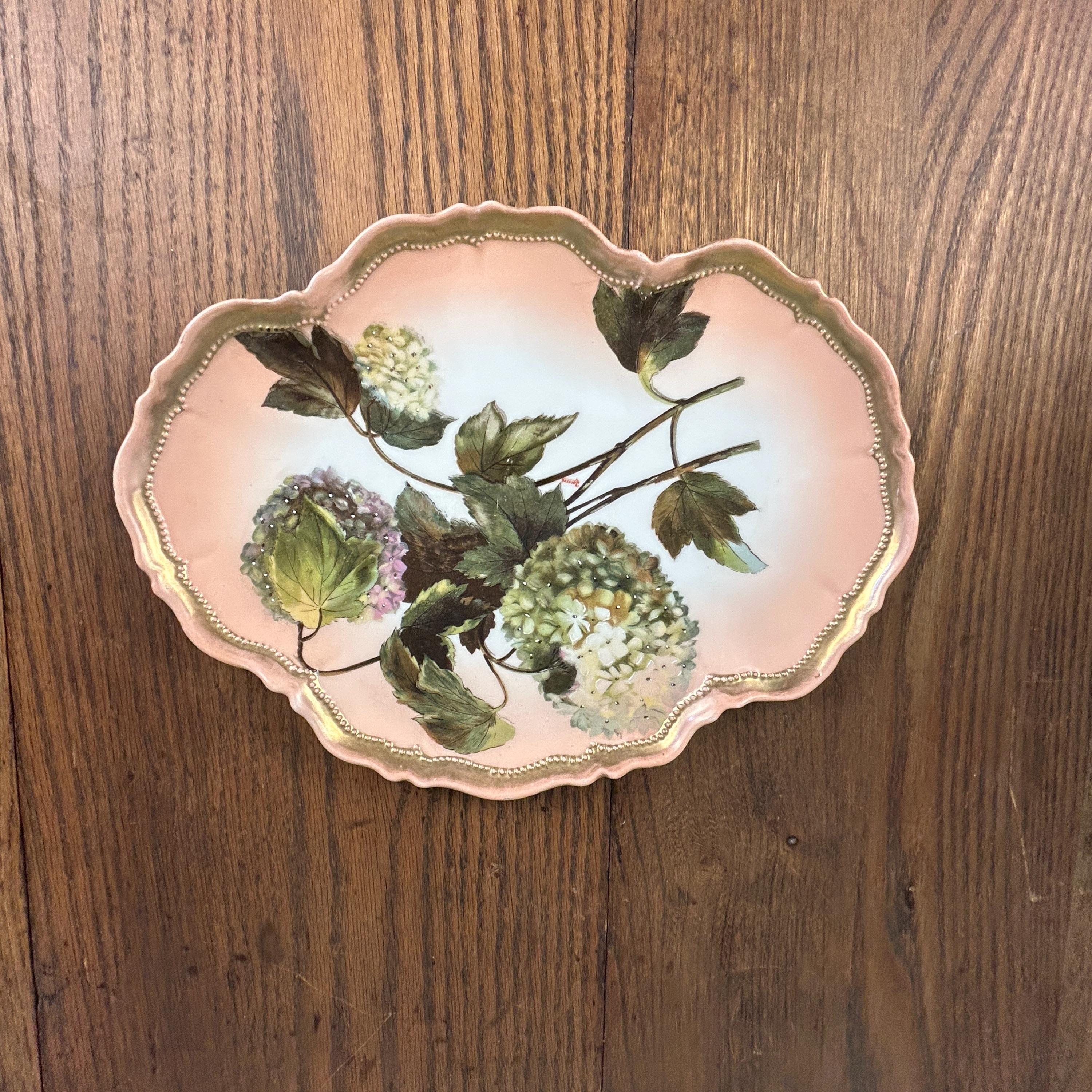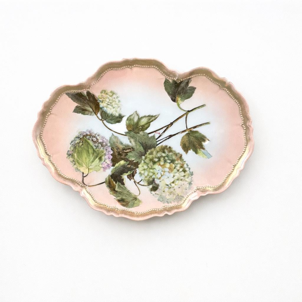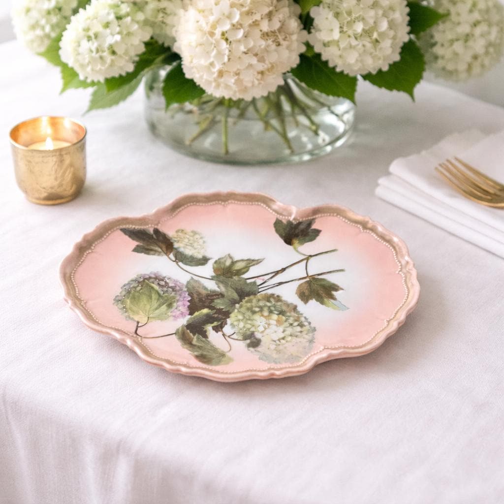 This beautiful piece features the highly collectible “Snowball” (Boule de Neige) floral pattern, showcasing delicate hydrangea-like blooms in soft pastel tones set against a romantic pink background. The scalloped edge is accented with refined gold trim, adding a touch of classic European sophistication.