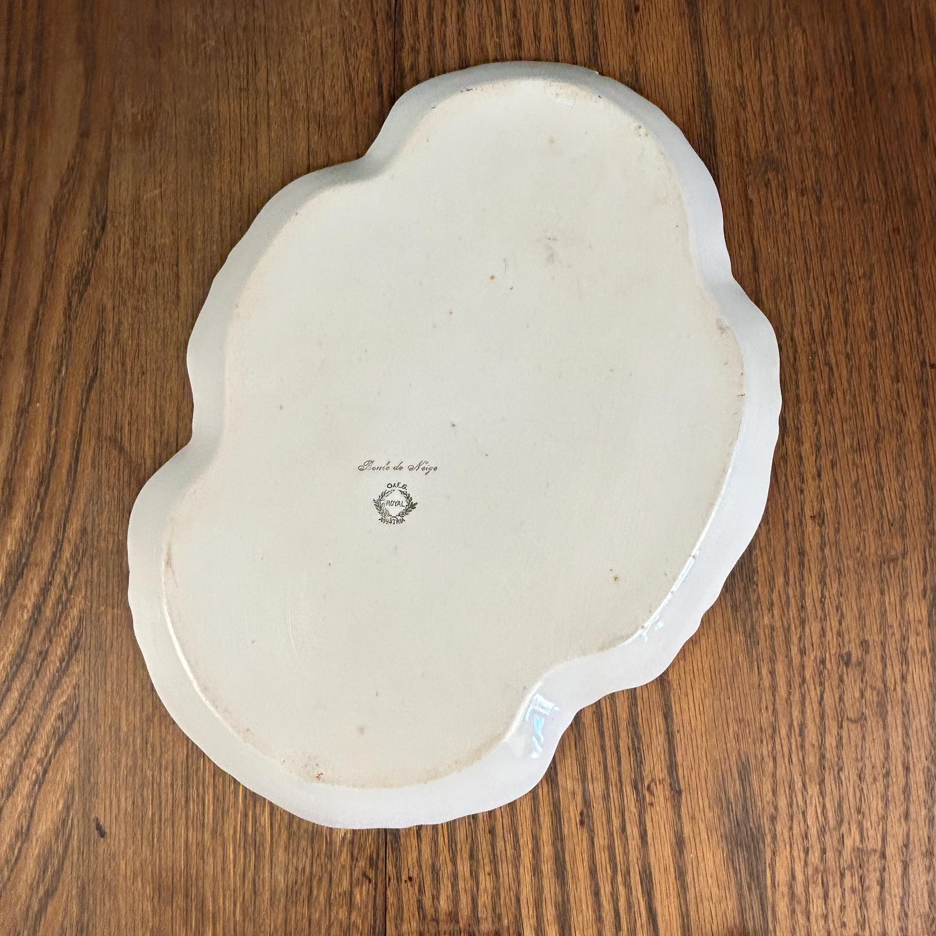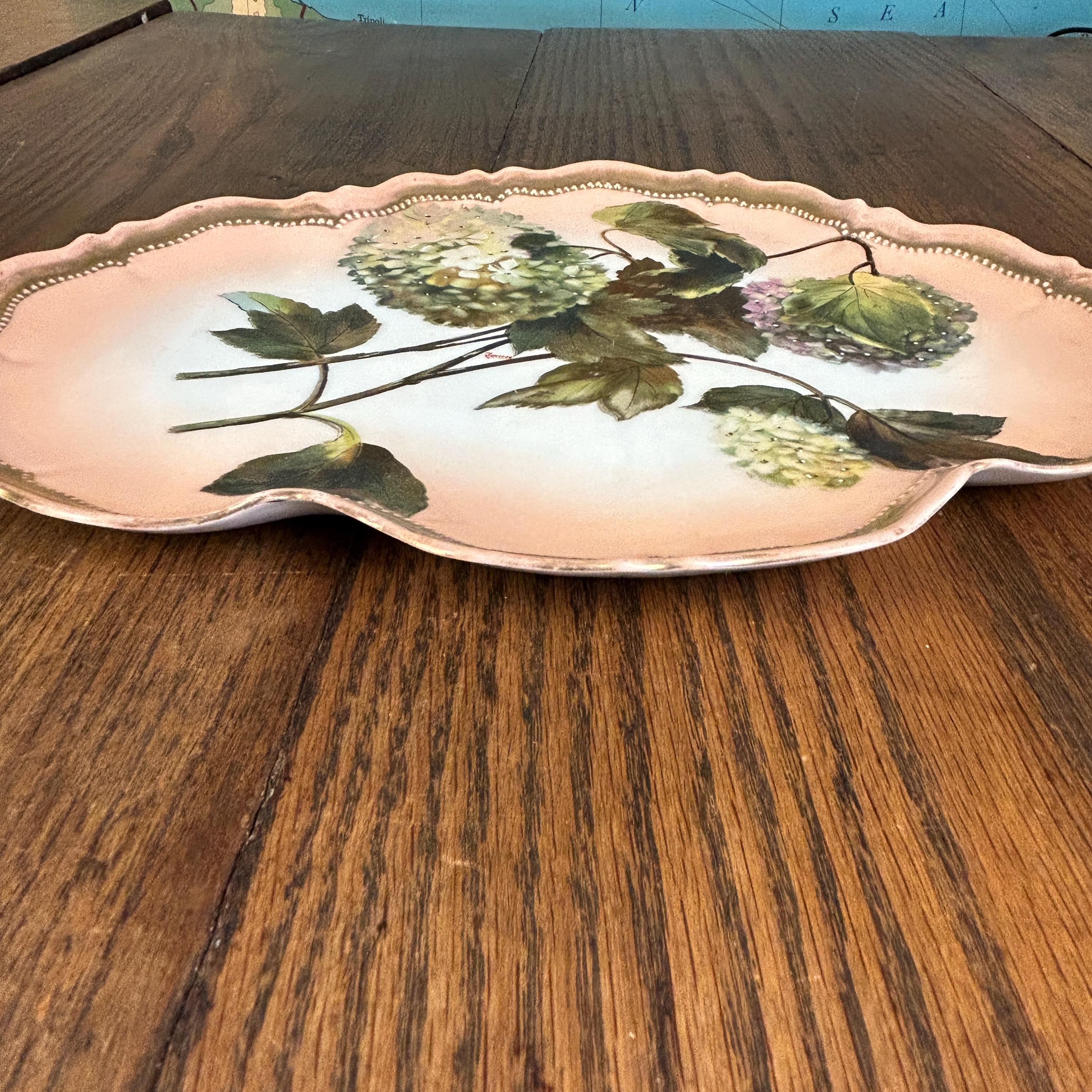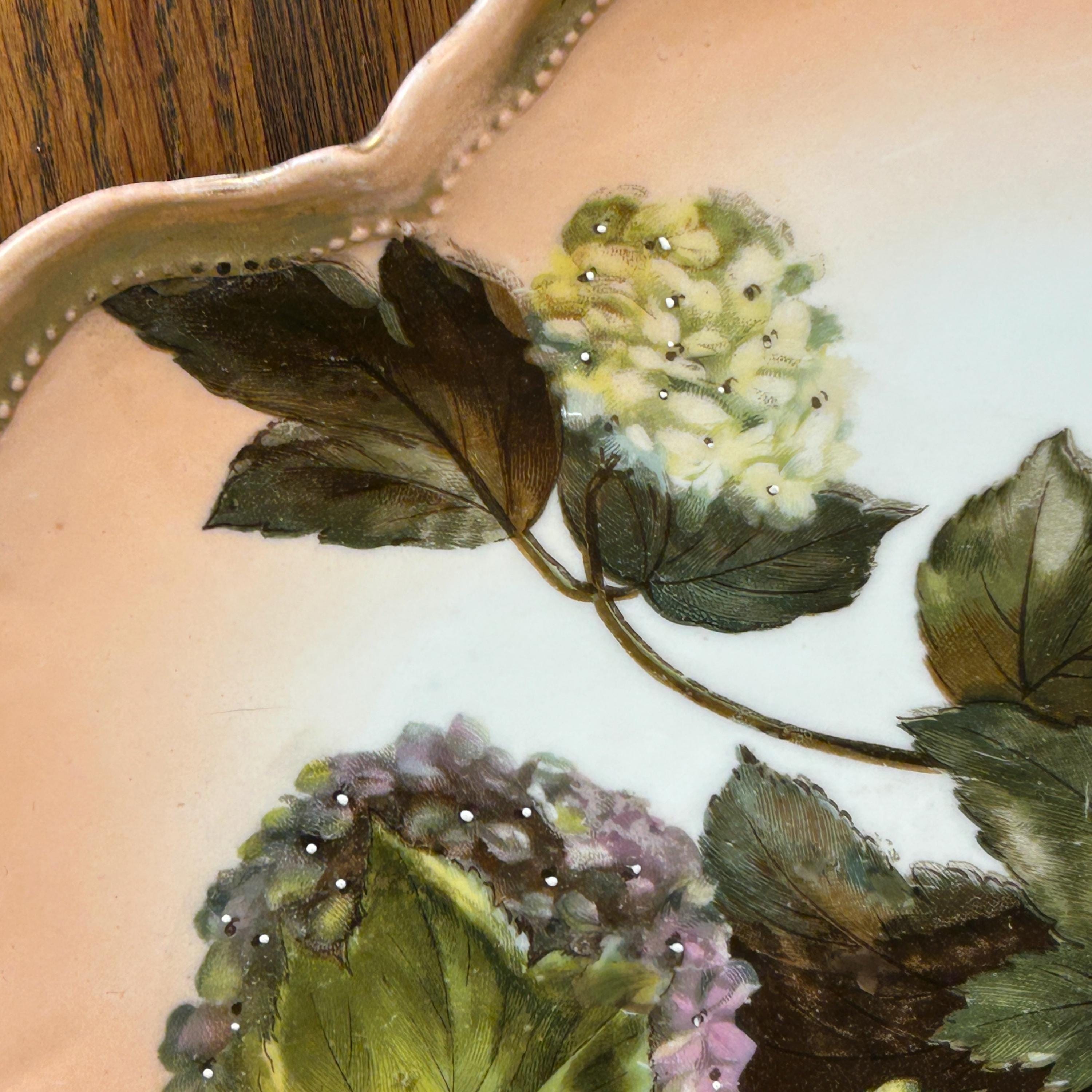 This beautiful piece features the highly collectible “Snowball” (Boule de Neige) floral pattern, showcasing delicate hydrangea-like blooms in soft pastel tones set against a romantic pink background. The scalloped edge is accented with refined gold trim, adding a touch of classic European sophistication.