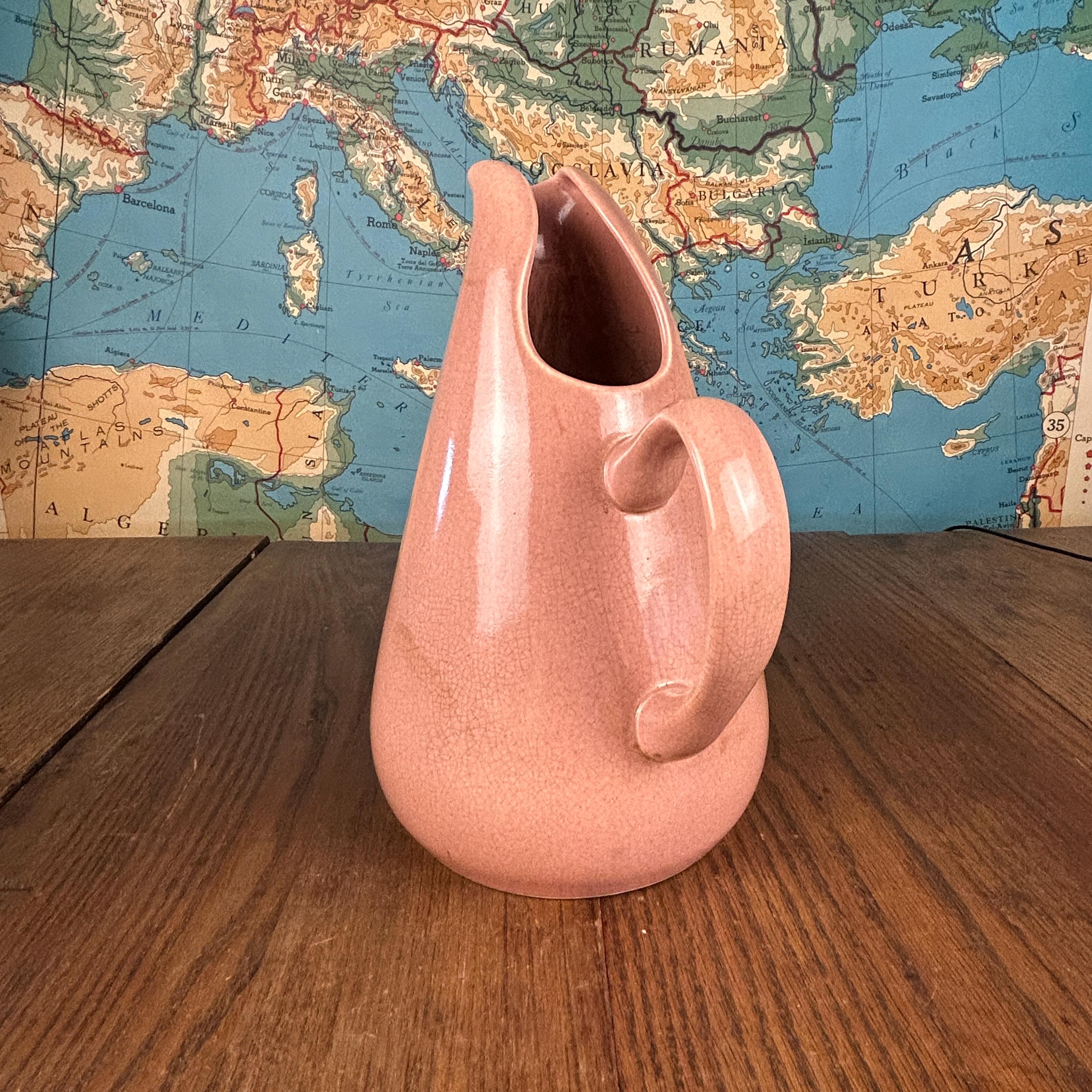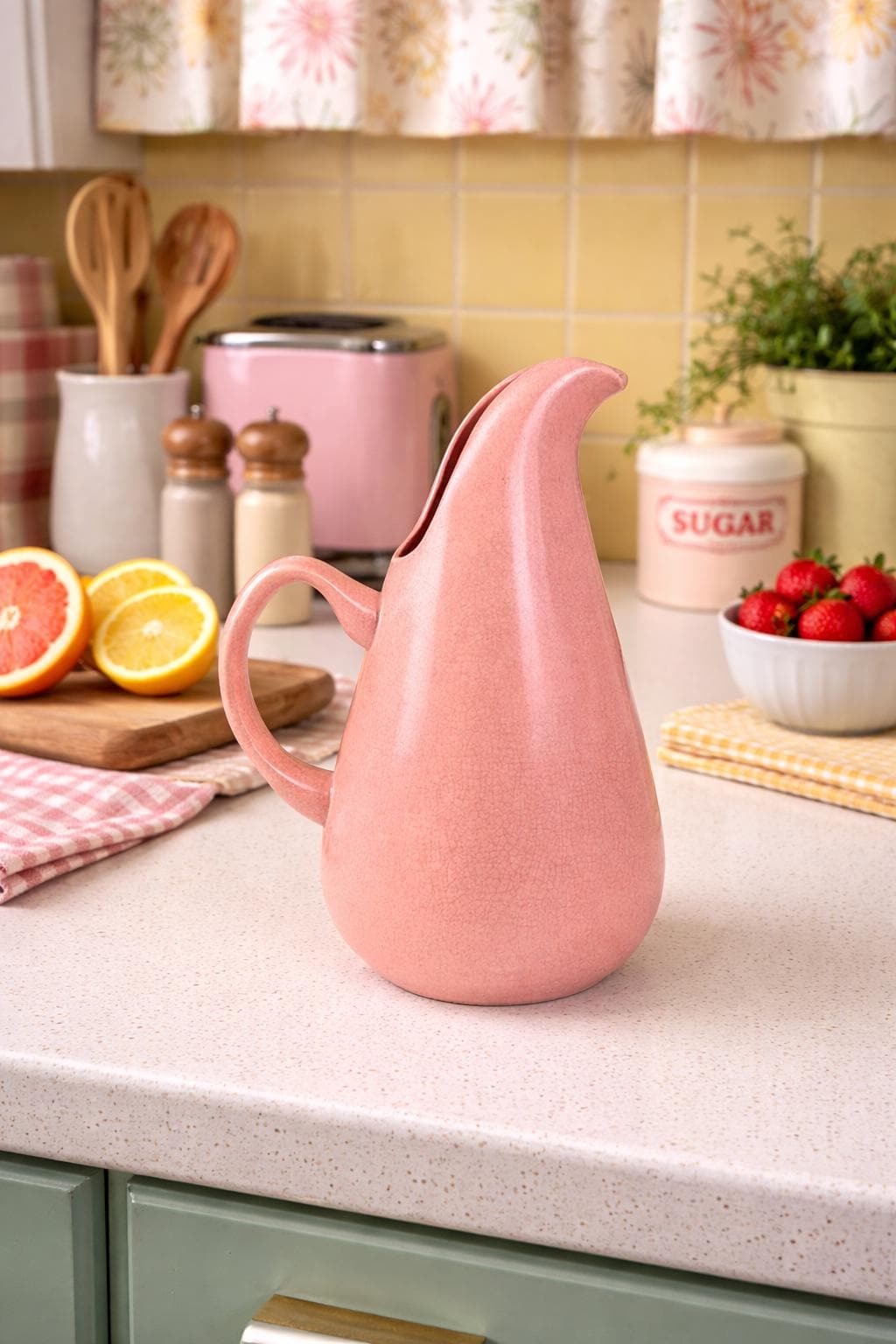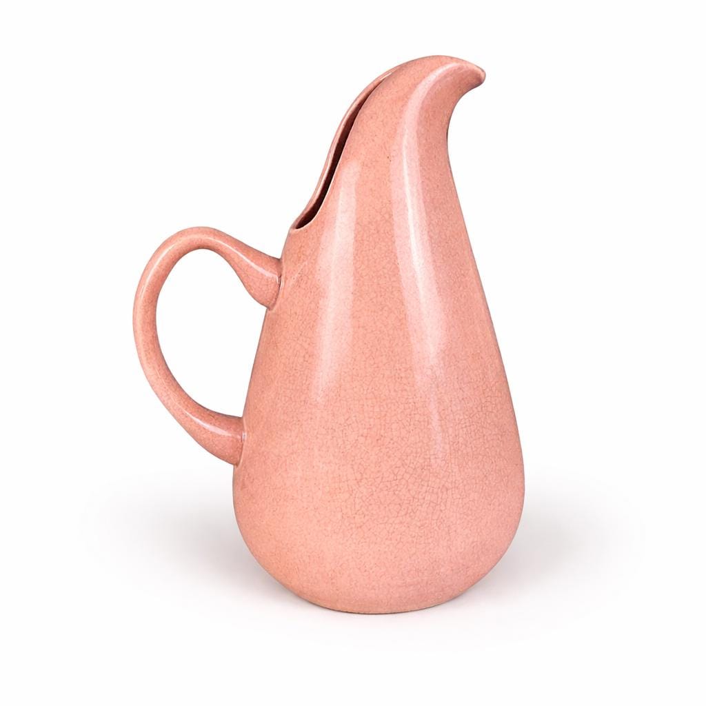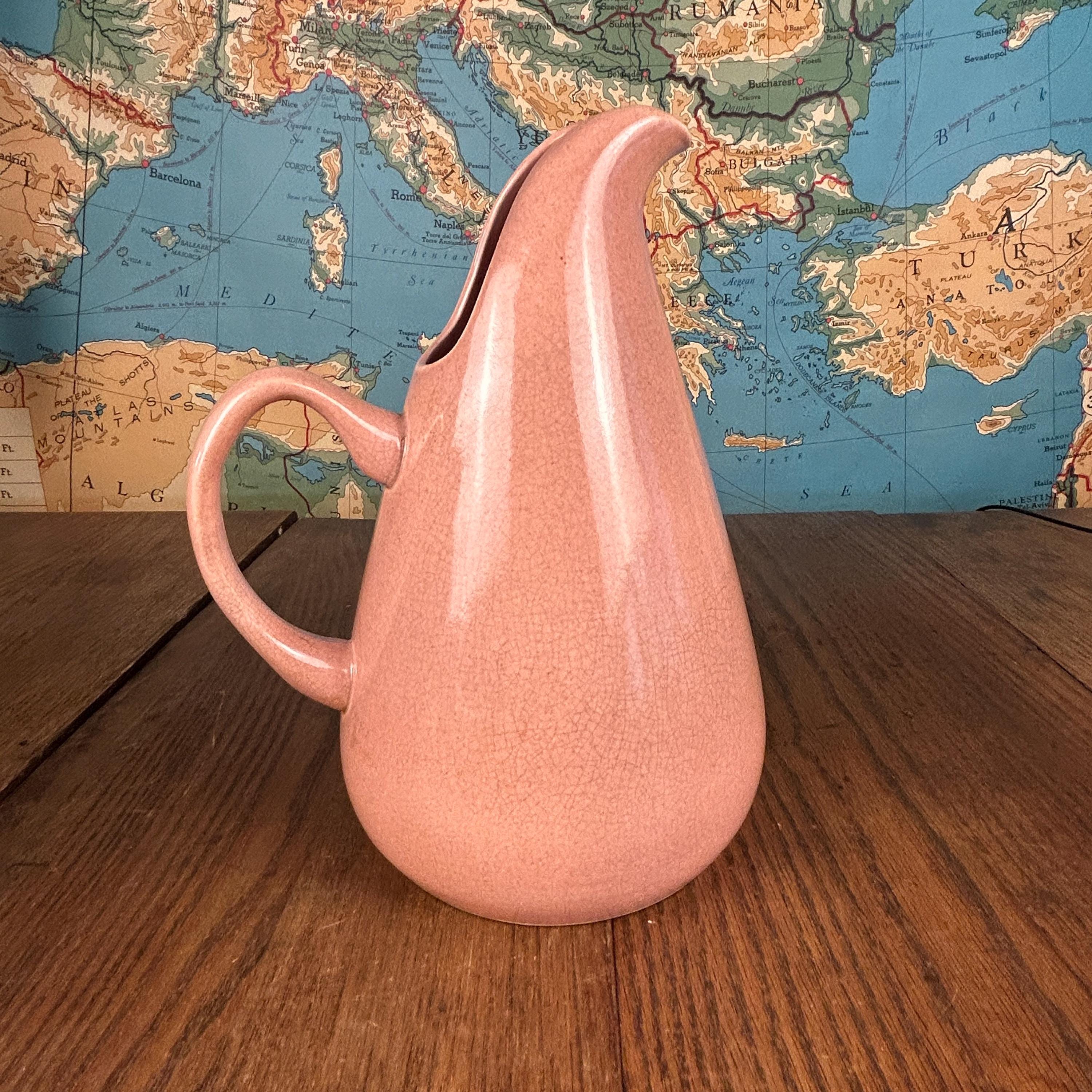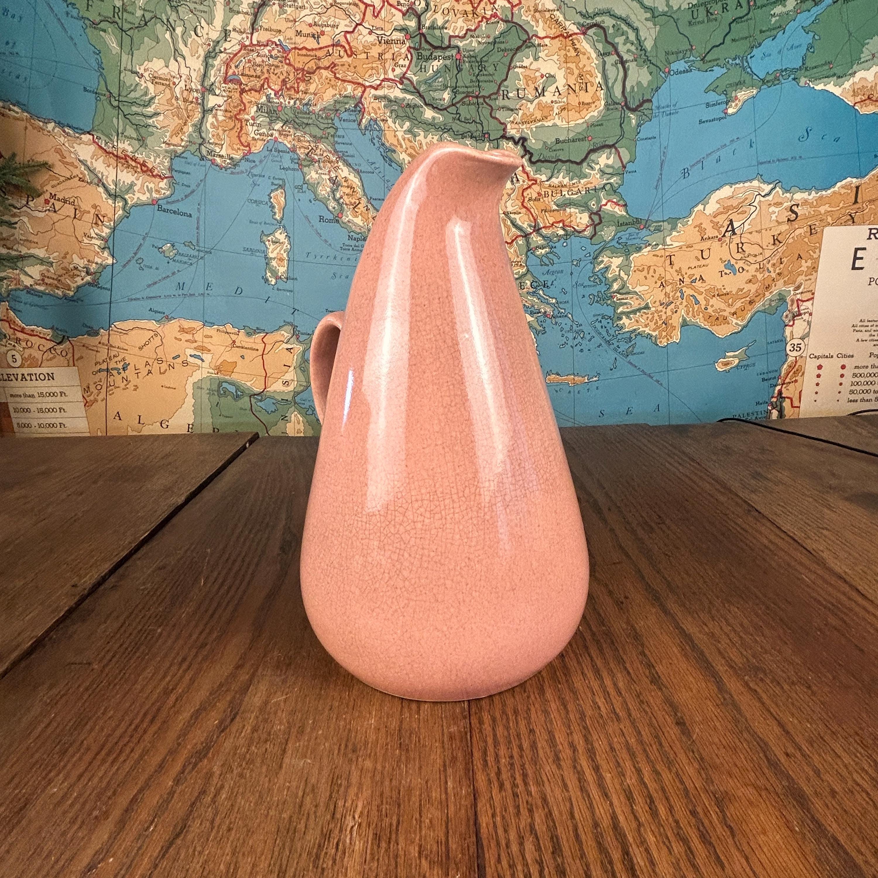 Finished in the sought-after coral glaze with subtle speckling, this pitcher makes a striking statement whether used functionally or displayed as a sculptural vase. Its timeless silhouette fits beautifully into mid-century, modern, or eclectic interiors.