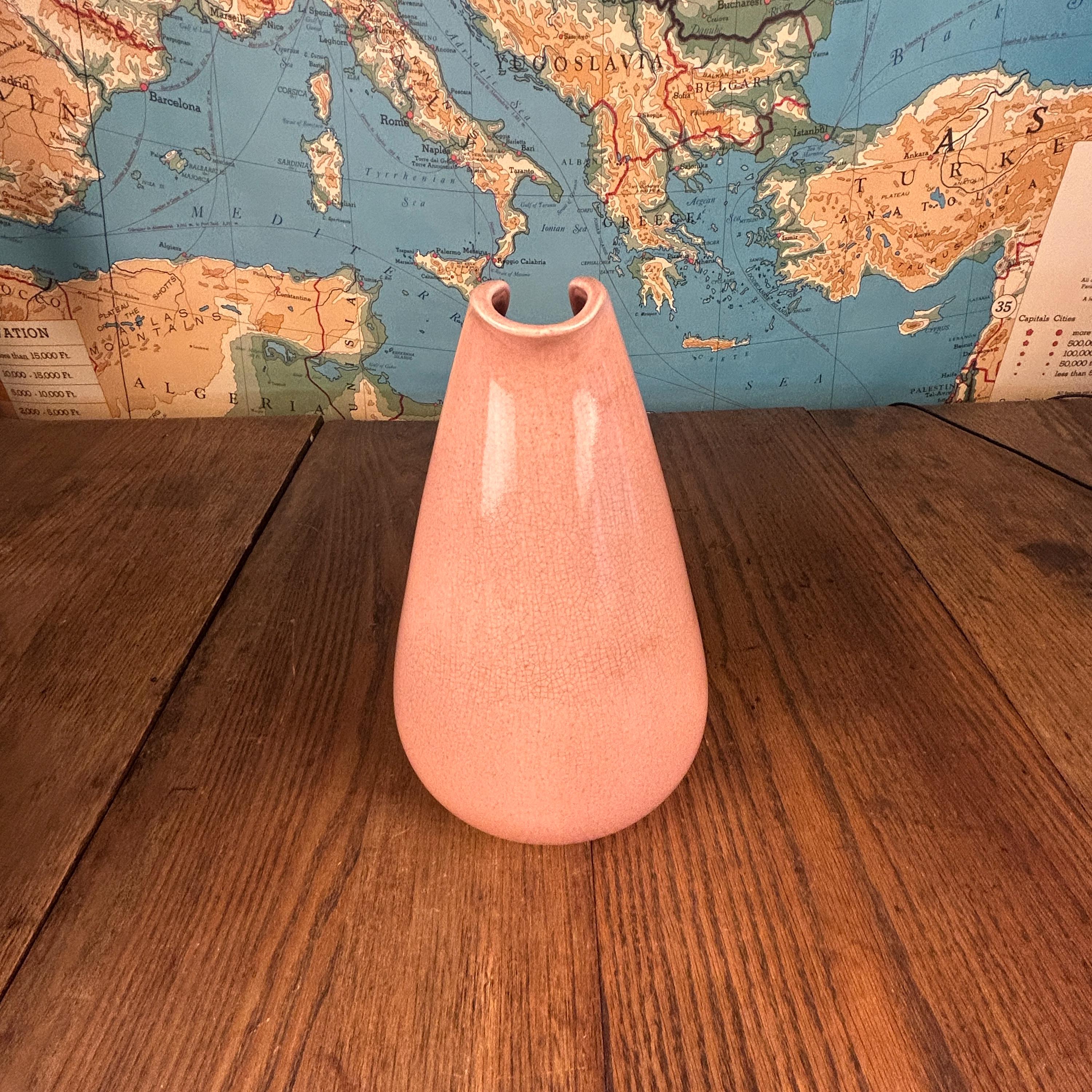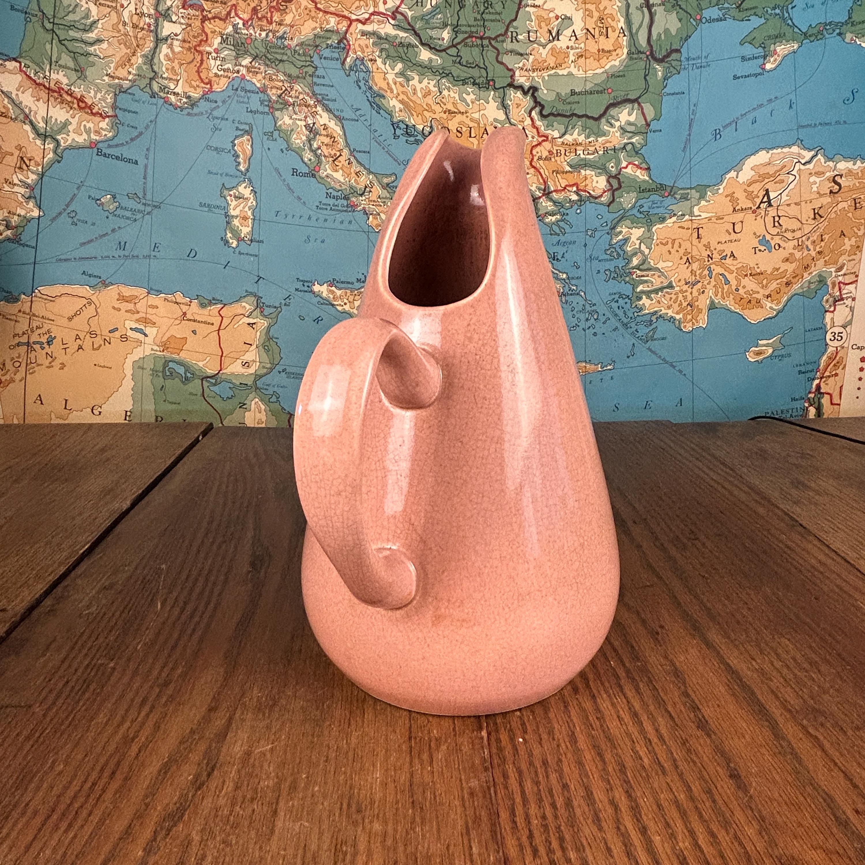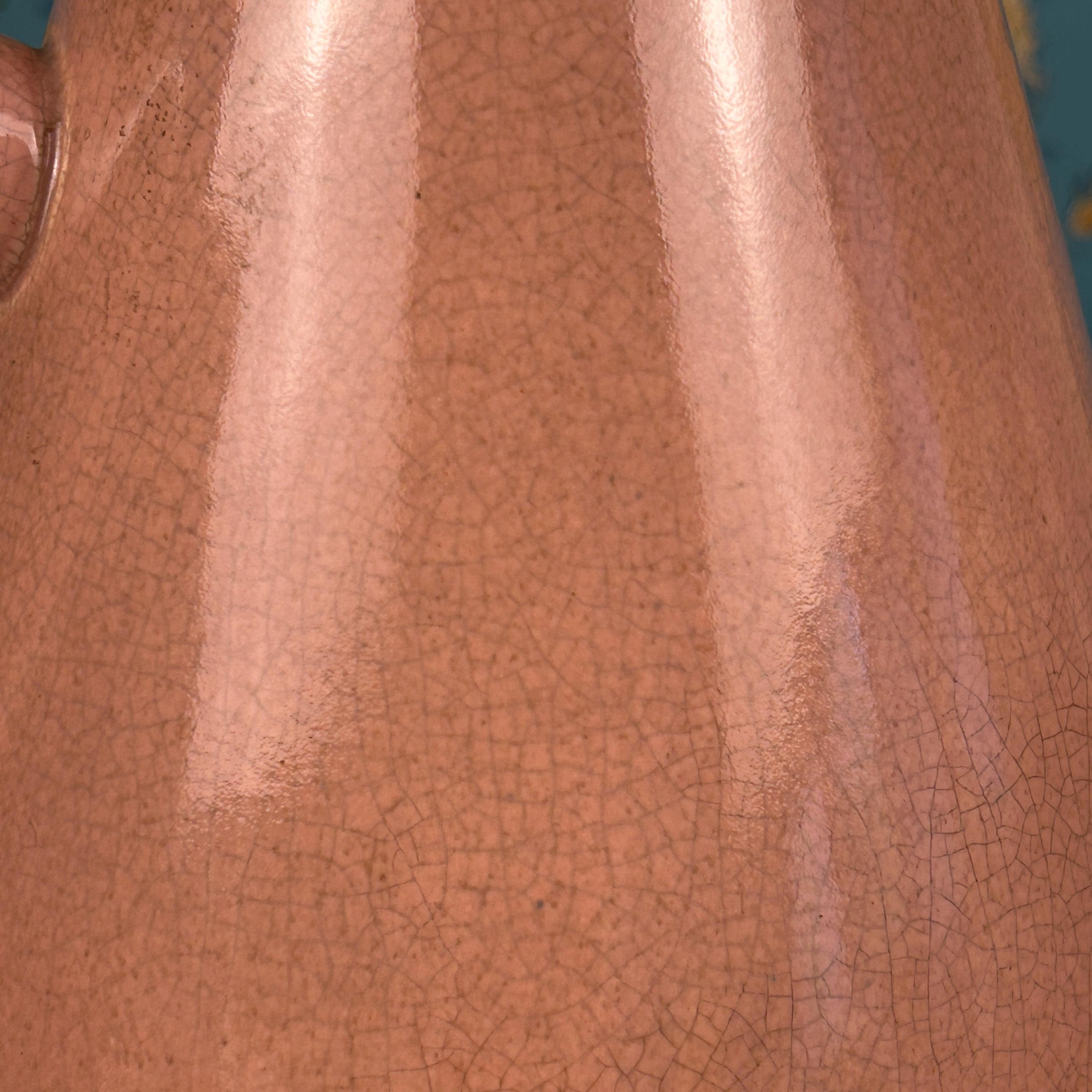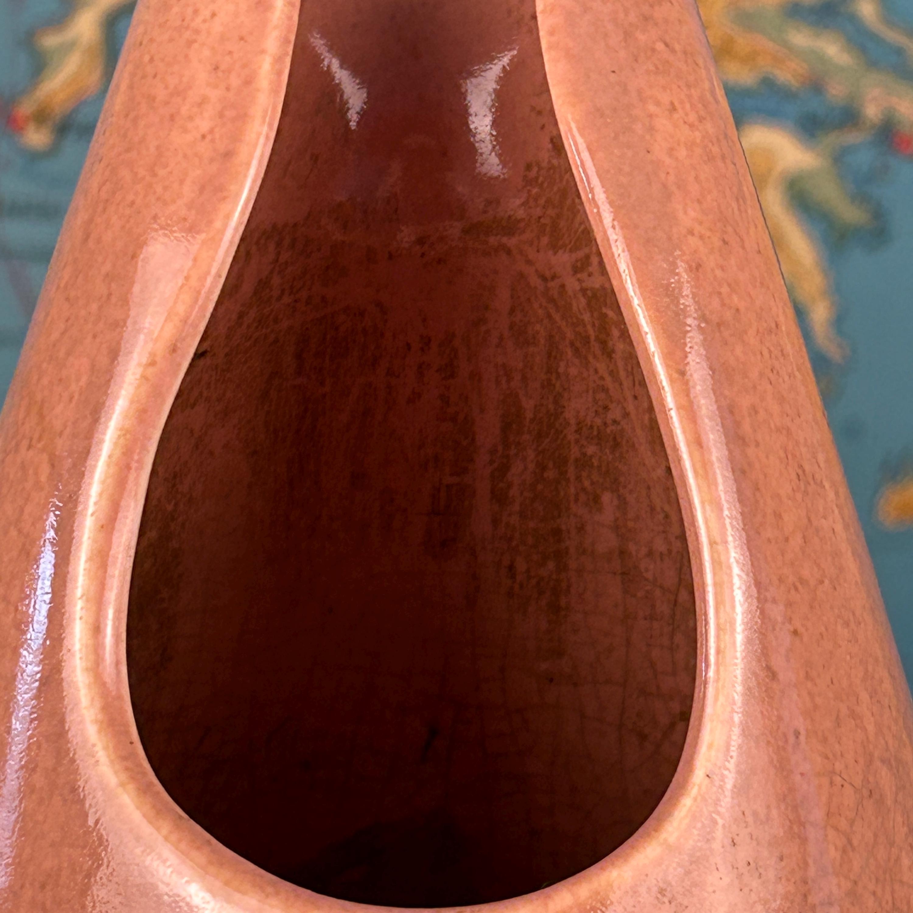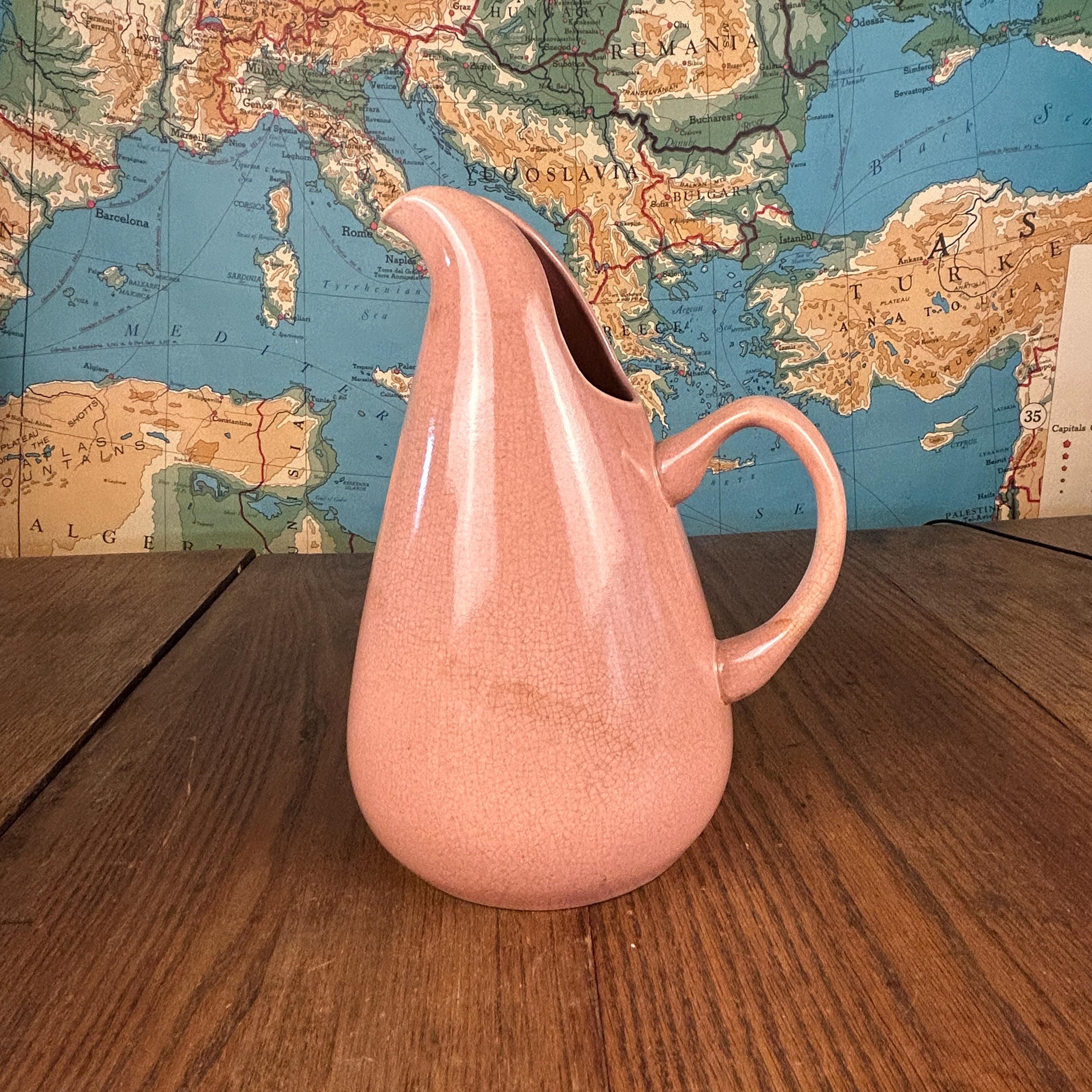 Finished in the sought-after coral glaze with subtle speckling, this pitcher makes a striking statement whether used functionally or displayed as a sculptural vase. Its timeless silhouette fits beautifully into mid-century, modern, or eclectic interiors.