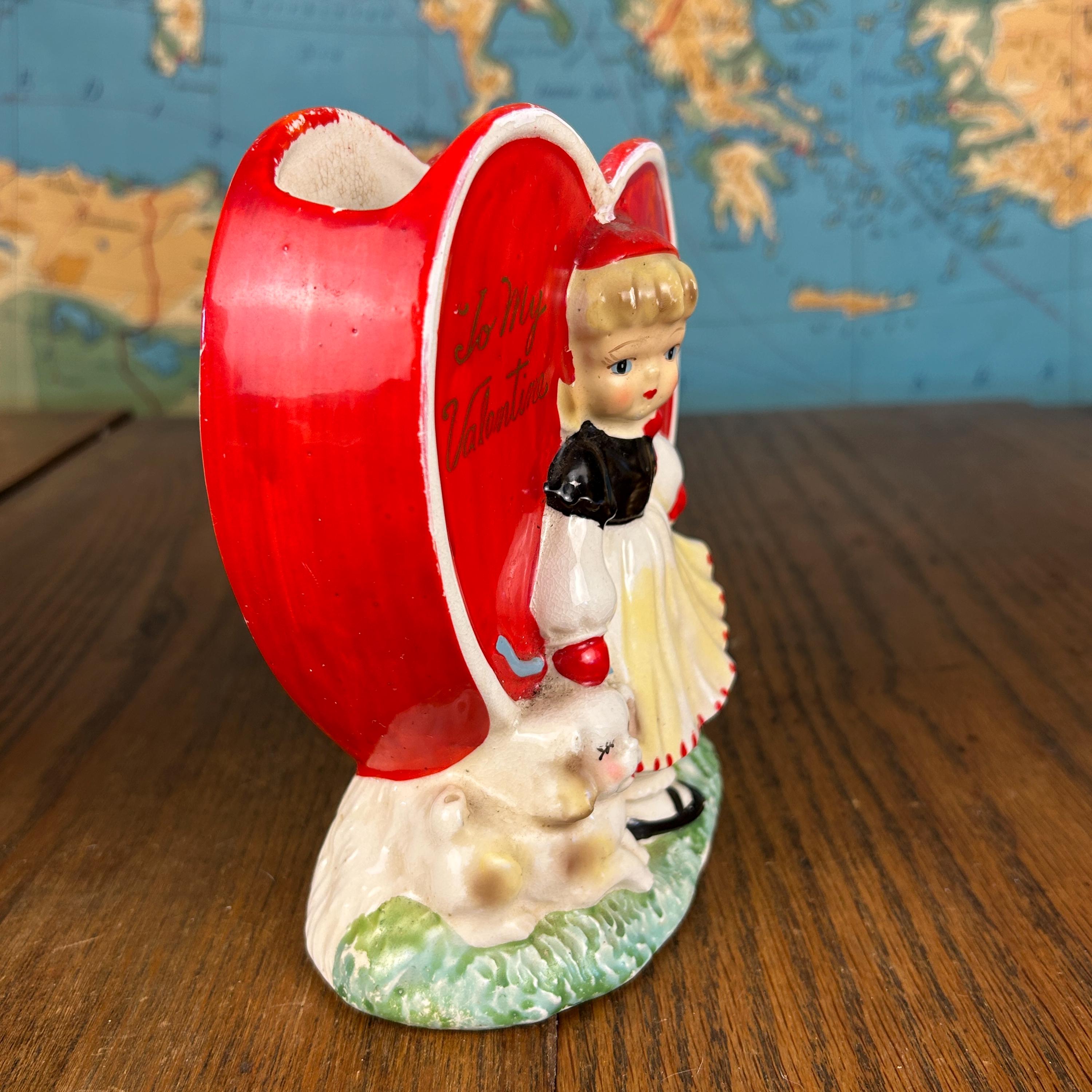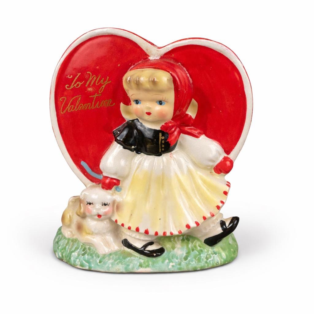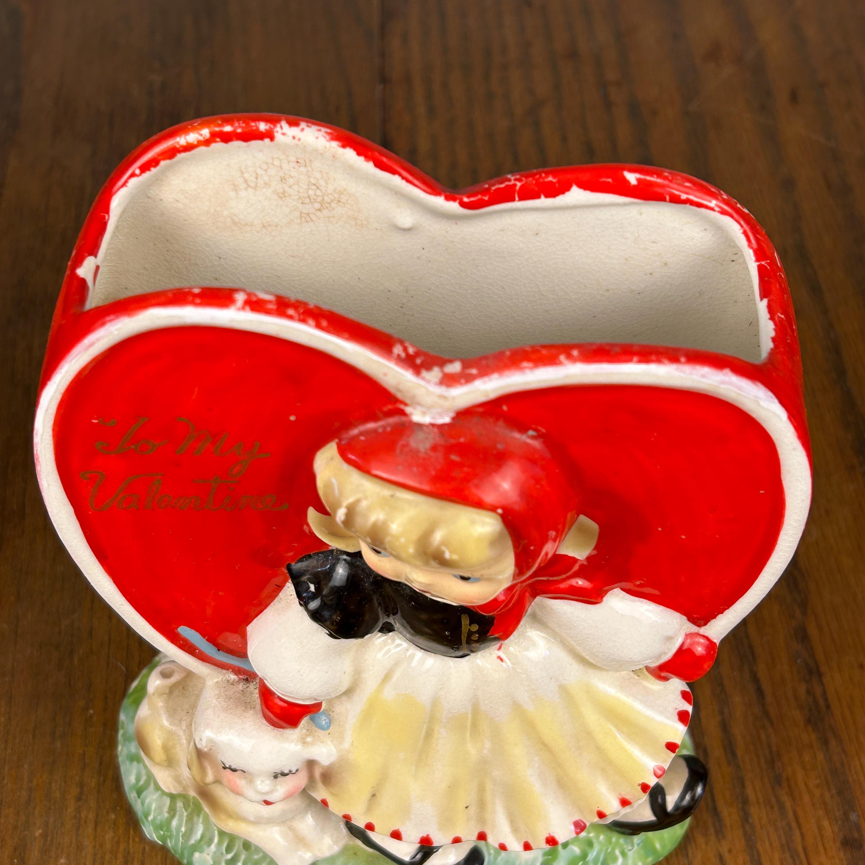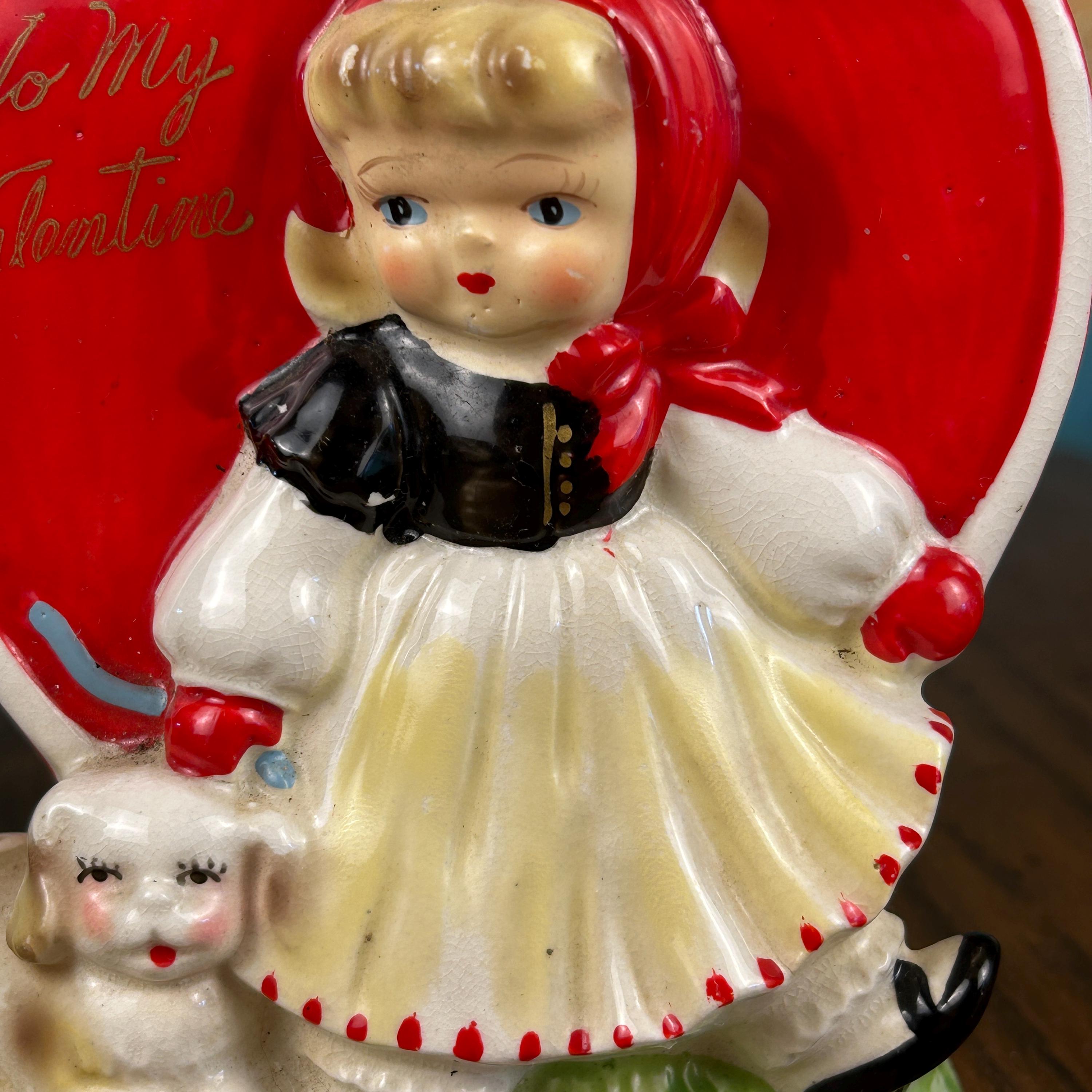 Adorable and full of nostalgic charm, this vintage ceramic planter by HF Co. features a sweet Valentine’s theme with a young girl in a red dress holding her puppy in front of a bright red heart.