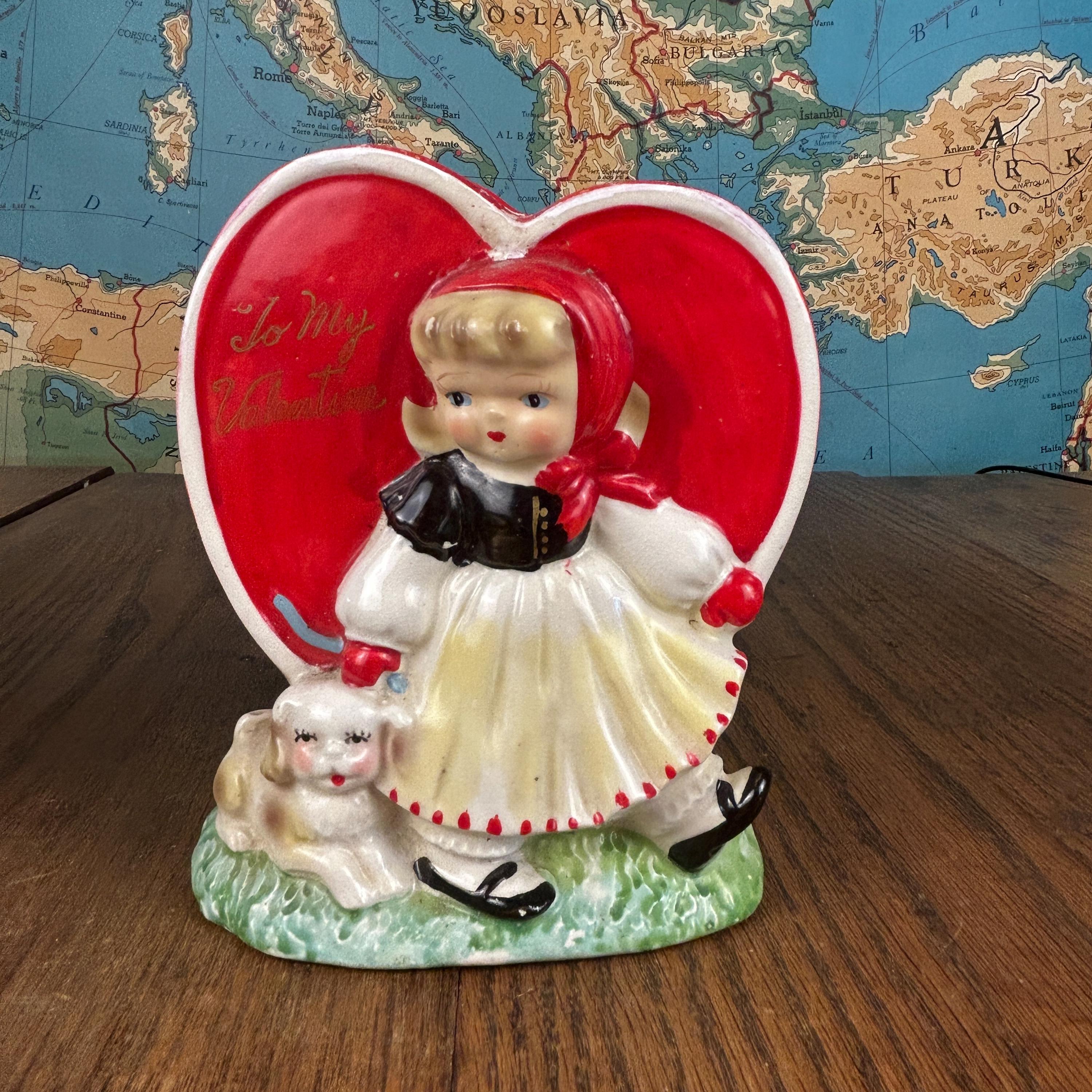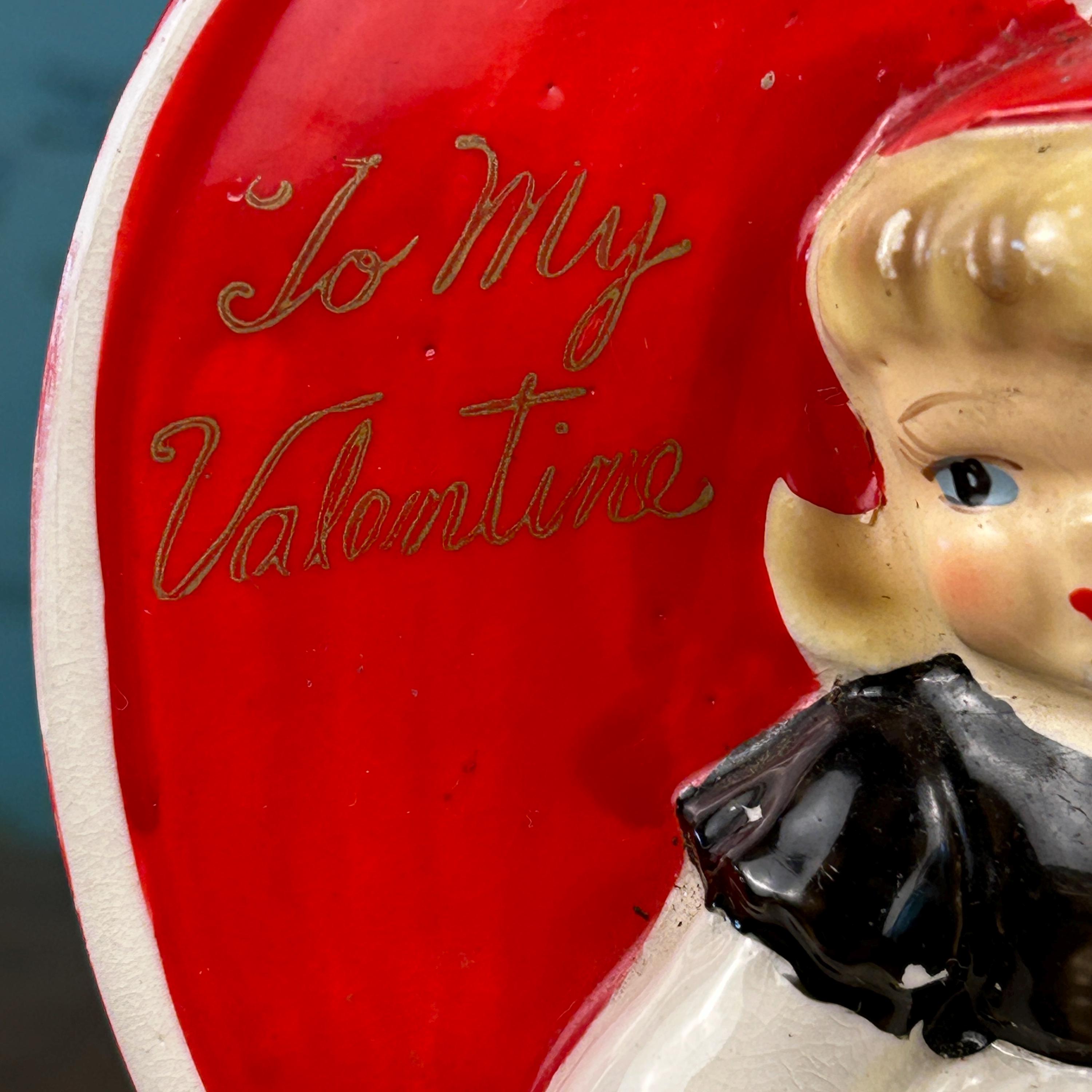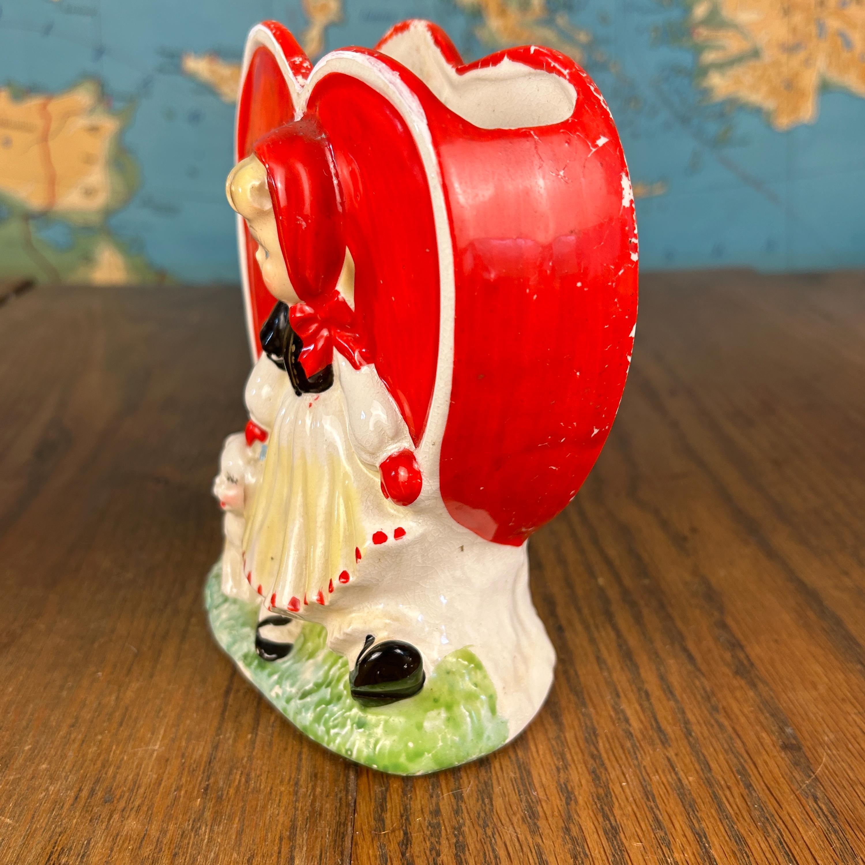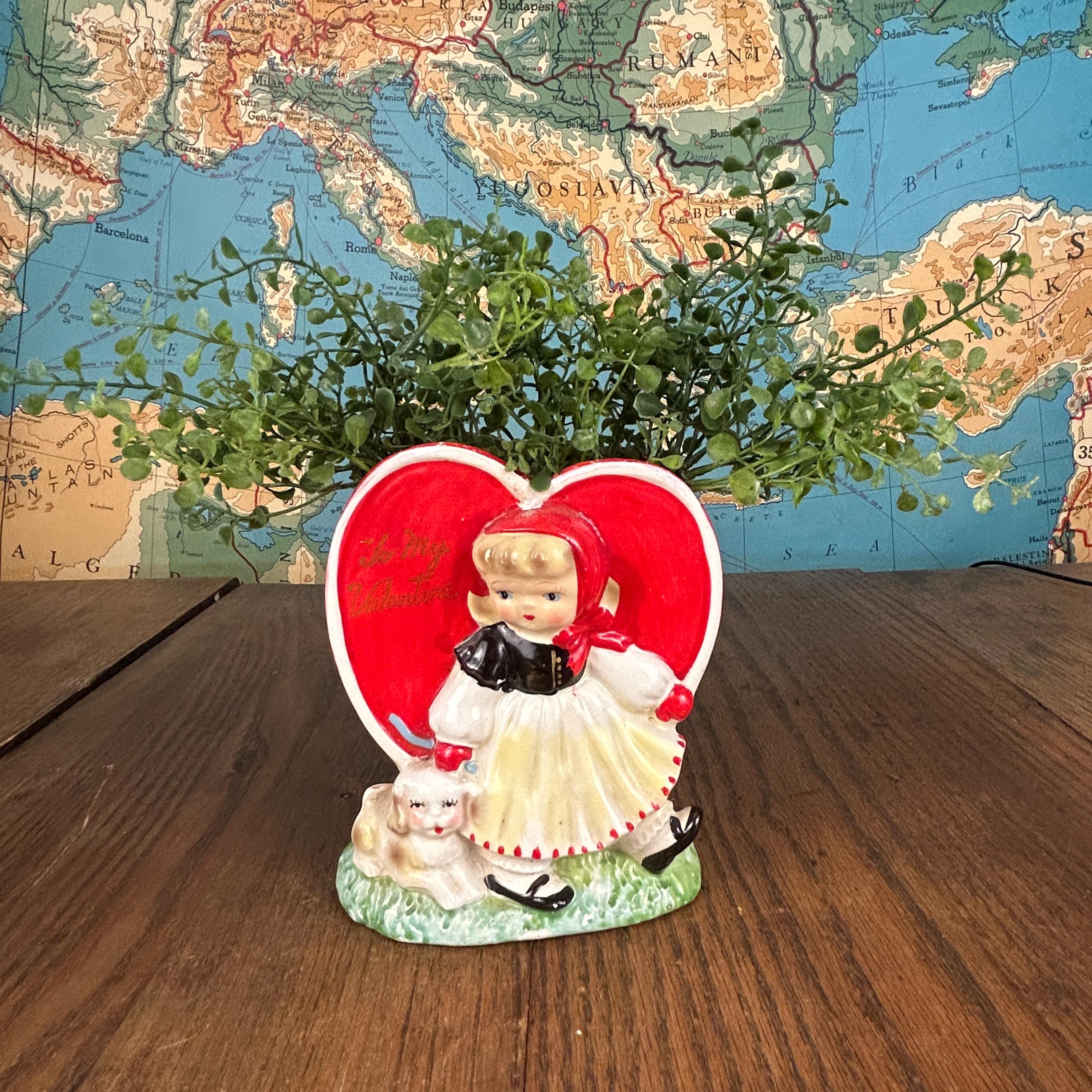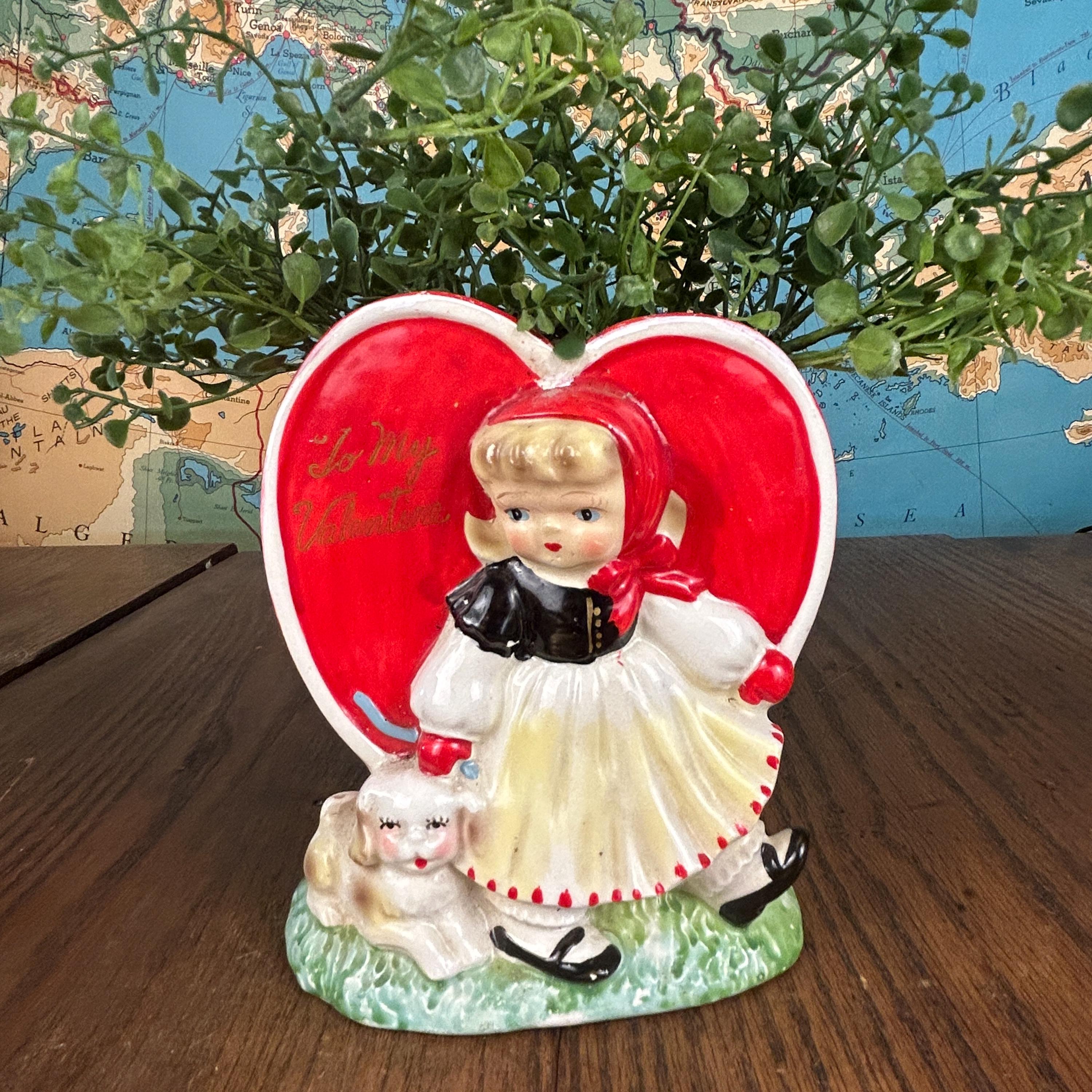 Adorable and full of nostalgic charm, this vintage ceramic planter by HF Co. features a sweet Valentine’s theme with a young girl in a red dress holding her puppy in front of a bright red heart.