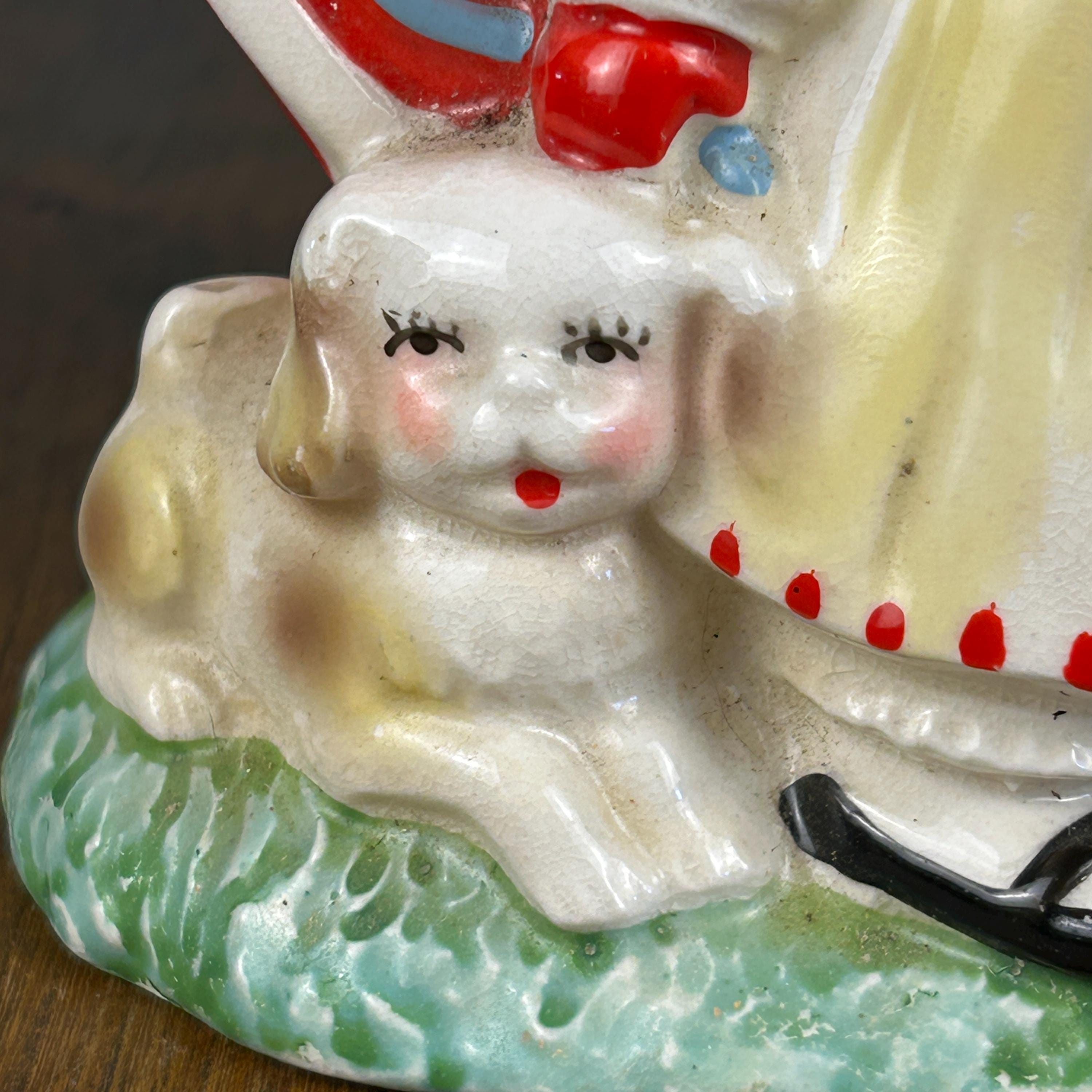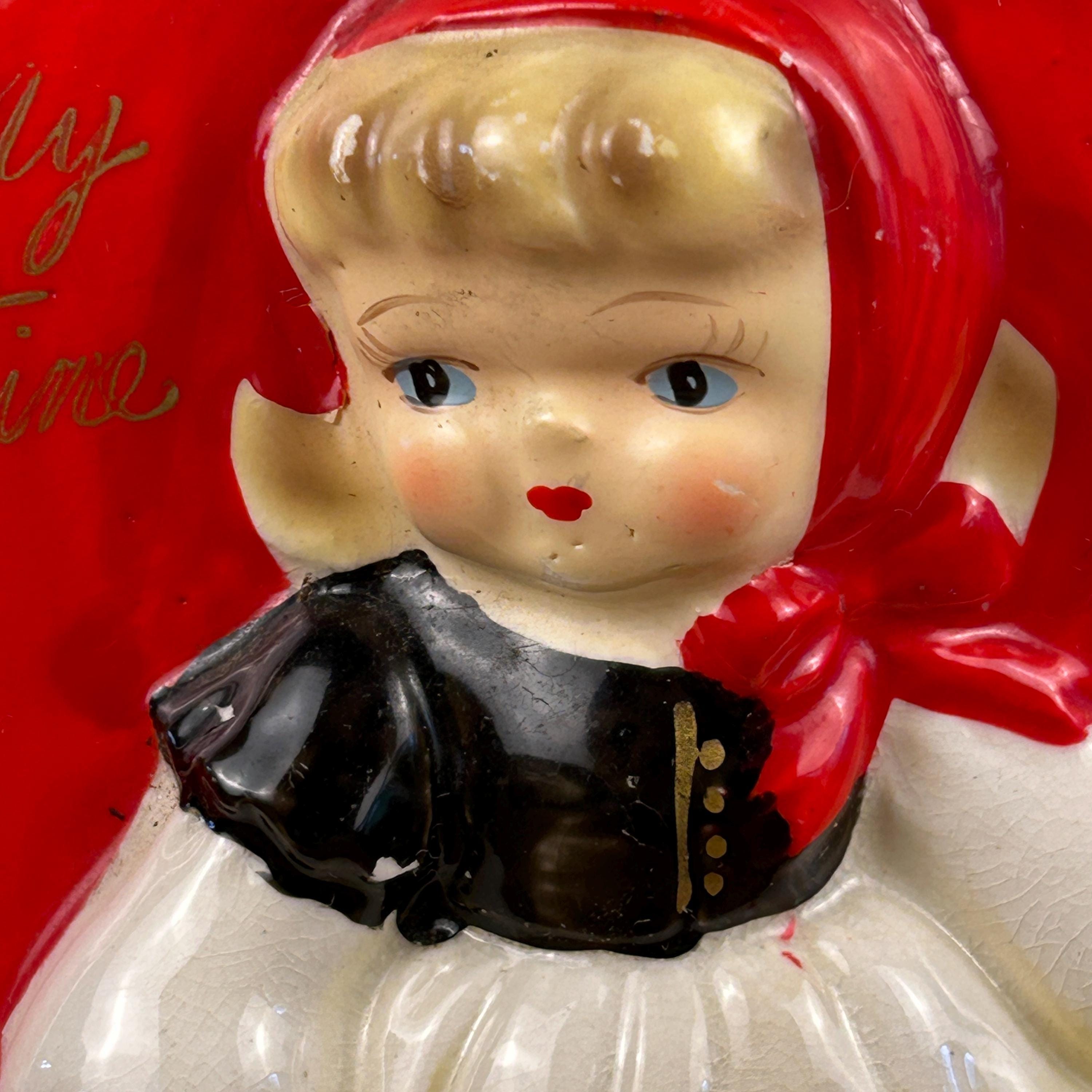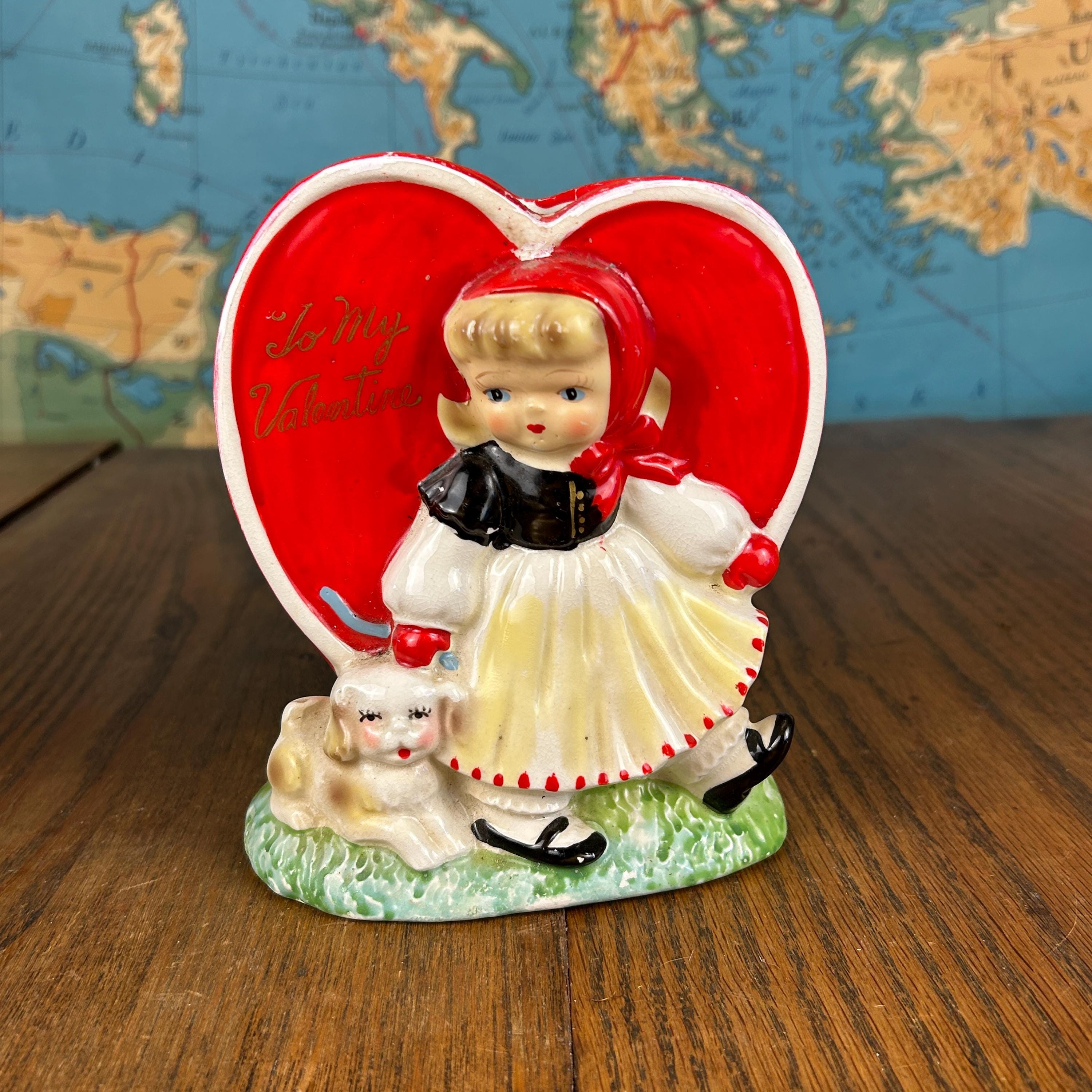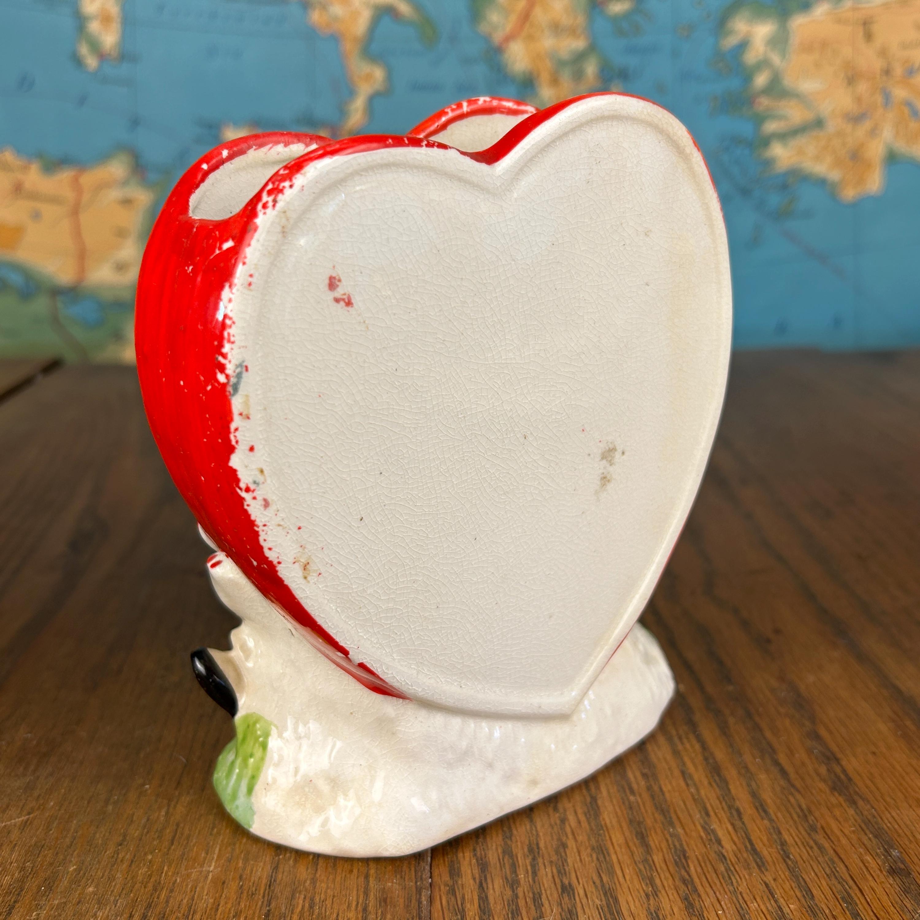 Adorable and full of nostalgic charm, this vintage ceramic planter by HF Co. features a sweet Valentine’s theme with a young girl in a red dress holding her puppy in front of a bright red heart.