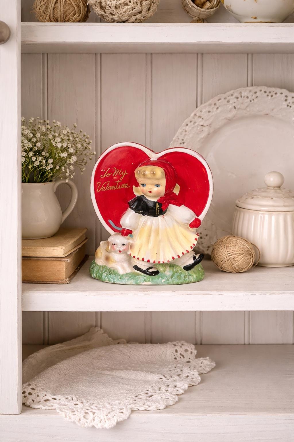 Perfect for Valentine’s Day decor, cottagecore styling, or adding a touch of vintage sweetness to a shelf, windowsill, or tabletop display.