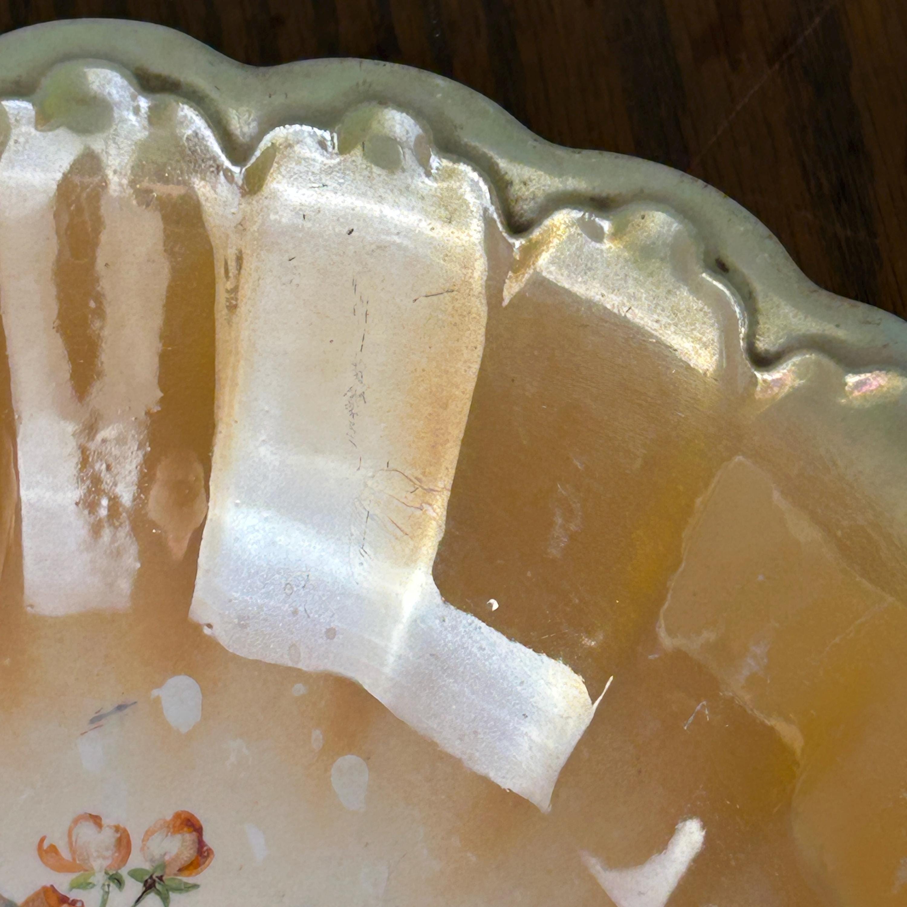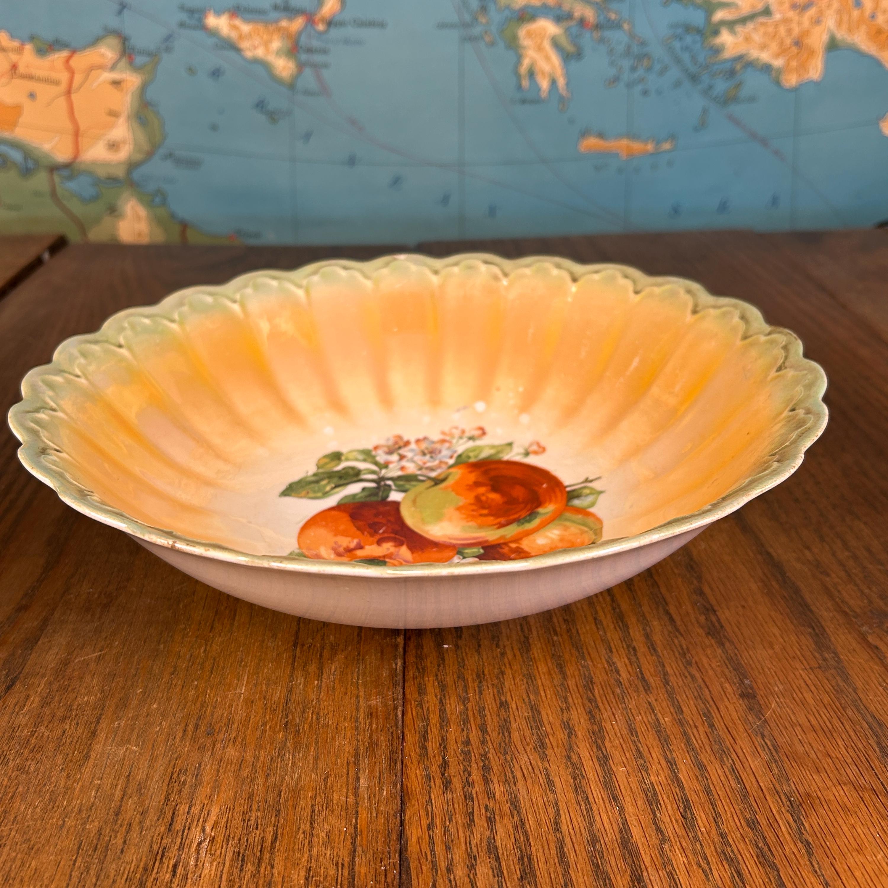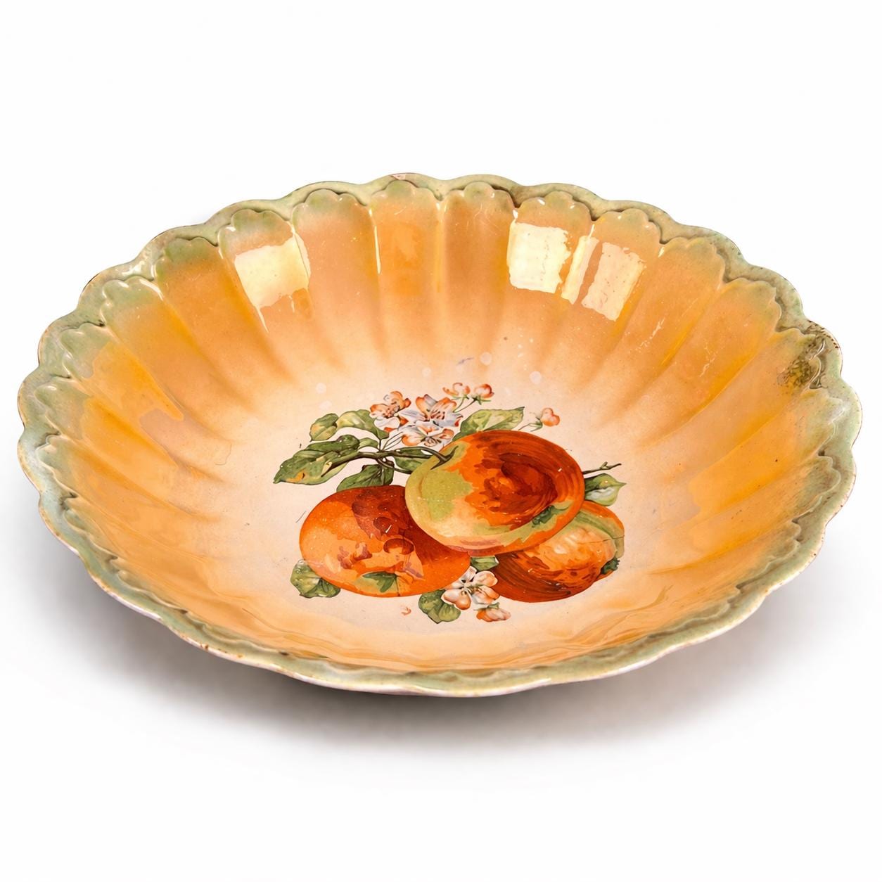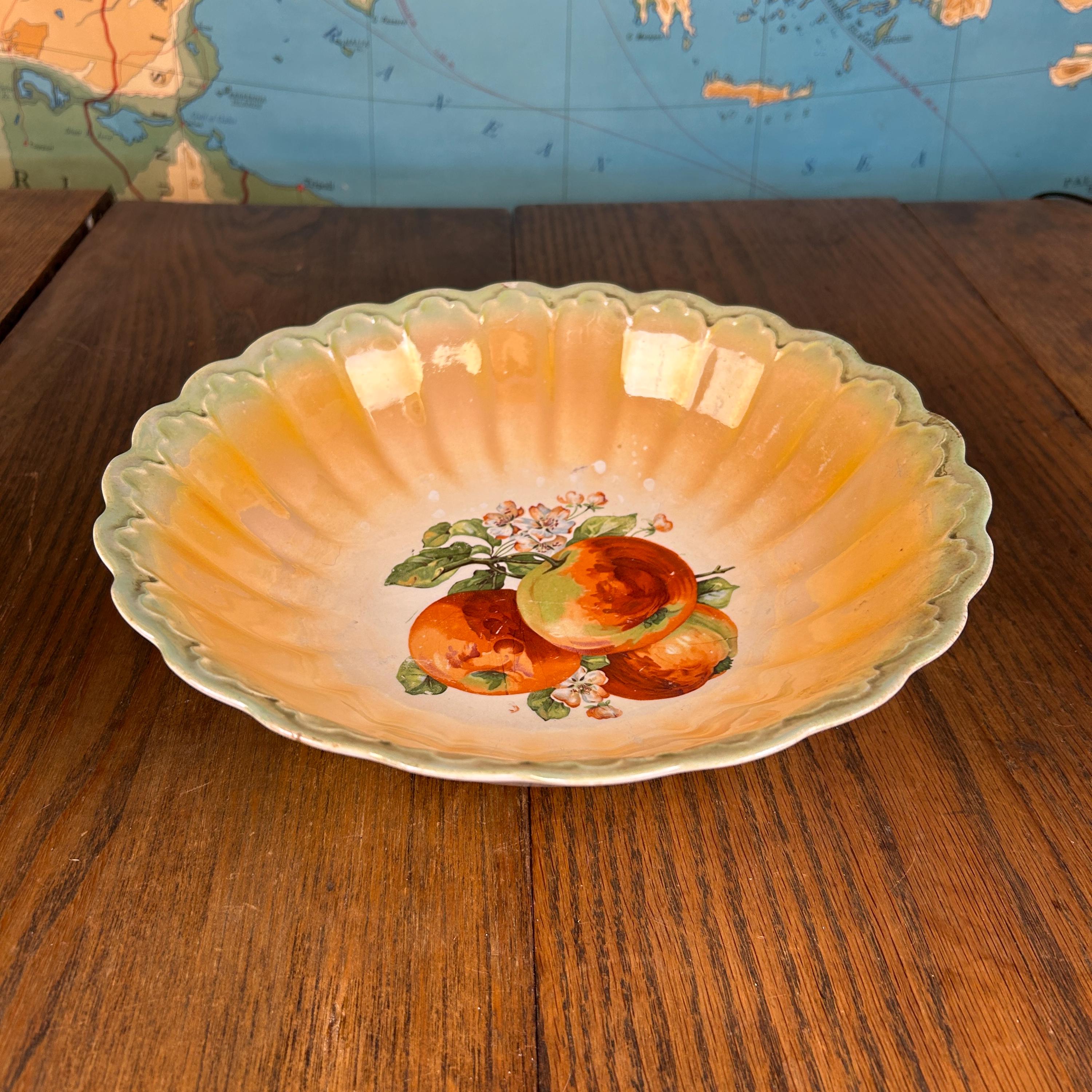 Softly glowing with a beautiful iridescent finish, this antique porcelain lusterware serving bowl features a warm peach-toned interior accented with hand-painted fruit and delicate floral details.