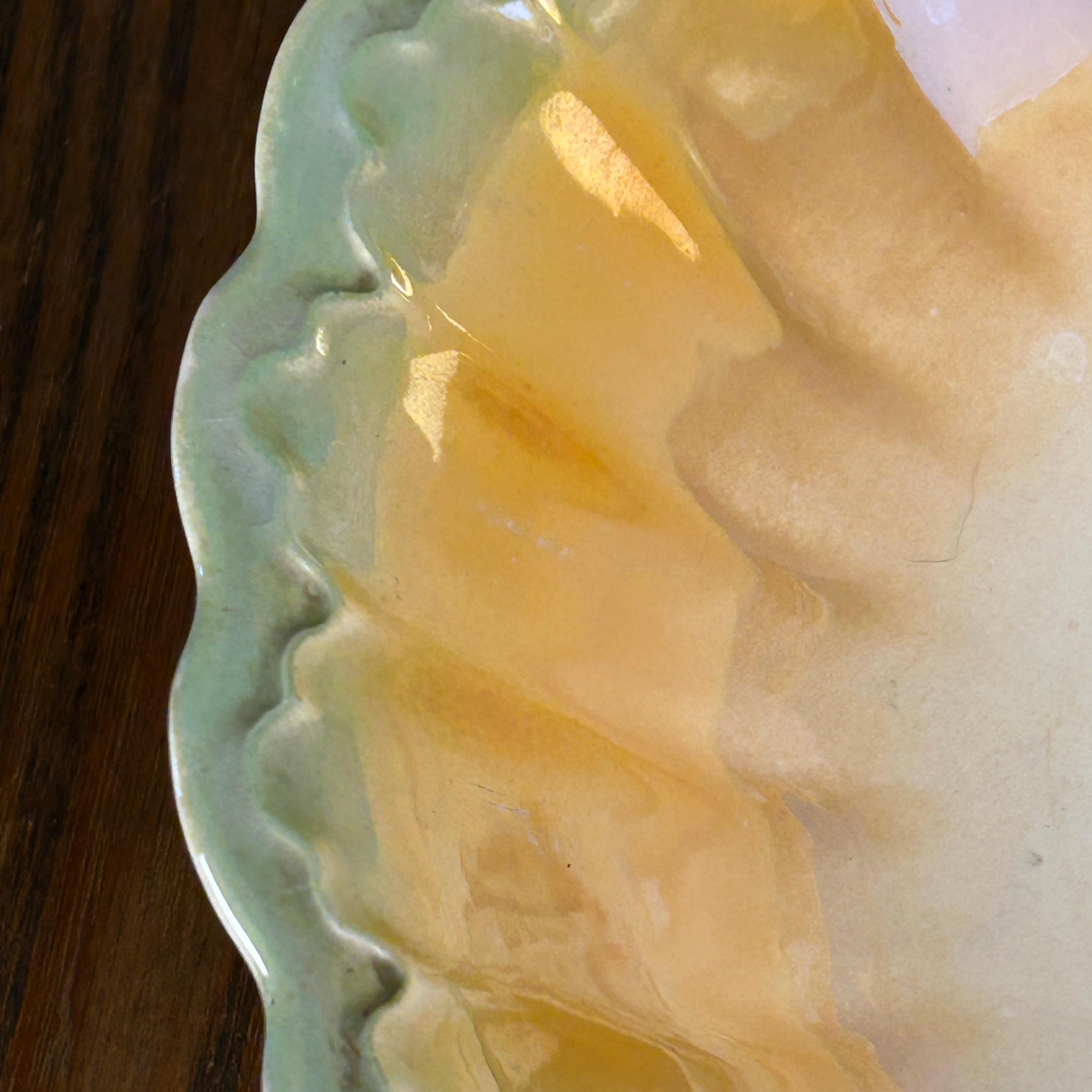 The bowl is finished with a charming green scalloped rim, adding contrast and a touch of elegance to the design. Its luminous glaze catches the light beautifully, making it just as stunning on display as it is functional.